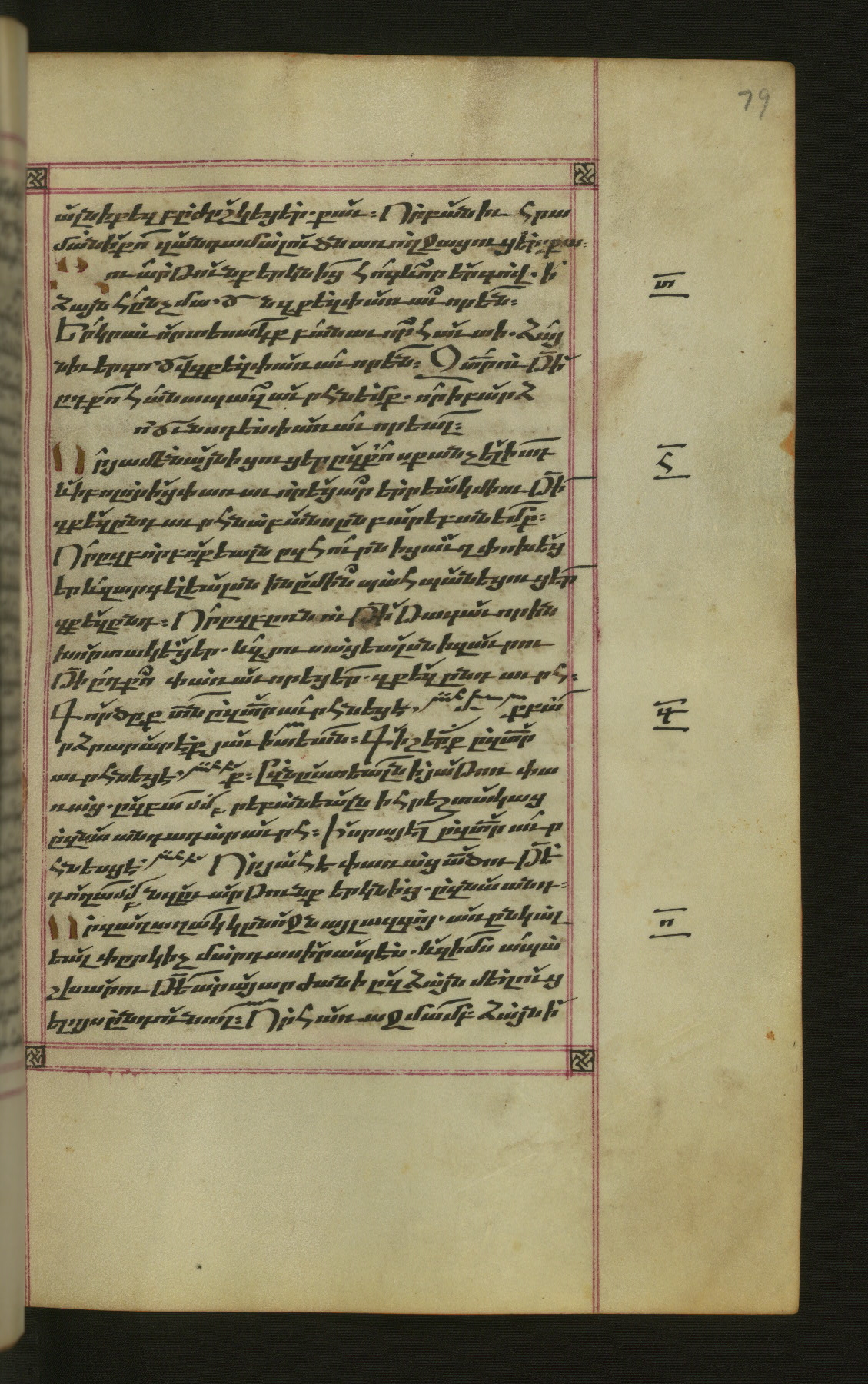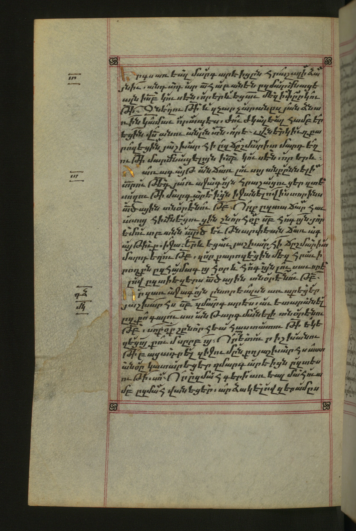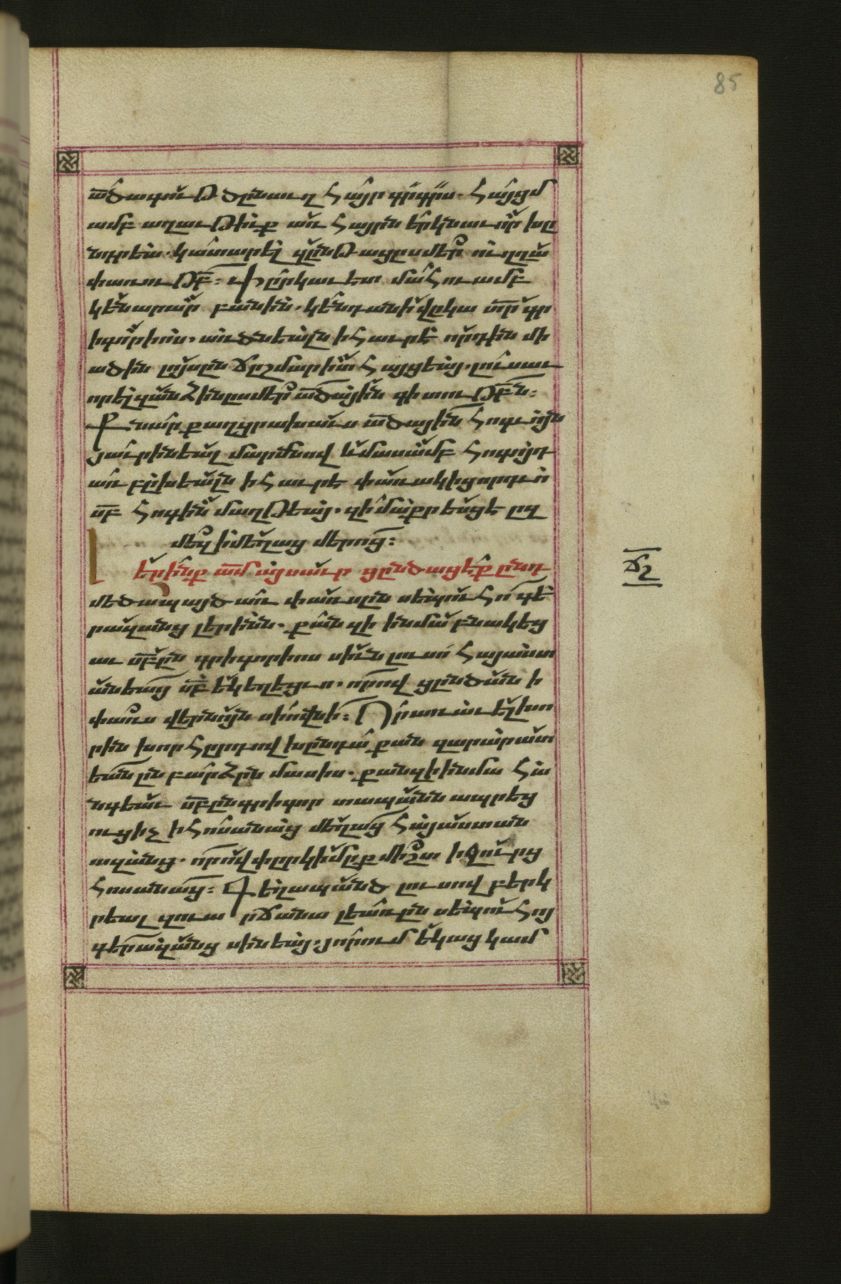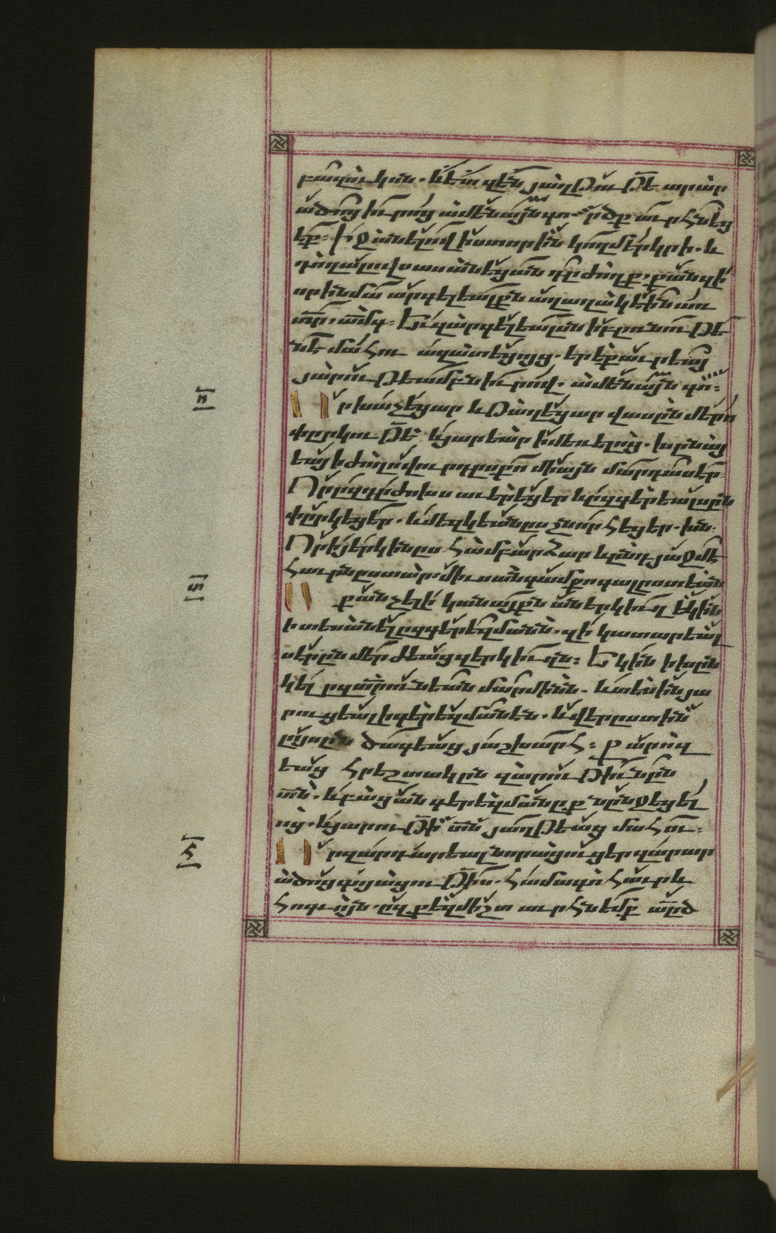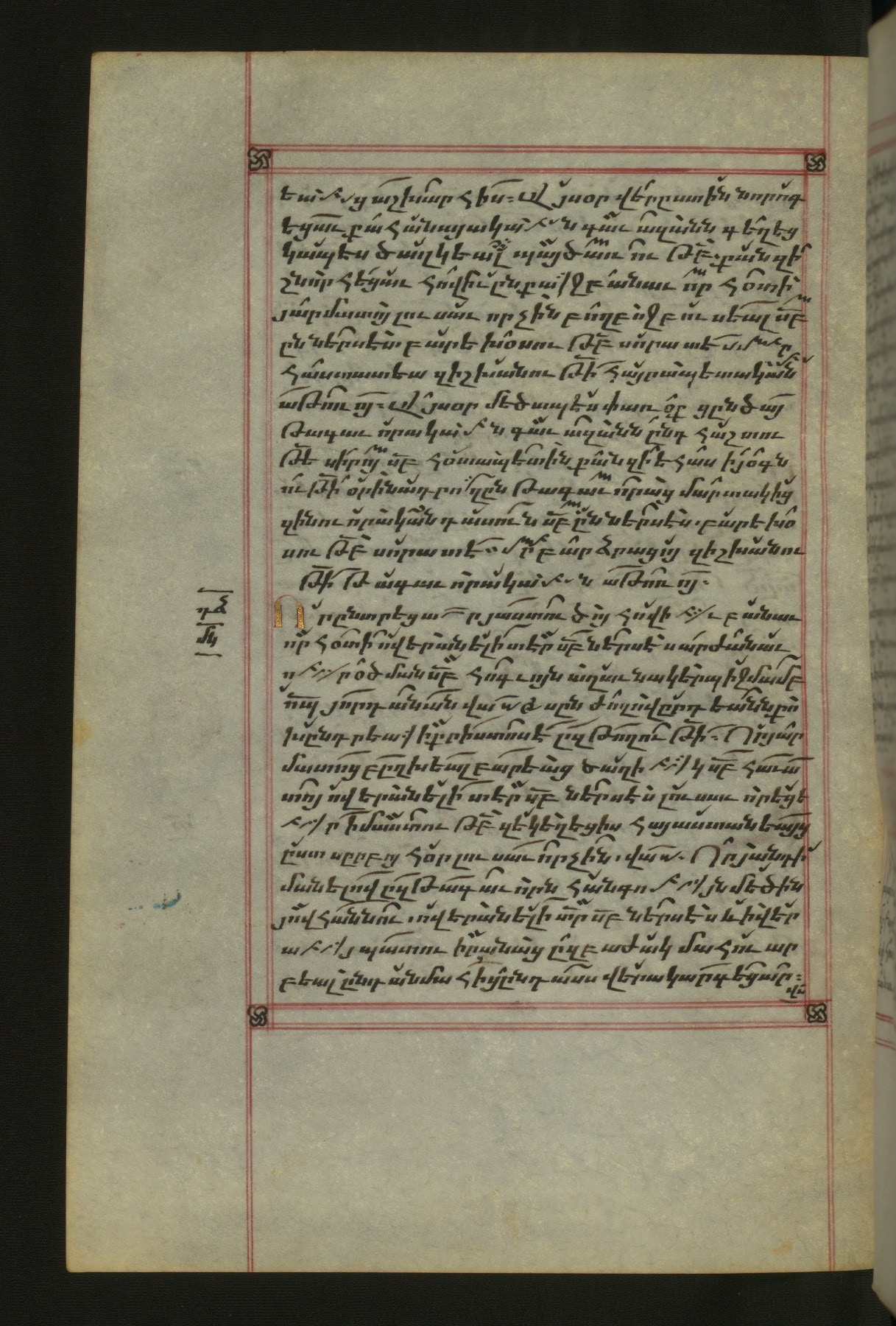 This hymnal was completed in Constantinople on August 15, 1678 [AE 1127], by the priest Yakob Pēligratc‘i, having been commissioned by Člav, son of Nawasard, as a dedication to his sons, Astuacatur and Sahak. The structure of the hymns adheres approximately to the standard Armenian hymnal (Շաբակնոց), with minor variations in order and a few substitutions (see Sanjian in the bibliography). The book is illuminated extensively, with thirty-eight full- and half-page polychrome miniatures against gold backgrounds, eight decorated head-pieces marking the principal divisions of the hymnal, and numerous marginal miniatures marking individual hymns, including biblical figures, saints, bishops, and vignettes. The style of the miniatures is largely in imitation of western European models, though more traditional Armenian and Byzantine influences stand out, such as the vibrant color palette, an iconic frontality for depictions of saints and bishops, and the highly abstracted floral motifs and zoomorphic incipits marking hymn divisions.
