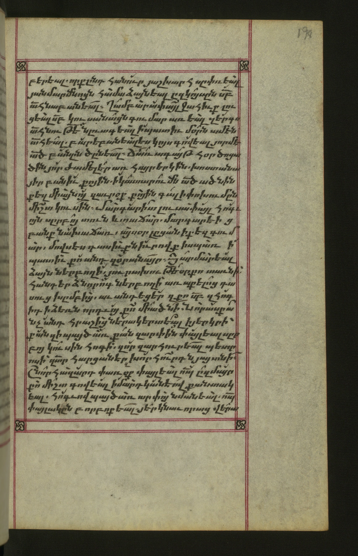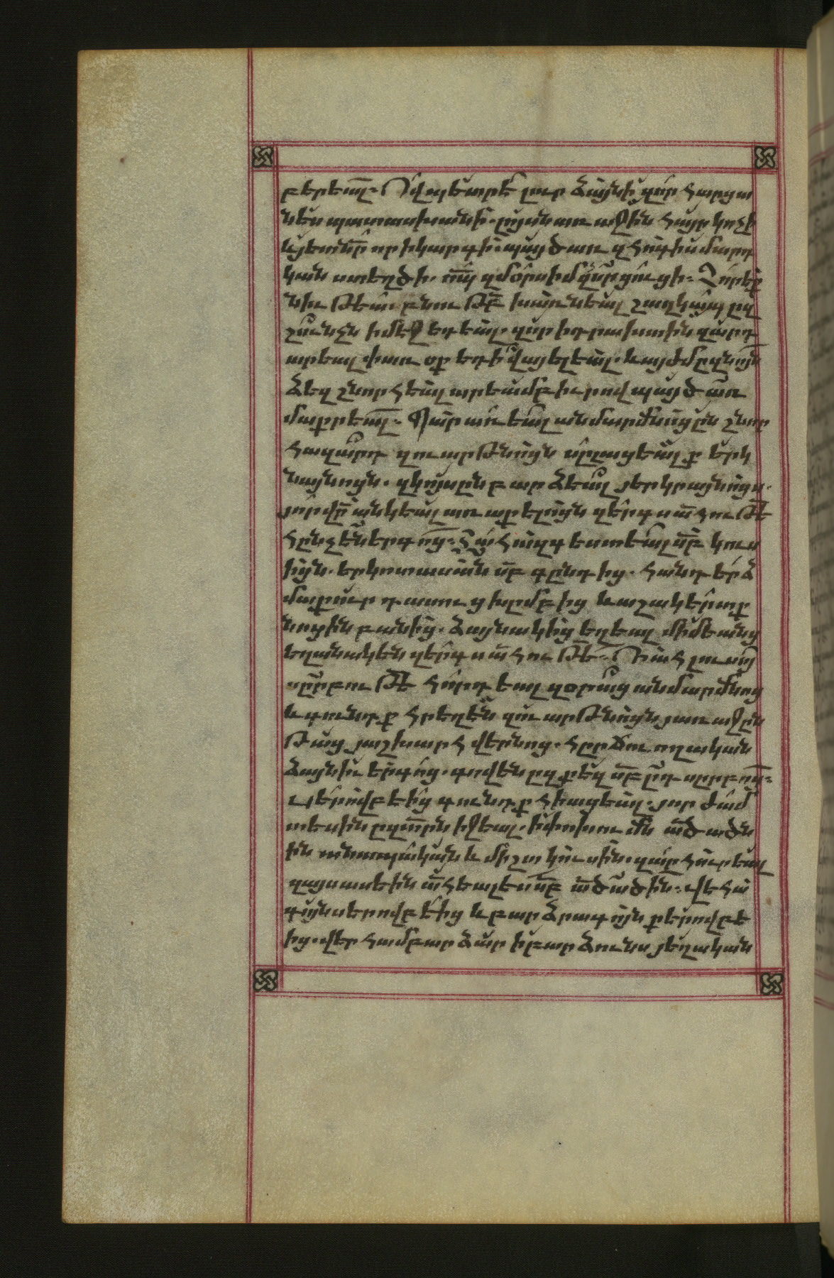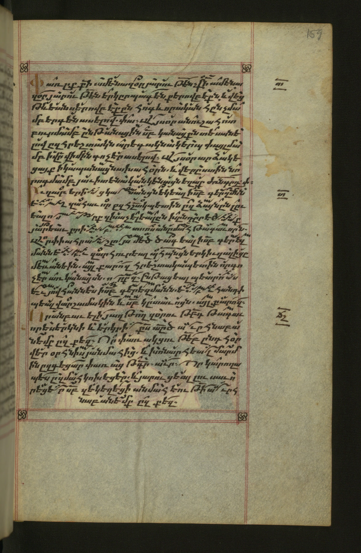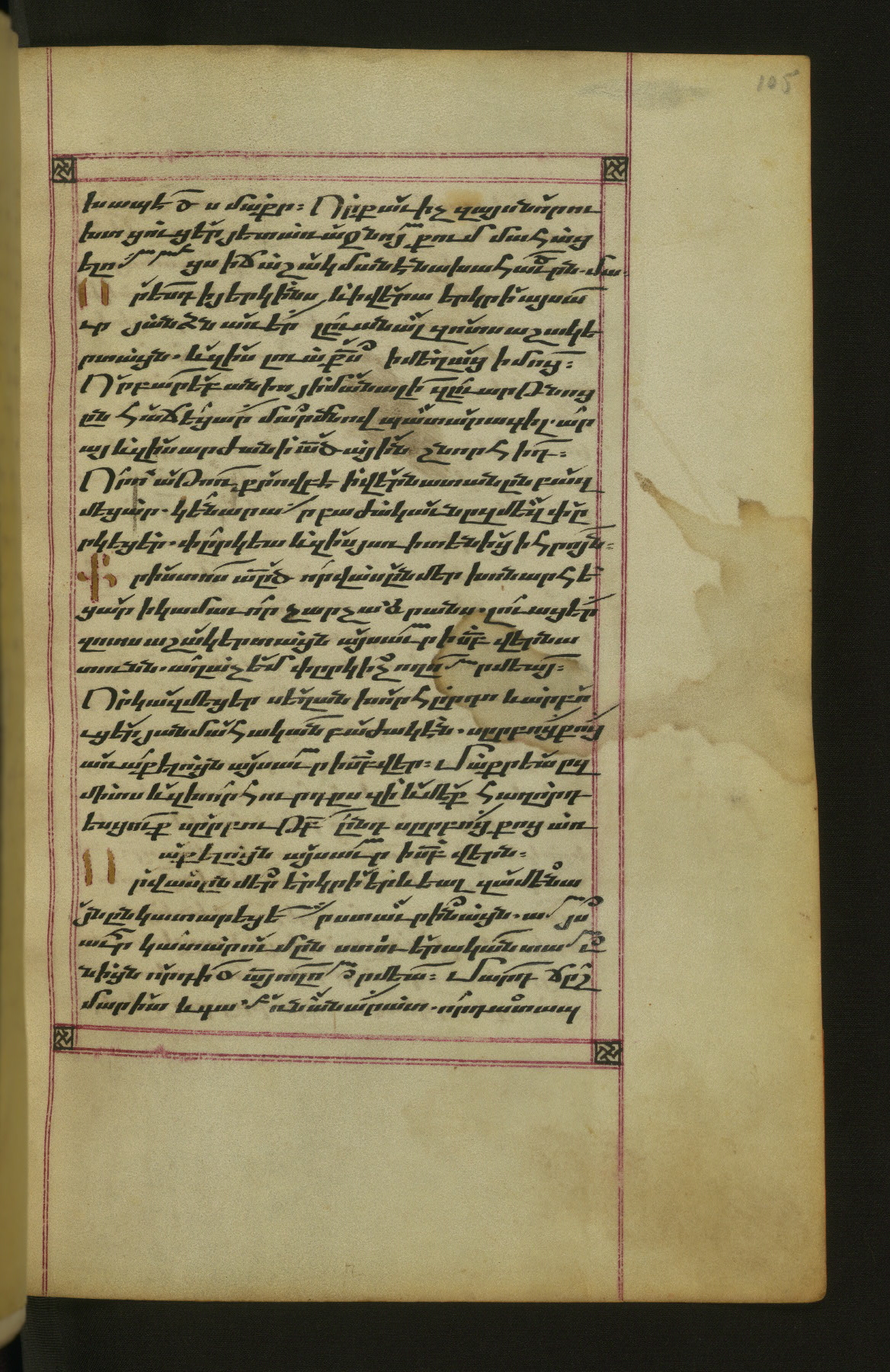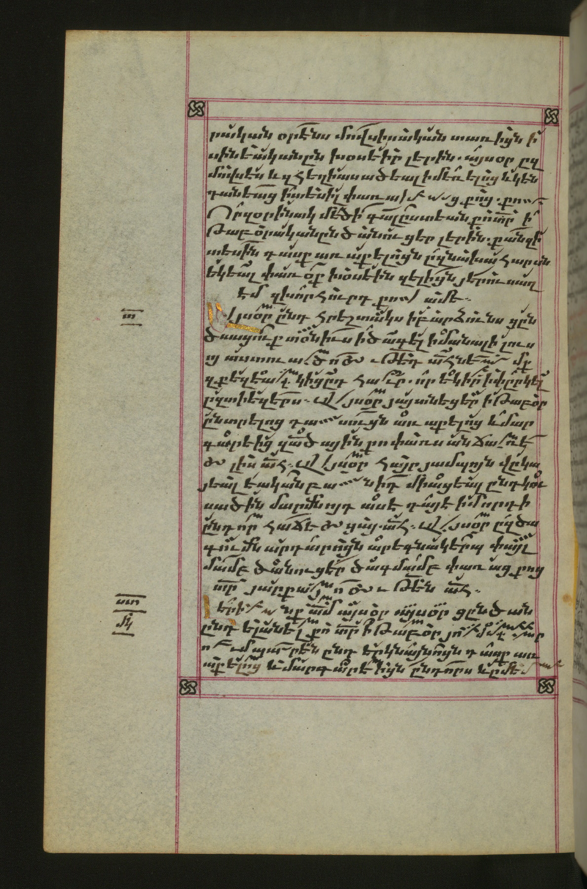 This hymnal was completed in Constantinople on August 15, 1678 [AE 1127], by the priest Yakob Pēligratc‘i, having been commissioned by Člav, son of Nawasard, as a dedication to his sons, Astuacatur and Sahak. The structure of the hymns adheres approximately to the standard Armenian hymnal (Շաբակնոց), with minor variations in order and a few substitutions (see Sanjian in the bibliography). The book is illuminated extensively, with thirty-eight full- and half-page polychrome miniatures against gold backgrounds, eight decorated head-pieces marking the principal divisions of the hymnal, and numerous marginal miniatures marking individual hymns, including biblical figures, saints, bishops, and vignettes. The style of the miniatures is largely in imitation of western European models, though more traditional Armenian and Byzantine influences stand out, such as the vibrant color palette, an iconic frontality for depictions of saints and bishops, and the highly abstracted floral motifs and zoomorphic incipits marking hymn divisions.