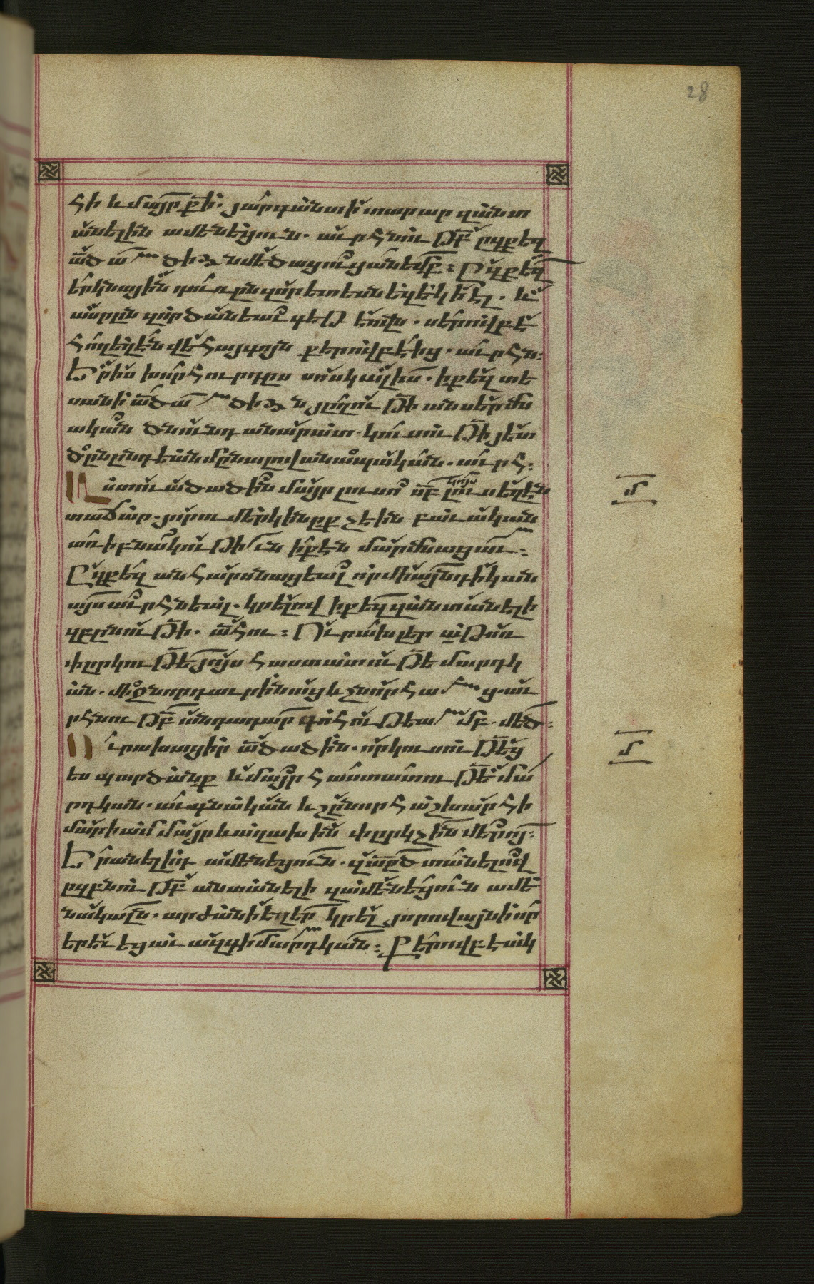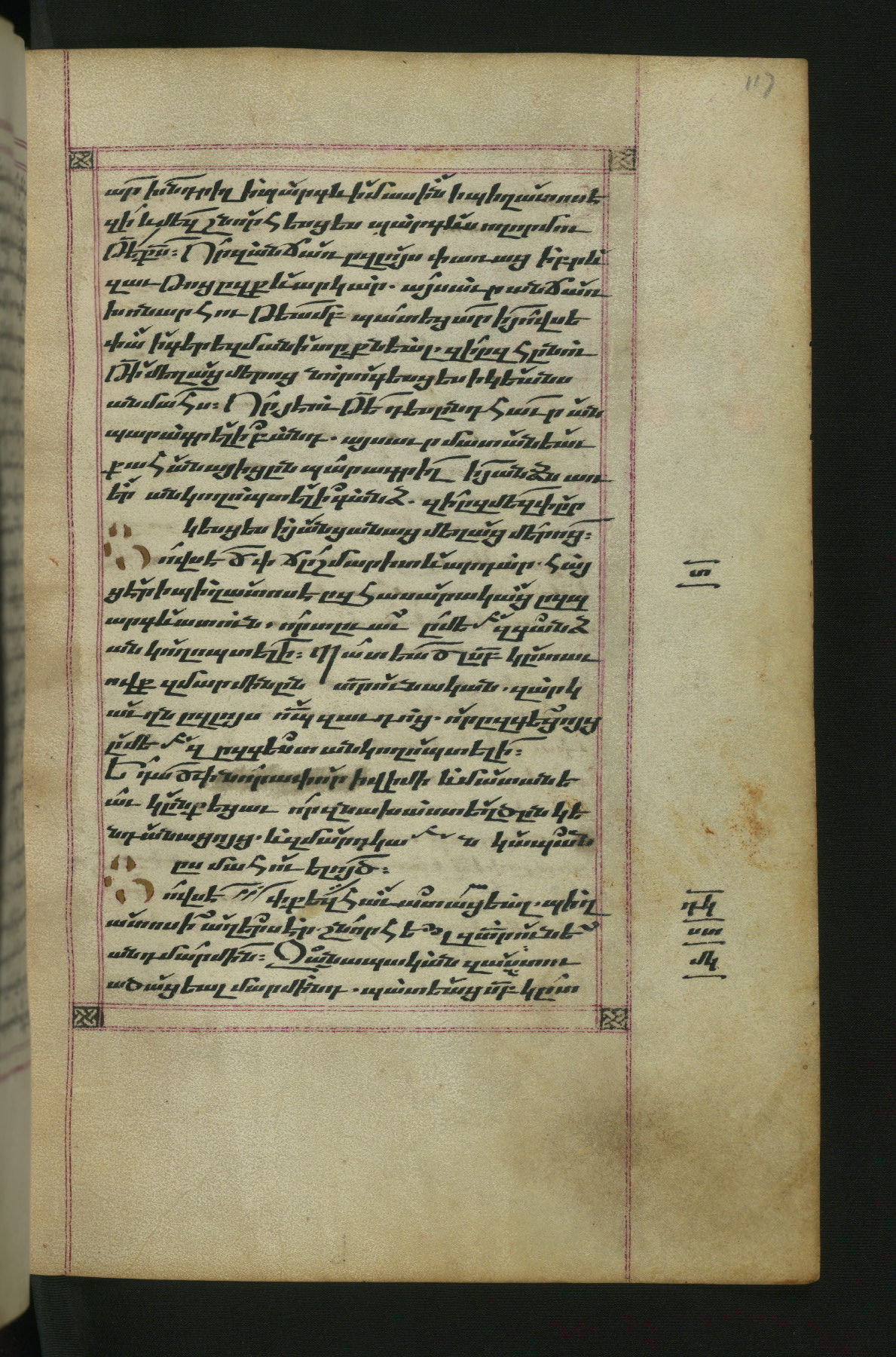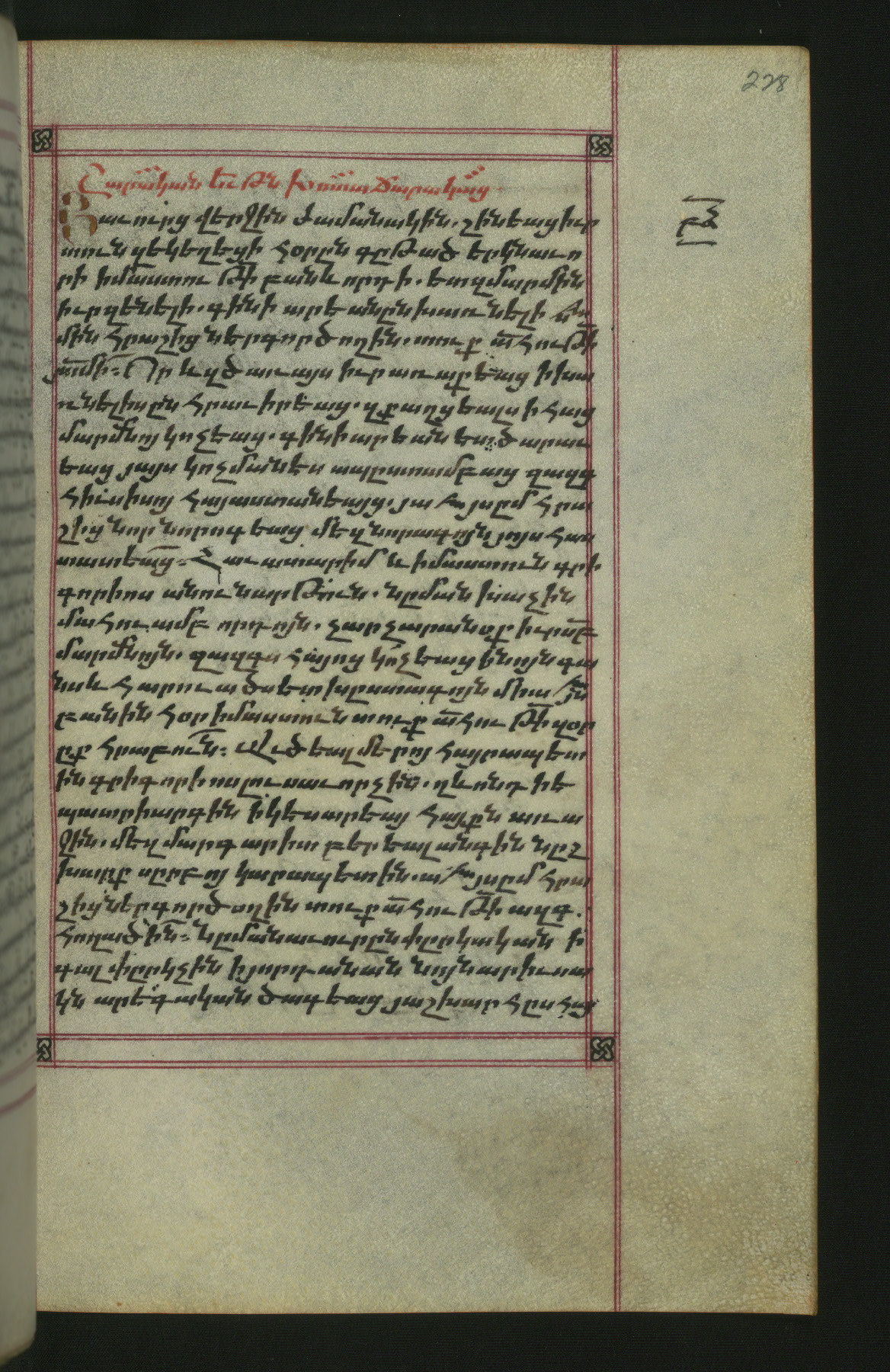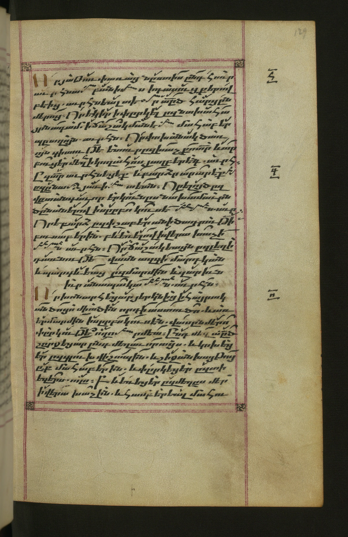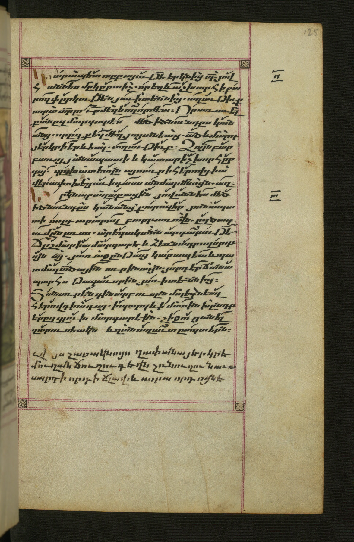 This hymnal was completed in Constantinople on August 15, 1678 [AE 1127], by the priest Yakob Pēligratc‘i, having been commissioned by Člav, son of Nawasard, as a dedication to his sons, Astuacatur and Sahak. The structure of the hymns adheres approximately to the standard Armenian hymnal (Շաբակնոց), with minor variations in order and a few substitutions (see Sanjian in the bibliography). The book is illuminated extensively, with thirty-eight full- and half-page polychrome miniatures against gold backgrounds, eight decorated head-pieces marking the principal divisions of the hymnal, and numerous marginal miniatures marking individual hymns, including biblical figures, saints, bishops, and vignettes. The style of the miniatures is largely in imitation of western European models, though more traditional Armenian and Byzantine influences stand out, such as the vibrant color palette, an iconic frontality for depictions of saints and bishops, and the highly abstracted floral motifs and zoomorphic incipits marking hymn divisions.