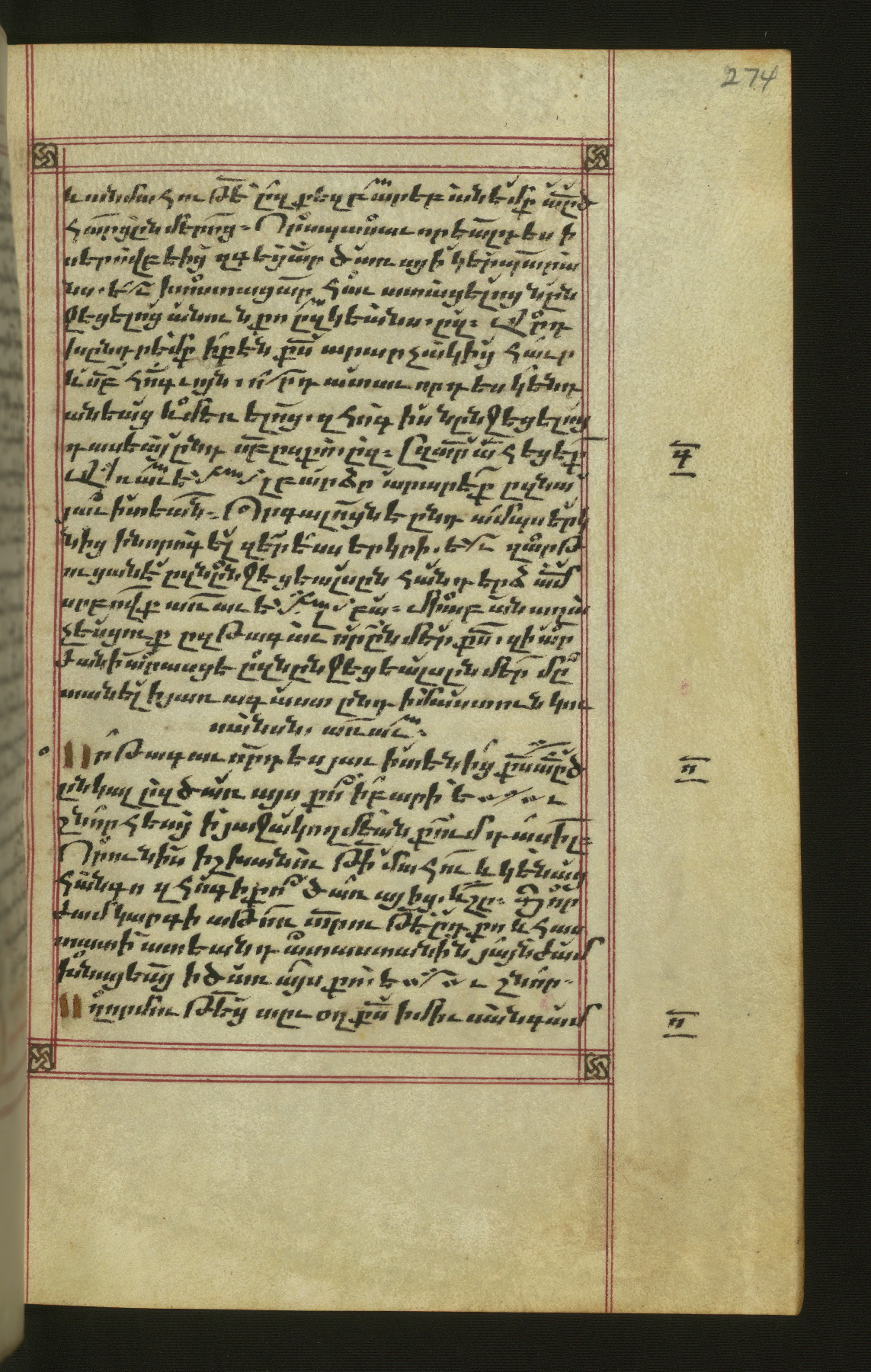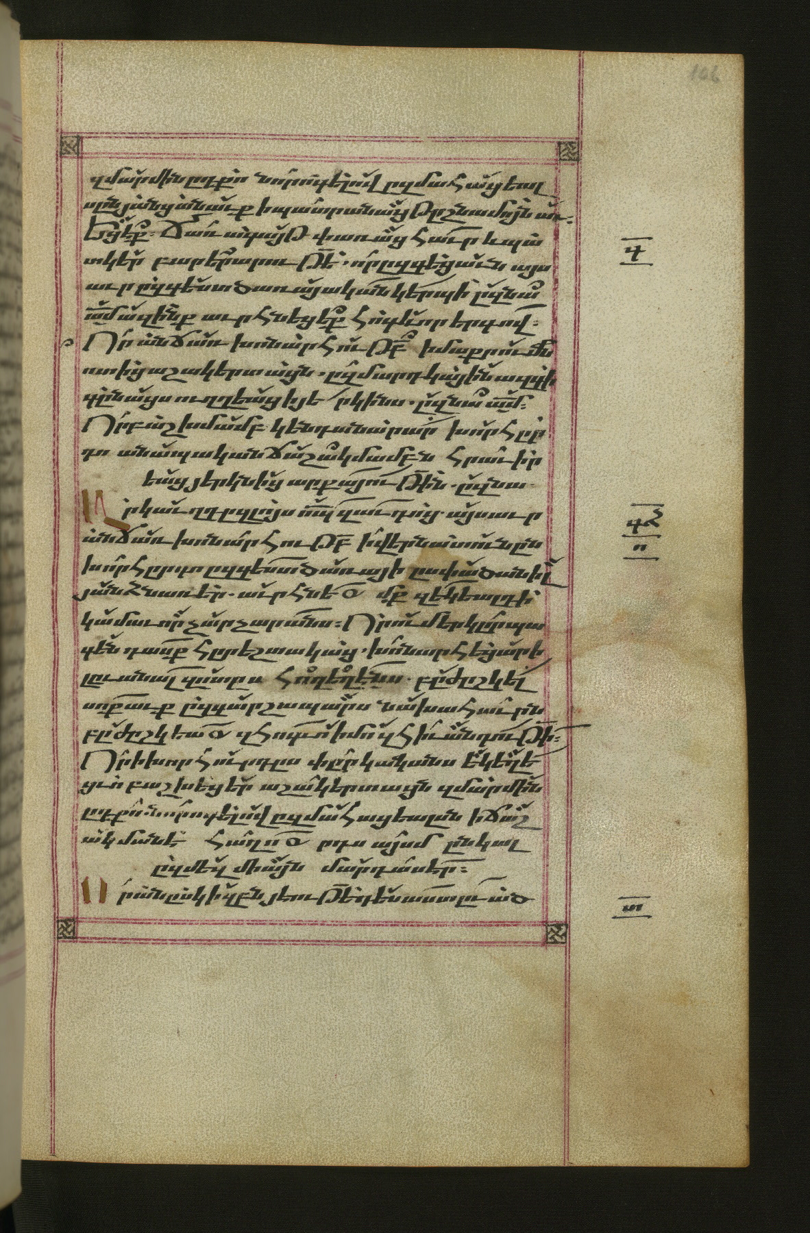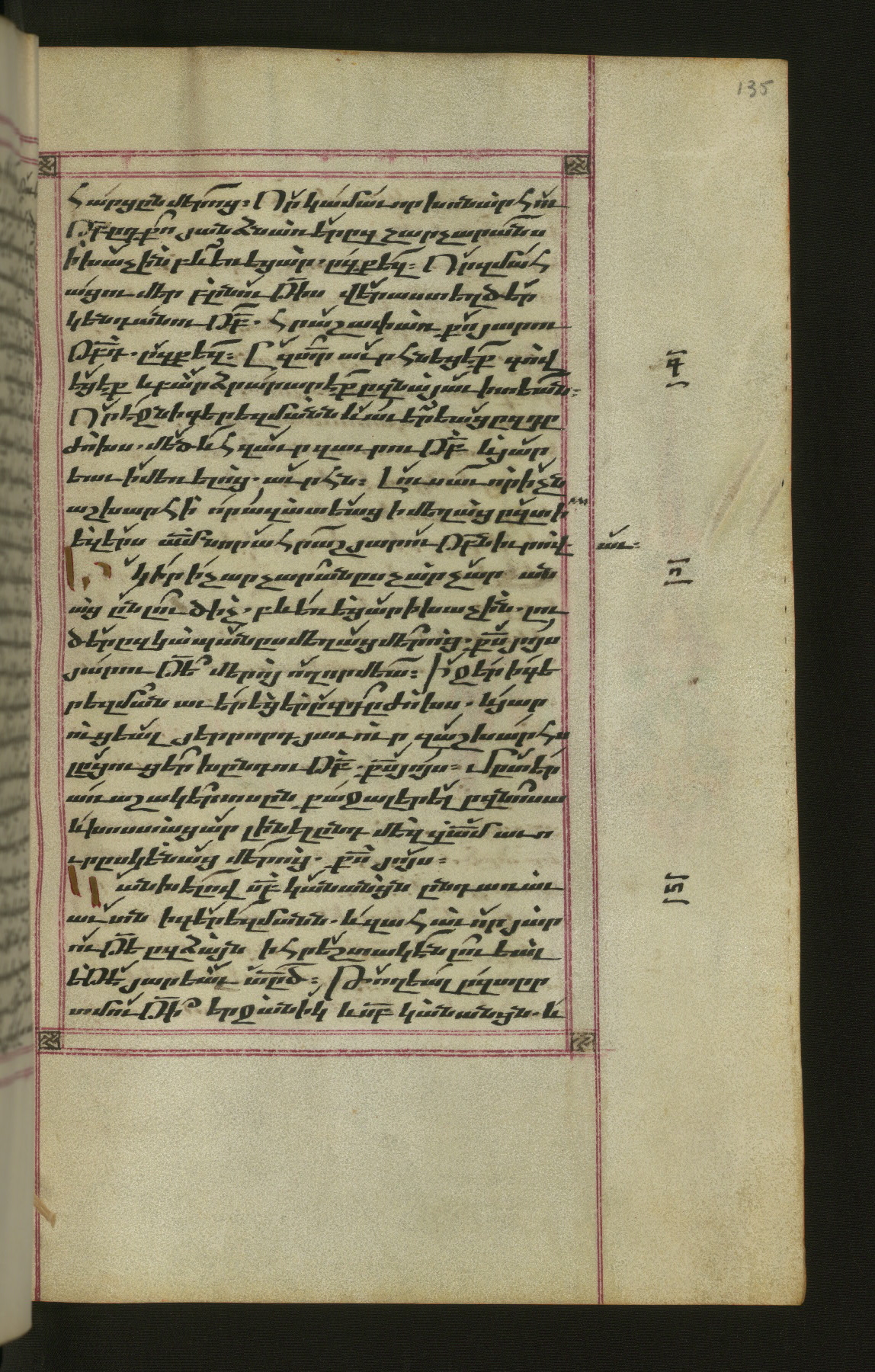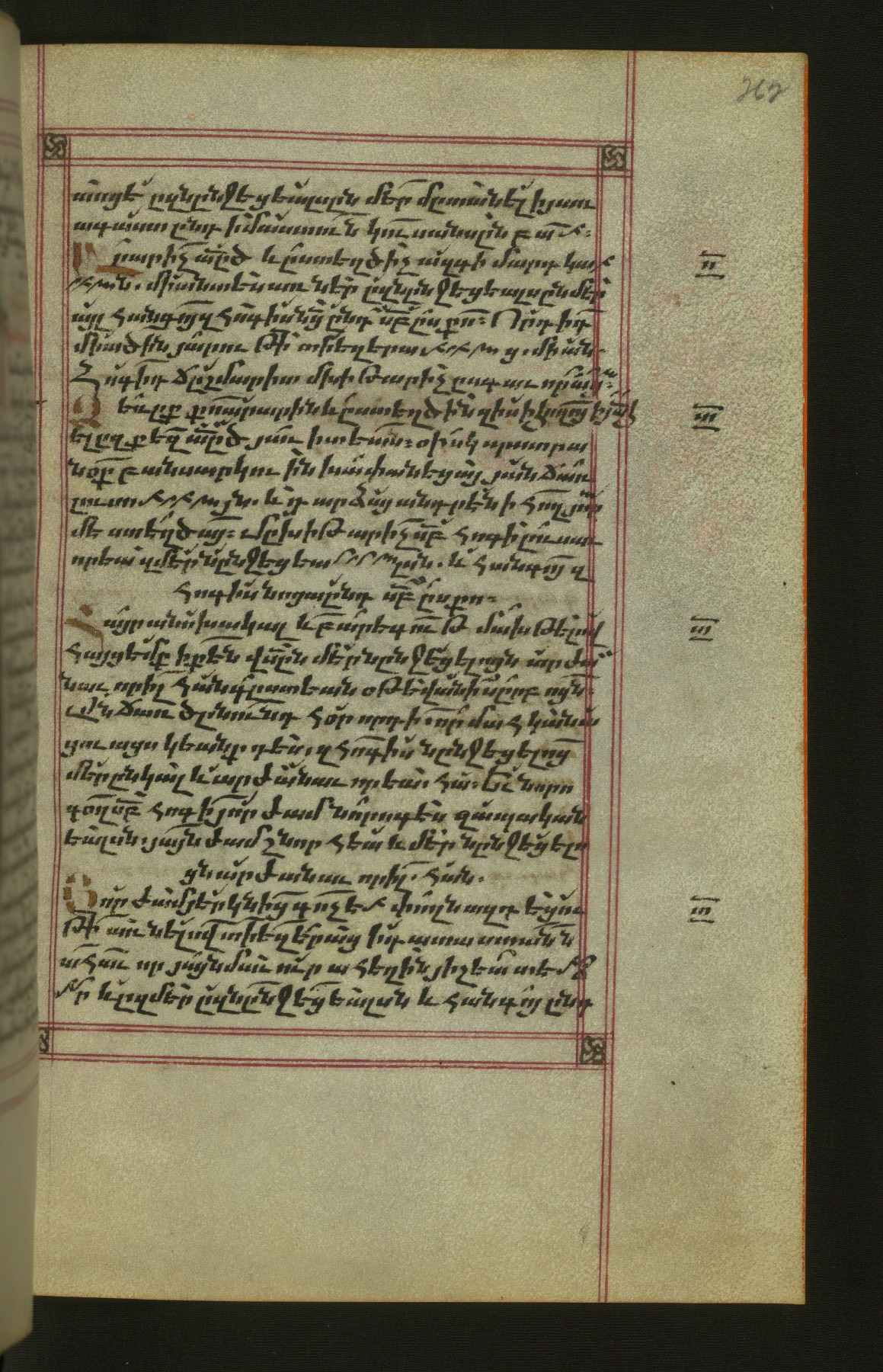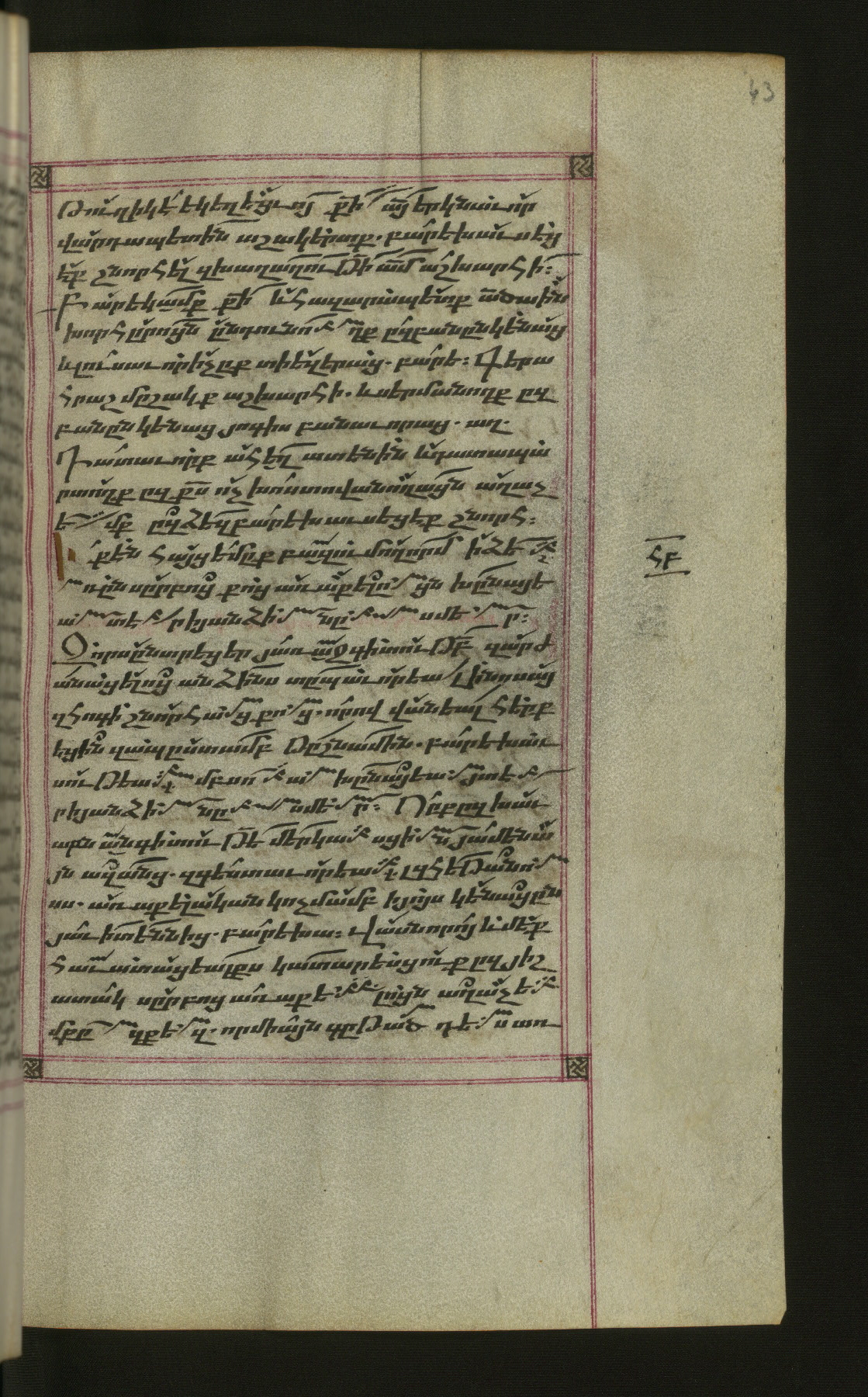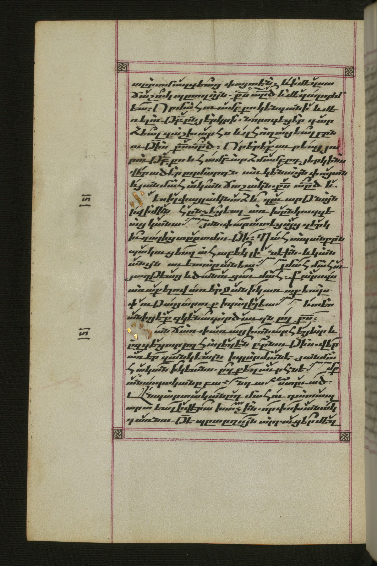 This hymnal was completed in Constantinople on August 15, 1678 [AE 1127], by the priest Yakob Pēligratc‘i, having been commissioned by Člav, son of Nawasard, as a dedication to his sons, Astuacatur and Sahak. The structure of the hymns adheres approximately to the standard Armenian hymnal (Շաբակնոց), with minor variations in order and a few substitutions (see Sanjian in the bibliography). The book is illuminated extensively, with thirty-eight full- and half-page polychrome miniatures against gold backgrounds, eight decorated head-pieces marking the principal divisions of the hymnal, and numerous marginal miniatures marking individual hymns, including biblical figures, saints, bishops, and vignettes. The style of the miniatures is largely in imitation of western European models, though more traditional Armenian and Byzantine influences stand out, such as the vibrant color palette, an iconic frontality for depictions of saints and bishops, and the highly abstracted floral motifs and zoomorphic incipits marking hymn divisions.