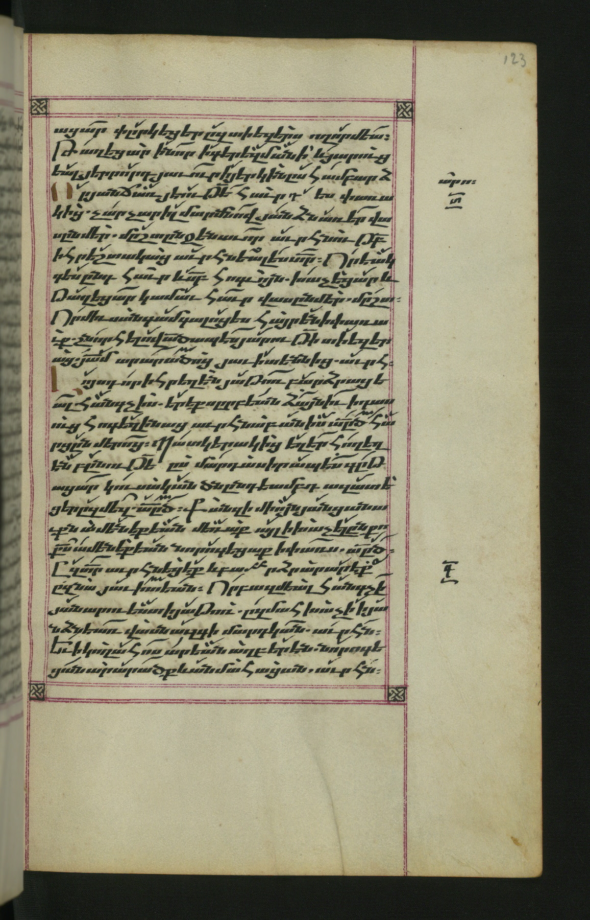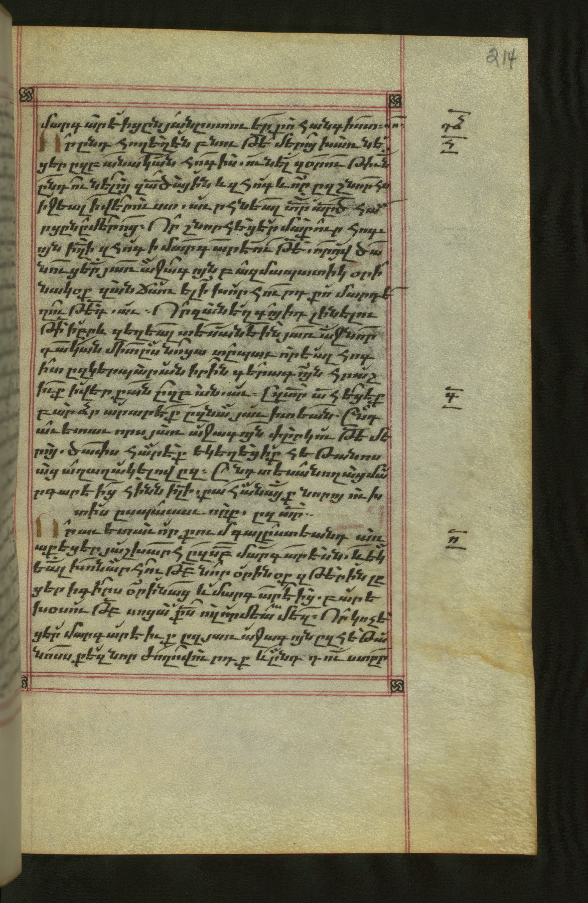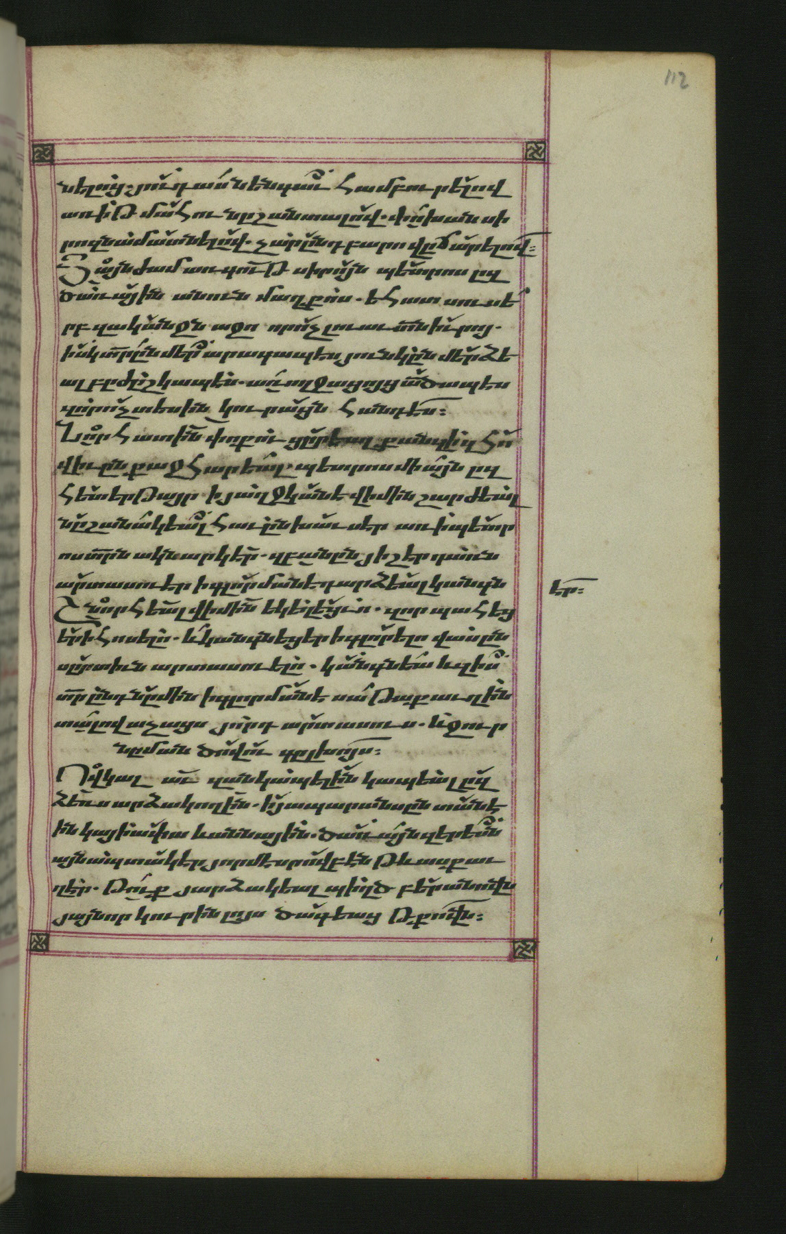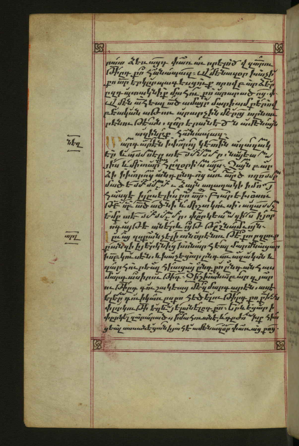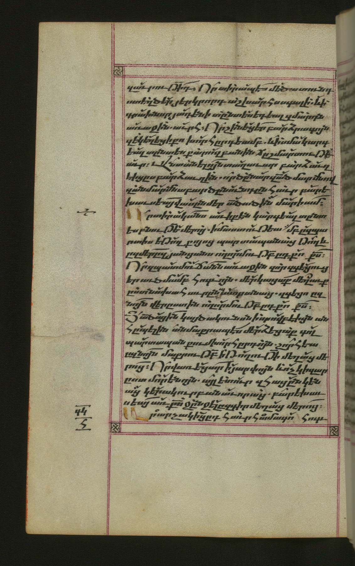 This hymnal was completed in Constantinople on August 15, 1678 [AE 1127], by the priest Yakob Pēligratc‘i, having been commissioned by Člav, son of Nawasard, as a dedication to his sons, Astuacatur and Sahak. The structure of the hymns adheres approximately to the standard Armenian hymnal (Շաբակնոց), with minor variations in order and a few substitutions (see Sanjian in the bibliography). The book is illuminated extensively, with thirty-eight full- and half-page polychrome miniatures against gold backgrounds, eight decorated head-pieces marking the principal divisions of the hymnal, and numerous marginal miniatures marking individual hymns, including biblical figures, saints, bishops, and vignettes. The style of the miniatures is largely in imitation of western European models, though more traditional Armenian and Byzantine influences stand out, such as the vibrant color palette, an iconic frontality for depictions of saints and bishops, and the highly abstracted floral motifs and zoomorphic incipits marking hymn divisions.