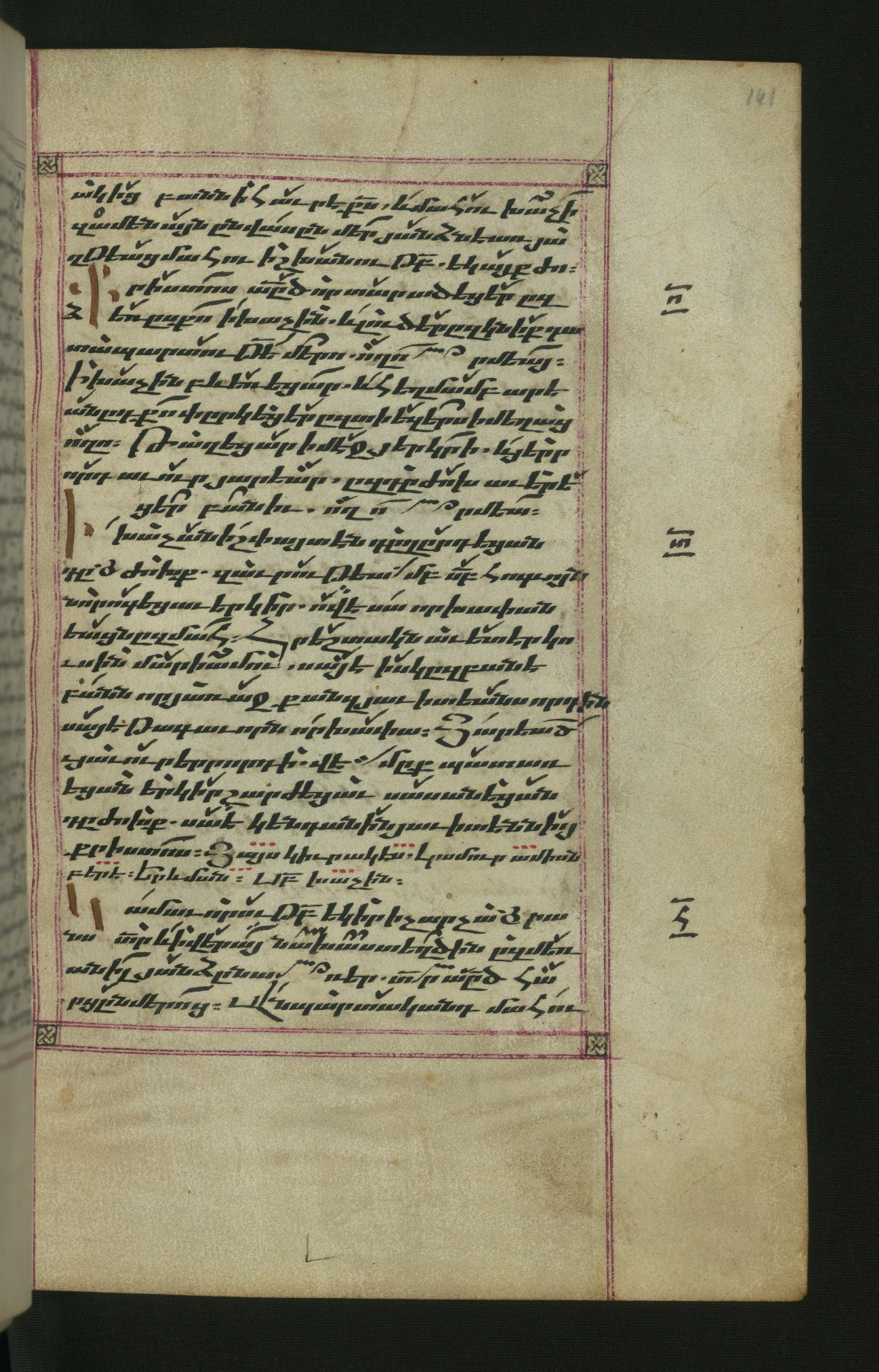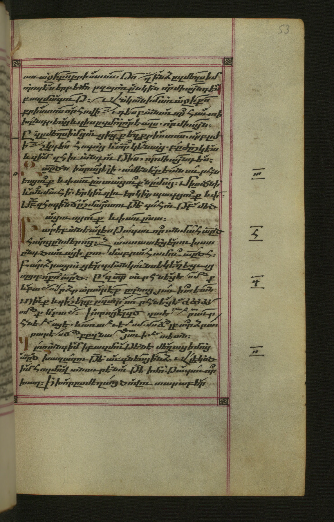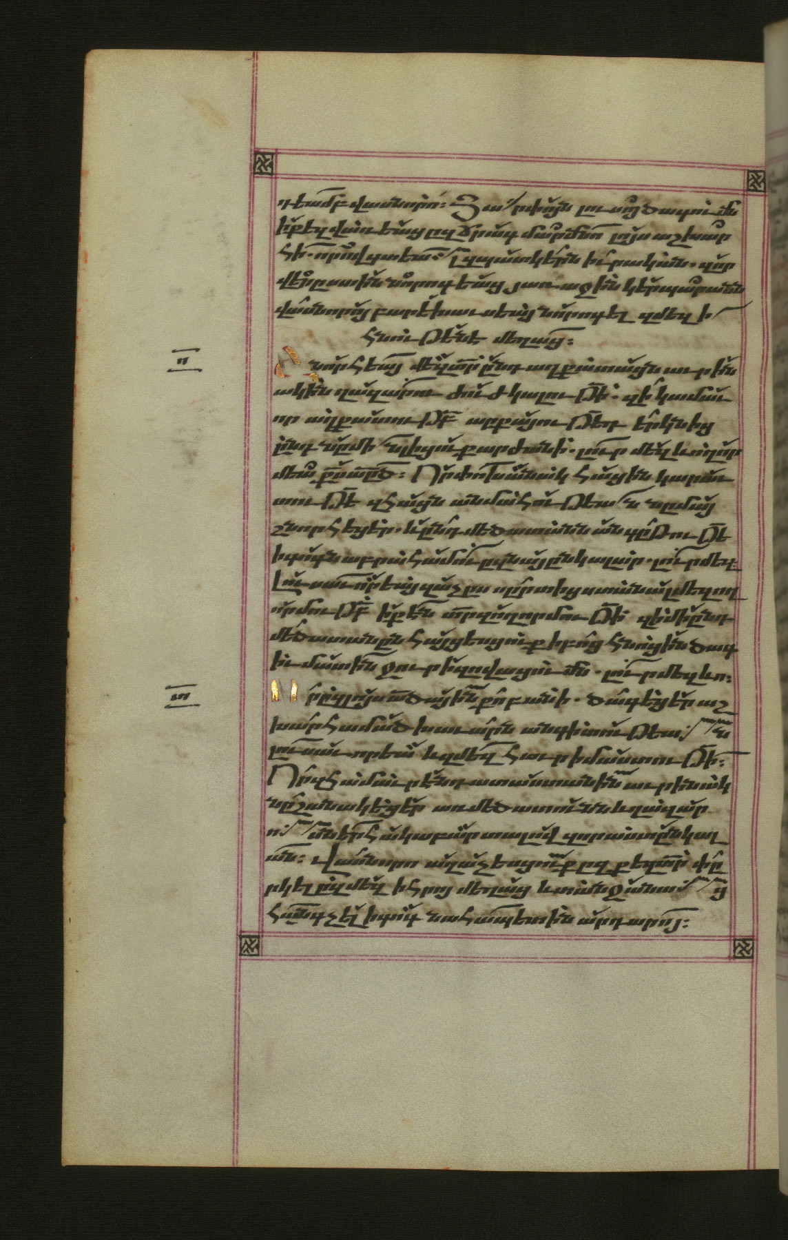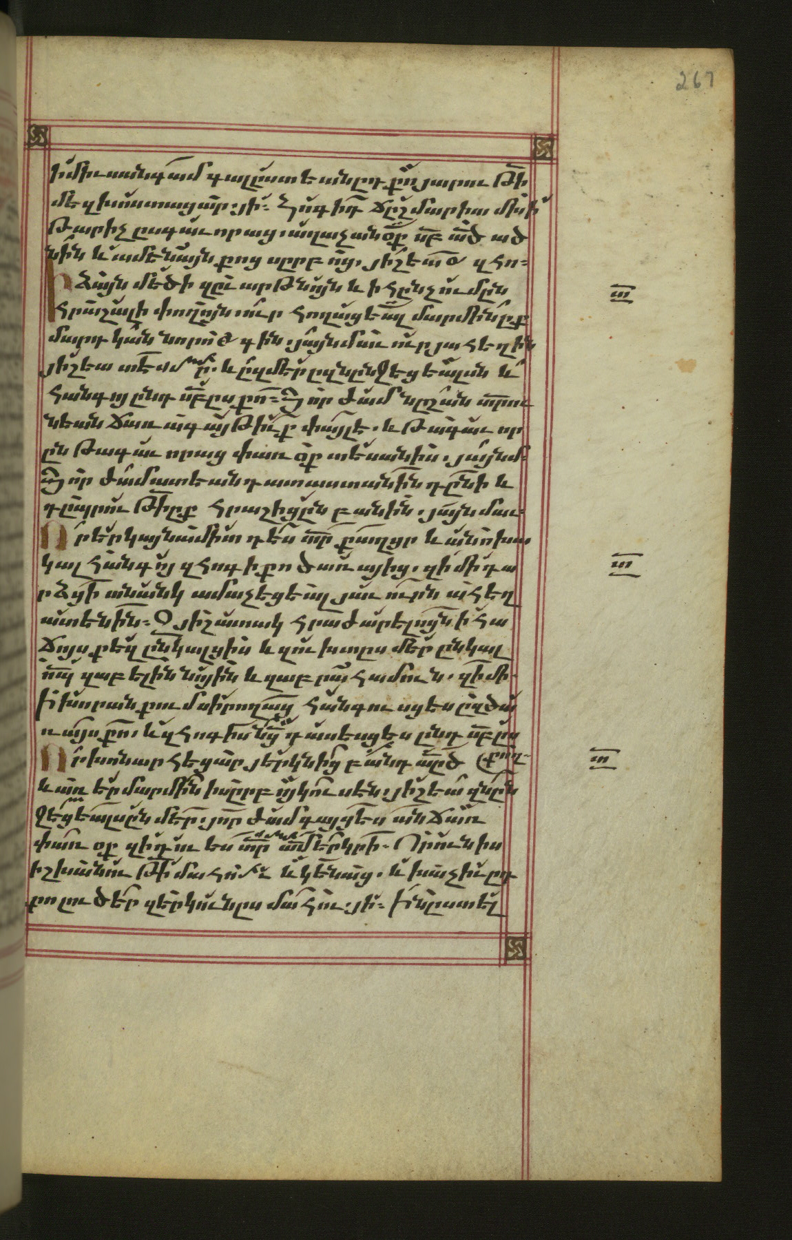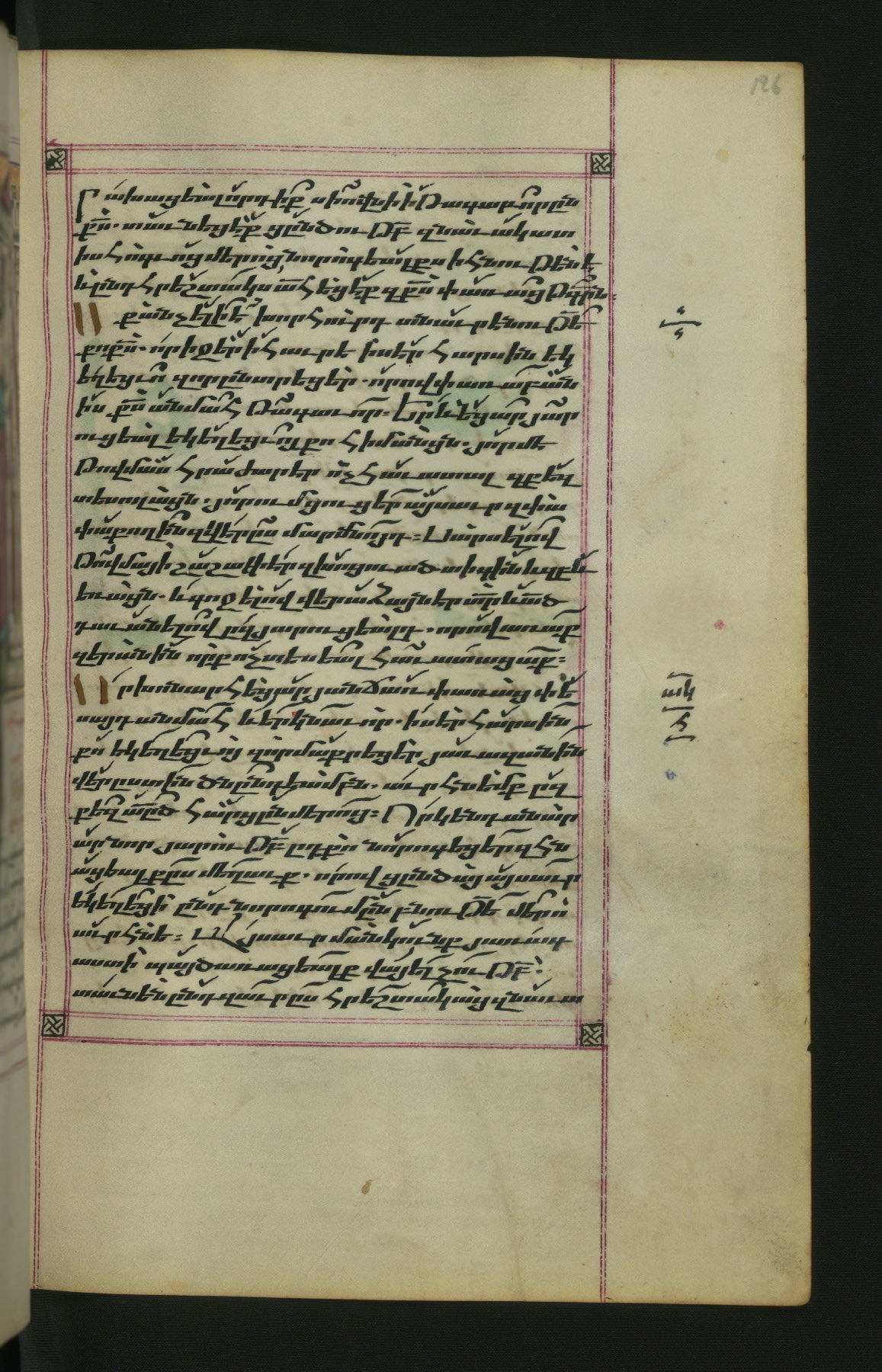 This hymnal was completed in Constantinople on August 15, 1678 [AE 1127], by the priest Yakob Pēligratc‘i, having been commissioned by Člav, son of Nawasard, as a dedication to his sons, Astuacatur and Sahak. The structure of the hymns adheres approximately to the standard Armenian hymnal (Շաբակնոց), with minor variations in order and a few substitutions (see Sanjian in the bibliography). The book is illuminated extensively, with thirty-eight full- and half-page polychrome miniatures against gold backgrounds, eight decorated head-pieces marking the principal divisions of the hymnal, and numerous marginal miniatures marking individual hymns, including biblical figures, saints, bishops, and vignettes. The style of the miniatures is largely in imitation of western European models, though more traditional Armenian and Byzantine influences stand out, such as the vibrant color palette, an iconic frontality for depictions of saints and bishops, and the highly abstracted floral motifs and zoomorphic incipits marking hymn divisions.