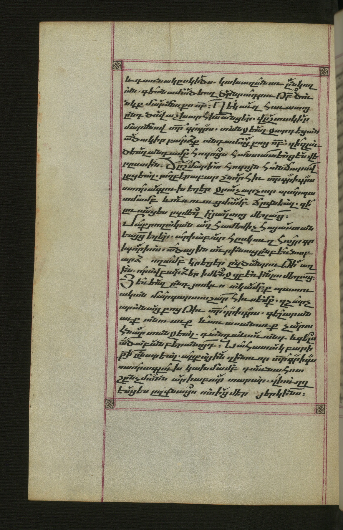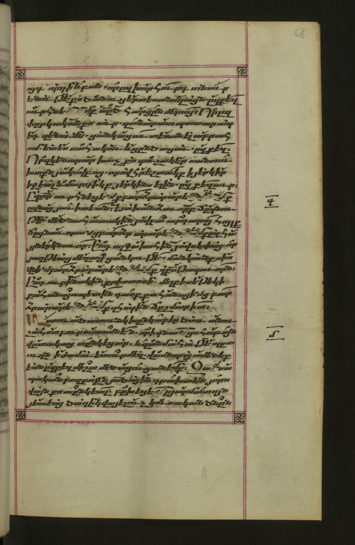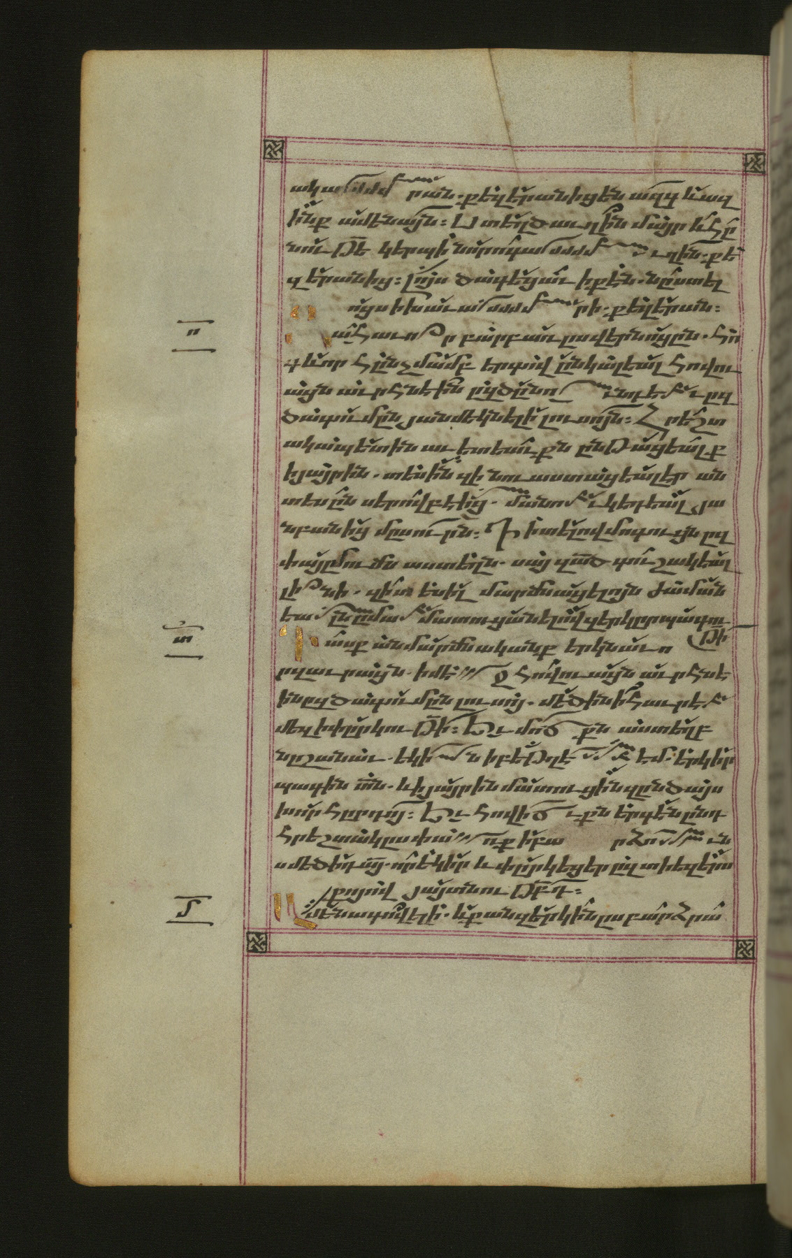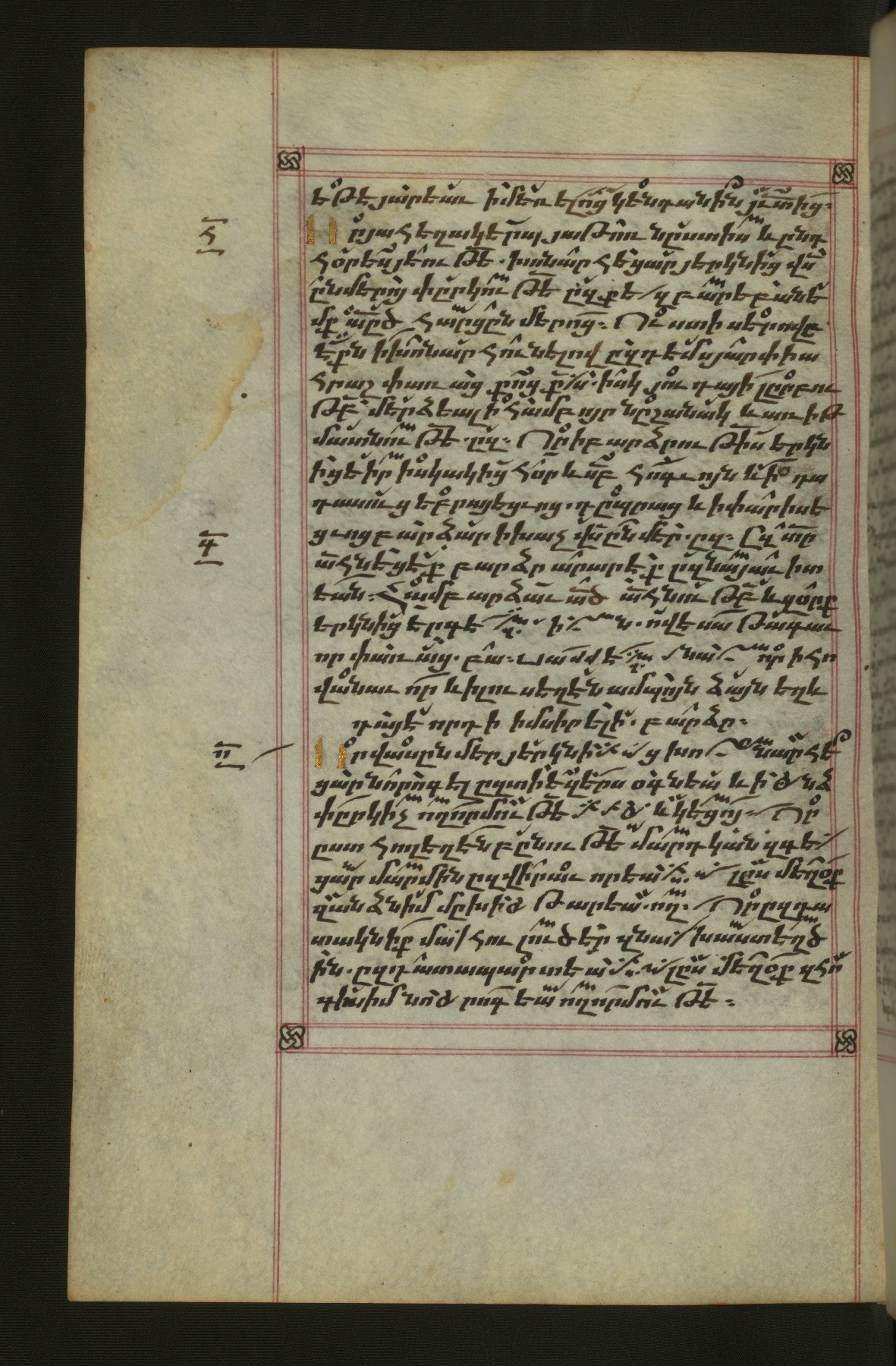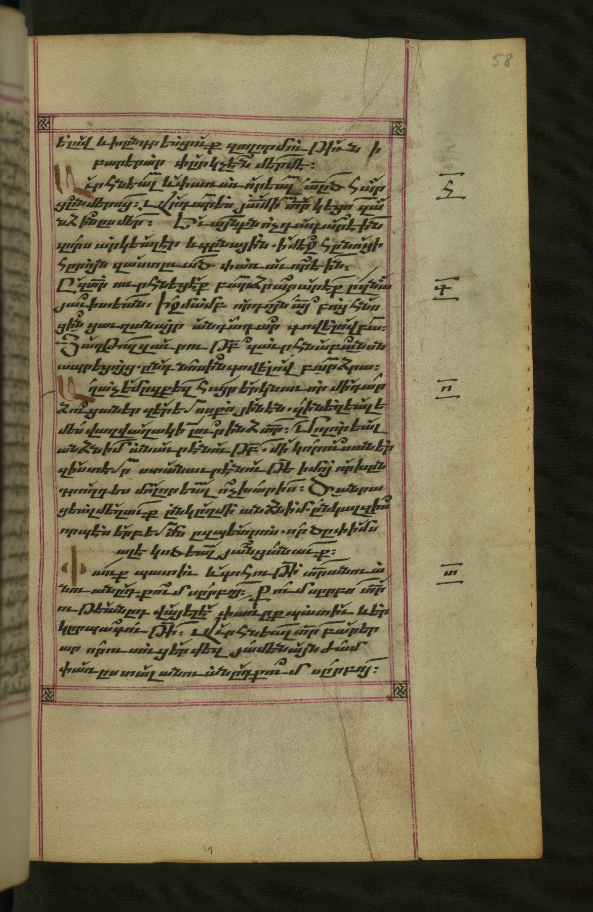 This hymnal was completed in Constantinople on August 15, 1678 [AE 1127], by the priest Yakob Pēligratc‘i, having been commissioned by Člav, son of Nawasard, as a dedication to his sons, Astuacatur and Sahak. The structure of the hymns adheres approximately to the standard Armenian hymnal (Շաբակնոց), with minor variations in order and a few substitutions (see Sanjian in the bibliography). The book is illuminated extensively, with thirty-eight full- and half-page polychrome miniatures against gold backgrounds, eight decorated head-pieces marking the principal divisions of the hymnal, and numerous marginal miniatures marking individual hymns, including biblical figures, saints, bishops, and vignettes. The style of the miniatures is largely in imitation of western European models, though more traditional Armenian and Byzantine influences stand out, such as the vibrant color palette, an iconic frontality for depictions of saints and bishops, and the highly abstracted floral motifs and zoomorphic incipits marking hymn divisions.