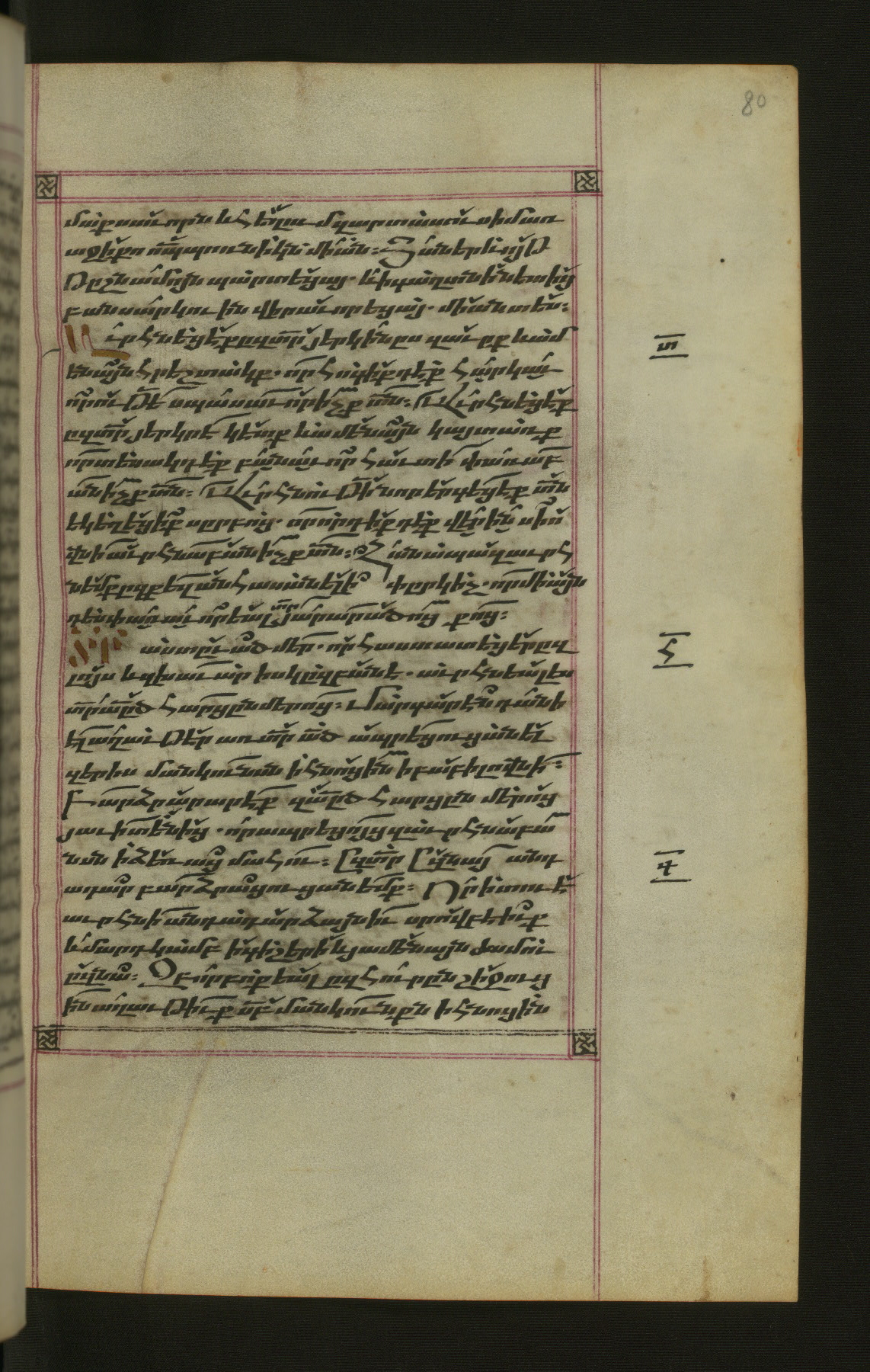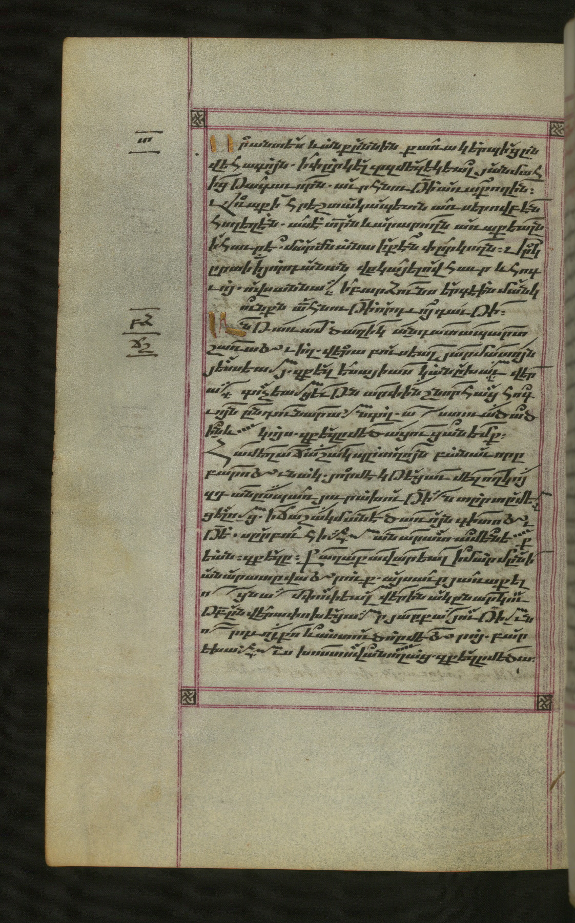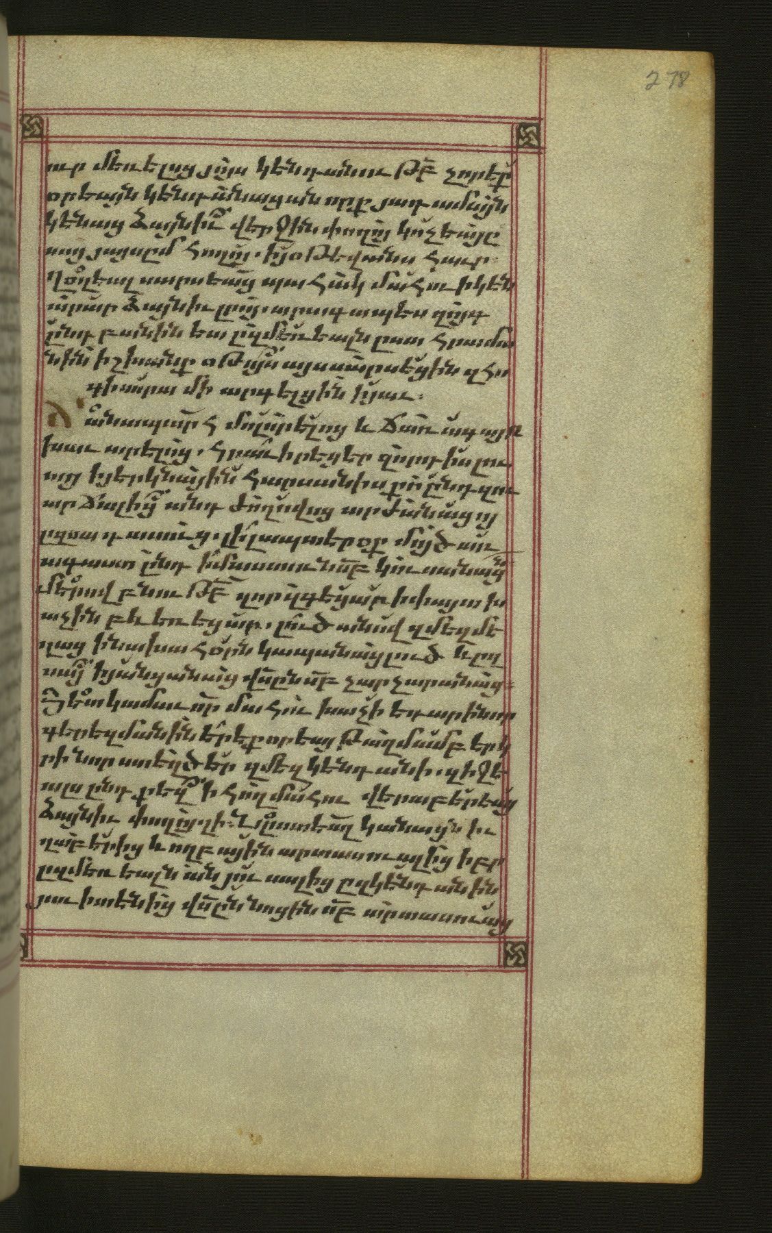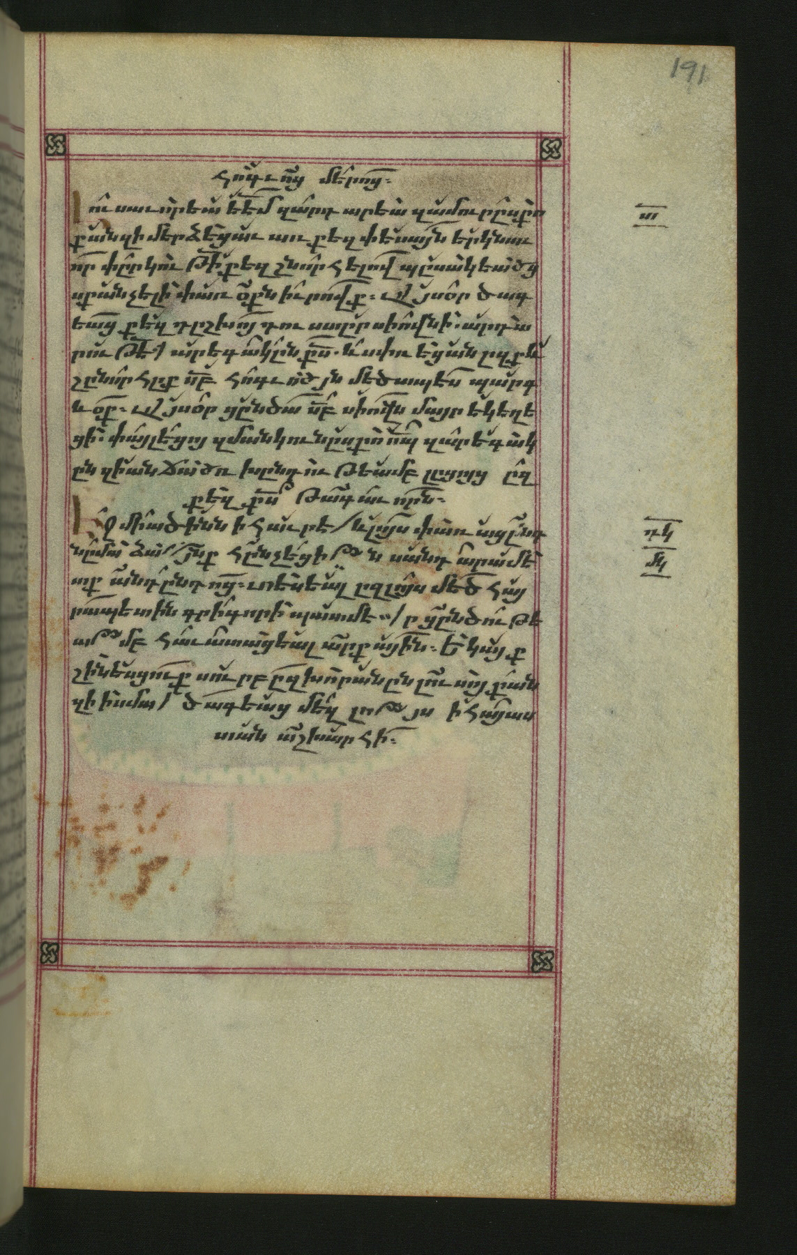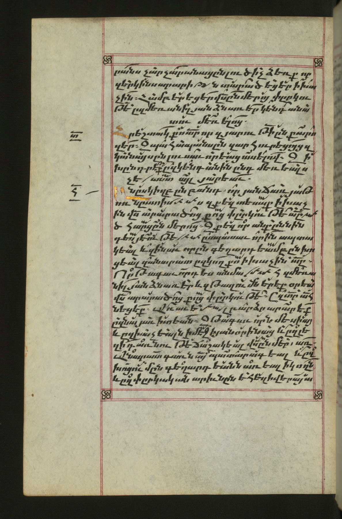 This hymnal was completed in Constantinople on August 15, 1678 [AE 1127], by the priest Yakob Pēligratc‘i, having been commissioned by Člav, son of Nawasard, as a dedication to his sons, Astuacatur and Sahak. The structure of the hymns adheres approximately to the standard Armenian hymnal (Շաբակնոց), with minor variations in order and a few substitutions (see Sanjian in the bibliography). The book is illuminated extensively, with thirty-eight full- and half-page polychrome miniatures against gold backgrounds, eight decorated head-pieces marking the principal divisions of the hymnal, and numerous marginal miniatures marking individual hymns, including biblical figures, saints, bishops, and vignettes. The style of the miniatures is largely in imitation of western European models, though more traditional Armenian and Byzantine influences stand out, such as the vibrant color palette, an iconic frontality for depictions of saints and bishops, and the highly abstracted floral motifs and zoomorphic incipits marking hymn divisions.
