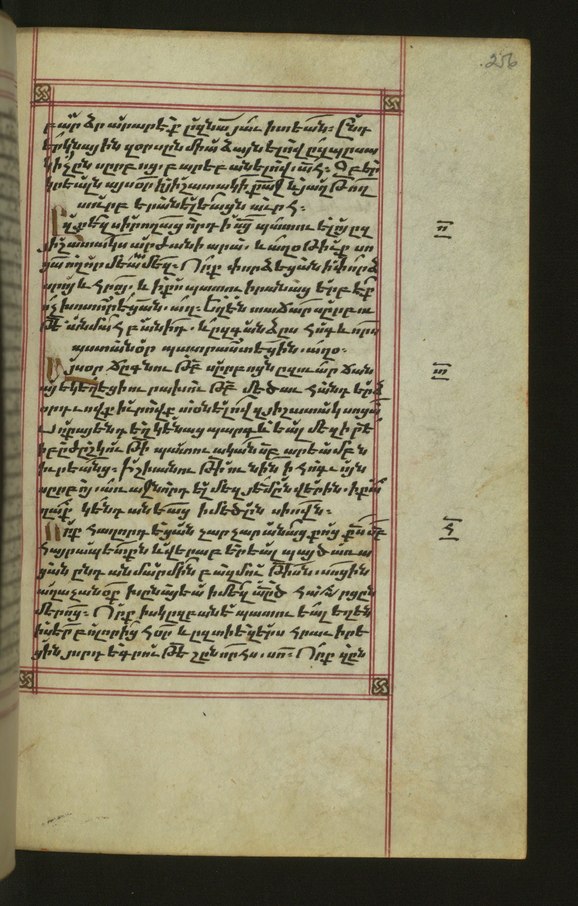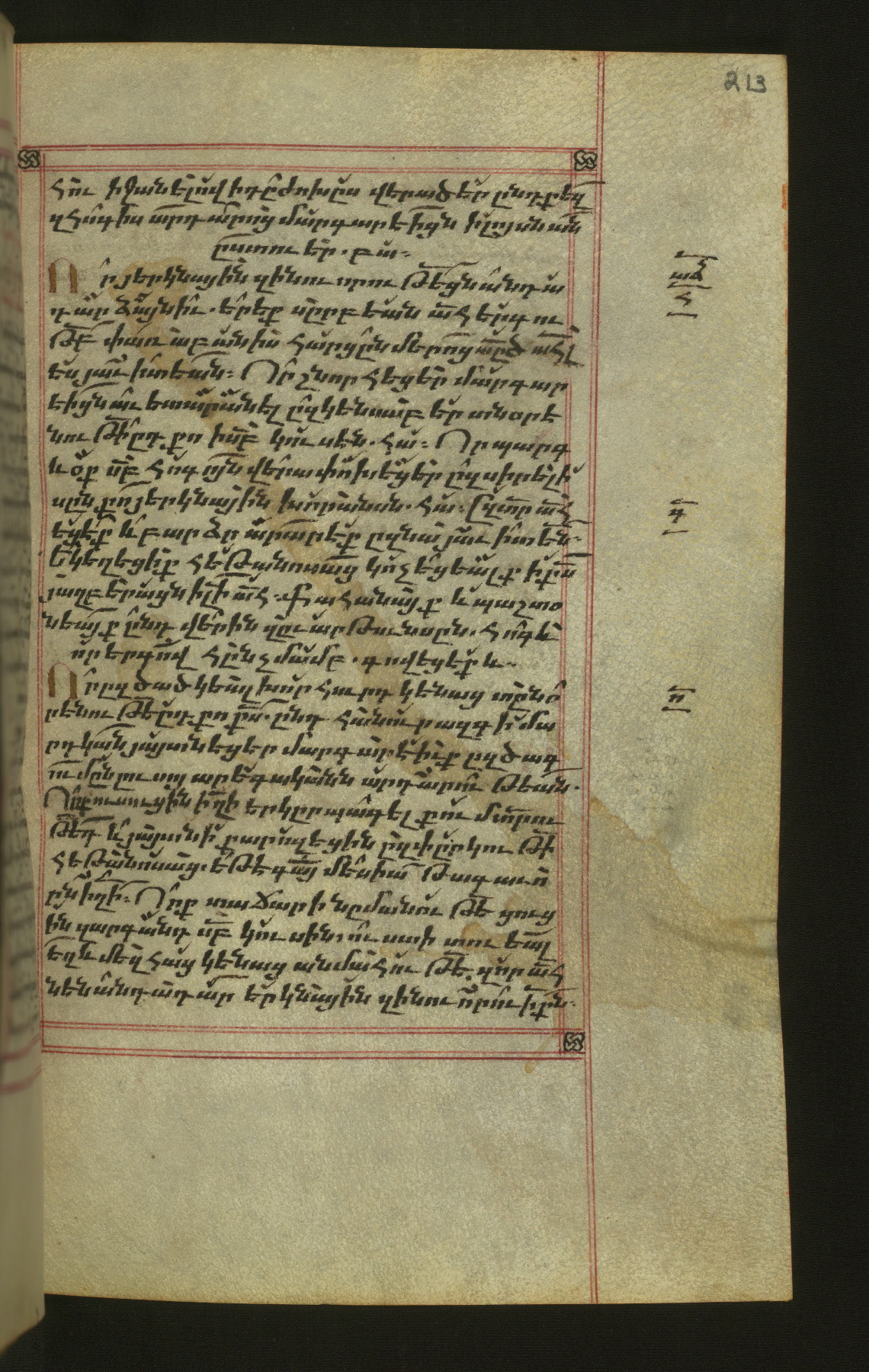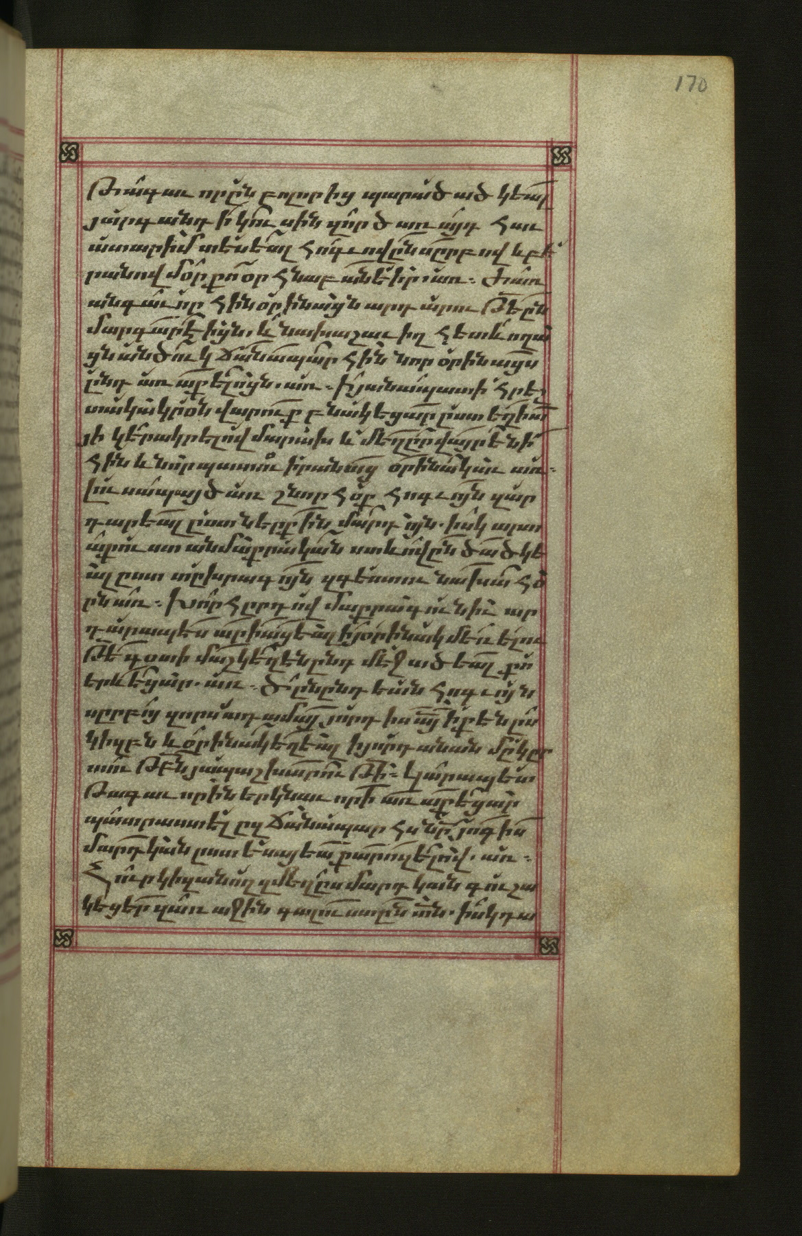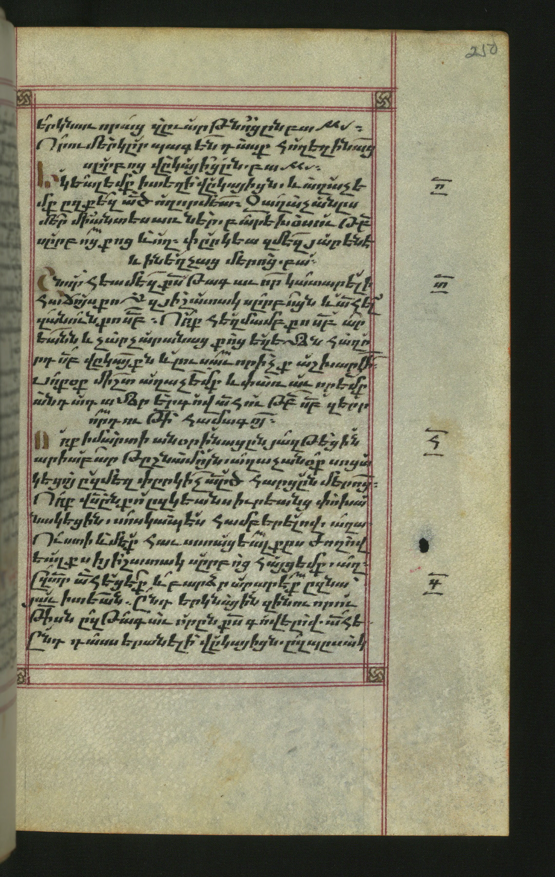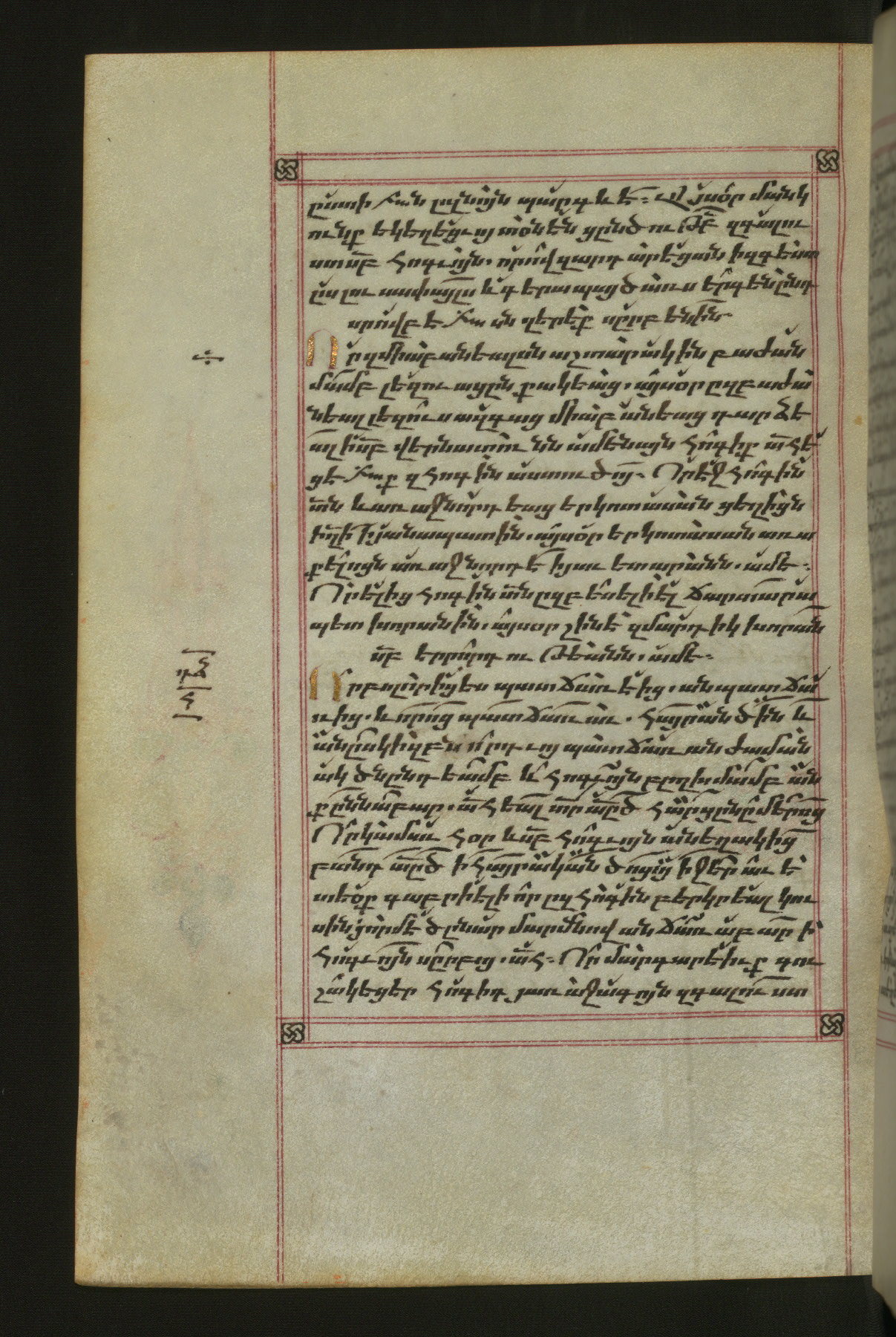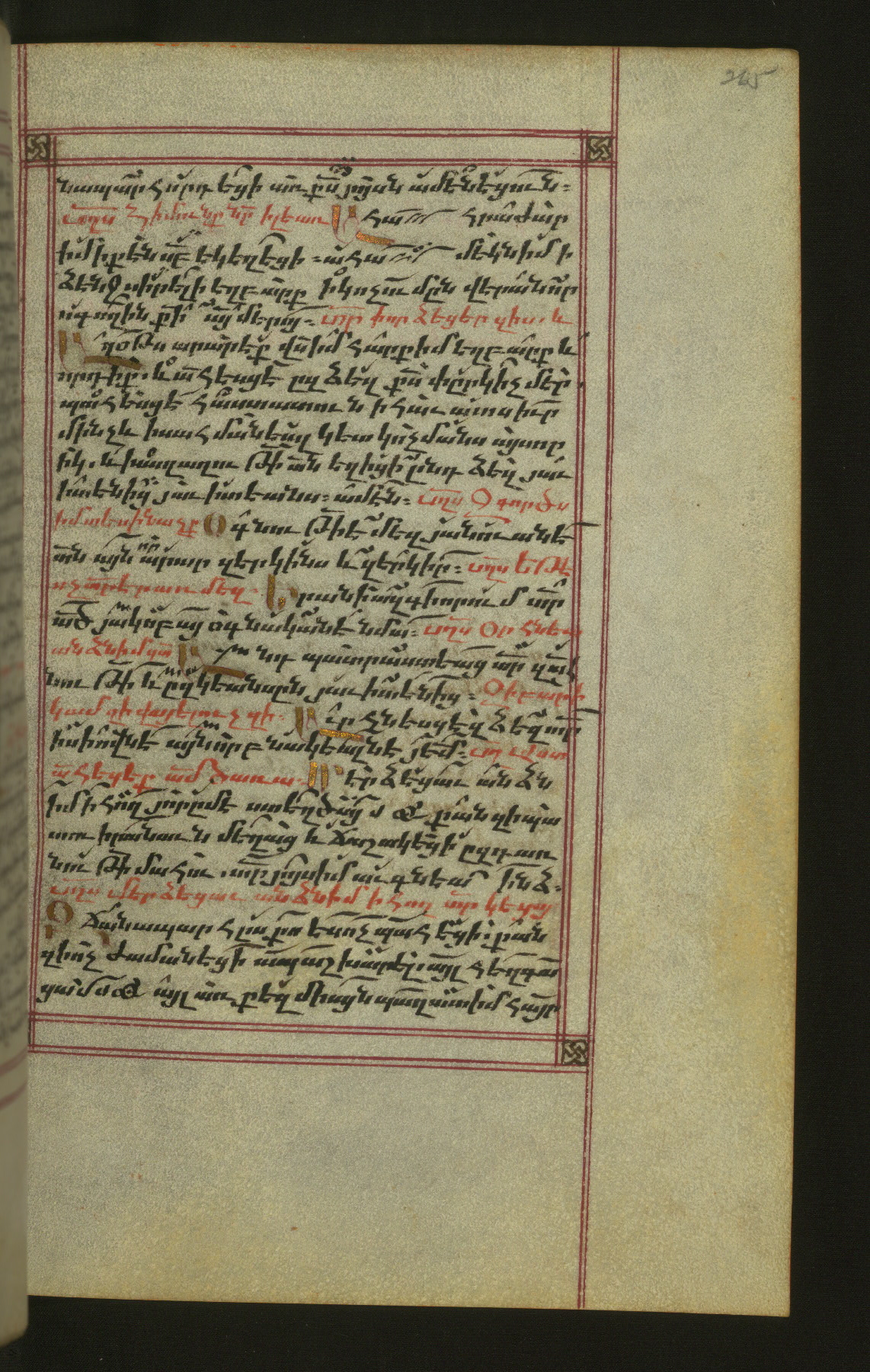 This hymnal was completed in Constantinople on August 15, 1678 [AE 1127], by the priest Yakob Pēligratc‘i, having been commissioned by Člav, son of Nawasard, as a dedication to his sons, Astuacatur and Sahak. The structure of the hymns adheres approximately to the standard Armenian hymnal (Շաբակնոց), with minor variations in order and a few substitutions (see Sanjian in the bibliography). The book is illuminated extensively, with thirty-eight full- and half-page polychrome miniatures against gold backgrounds, eight decorated head-pieces marking the principal divisions of the hymnal, and numerous marginal miniatures marking individual hymns, including biblical figures, saints, bishops, and vignettes. The style of the miniatures is largely in imitation of western European models, though more traditional Armenian and Byzantine influences stand out, such as the vibrant color palette, an iconic frontality for depictions of saints and bishops, and the highly abstracted floral motifs and zoomorphic incipits marking hymn divisions.
