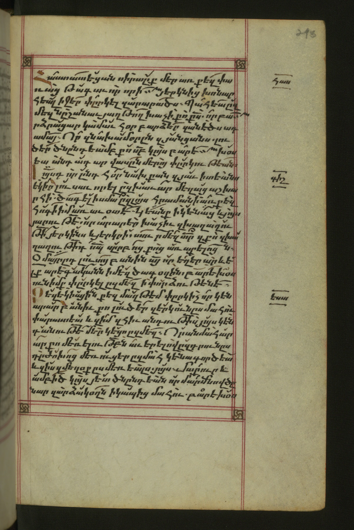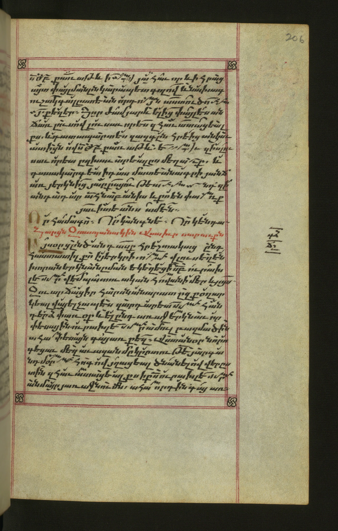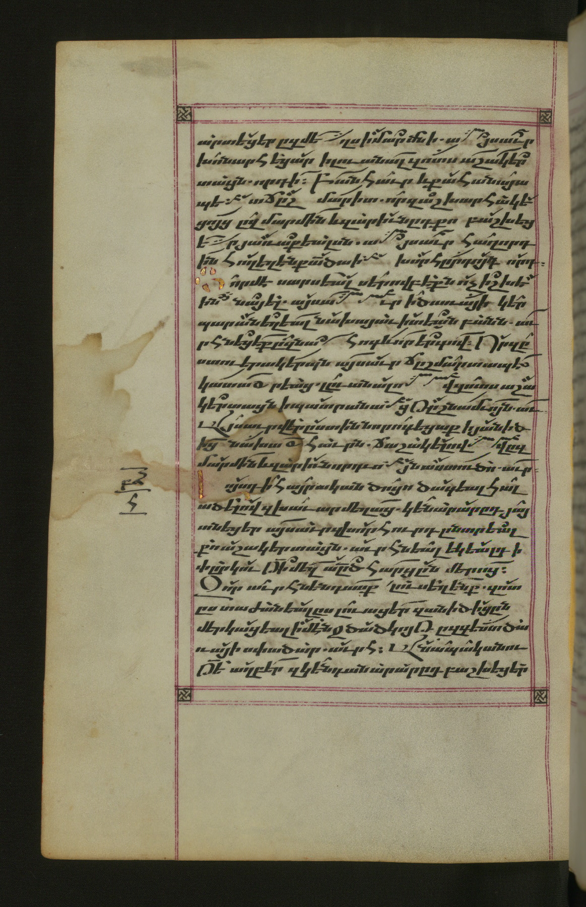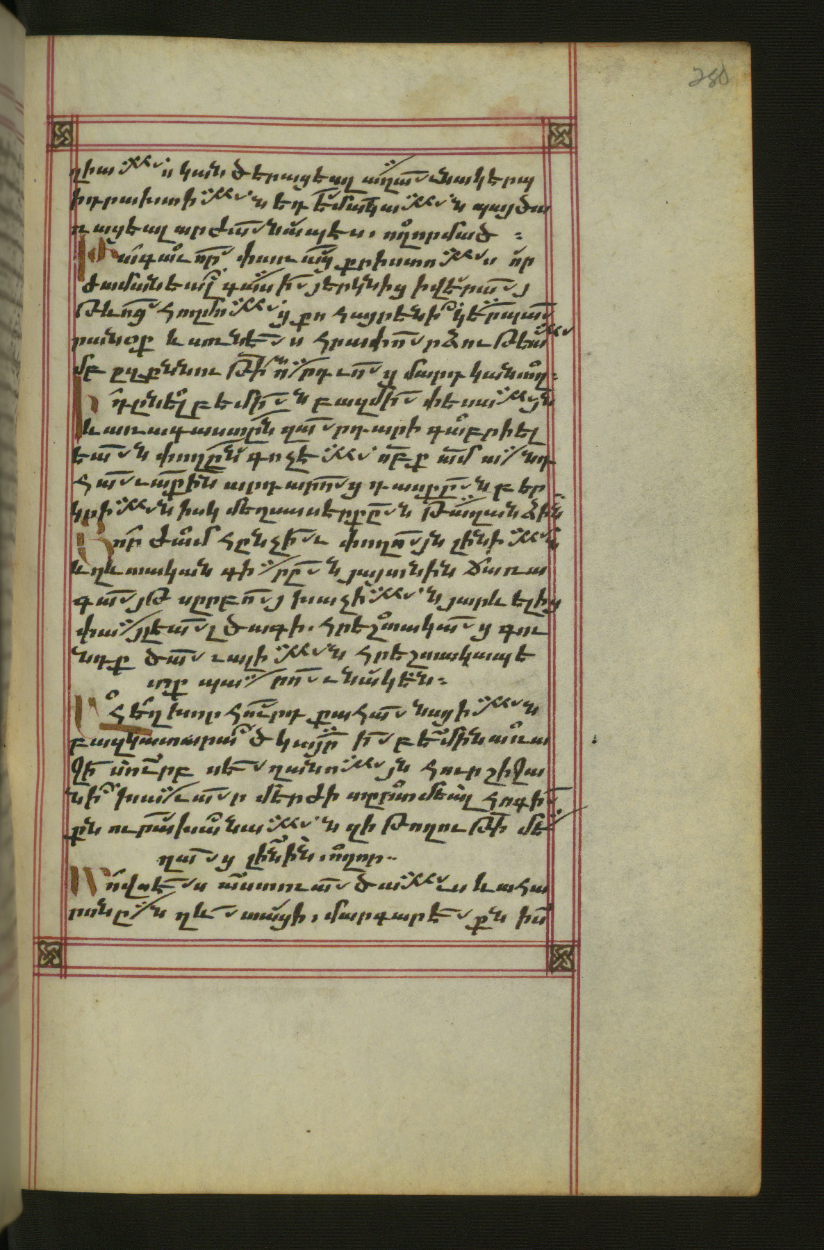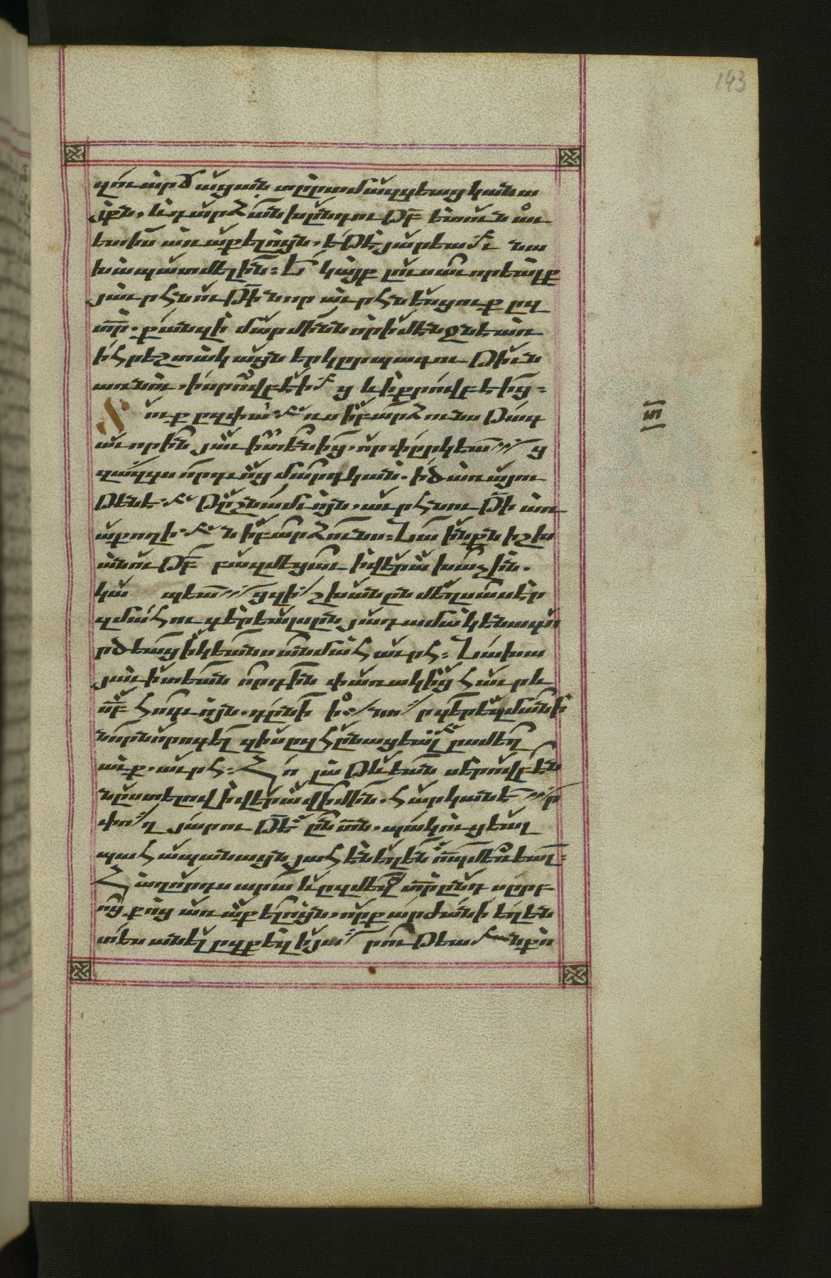 This hymnal was completed in Constantinople on August 15, 1678 [AE 1127], by the priest Yakob Pēligratc‘i, having been commissioned by Člav, son of Nawasard, as a dedication to his sons, Astuacatur and Sahak. The structure of the hymns adheres approximately to the standard Armenian hymnal (Շաբակնոց), with minor variations in order and a few substitutions (see Sanjian in the bibliography). The book is illuminated extensively, with thirty-eight full- and half-page polychrome miniatures against gold backgrounds, eight decorated head-pieces marking the principal divisions of the hymnal, and numerous marginal miniatures marking individual hymns, including biblical figures, saints, bishops, and vignettes. The style of the miniatures is largely in imitation of western European models, though more traditional Armenian and Byzantine influences stand out, such as the vibrant color palette, an iconic frontality for depictions of saints and bishops, and the highly abstracted floral motifs and zoomorphic incipits marking hymn divisions.