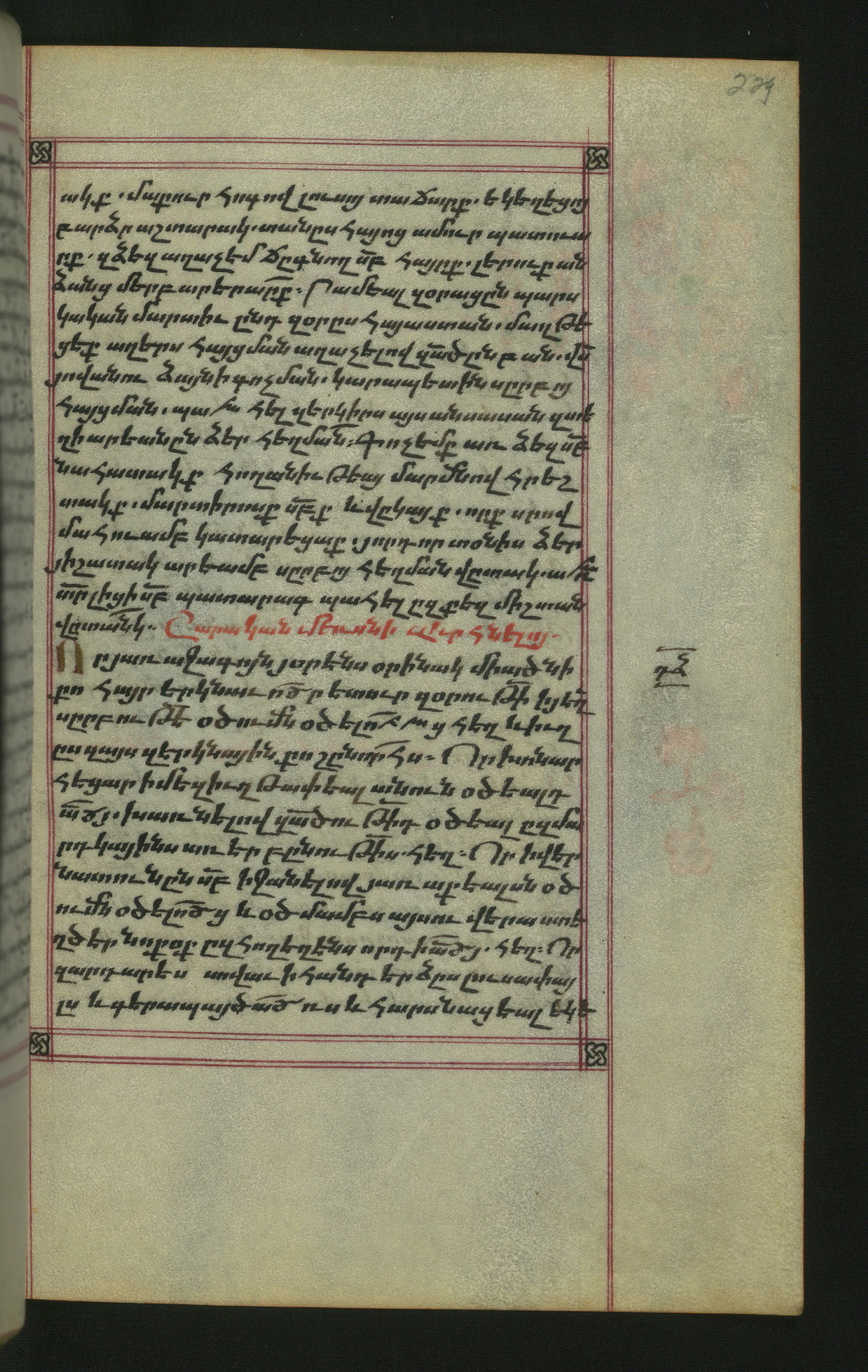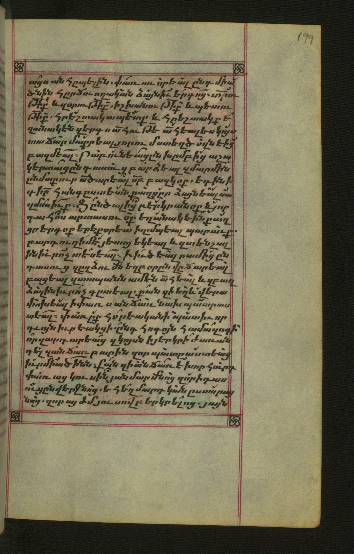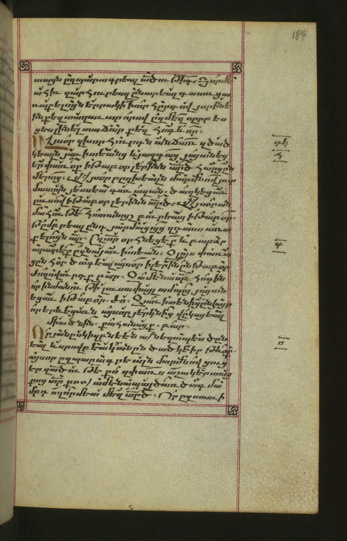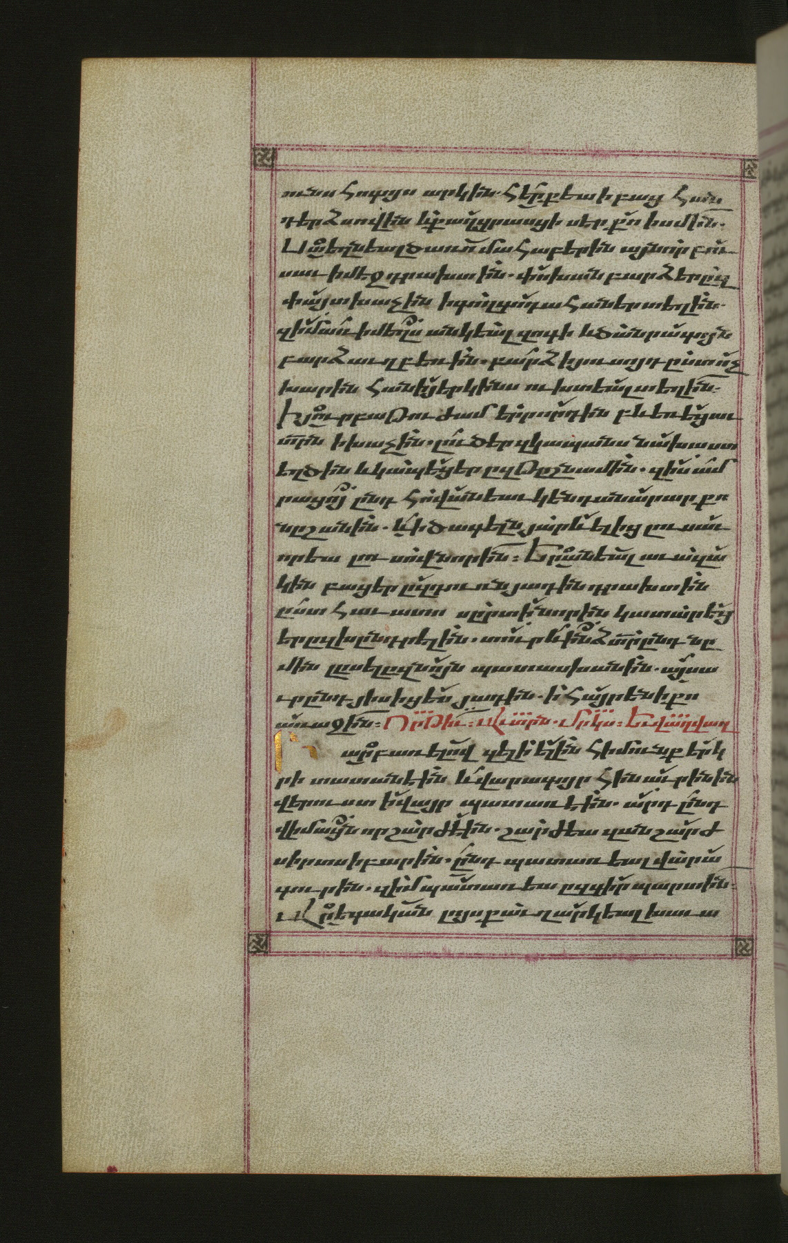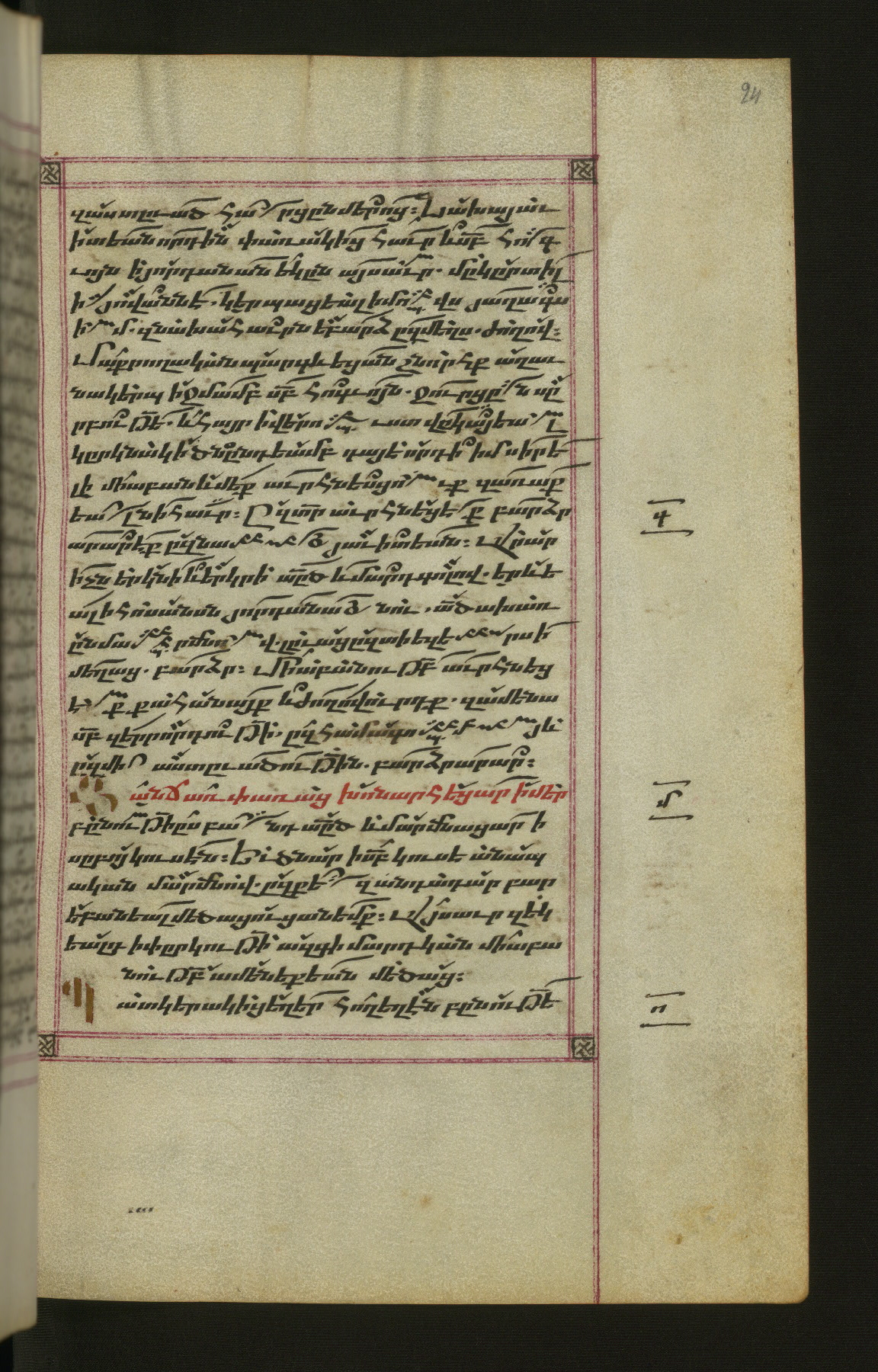 This hymnal was completed in Constantinople on August 15, 1678 [AE 1127], by the priest Yakob Pēligratc‘i, having been commissioned by Člav, son of Nawasard, as a dedication to his sons, Astuacatur and Sahak. The structure of the hymns adheres approximately to the standard Armenian hymnal (Շաբակնոց), with minor variations in order and a few substitutions (see Sanjian in the bibliography). The book is illuminated extensively, with thirty-eight full- and half-page polychrome miniatures against gold backgrounds, eight decorated head-pieces marking the principal divisions of the hymnal, and numerous marginal miniatures marking individual hymns, including biblical figures, saints, bishops, and vignettes. The style of the miniatures is largely in imitation of western European models, though more traditional Armenian and Byzantine influences stand out, such as the vibrant color palette, an iconic frontality for depictions of saints and bishops, and the highly abstracted floral motifs and zoomorphic incipits marking hymn divisions.