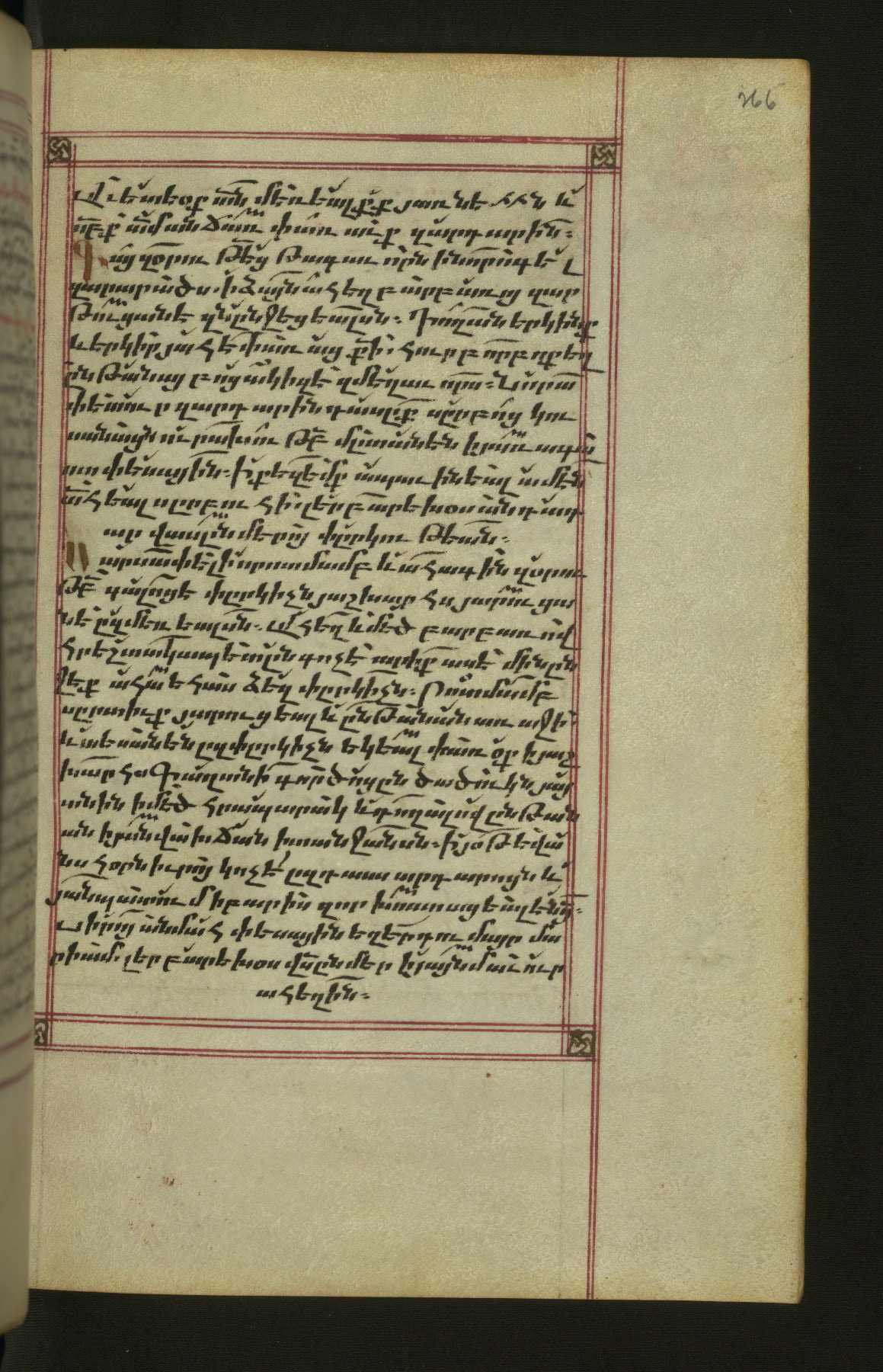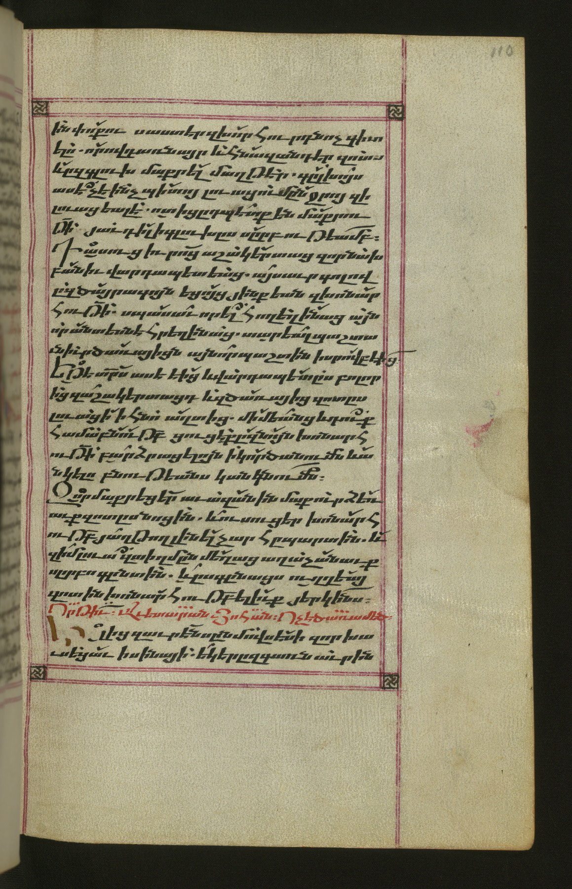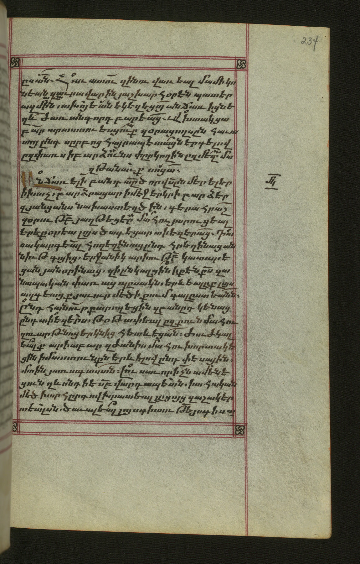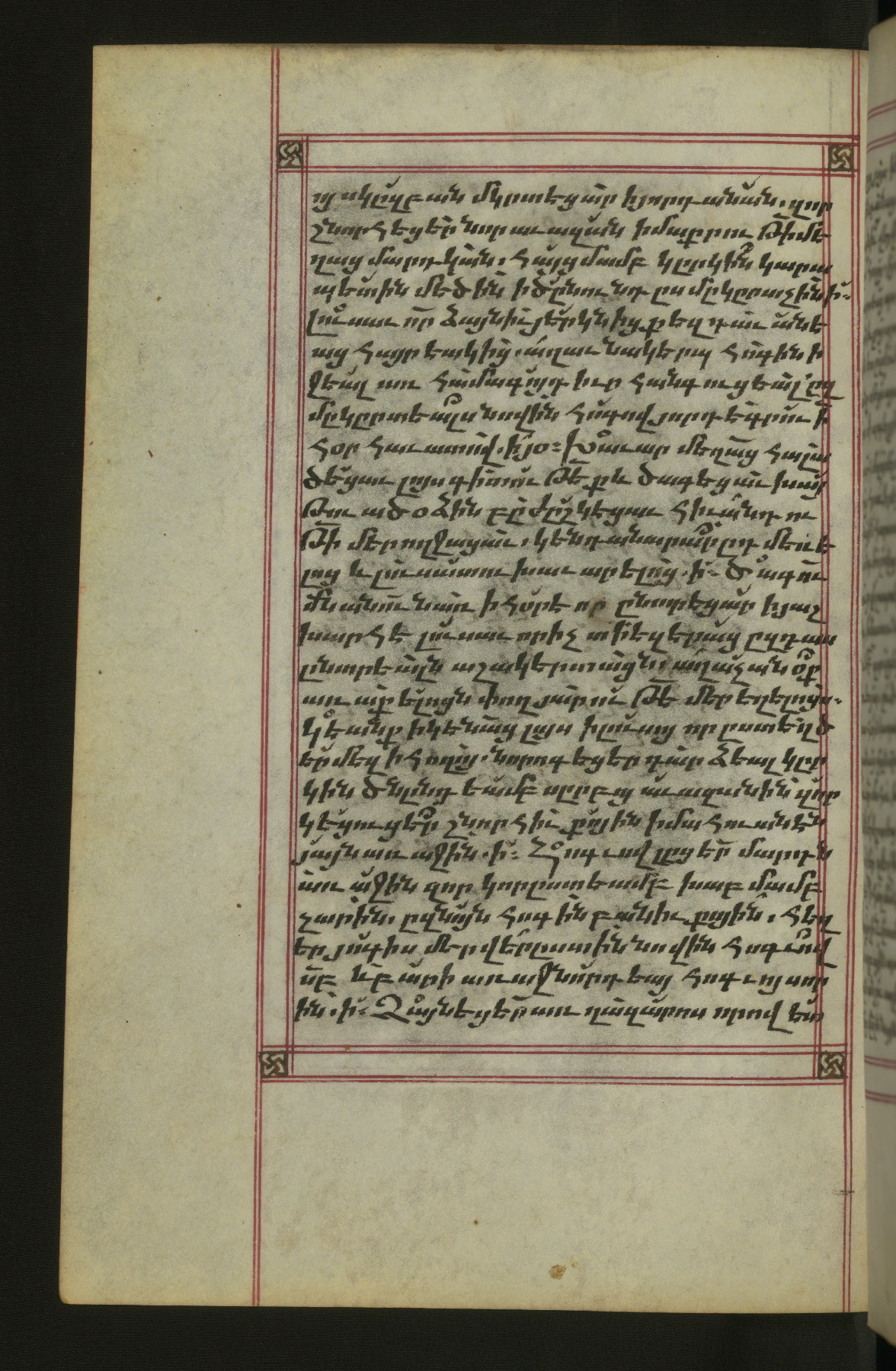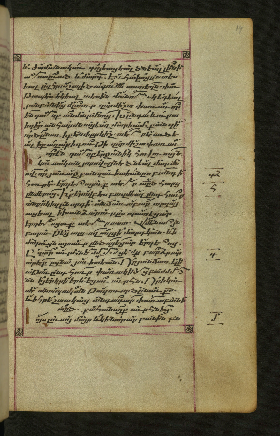 This hymnal was completed in Constantinople on August 15, 1678 [AE 1127], by the priest Yakob Pēligratc‘i, having been commissioned by Člav, son of Nawasard, as a dedication to his sons, Astuacatur and Sahak. The structure of the hymns adheres approximately to the standard Armenian hymnal (Շաբակնոց), with minor variations in order and a few substitutions (see Sanjian in the bibliography). The book is illuminated extensively, with thirty-eight full- and half-page polychrome miniatures against gold backgrounds, eight decorated head-pieces marking the principal divisions of the hymnal, and numerous marginal miniatures marking individual hymns, including biblical figures, saints, bishops, and vignettes. The style of the miniatures is largely in imitation of western European models, though more traditional Armenian and Byzantine influences stand out, such as the vibrant color palette, an iconic frontality for depictions of saints and bishops, and the highly abstracted floral motifs and zoomorphic incipits marking hymn divisions.