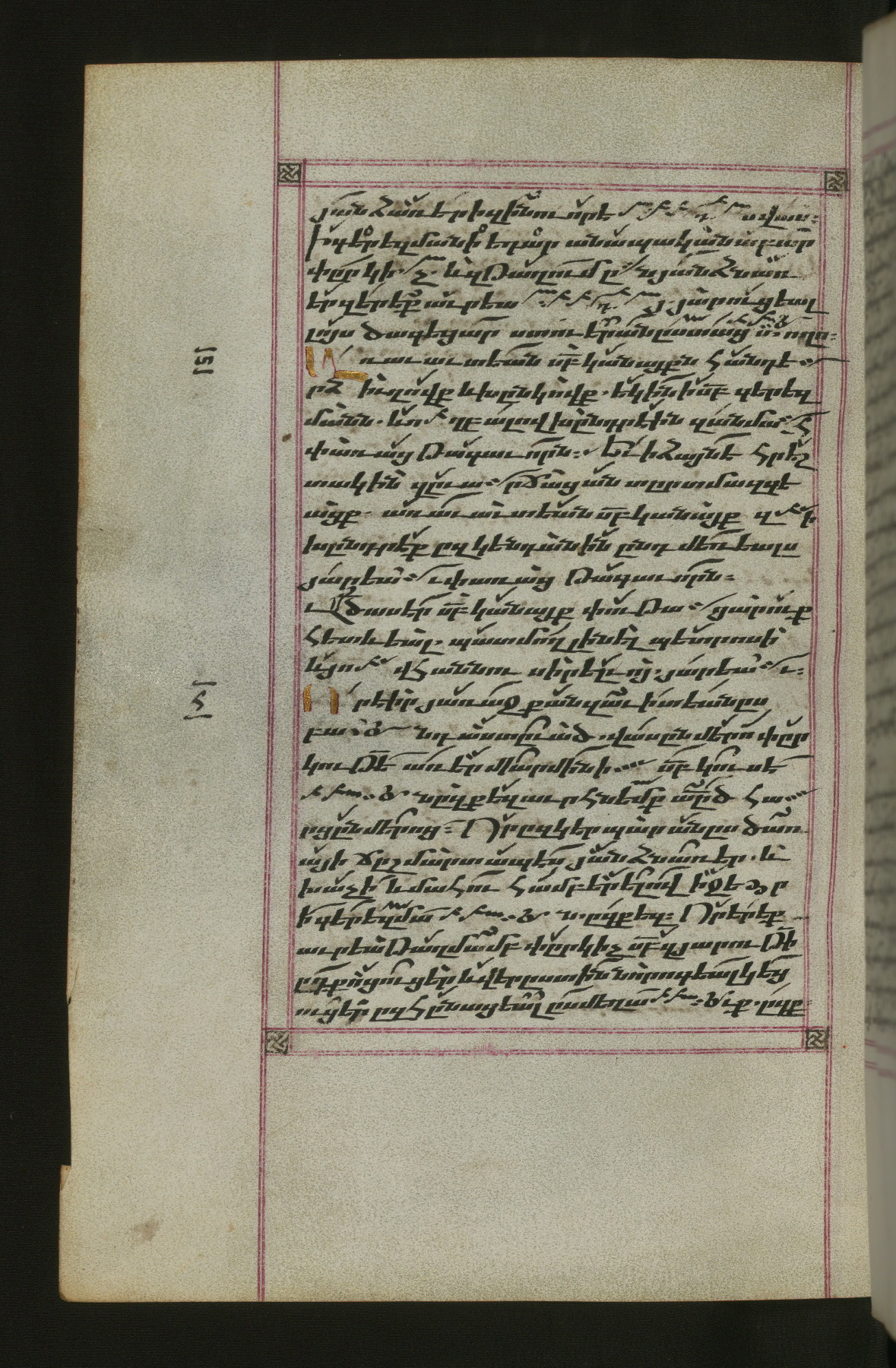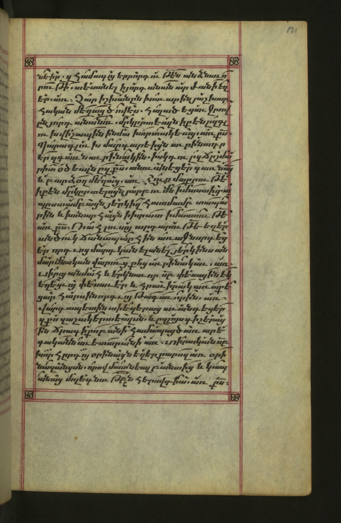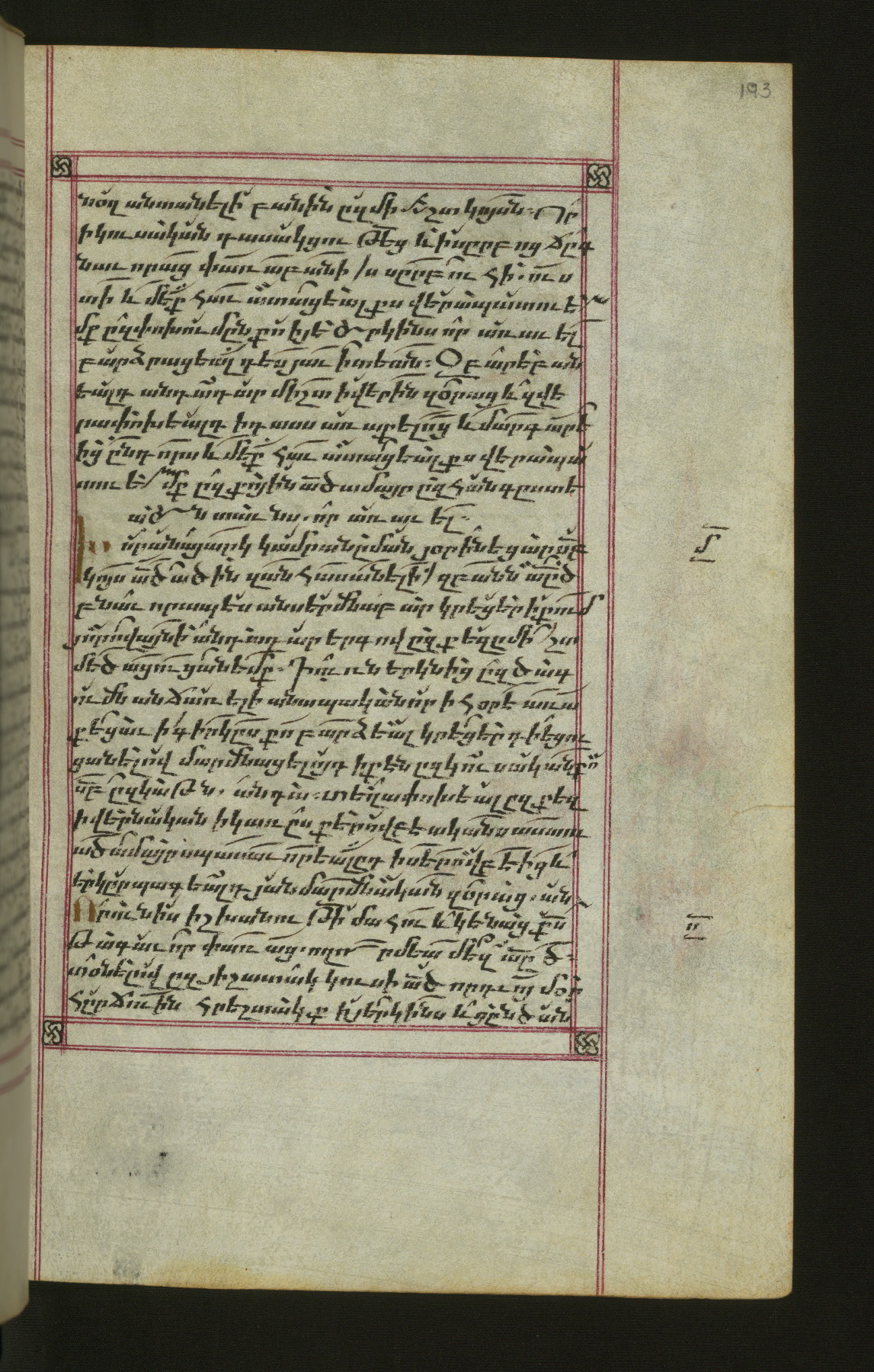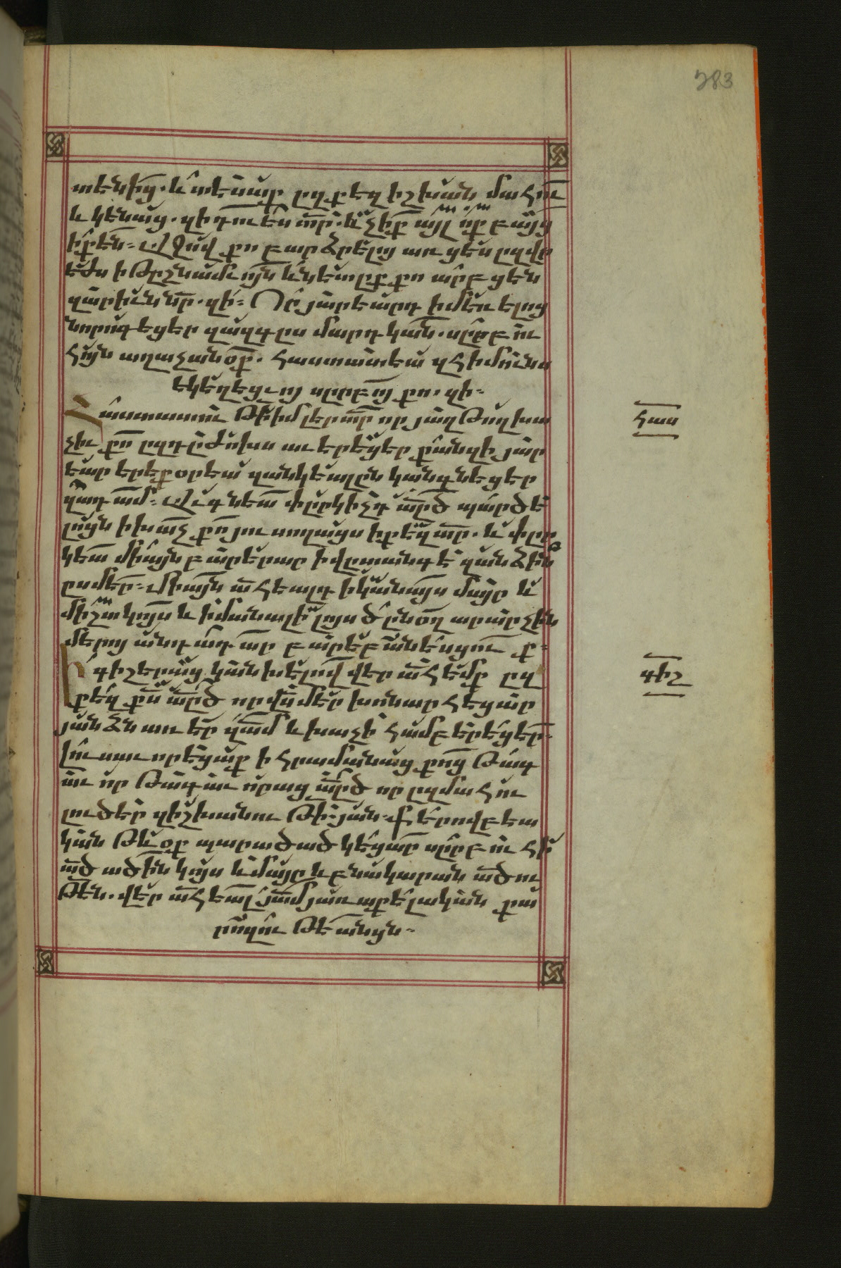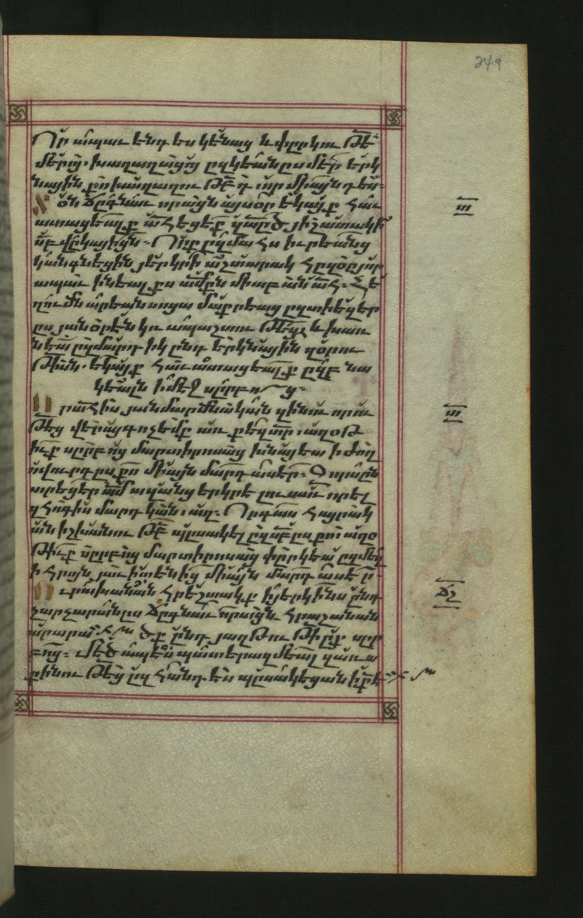 This hymnal was completed in Constantinople on August 15, 1678 [AE 1127], by the priest Yakob Pēligratc‘i, having been commissioned by Člav, son of Nawasard, as a dedication to his sons, Astuacatur and Sahak. The structure of the hymns adheres approximately to the standard Armenian hymnal (Շաբակնոց), with minor variations in order and a few substitutions (see Sanjian in the bibliography). The book is illuminated extensively, with thirty-eight full- and half-page polychrome miniatures against gold backgrounds, eight decorated head-pieces marking the principal divisions of the hymnal, and numerous marginal miniatures marking individual hymns, including biblical figures, saints, bishops, and vignettes. The style of the miniatures is largely in imitation of western European models, though more traditional Armenian and Byzantine influences stand out, such as the vibrant color palette, an iconic frontality for depictions of saints and bishops, and the highly abstracted floral motifs and zoomorphic incipits marking hymn divisions.