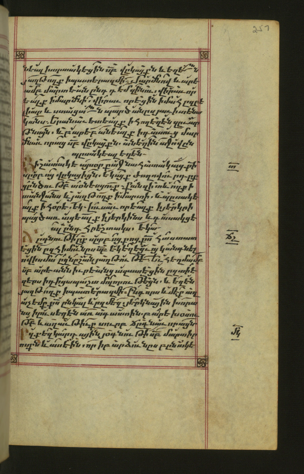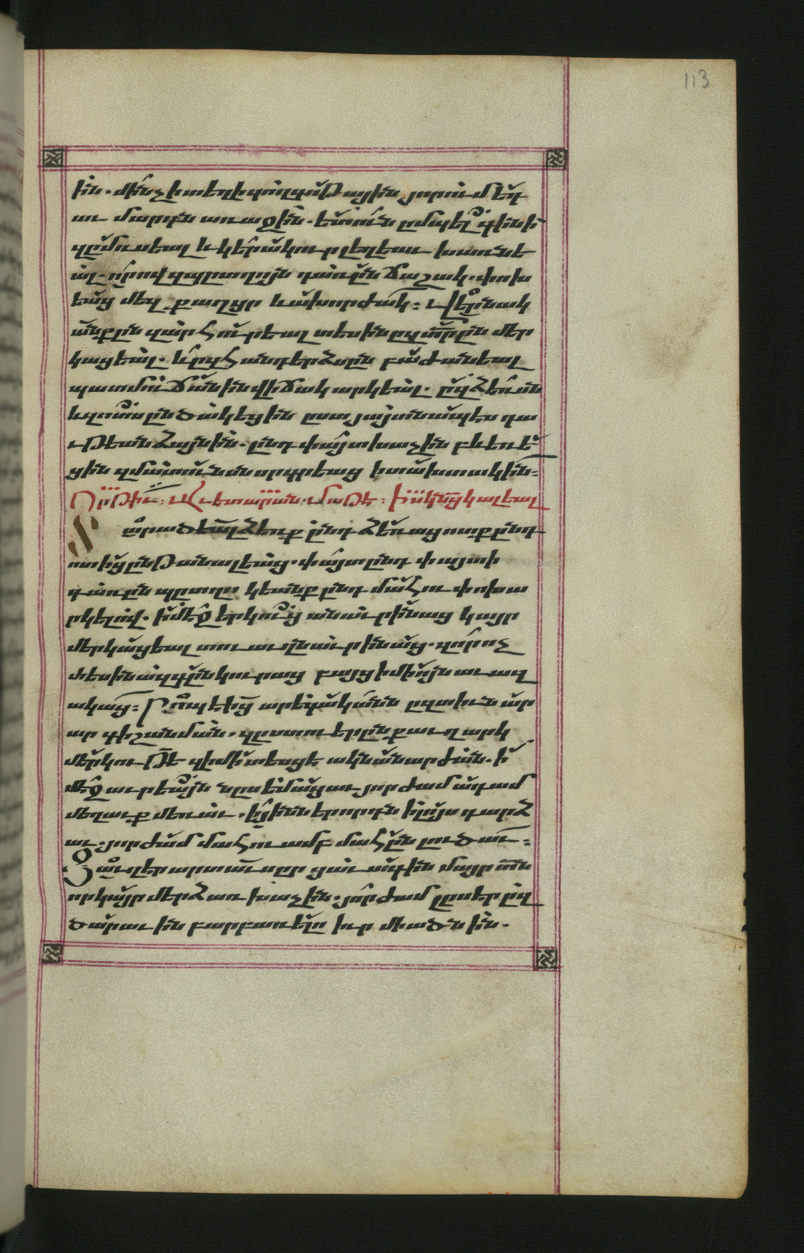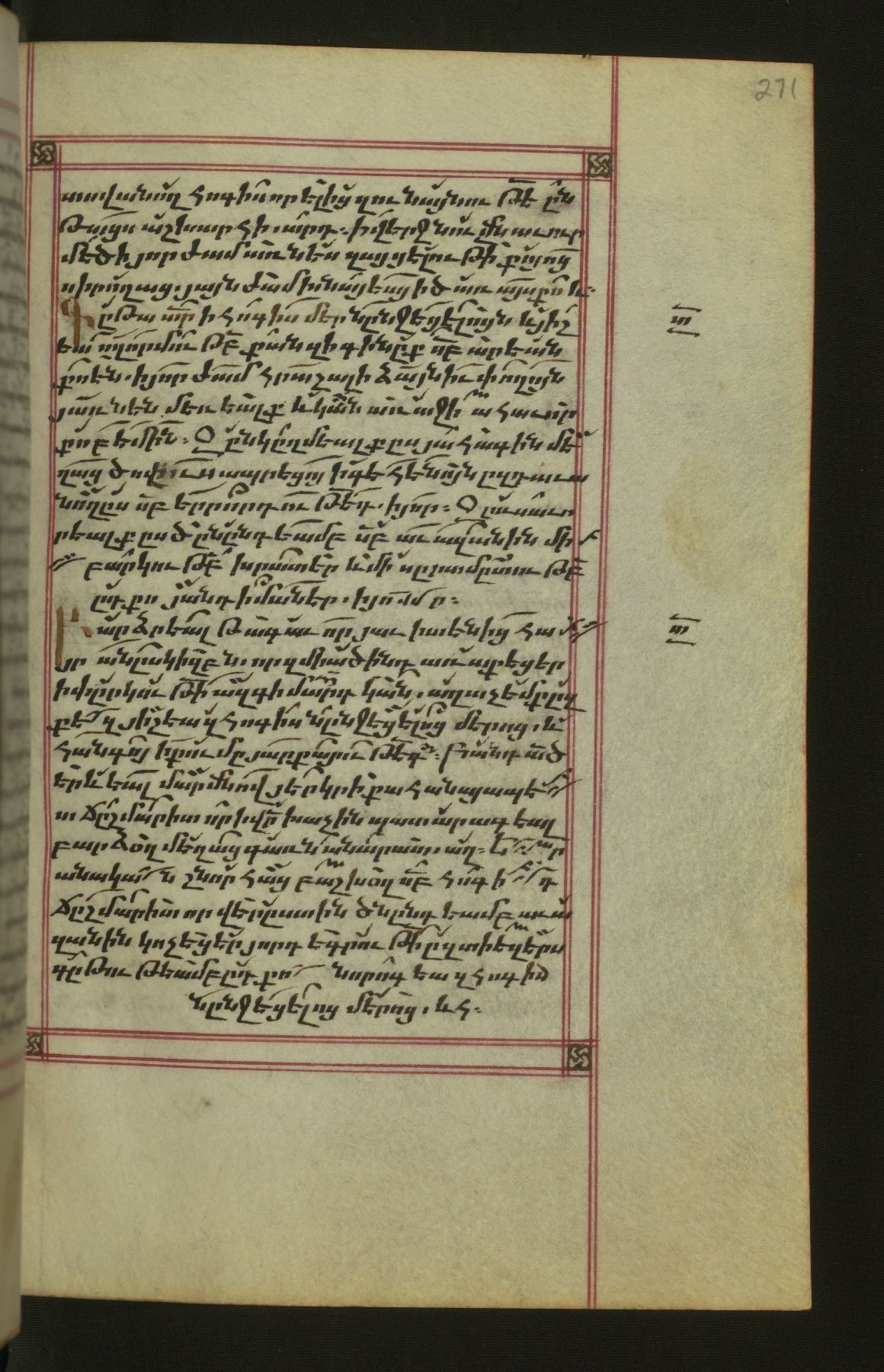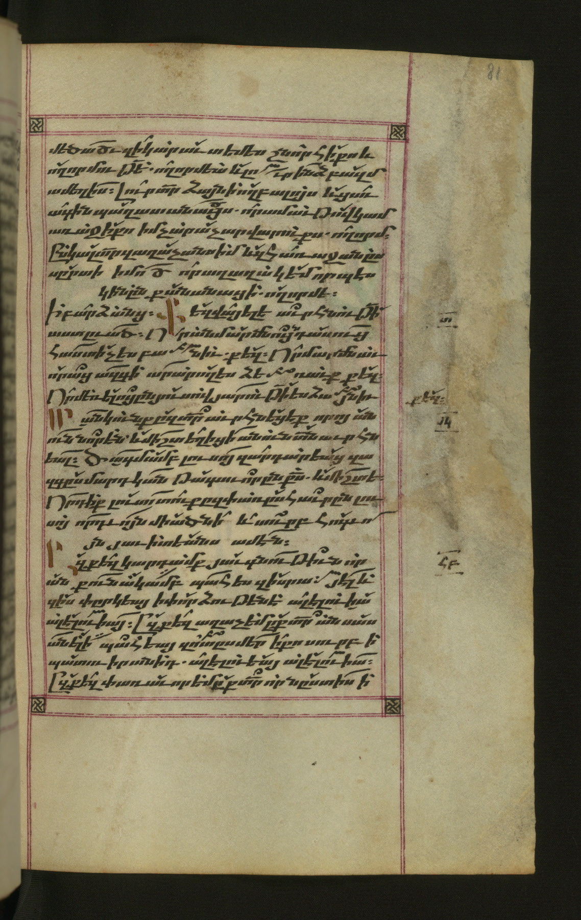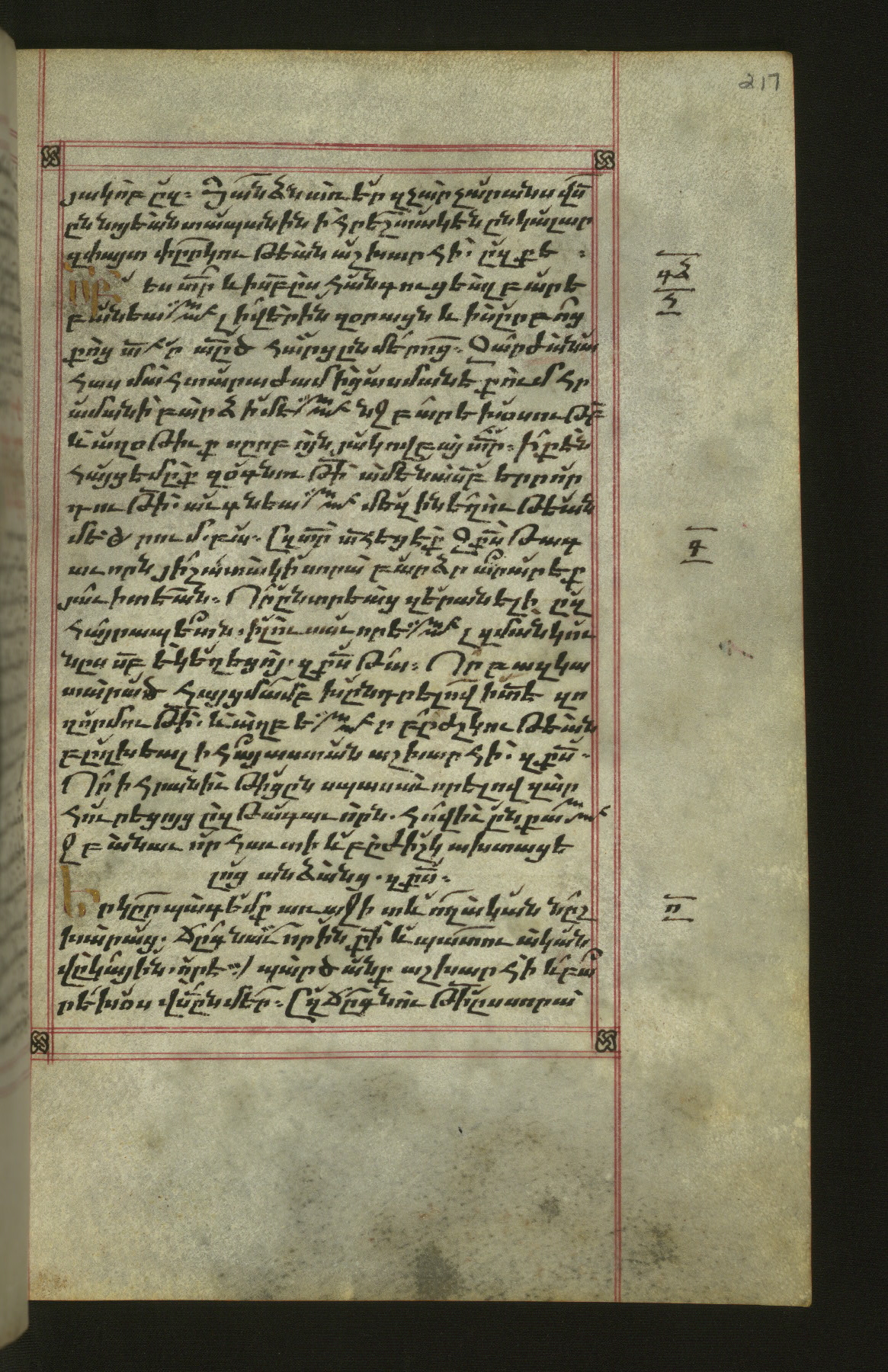 This hymnal was completed in Constantinople on August 15, 1678 [AE 1127], by the priest Yakob Pēligratc‘i, having been commissioned by Člav, son of Nawasard, as a dedication to his sons, Astuacatur and Sahak. The structure of the hymns adheres approximately to the standard Armenian hymnal (Շաբակնոց), with minor variations in order and a few substitutions (see Sanjian in the bibliography). The book is illuminated extensively, with thirty-eight full- and half-page polychrome miniatures against gold backgrounds, eight decorated head-pieces marking the principal divisions of the hymnal, and numerous marginal miniatures marking individual hymns, including biblical figures, saints, bishops, and vignettes. The style of the miniatures is largely in imitation of western European models, though more traditional Armenian and Byzantine influences stand out, such as the vibrant color palette, an iconic frontality for depictions of saints and bishops, and the highly abstracted floral motifs and zoomorphic incipits marking hymn divisions.