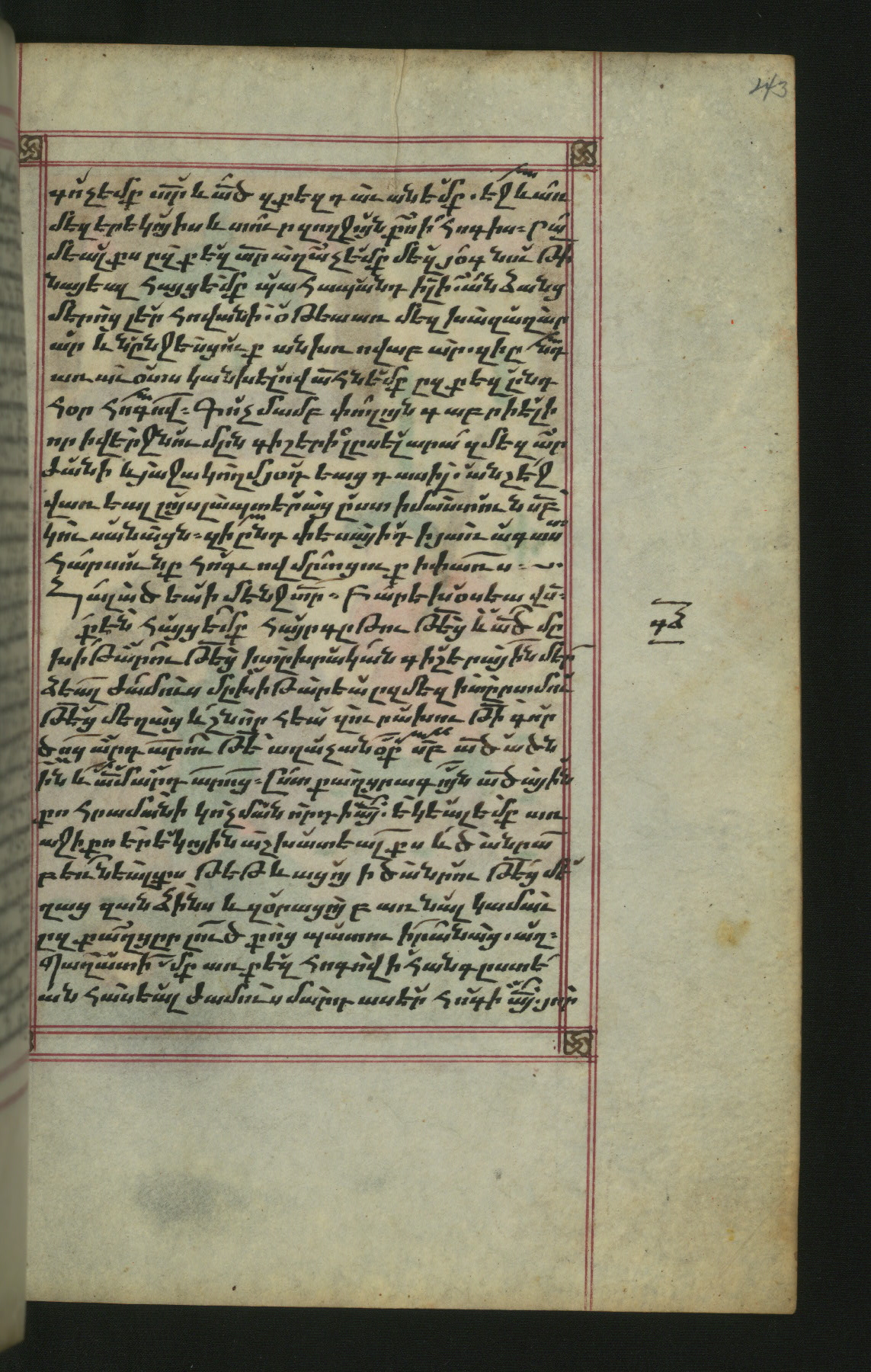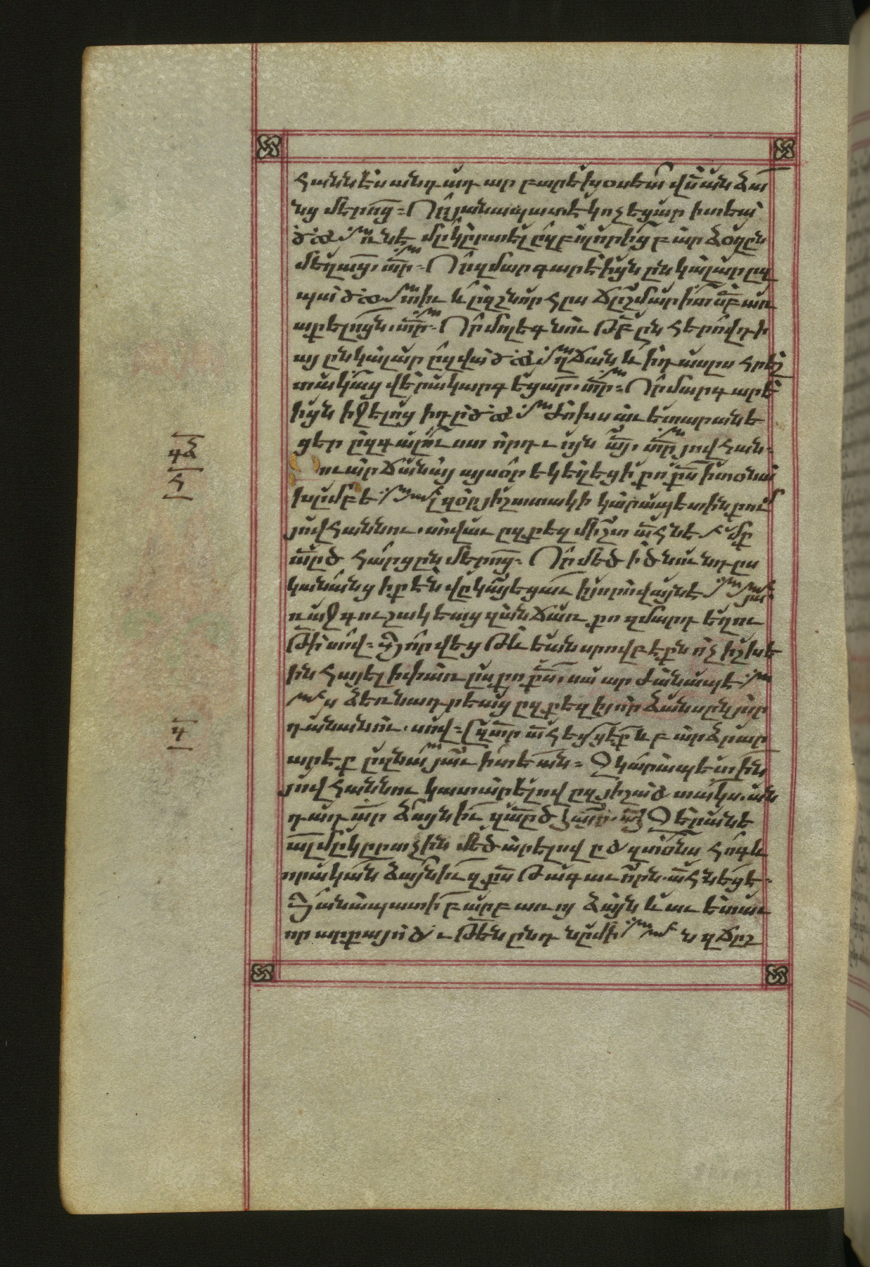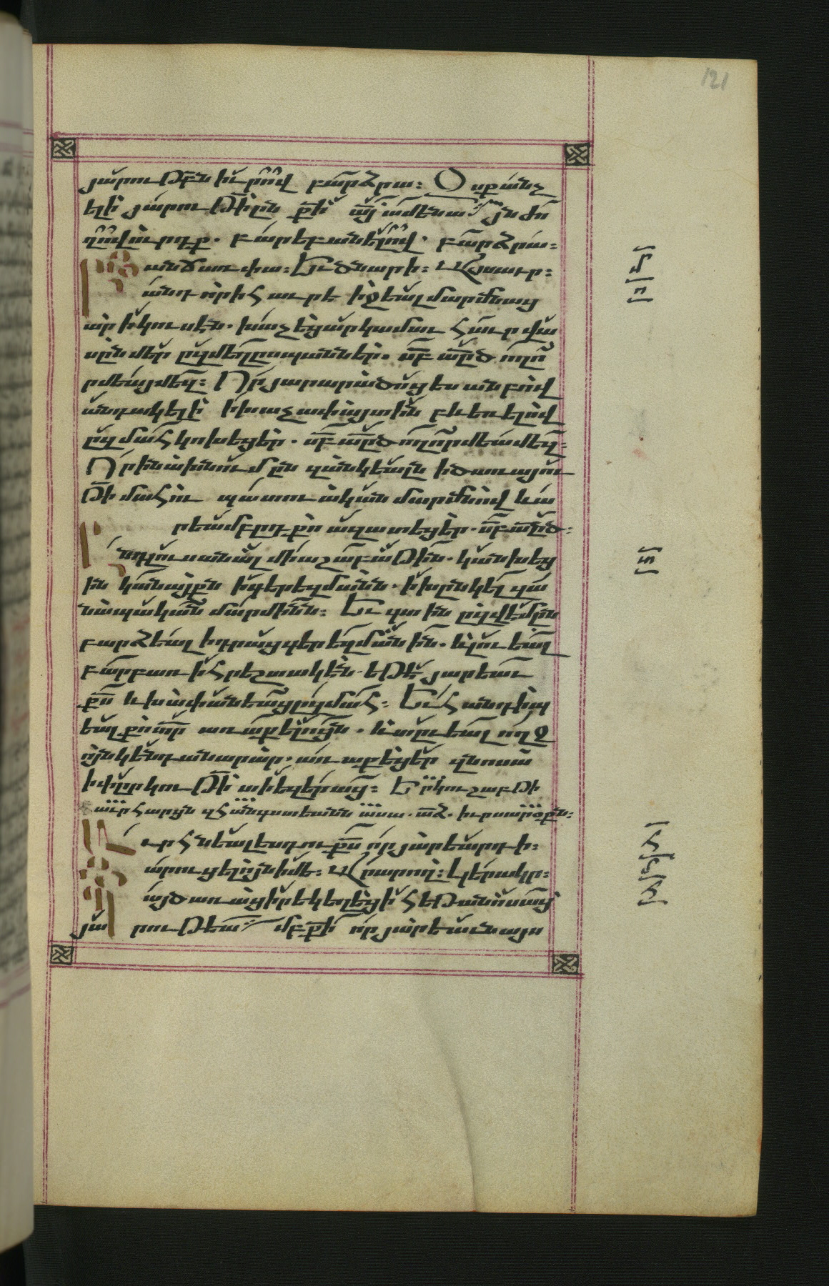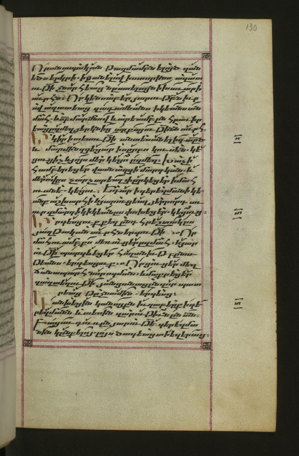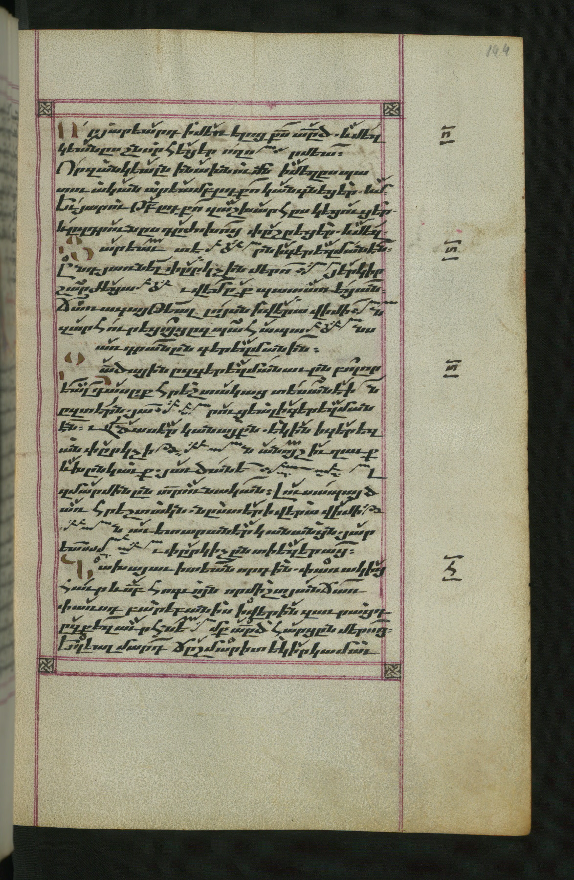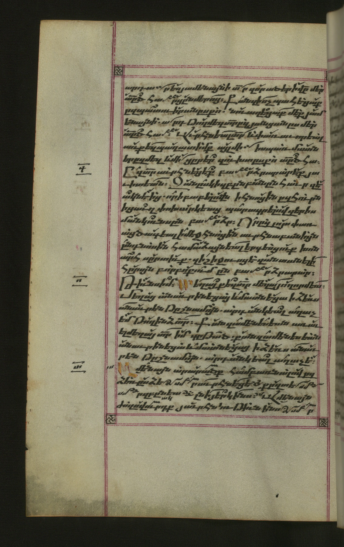 This hymnal was completed in Constantinople on August 15, 1678 [AE 1127], by the priest Yakob Pēligratc‘i, having been commissioned by Člav, son of Nawasard, as a dedication to his sons, Astuacatur and Sahak. The structure of the hymns adheres approximately to the standard Armenian hymnal (Շաբակնոց), with minor variations in order and a few substitutions (see Sanjian in the bibliography). The book is illuminated extensively, with thirty-eight full- and half-page polychrome miniatures against gold backgrounds, eight decorated head-pieces marking the principal divisions of the hymnal, and numerous marginal miniatures marking individual hymns, including biblical figures, saints, bishops, and vignettes. The style of the miniatures is largely in imitation of western European models, though more traditional Armenian and Byzantine influences stand out, such as the vibrant color palette, an iconic frontality for depictions of saints and bishops, and the highly abstracted floral motifs and zoomorphic incipits marking hymn divisions.