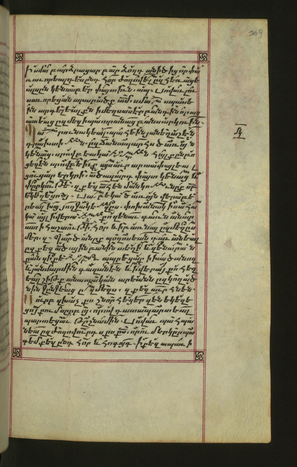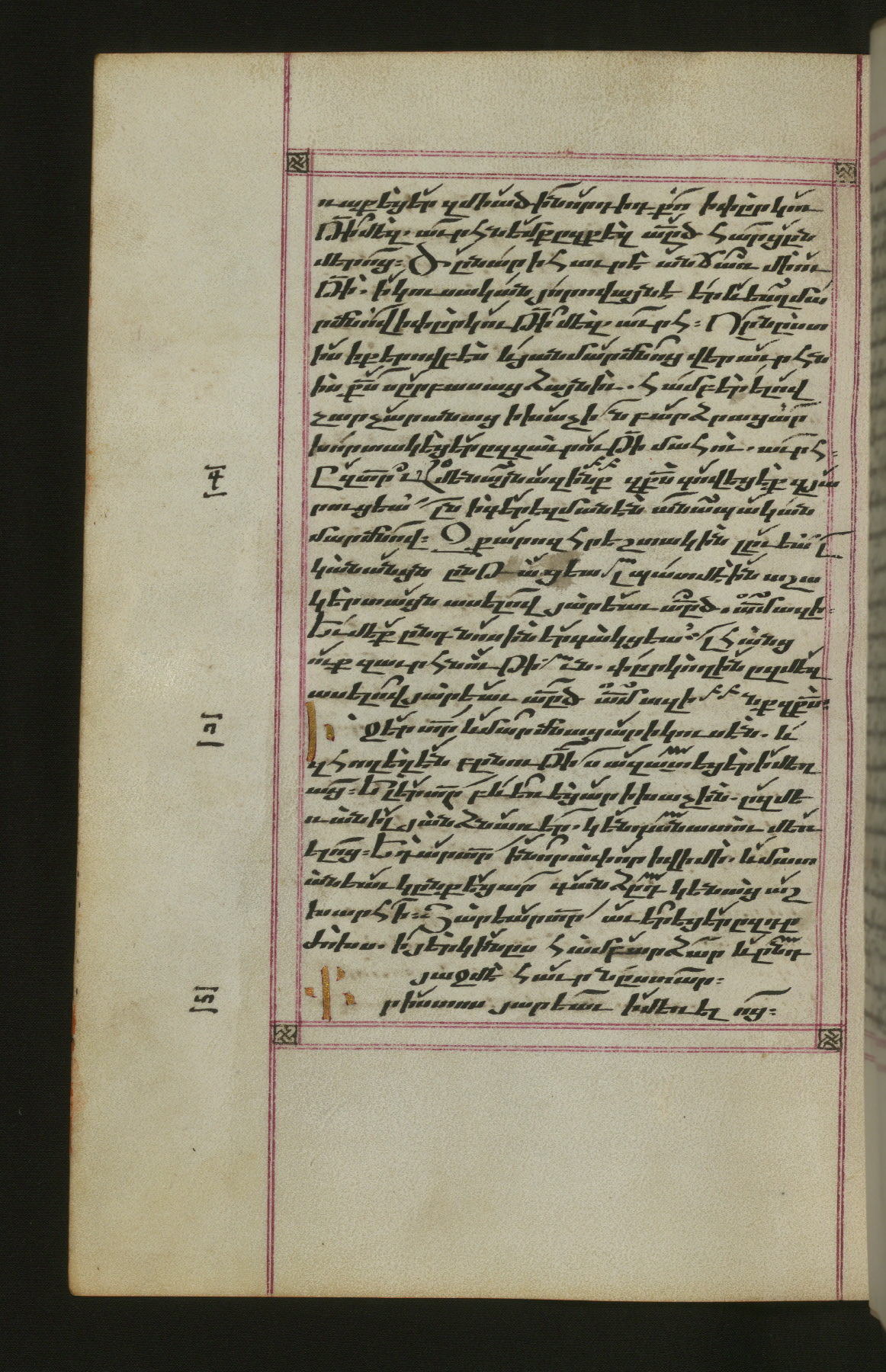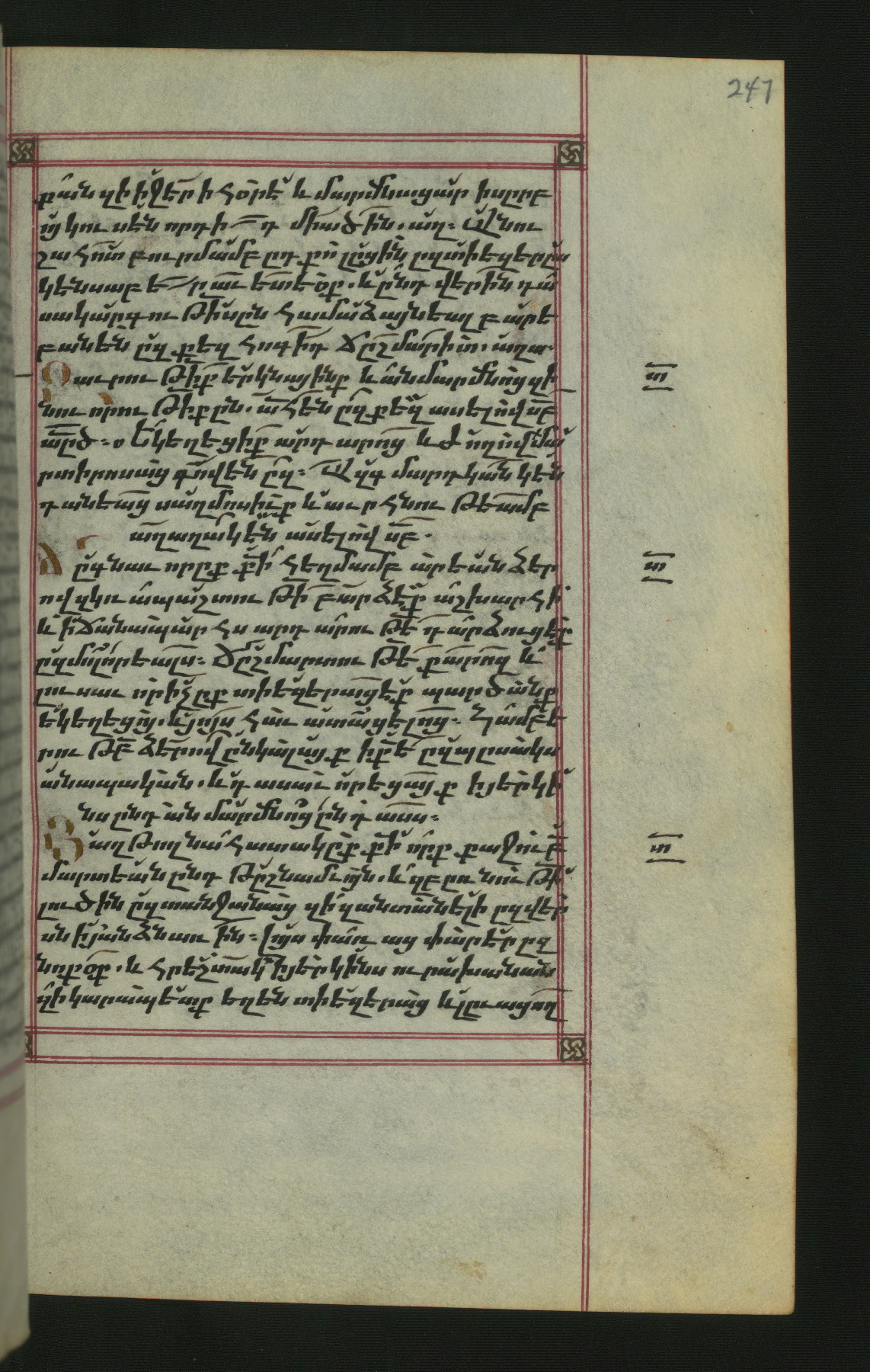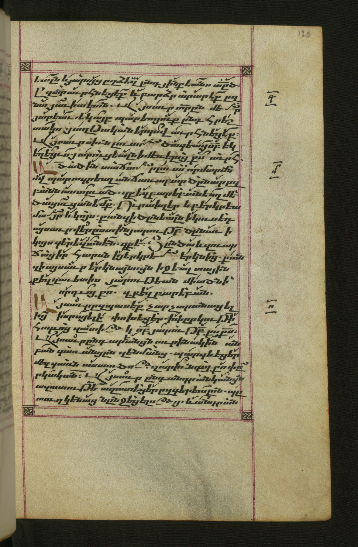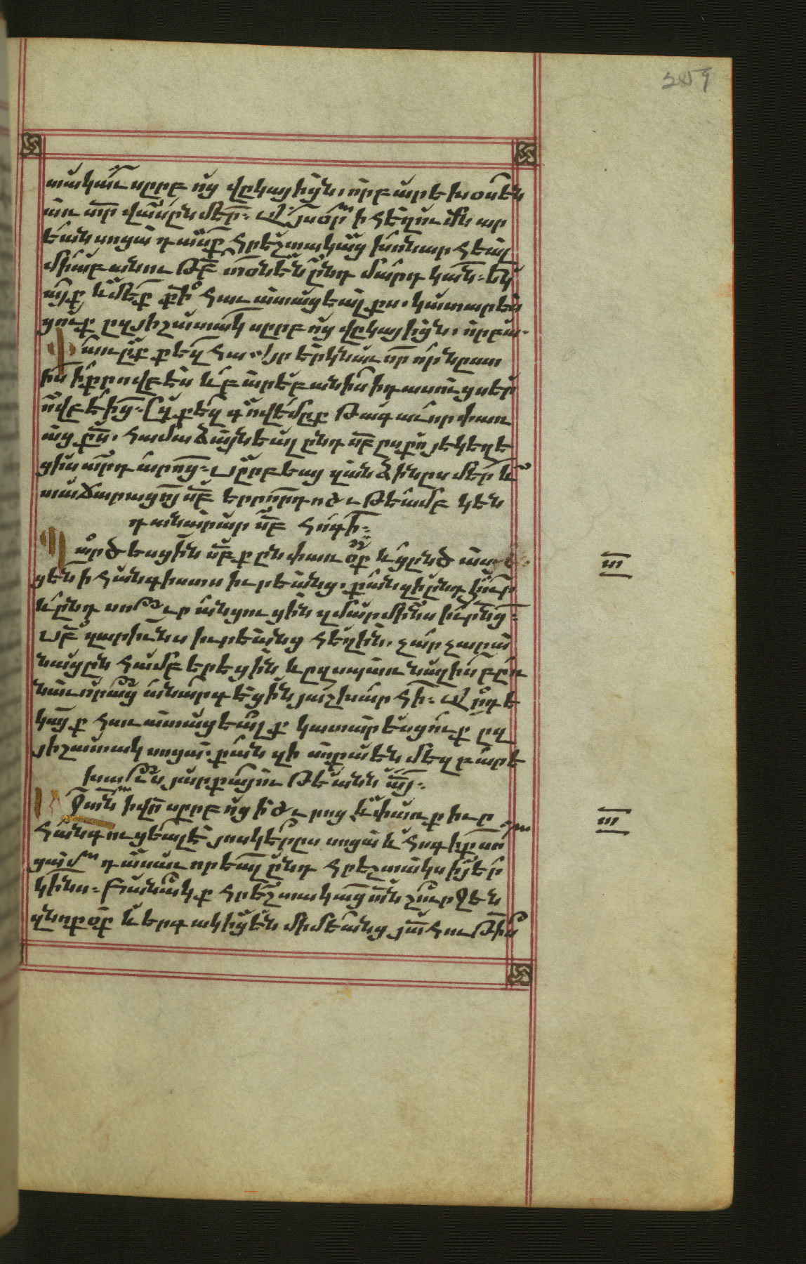 This hymnal was completed in Constantinople on August 15, 1678 [AE 1127], by the priest Yakob Pēligratc‘i, having been commissioned by Člav, son of Nawasard, as a dedication to his sons, Astuacatur and Sahak. The structure of the hymns adheres approximately to the standard Armenian hymnal (Շաբակնոց), with minor variations in order and a few substitutions (see Sanjian in the bibliography). The book is illuminated extensively, with thirty-eight full- and half-page polychrome miniatures against gold backgrounds, eight decorated head-pieces marking the principal divisions of the hymnal, and numerous marginal miniatures marking individual hymns, including biblical figures, saints, bishops, and vignettes. The style of the miniatures is largely in imitation of western European models, though more traditional Armenian and Byzantine influences stand out, such as the vibrant color palette, an iconic frontality for depictions of saints and bishops, and the highly abstracted floral motifs and zoomorphic incipits marking hymn divisions.