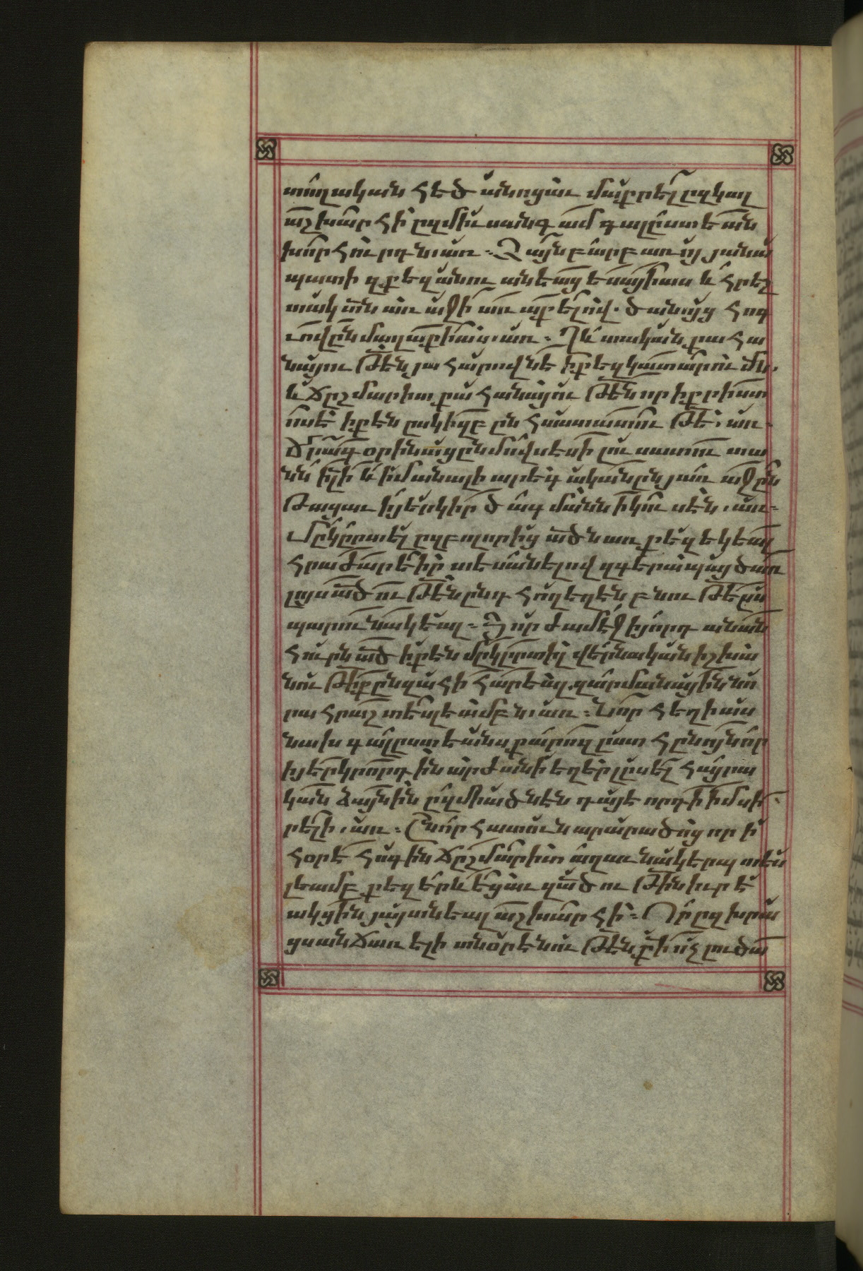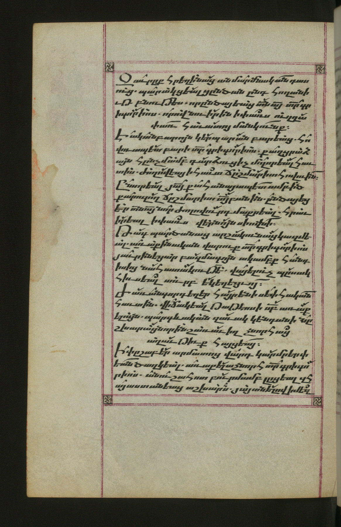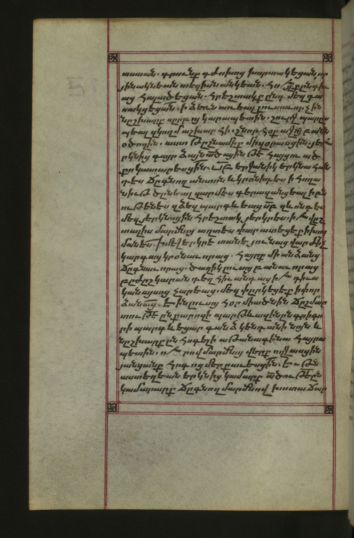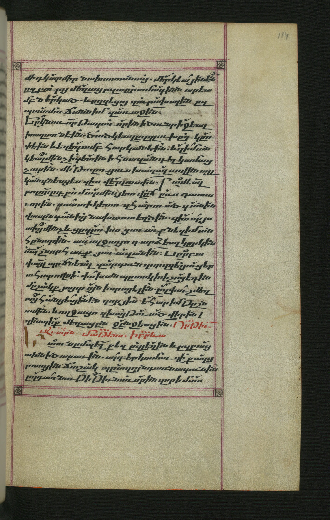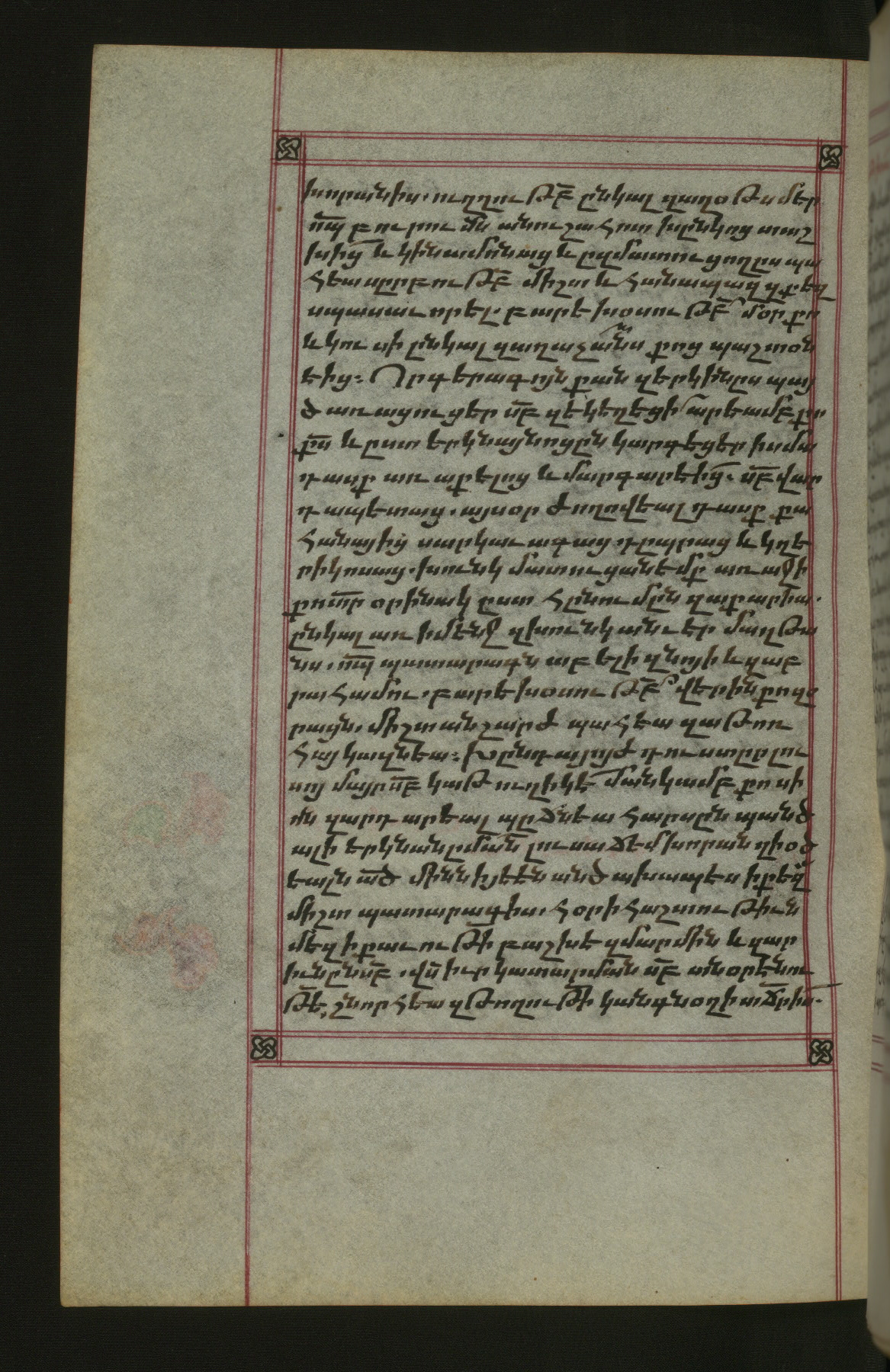 This hymnal was completed in Constantinople on August 15, 1678 [AE 1127], by the priest Yakob Pēligratc‘i, having been commissioned by Člav, son of Nawasard, as a dedication to his sons, Astuacatur and Sahak. The structure of the hymns adheres approximately to the standard Armenian hymnal (Շաբակնոց), with minor variations in order and a few substitutions (see Sanjian in the bibliography). The book is illuminated extensively, with thirty-eight full- and half-page polychrome miniatures against gold backgrounds, eight decorated head-pieces marking the principal divisions of the hymnal, and numerous marginal miniatures marking individual hymns, including biblical figures, saints, bishops, and vignettes. The style of the miniatures is largely in imitation of western European models, though more traditional Armenian and Byzantine influences stand out, such as the vibrant color palette, an iconic frontality for depictions of saints and bishops, and the highly abstracted floral motifs and zoomorphic incipits marking hymn divisions.