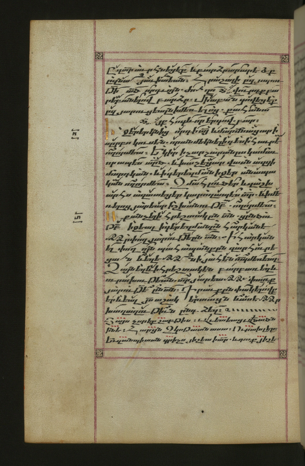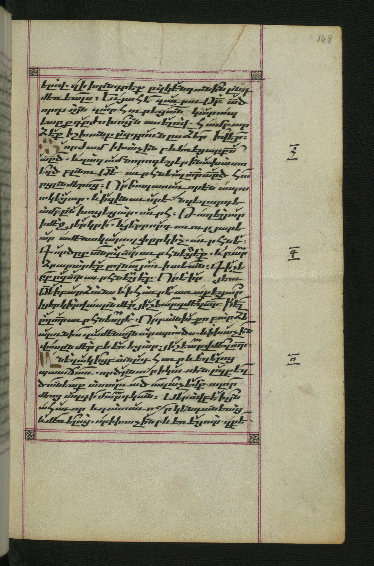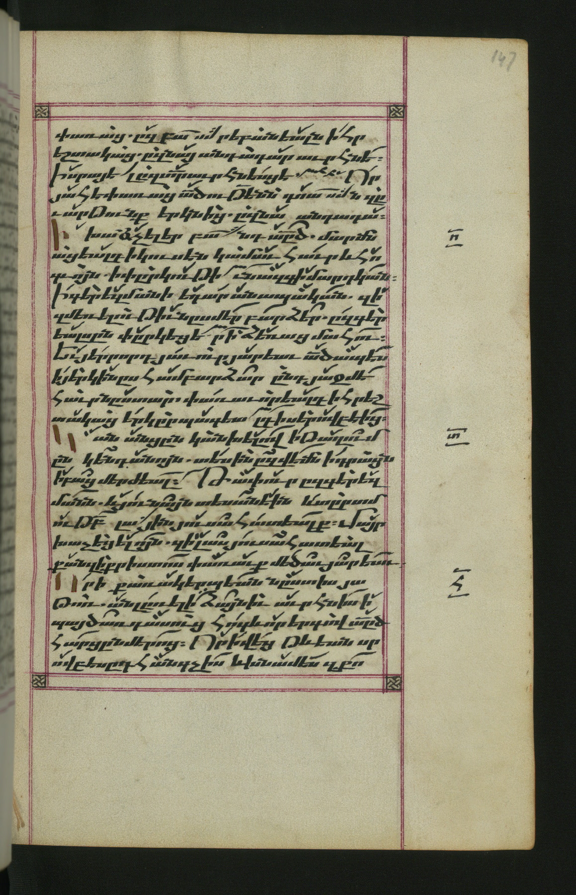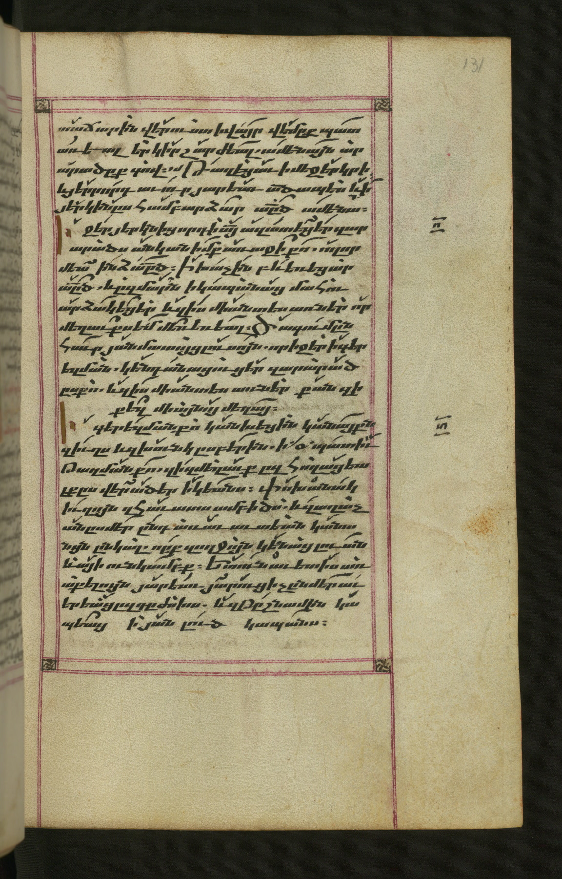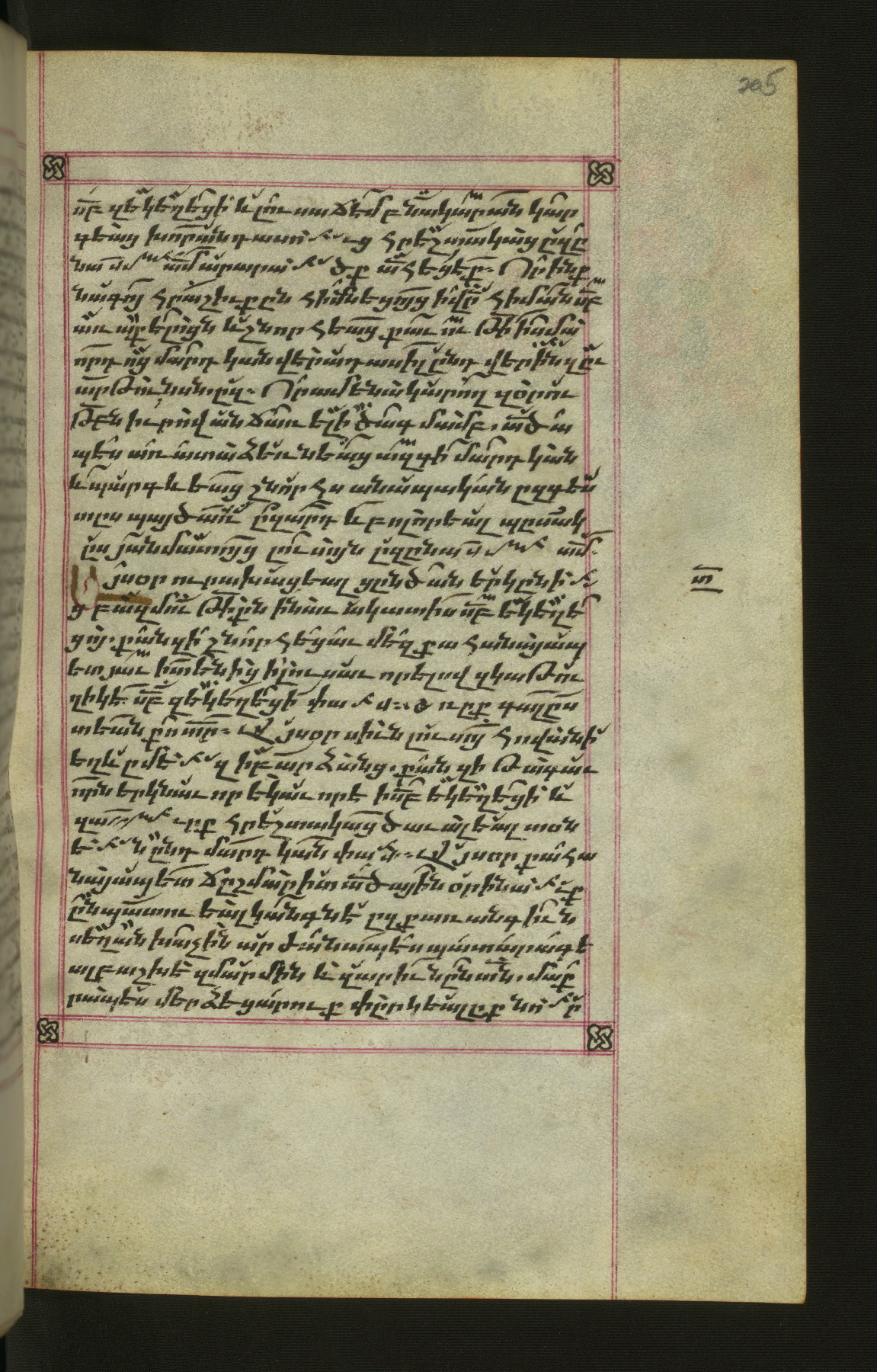 This hymnal was completed in Constantinople on August 15, 1678 [AE 1127], by the priest Yakob Pēligratc‘i, having been commissioned by Člav, son of Nawasard, as a dedication to his sons, Astuacatur and Sahak. The structure of the hymns adheres approximately to the standard Armenian hymnal (Շաբակնոց), with minor variations in order and a few substitutions (see Sanjian in the bibliography). The book is illuminated extensively, with thirty-eight full- and half-page polychrome miniatures against gold backgrounds, eight decorated head-pieces marking the principal divisions of the hymnal, and numerous marginal miniatures marking individual hymns, including biblical figures, saints, bishops, and vignettes. The style of the miniatures is largely in imitation of western European models, though more traditional Armenian and Byzantine influences stand out, such as the vibrant color palette, an iconic frontality for depictions of saints and bishops, and the highly abstracted floral motifs and zoomorphic incipits marking hymn divisions.