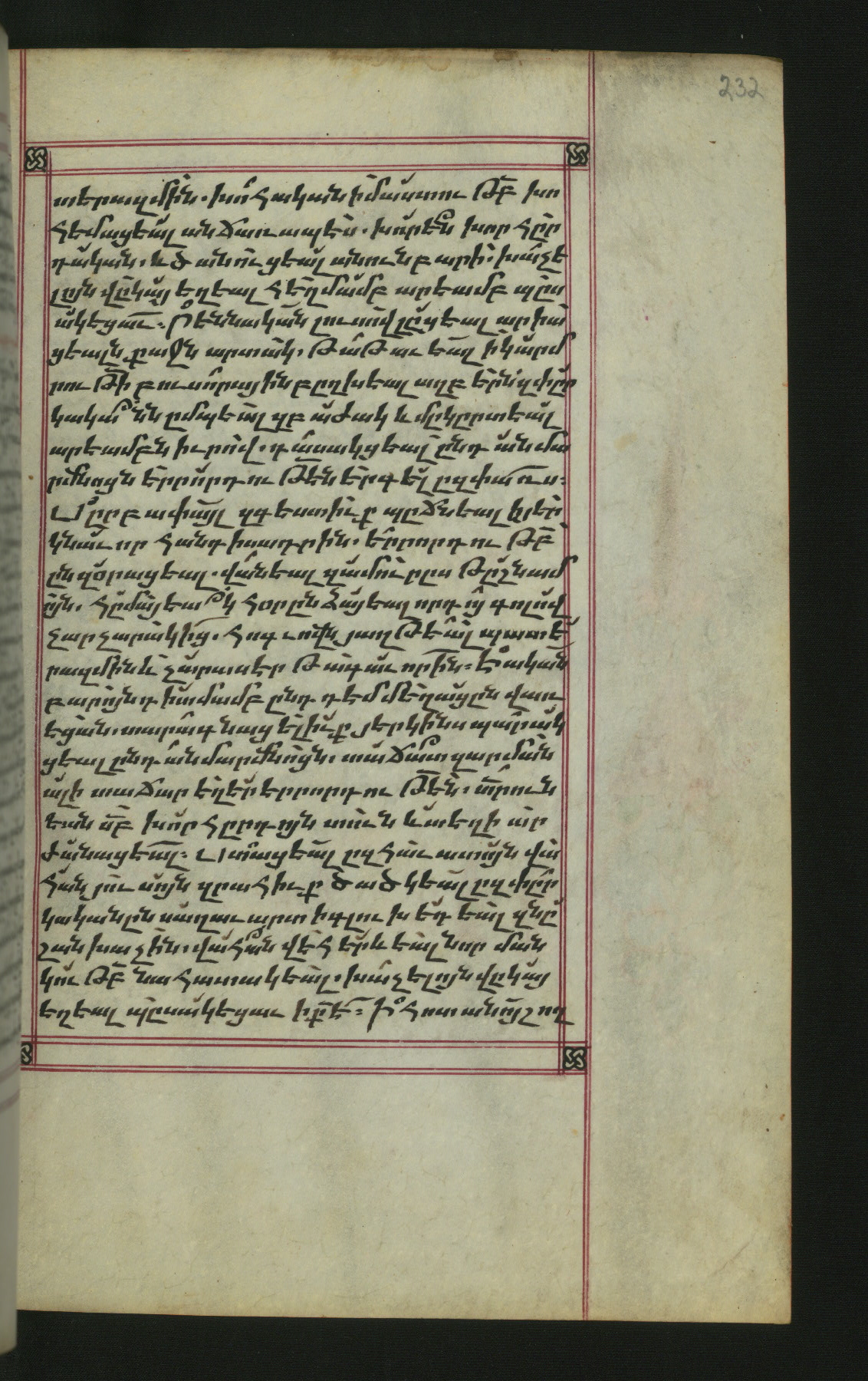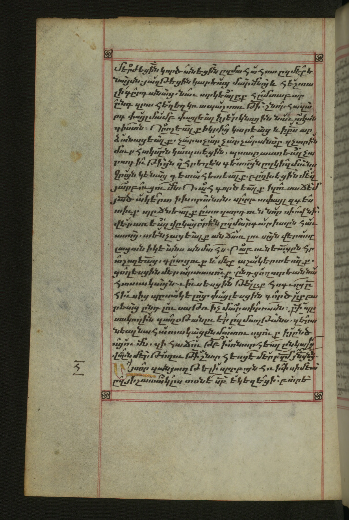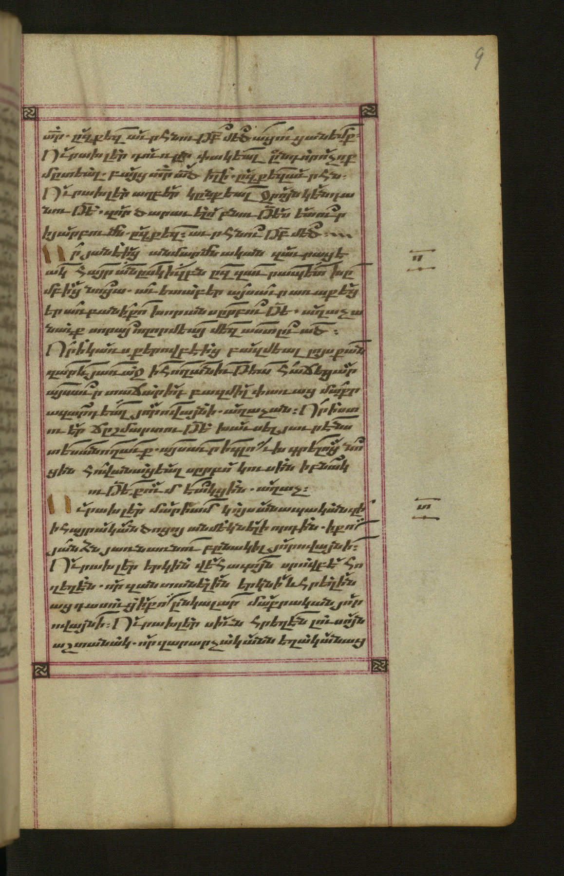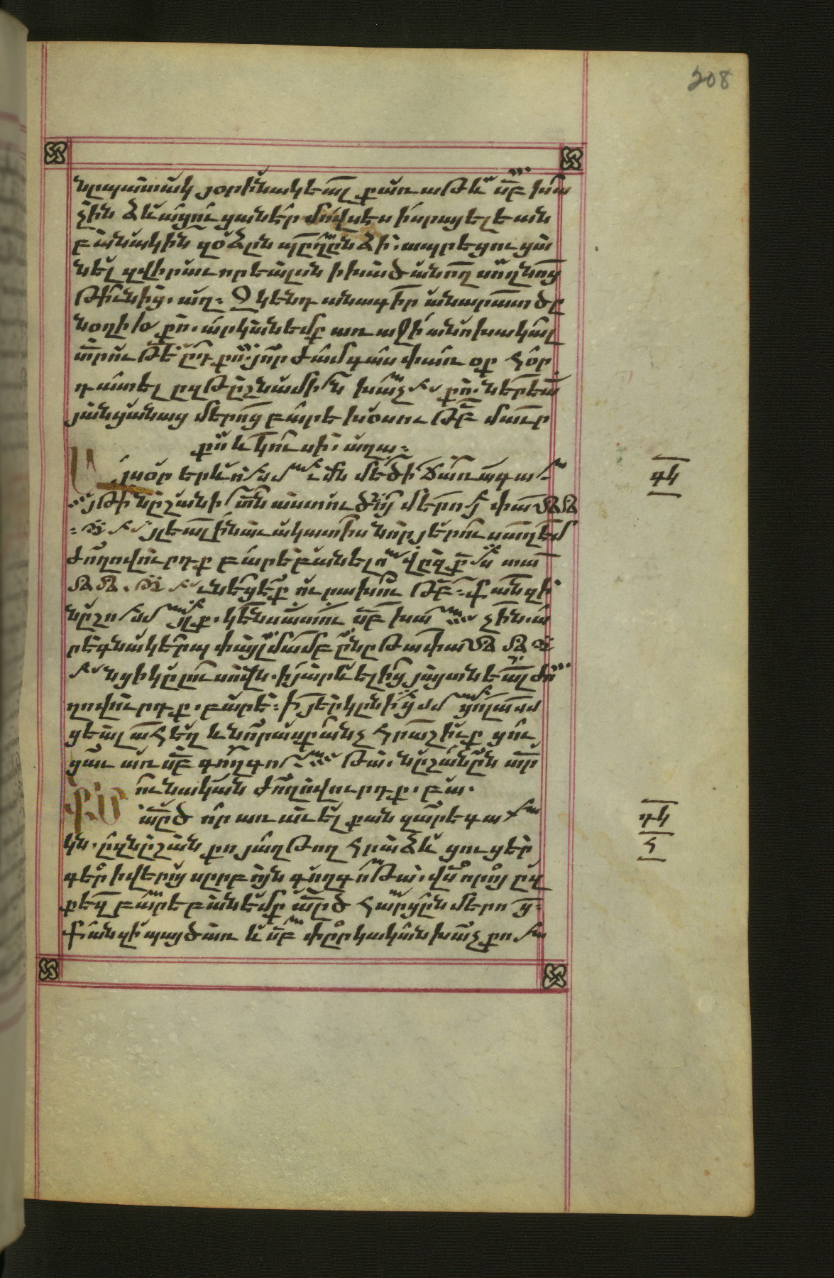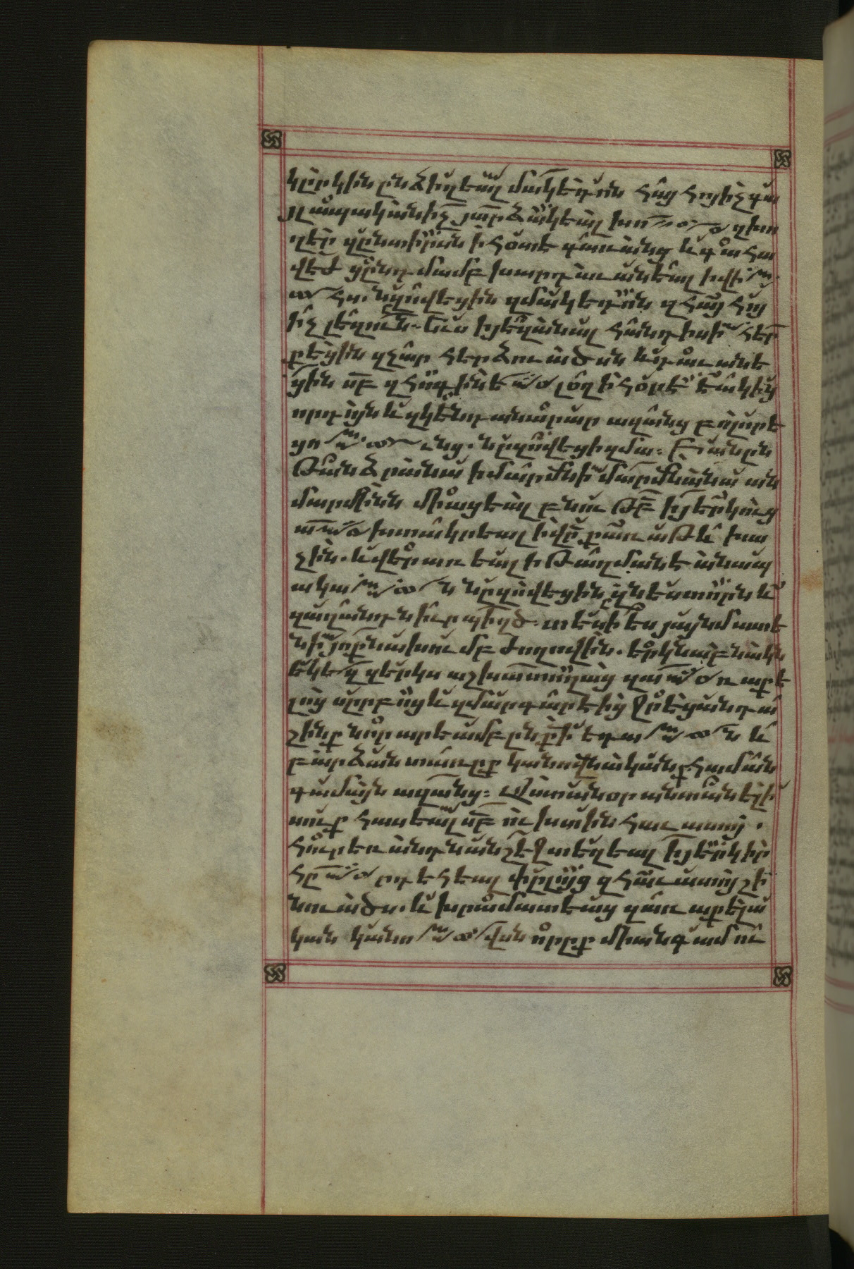 This hymnal was completed in Constantinople on August 15, 1678 [AE 1127], by the priest Yakob Pēligratc‘i, having been commissioned by Člav, son of Nawasard, as a dedication to his sons, Astuacatur and Sahak. The structure of the hymns adheres approximately to the standard Armenian hymnal (Շաբակնոց), with minor variations in order and a few substitutions (see Sanjian in the bibliography). The book is illuminated extensively, with thirty-eight full- and half-page polychrome miniatures against gold backgrounds, eight decorated head-pieces marking the principal divisions of the hymnal, and numerous marginal miniatures marking individual hymns, including biblical figures, saints, bishops, and vignettes. The style of the miniatures is largely in imitation of western European models, though more traditional Armenian and Byzantine influences stand out, such as the vibrant color palette, an iconic frontality for depictions of saints and bishops, and the highly abstracted floral motifs and zoomorphic incipits marking hymn divisions.