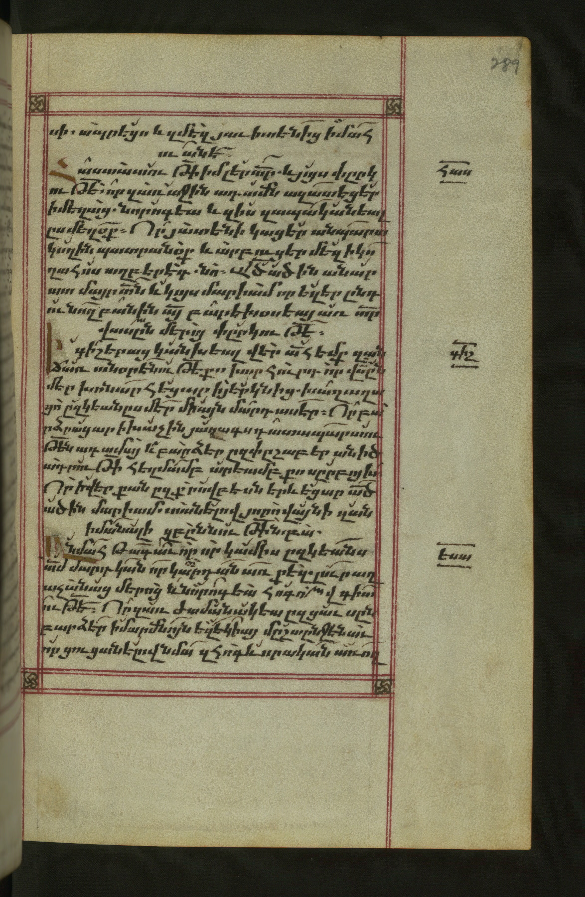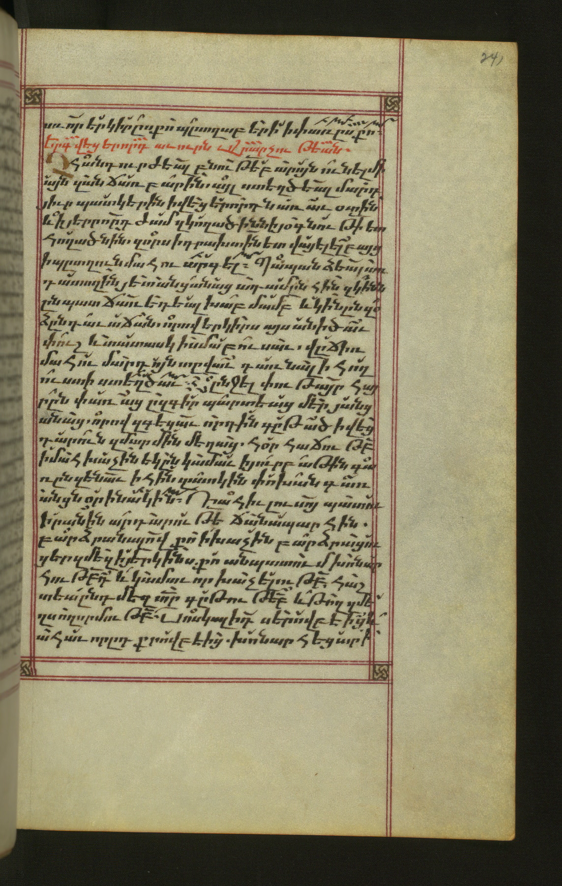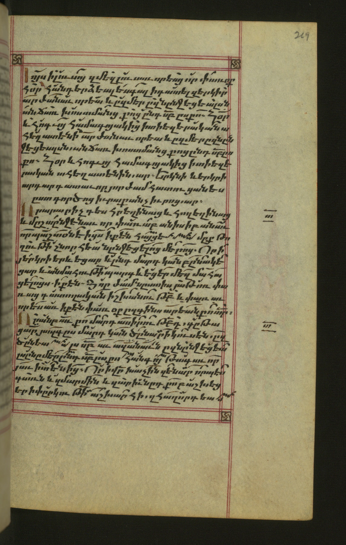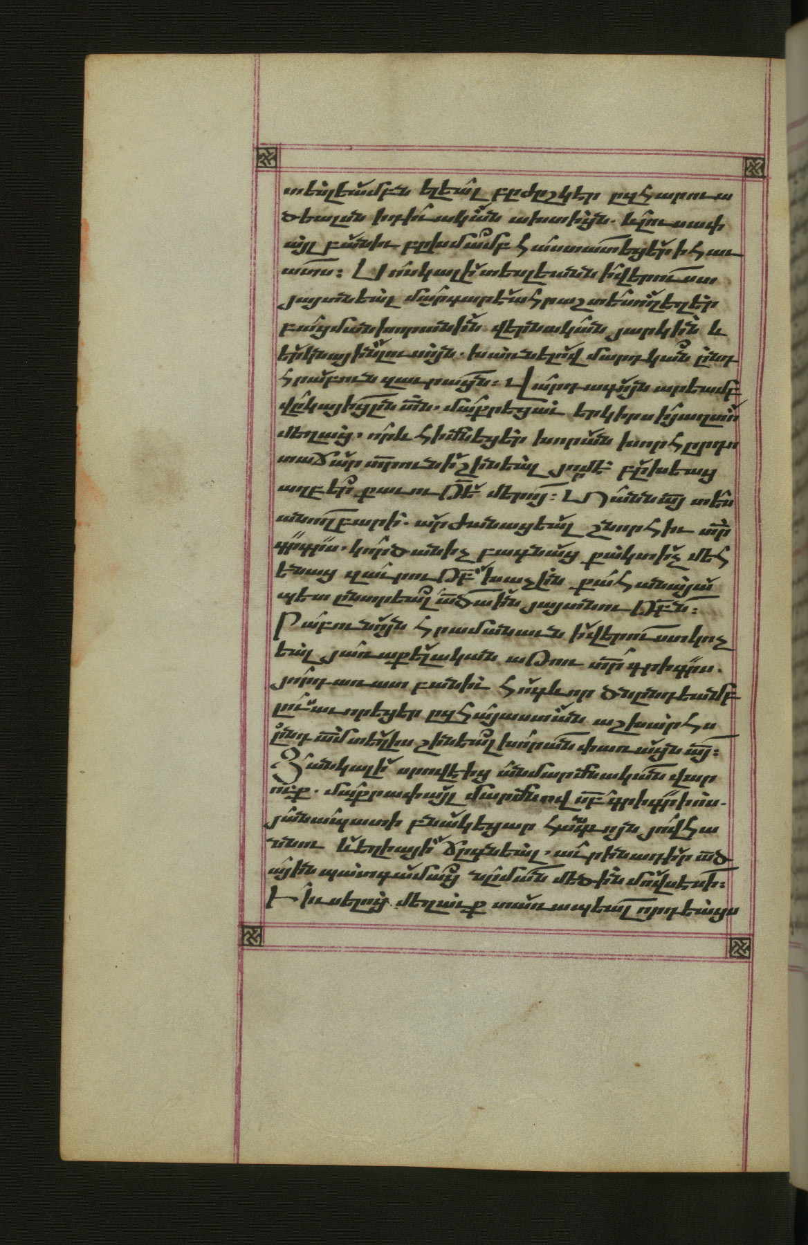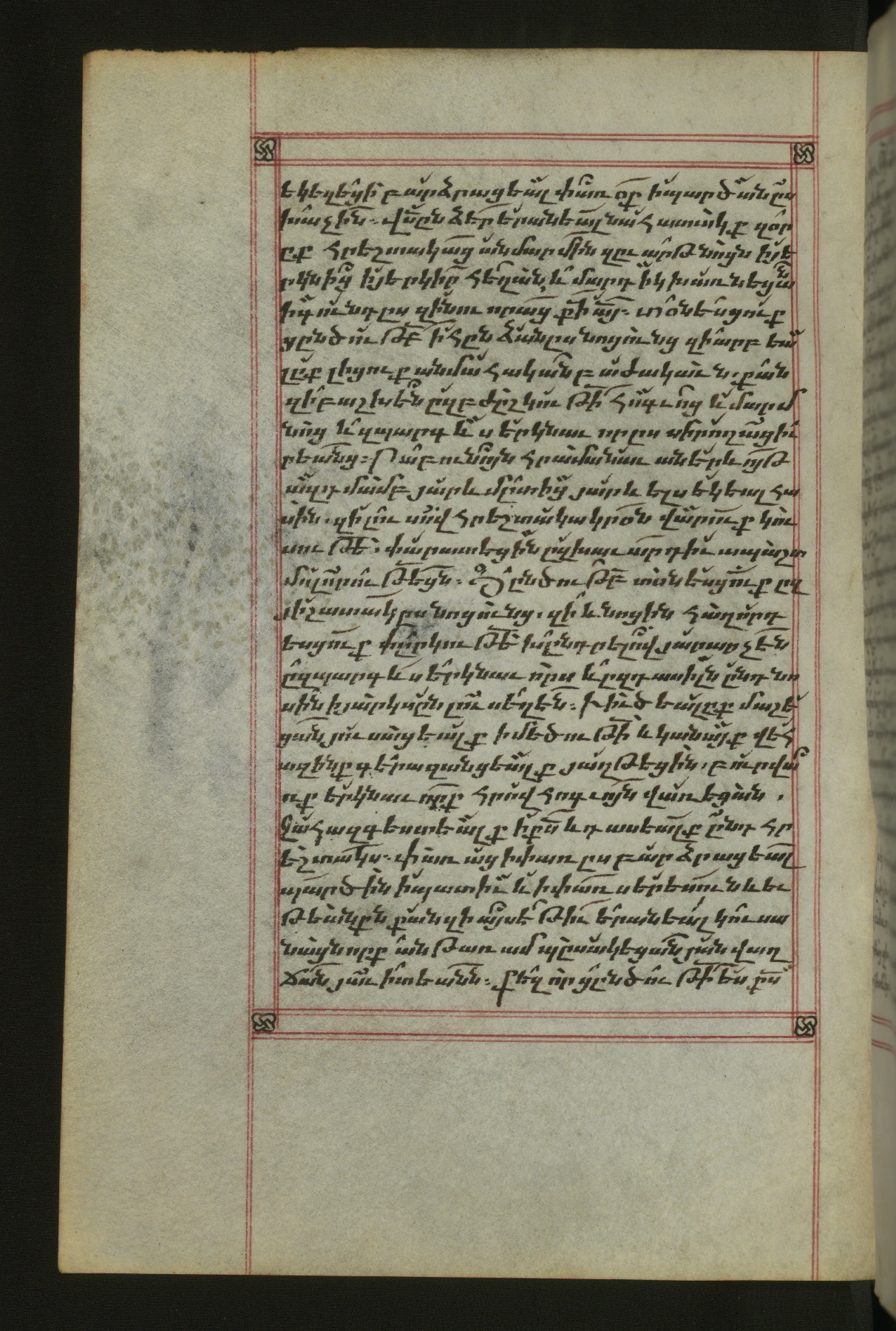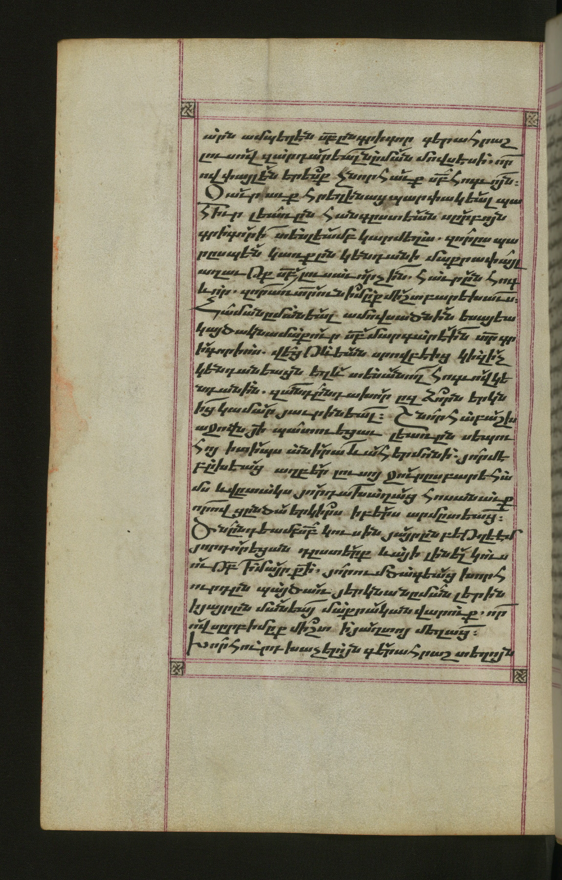 This hymnal was completed in Constantinople on August 15, 1678 [AE 1127], by the priest Yakob Pēligratc‘i, having been commissioned by Člav, son of Nawasard, as a dedication to his sons, Astuacatur and Sahak. The structure of the hymns adheres approximately to the standard Armenian hymnal (Շաբակնոց), with minor variations in order and a few substitutions (see Sanjian in the bibliography). The book is illuminated extensively, with thirty-eight full- and half-page polychrome miniatures against gold backgrounds, eight decorated head-pieces marking the principal divisions of the hymnal, and numerous marginal miniatures marking individual hymns, including biblical figures, saints, bishops, and vignettes. The style of the miniatures is largely in imitation of western European models, though more traditional Armenian and Byzantine influences stand out, such as the vibrant color palette, an iconic frontality for depictions of saints and bishops, and the highly abstracted floral motifs and zoomorphic incipits marking hymn divisions.