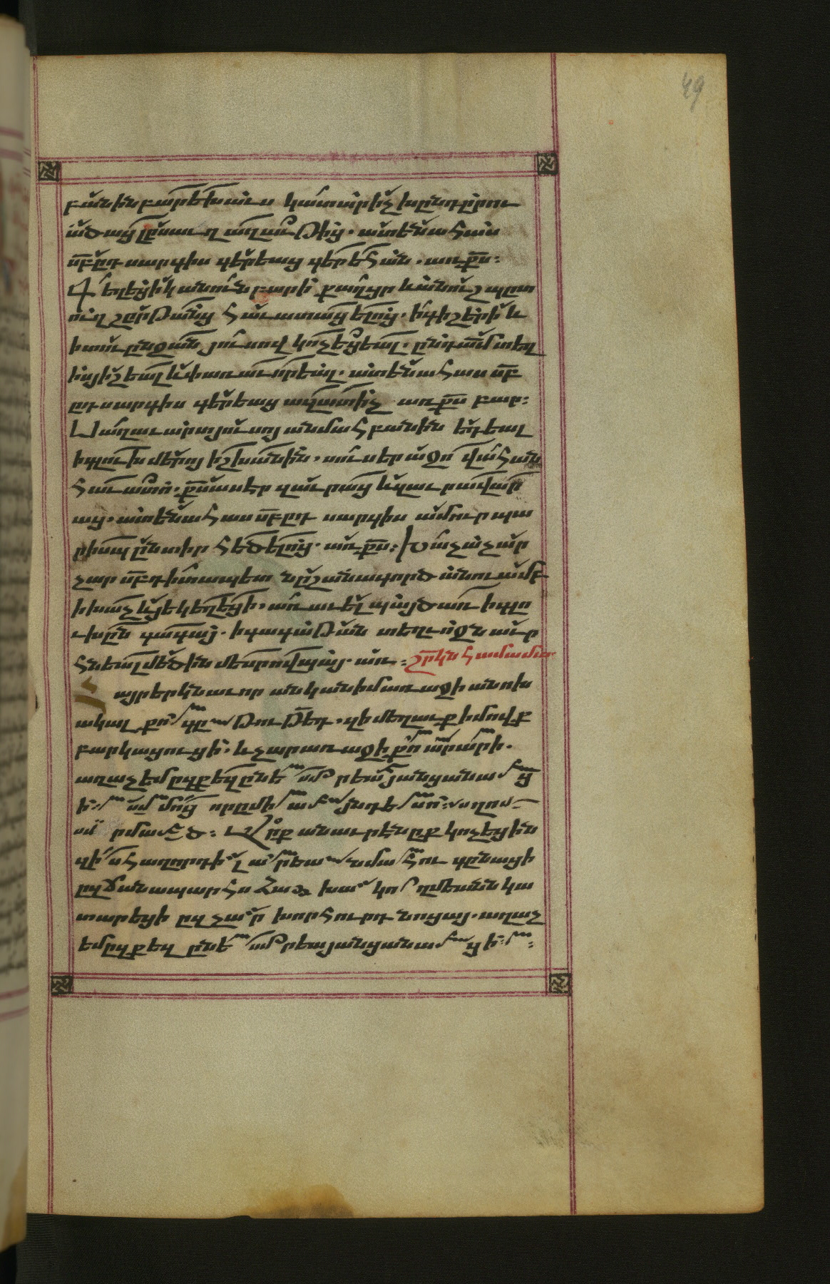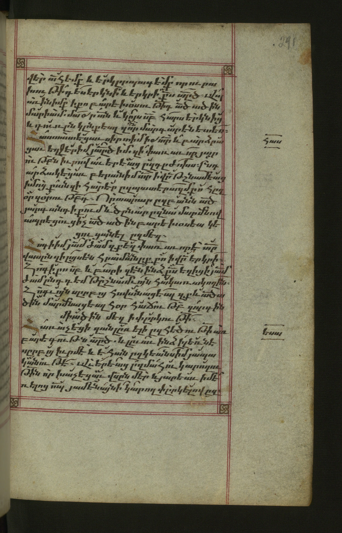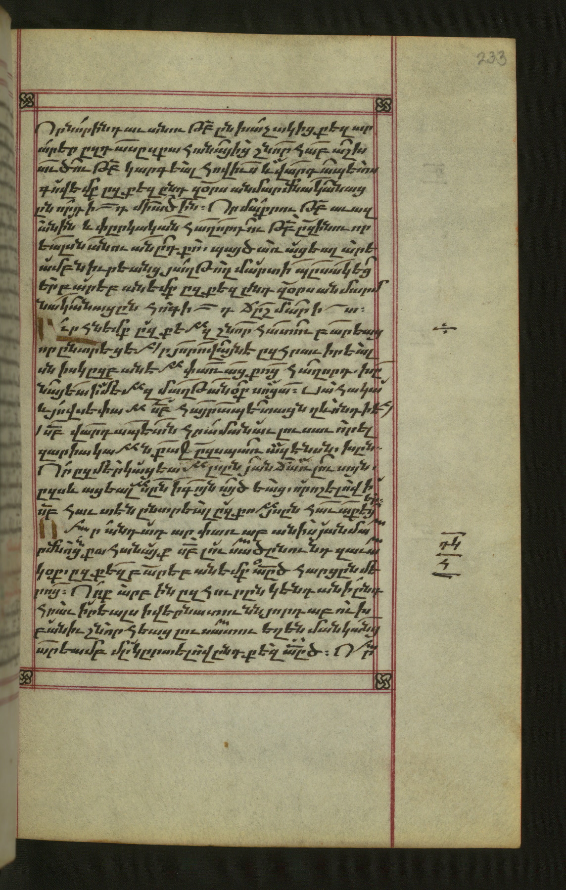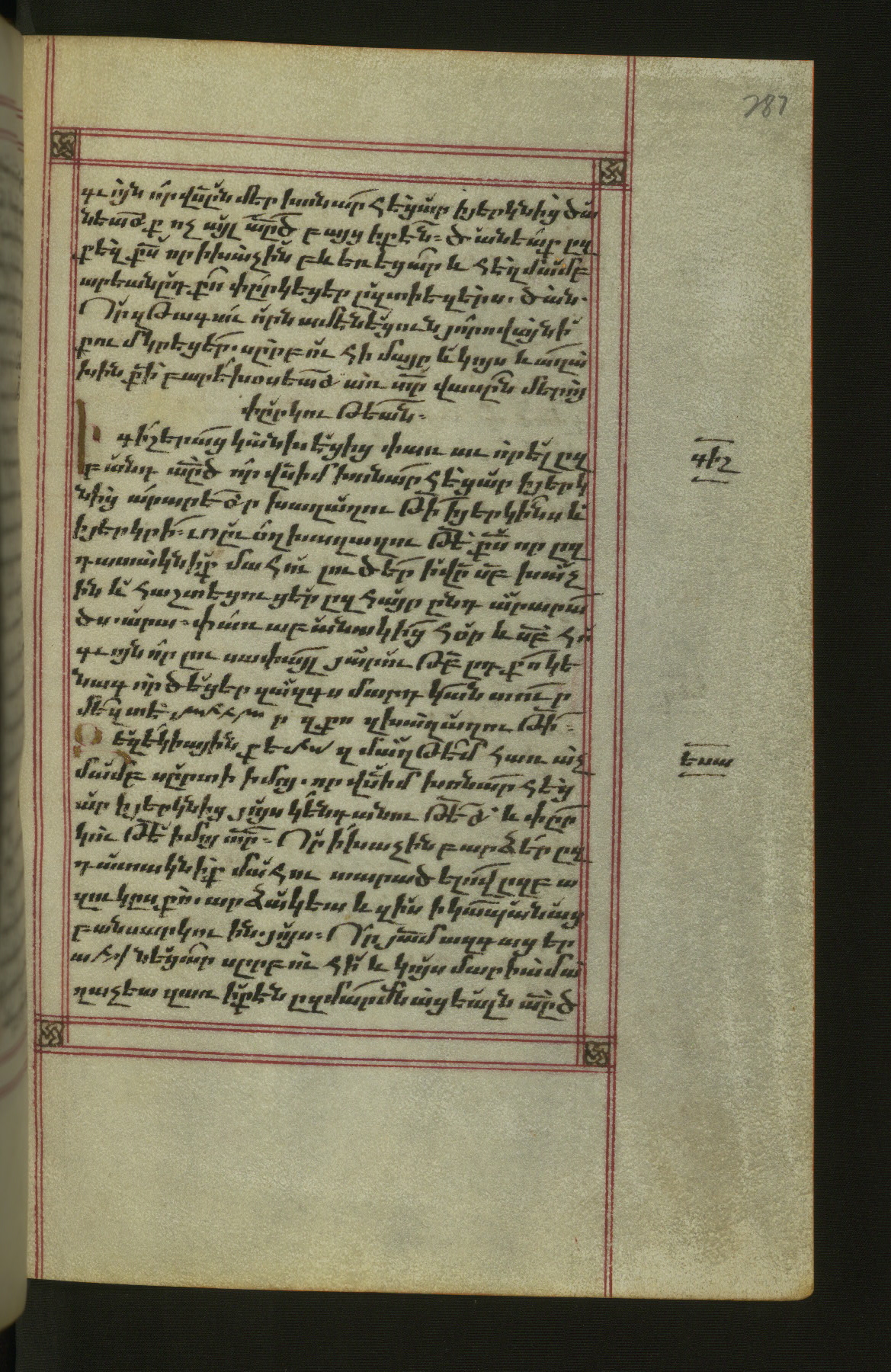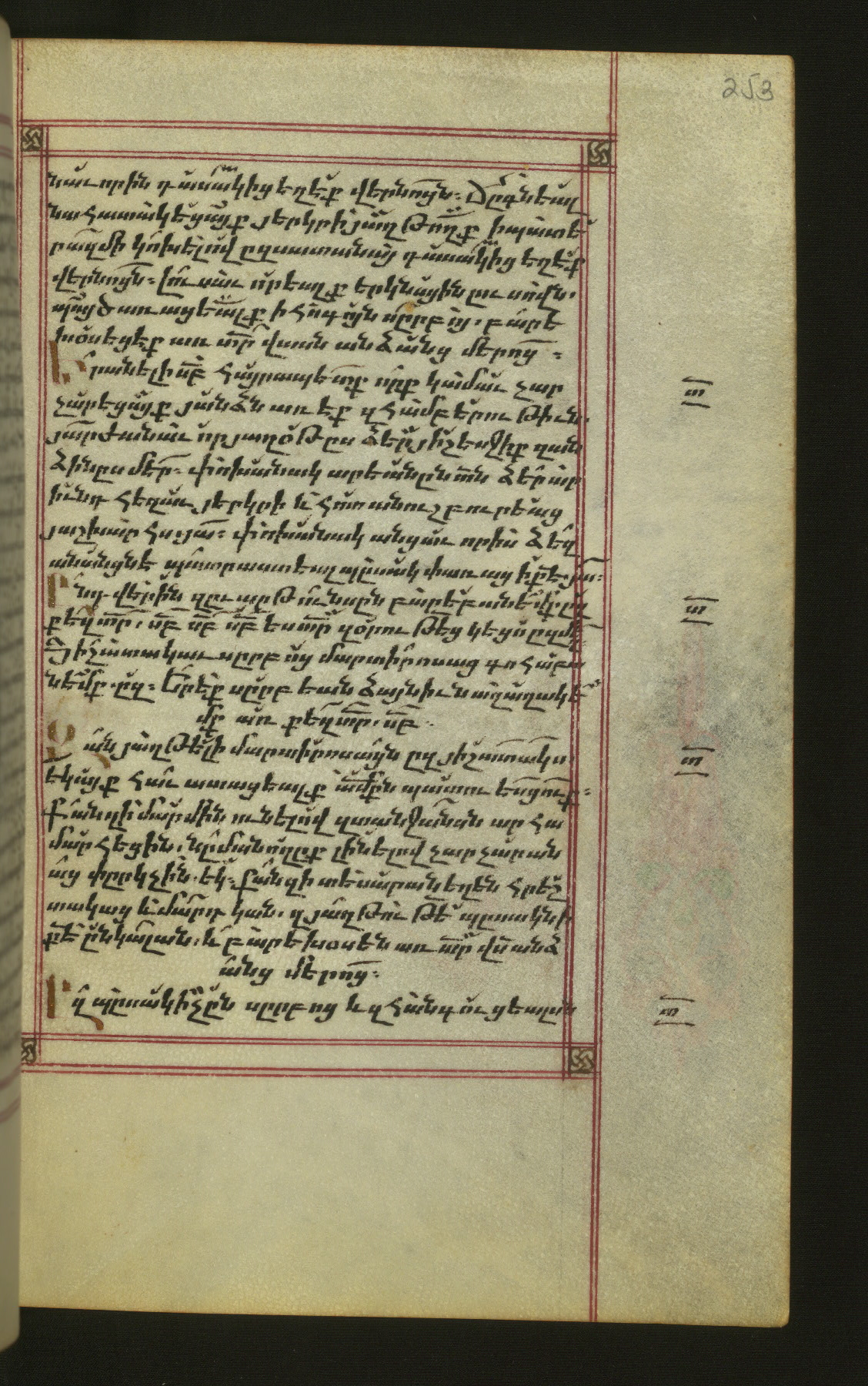 This hymnal was completed in Constantinople on August 15, 1678 [AE 1127], by the priest Yakob Pēligratc‘i, having been commissioned by Člav, son of Nawasard, as a dedication to his sons, Astuacatur and Sahak. The structure of the hymns adheres approximately to the standard Armenian hymnal (Շաբակնոց), with minor variations in order and a few substitutions (see Sanjian in the bibliography). The book is illuminated extensively, with thirty-eight full- and half-page polychrome miniatures against gold backgrounds, eight decorated head-pieces marking the principal divisions of the hymnal, and numerous marginal miniatures marking individual hymns, including biblical figures, saints, bishops, and vignettes. The style of the miniatures is largely in imitation of western European models, though more traditional Armenian and Byzantine influences stand out, such as the vibrant color palette, an iconic frontality for depictions of saints and bishops, and the highly abstracted floral motifs and zoomorphic incipits marking hymn divisions.