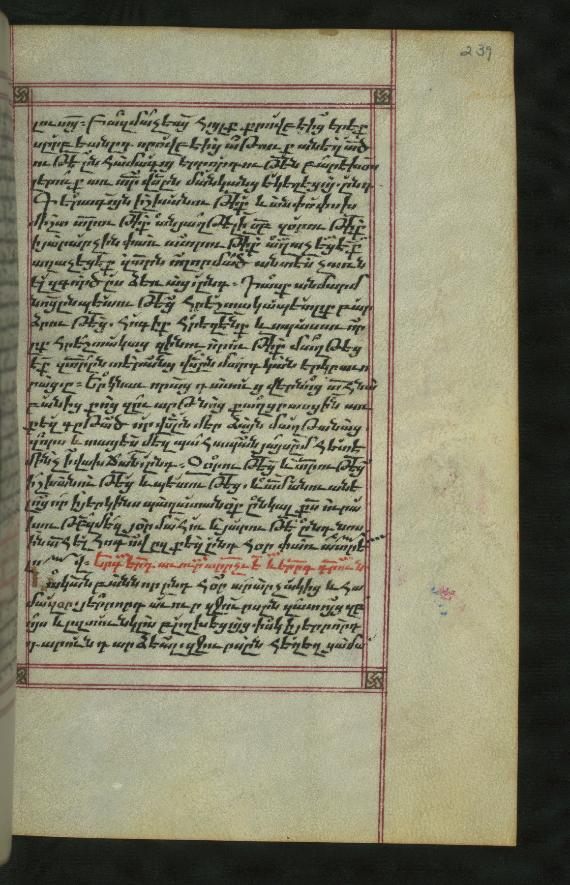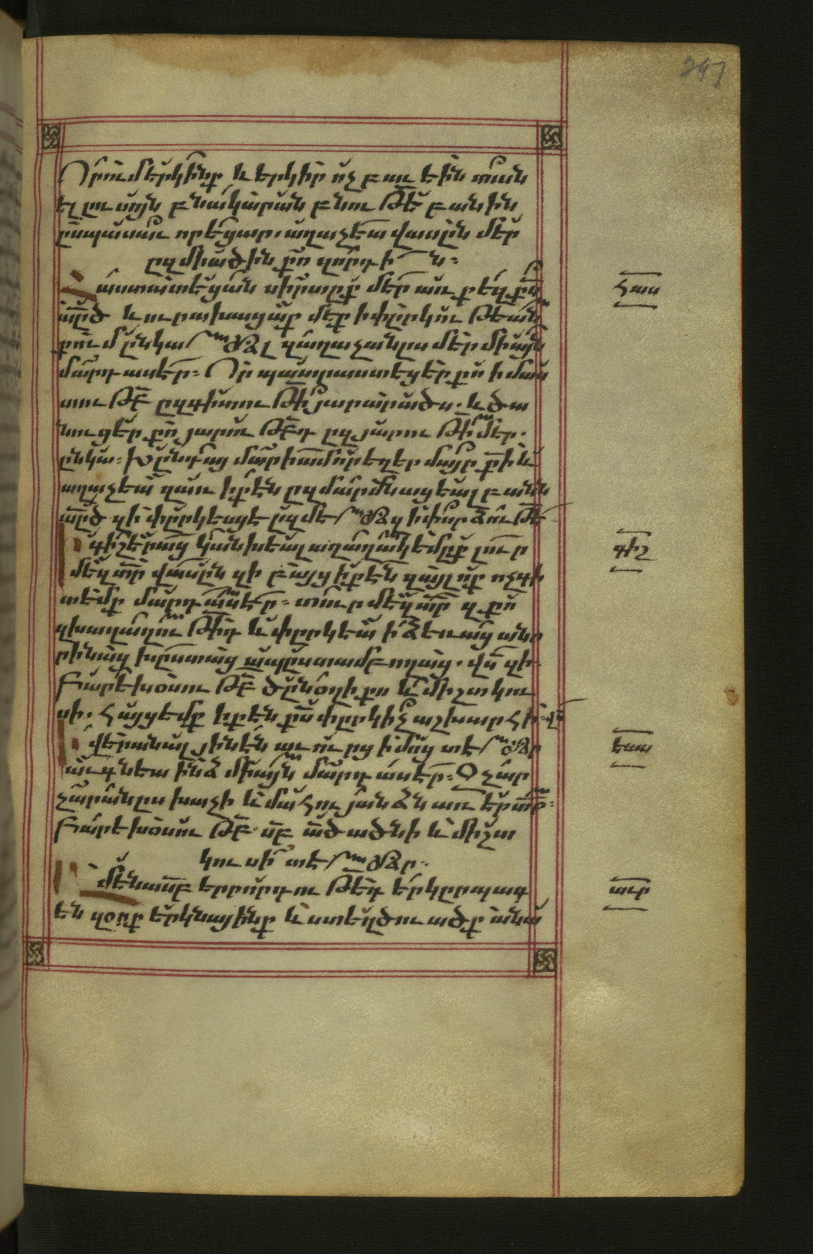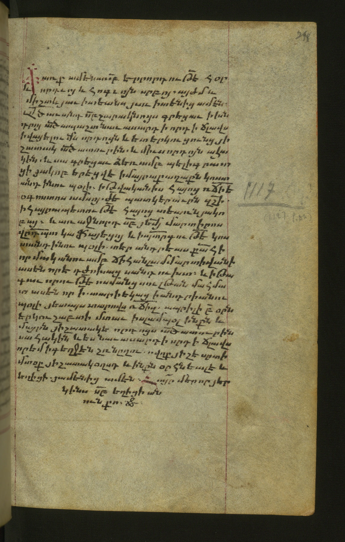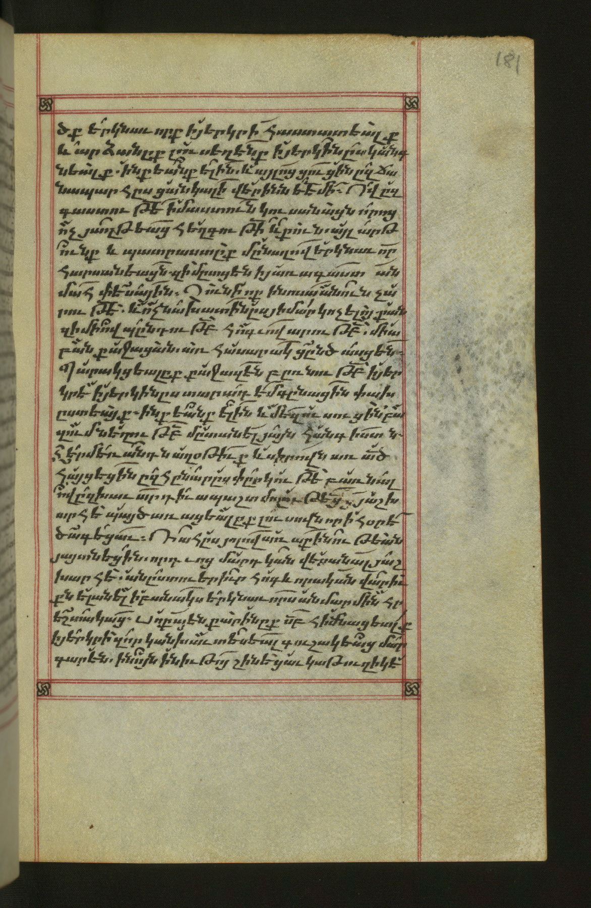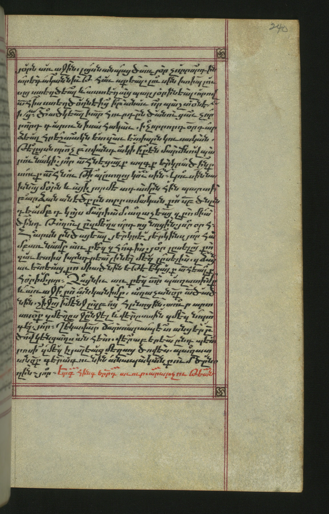 This hymnal was completed in Constantinople on August 15, 1678 [AE 1127], by the priest Yakob Pēligratc‘i, having been commissioned by Člav, son of Nawasard, as a dedication to his sons, Astuacatur and Sahak. The structure of the hymns adheres approximately to the standard Armenian hymnal (Շաբակնոց), with minor variations in order and a few substitutions (see Sanjian in the bibliography). The book is illuminated extensively, with thirty-eight full- and half-page polychrome miniatures against gold backgrounds, eight decorated head-pieces marking the principal divisions of the hymnal, and numerous marginal miniatures marking individual hymns, including biblical figures, saints, bishops, and vignettes. The style of the miniatures is largely in imitation of western European models, though more traditional Armenian and Byzantine influences stand out, such as the vibrant color palette, an iconic frontality for depictions of saints and bishops, and the highly abstracted floral motifs and zoomorphic incipits marking hymn divisions.