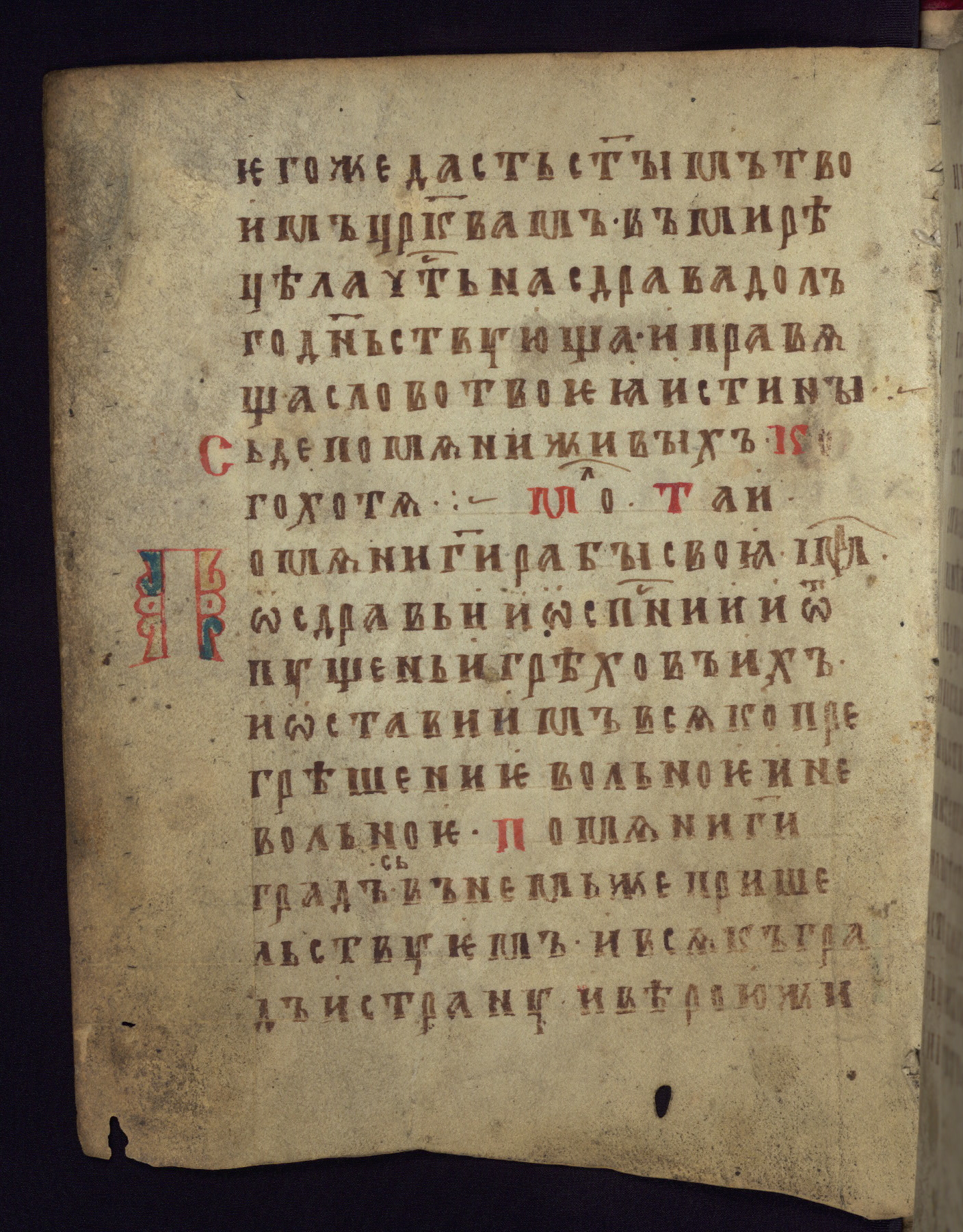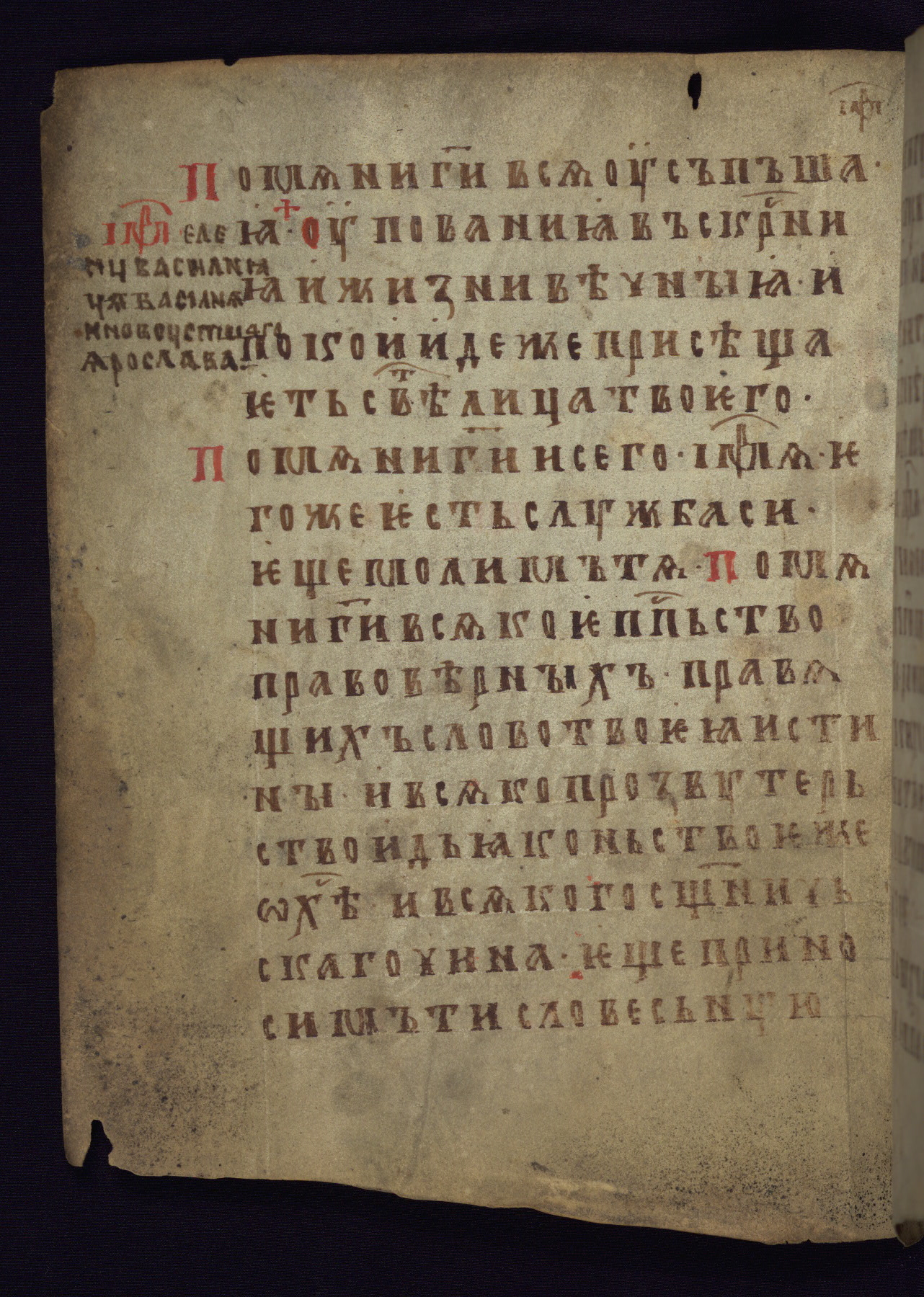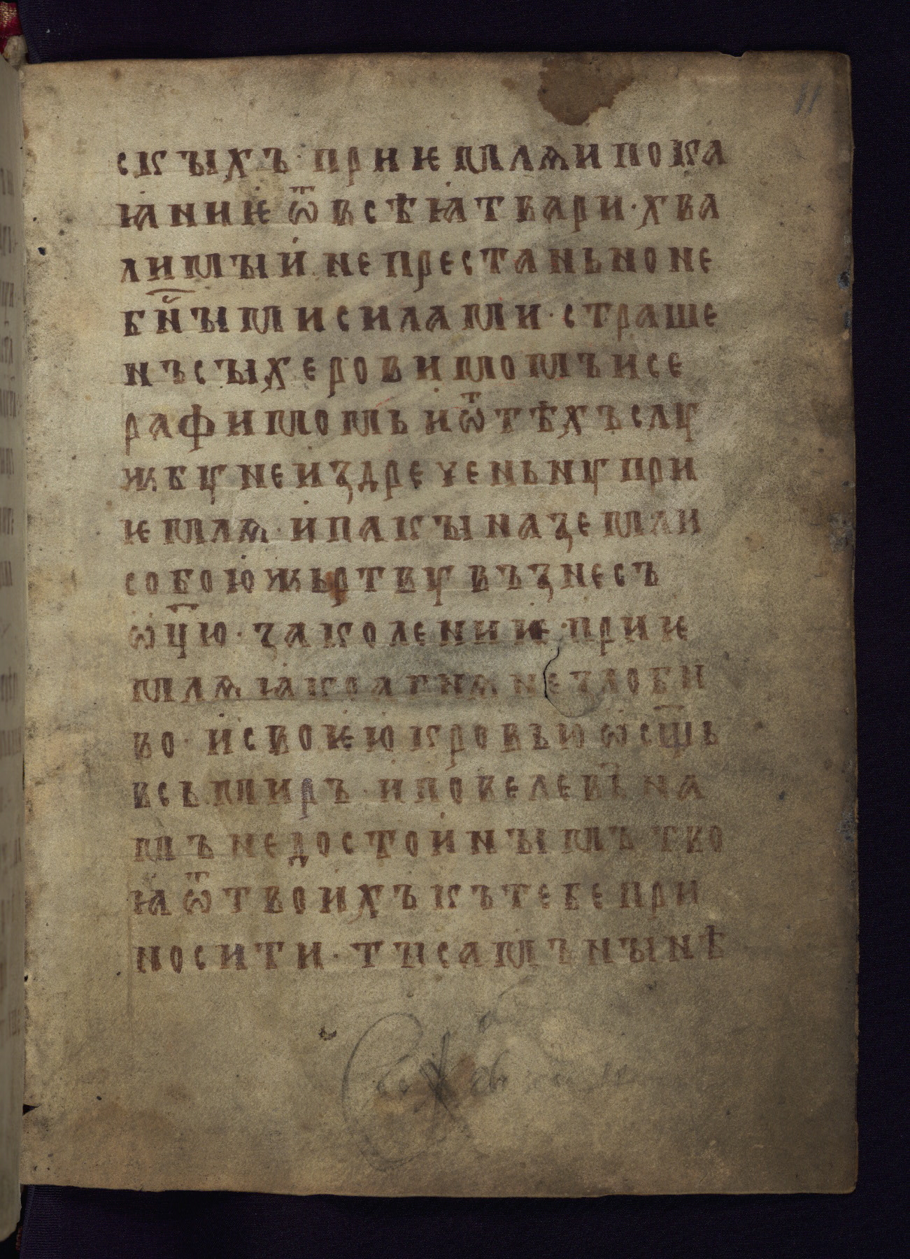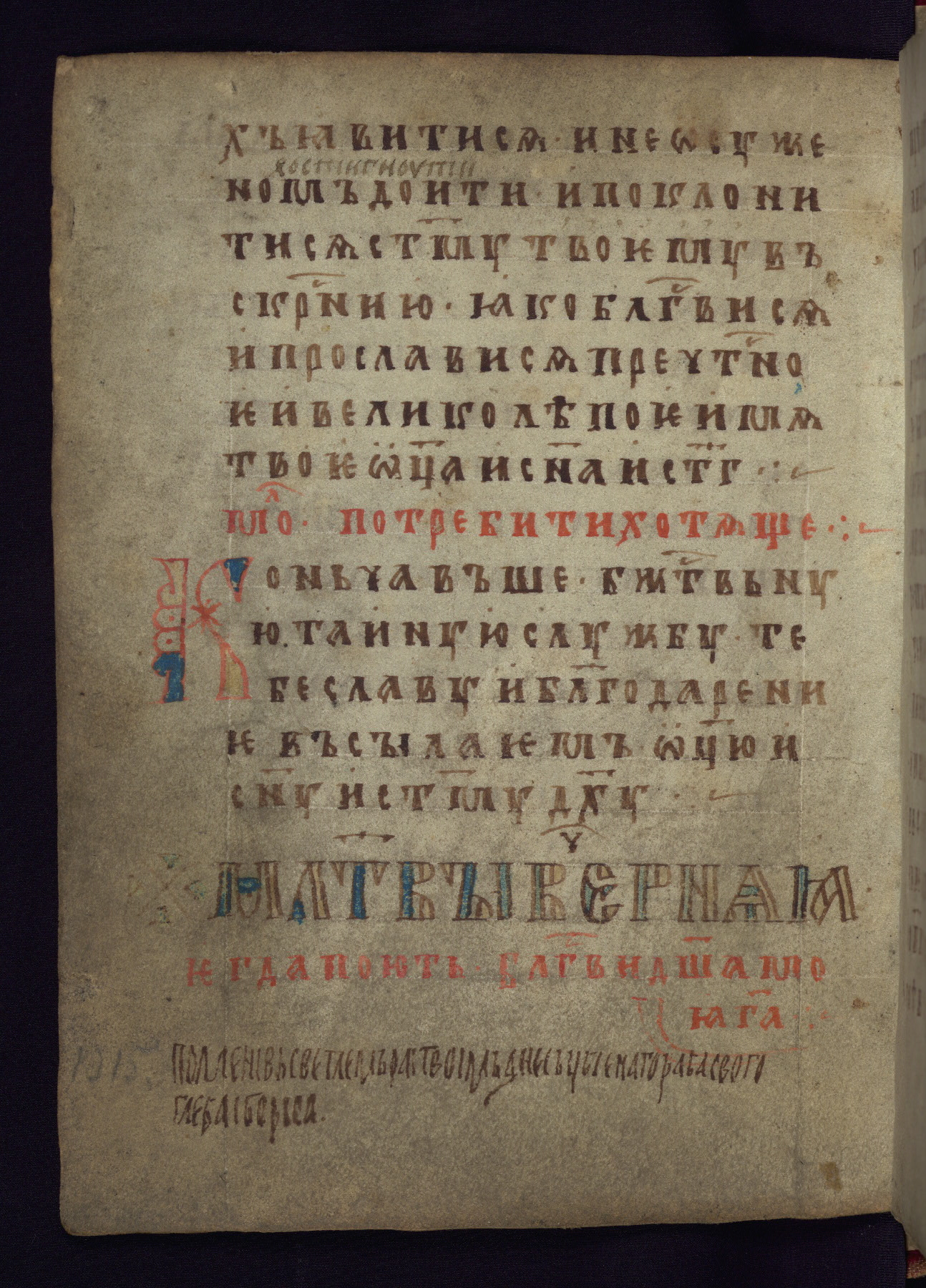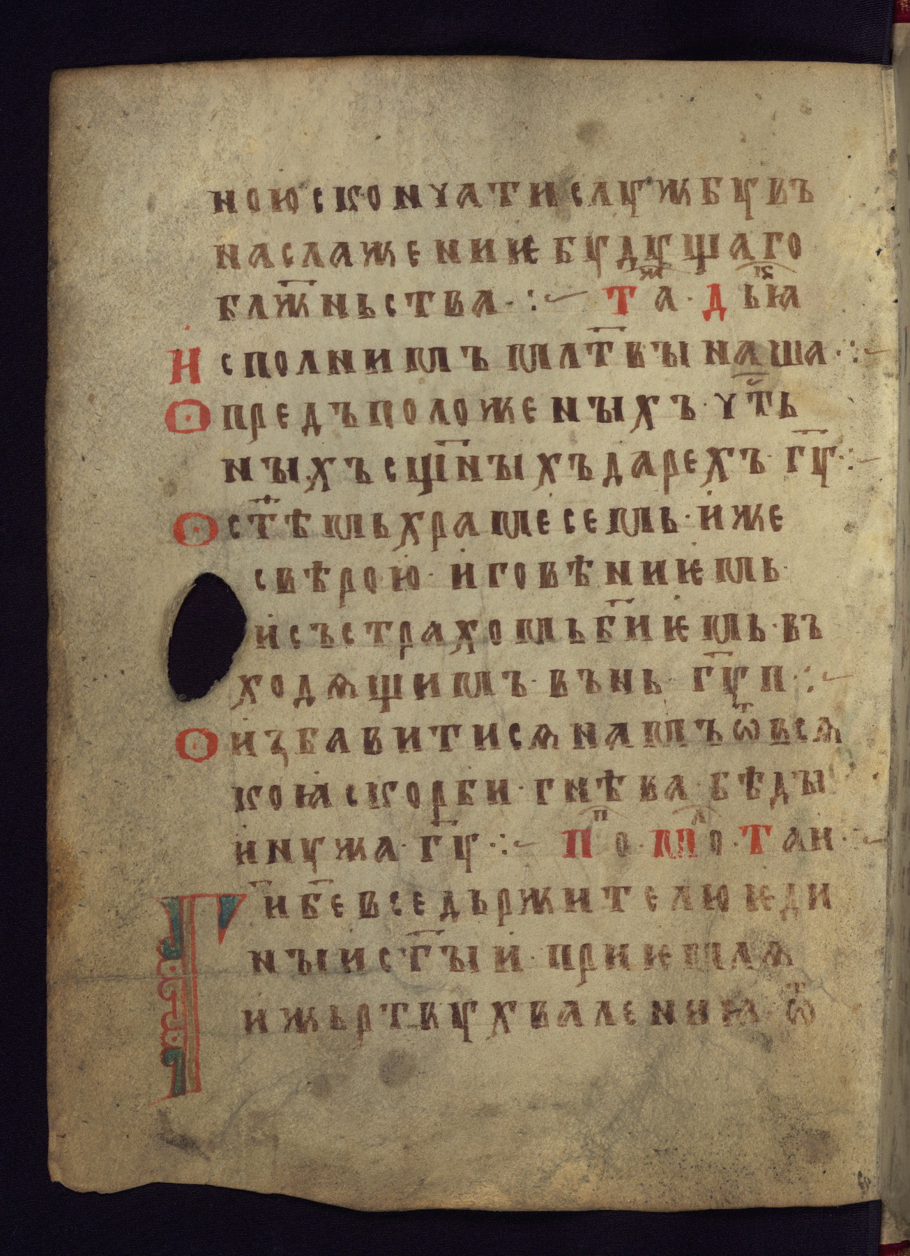 This liturgical text is a rare example of an early Russian manuscript, dating from the fourteenth century. It offers a fascinating case study in the history of manuscript collecting. Because of some eleventh-century dates written in the text, the manuscript was long believed to have been made in that century. Later it was argued that the work was in fact a nineteenth-century forgery by a Russian collector, Alexander Sulakadzev (Demkova 1979). A recent study (Afanas'eva 2009), however, has determined its origin definitively: the pages of this book were cut from a larger manuscript (Saint Petersburg, National Library of Russia, Ms. O. п. Ι. 4) and bound together (out of order), probably by Sulakadzev. Sulakadzev is also likely to have added the notes that made the text appear to date to the eleventh century.