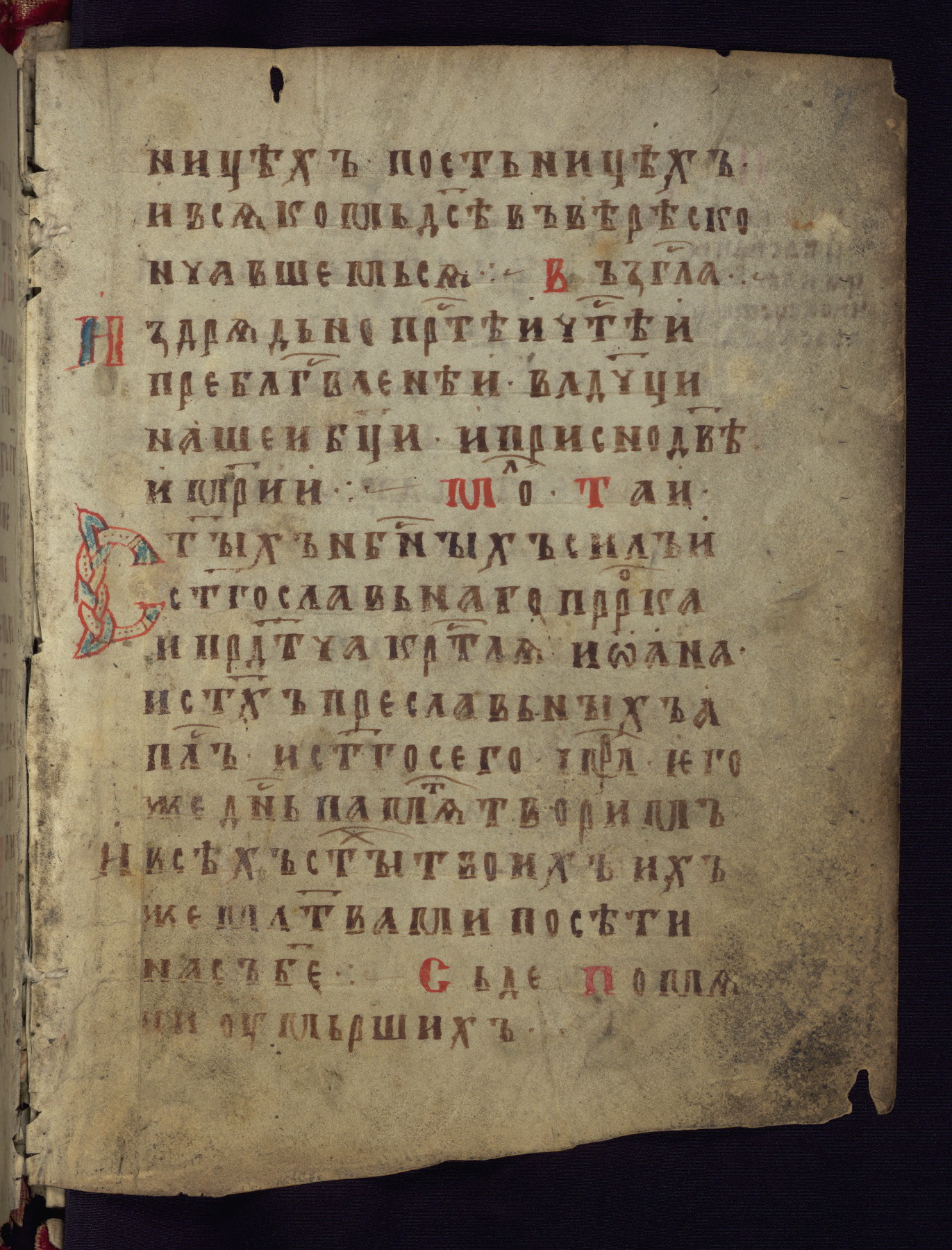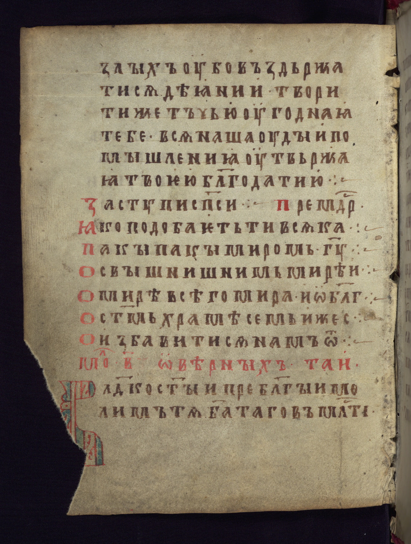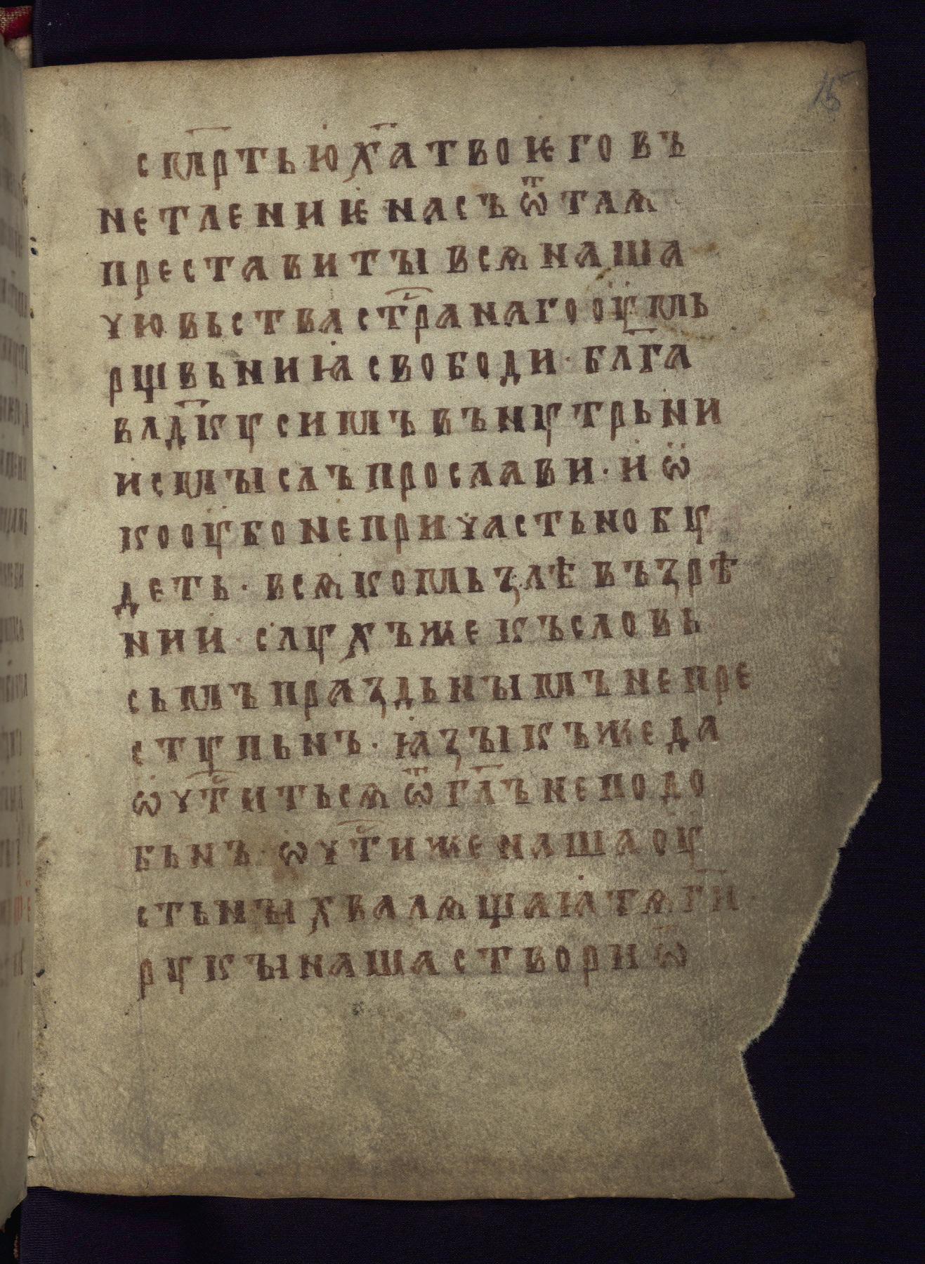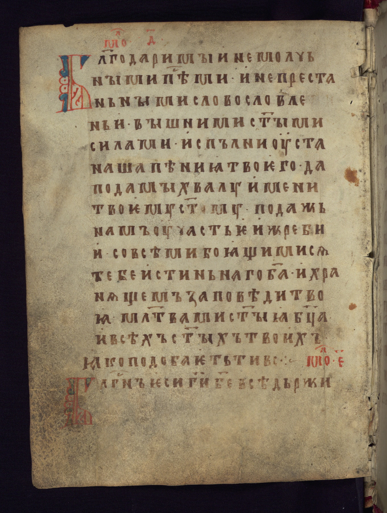 This liturgical text is a rare example of an early Russian manuscript, dating from the fourteenth century. It offers a fascinating case study in the history of manuscript collecting. Because of some eleventh-century dates written in the text, the manuscript was long believed to have been made in that century. Later it was argued that the work was in fact a nineteenth-century forgery by a Russian collector, Alexander Sulakadzev (Demkova 1979). A recent study (Afanas'eva 2009), however, has determined its origin definitively: the pages of this book were cut from a larger manuscript (Saint Petersburg, National Library of Russia, Ms. O. п. Ι. 4) and bound together (out of order), probably by Sulakadzev. Sulakadzev is also likely to have added the notes that made the text appear to date to the eleventh century.