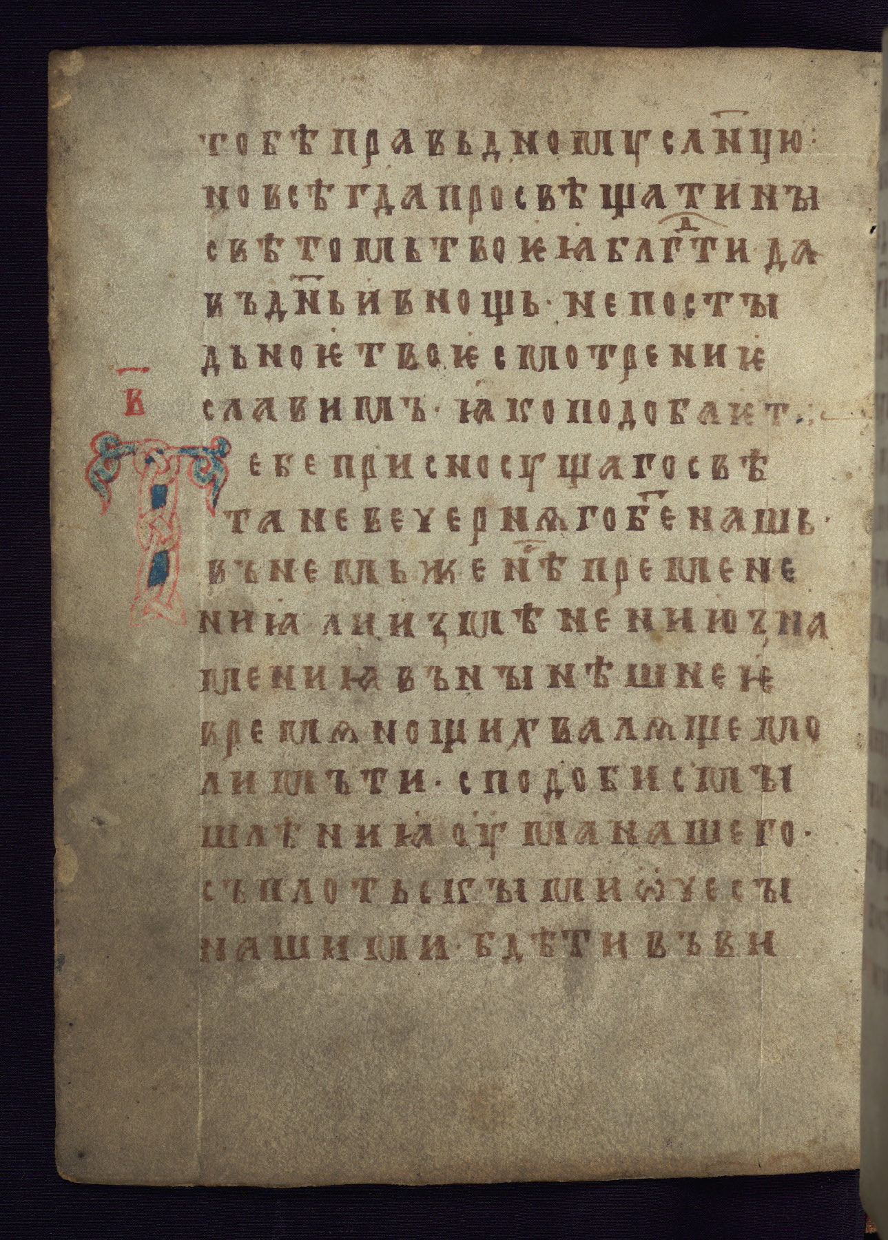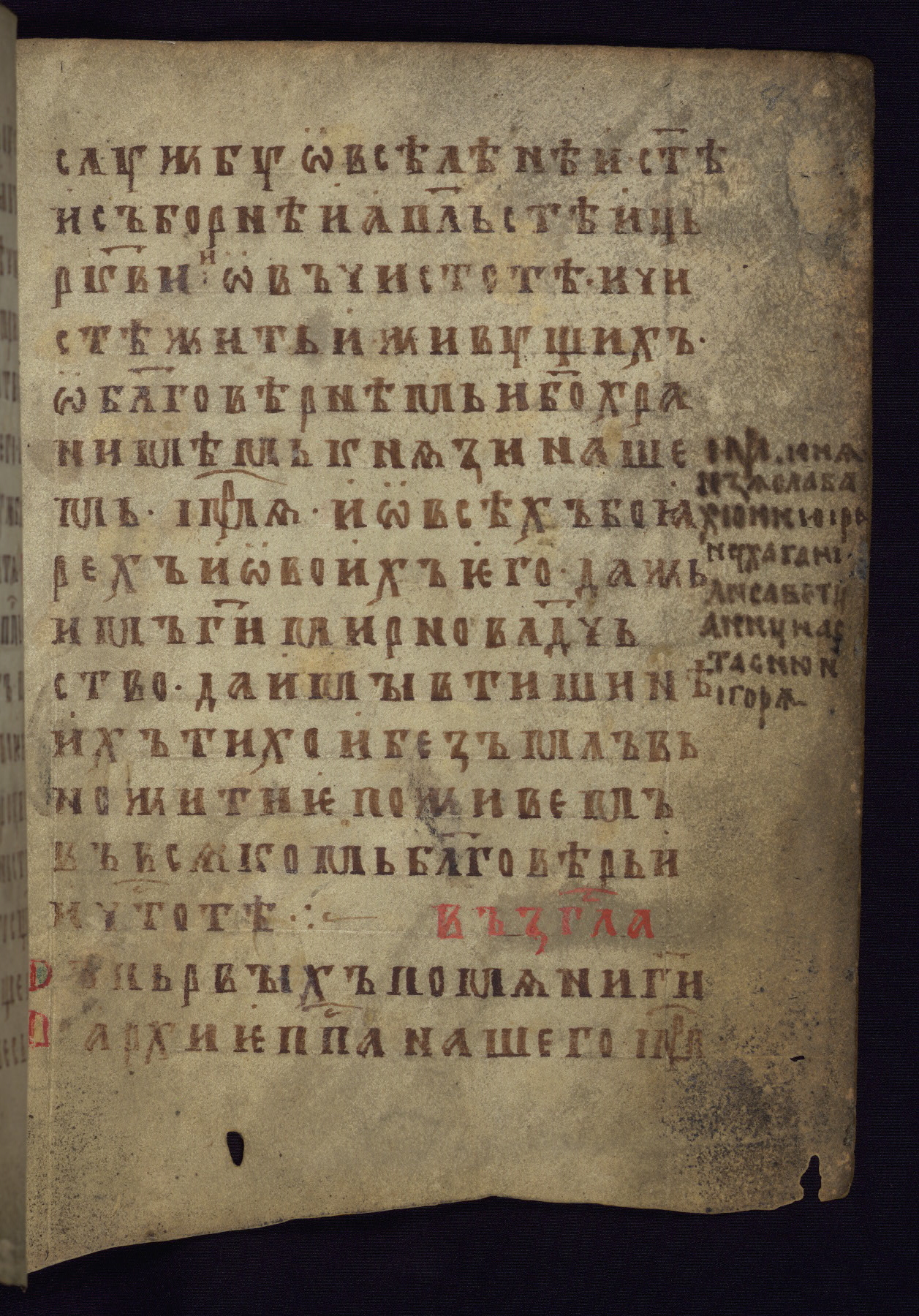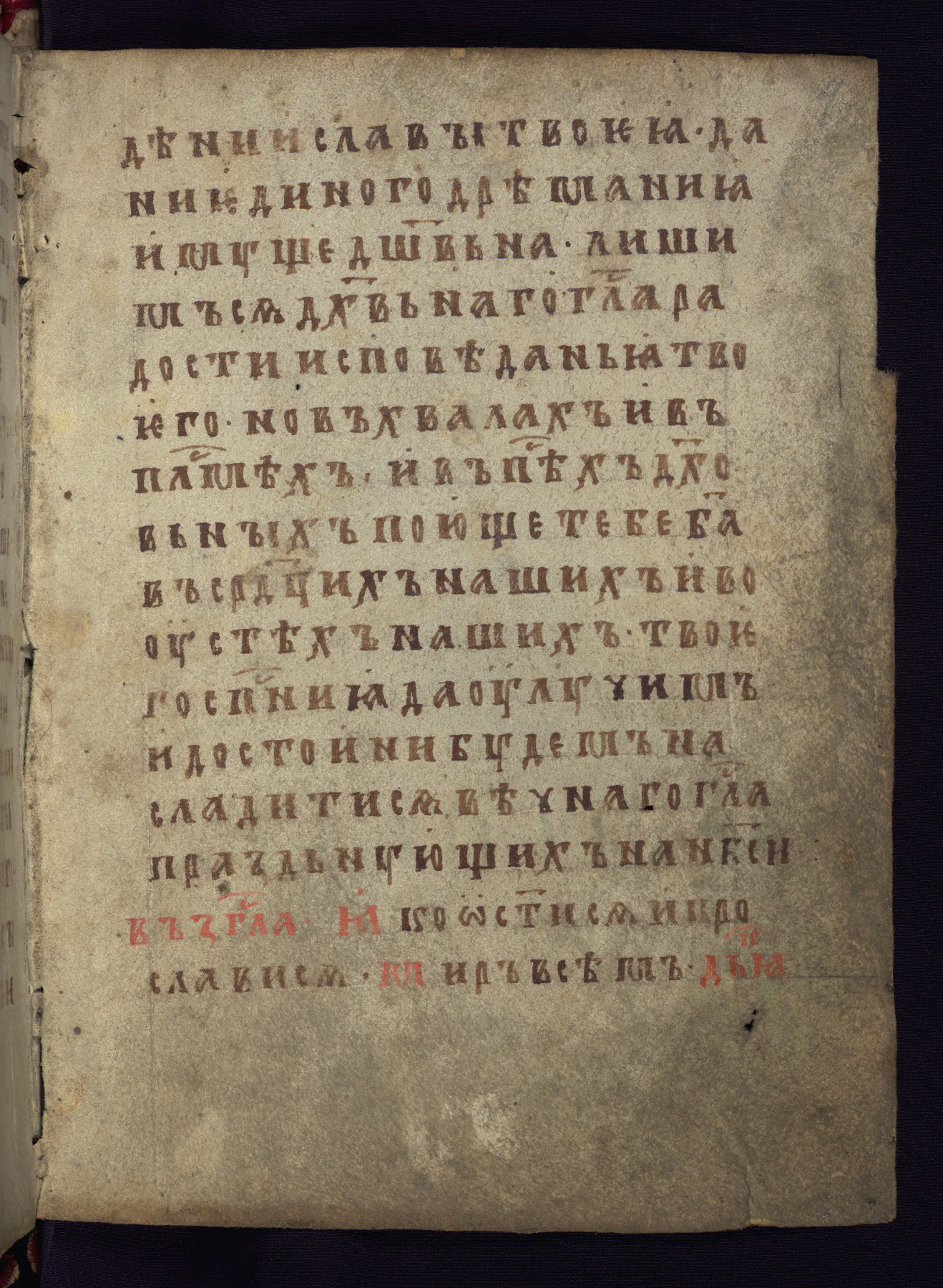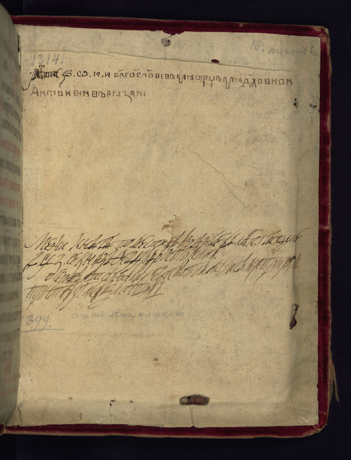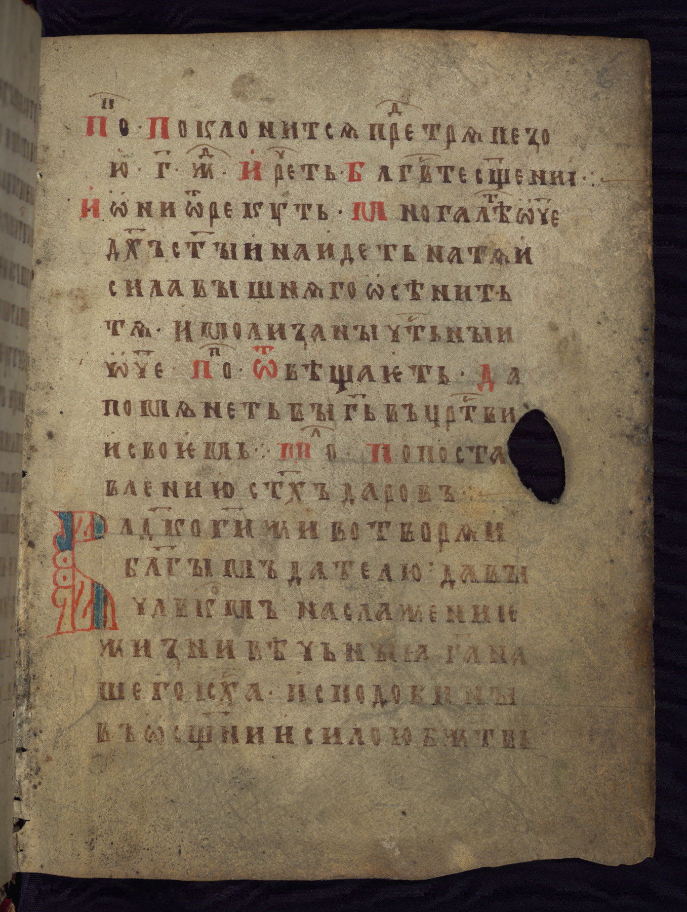 This liturgical text is a rare example of an early Russian manuscript, dating from the fourteenth century. It offers a fascinating case study in the history of manuscript collecting. Because of some eleventh-century dates written in the text, the manuscript was long believed to have been made in that century. Later it was argued that the work was in fact a nineteenth-century forgery by a Russian collector, Alexander Sulakadzev (Demkova 1979). A recent study (Afanas'eva 2009), however, has determined its origin definitively: the pages of this book were cut from a larger manuscript (Saint Petersburg, National Library of Russia, Ms. O. п. Ι. 4) and bound together (out of order), probably by Sulakadzev. Sulakadzev is also likely to have added the notes that made the text appear to date to the eleventh century.