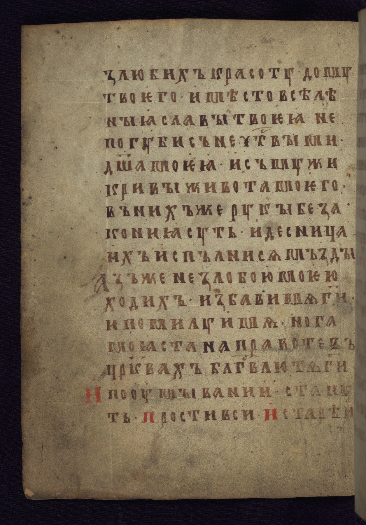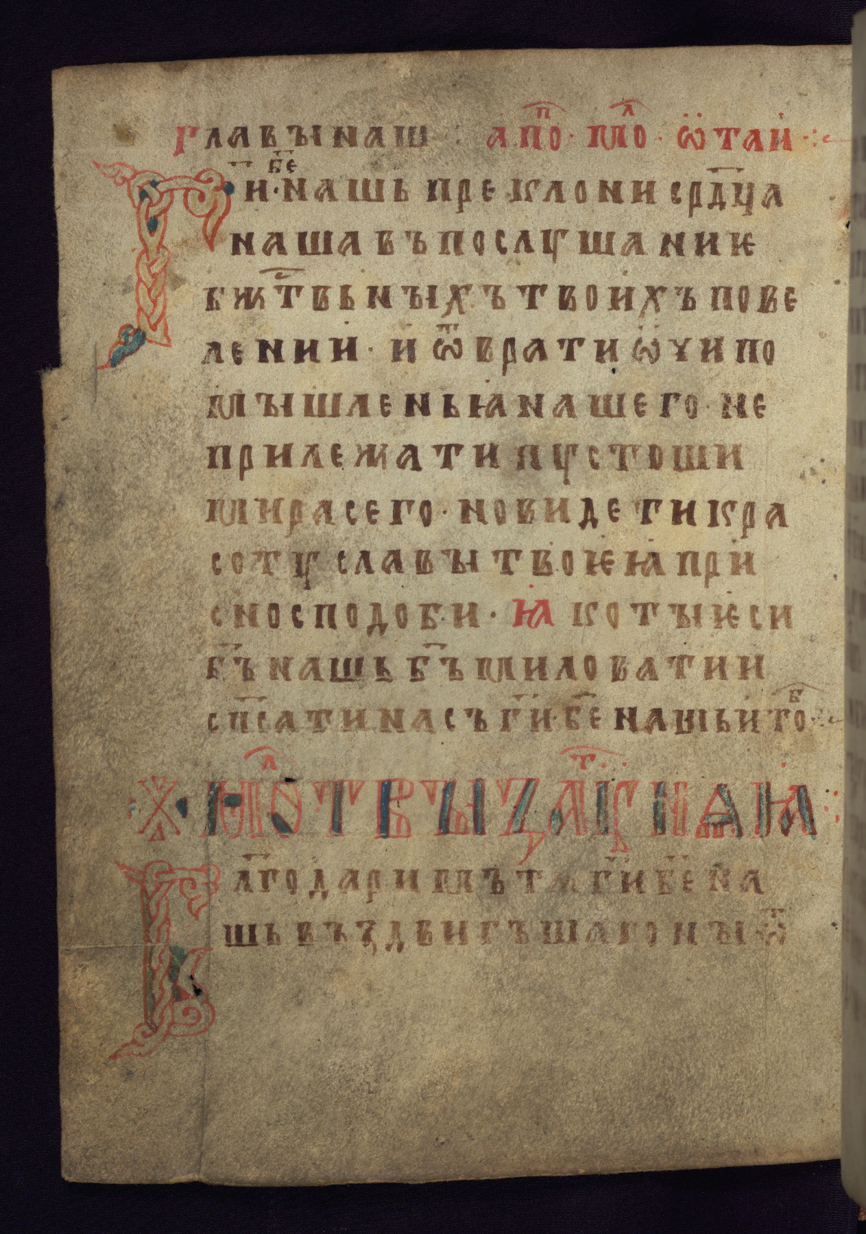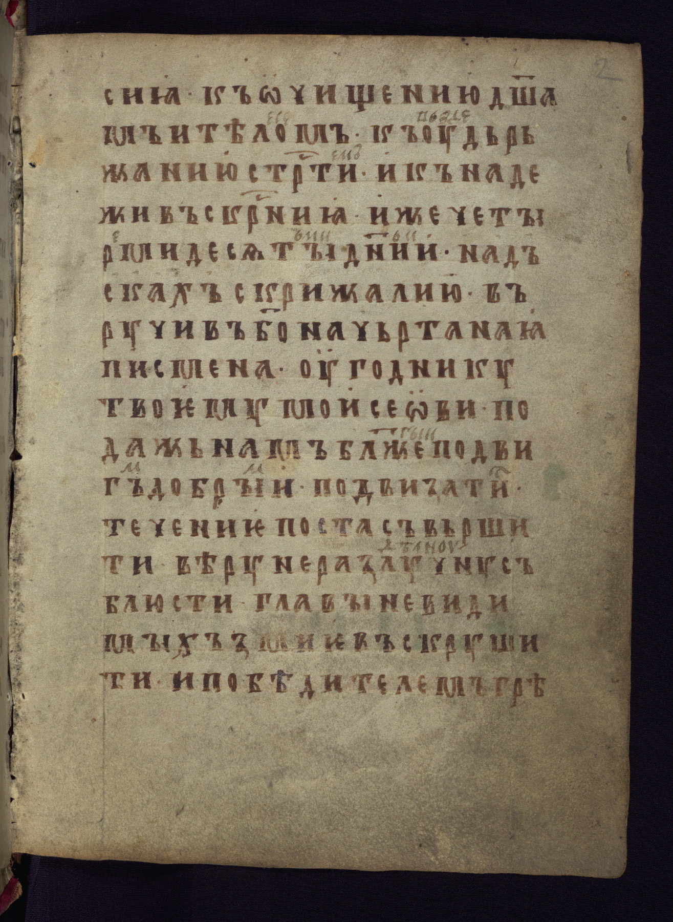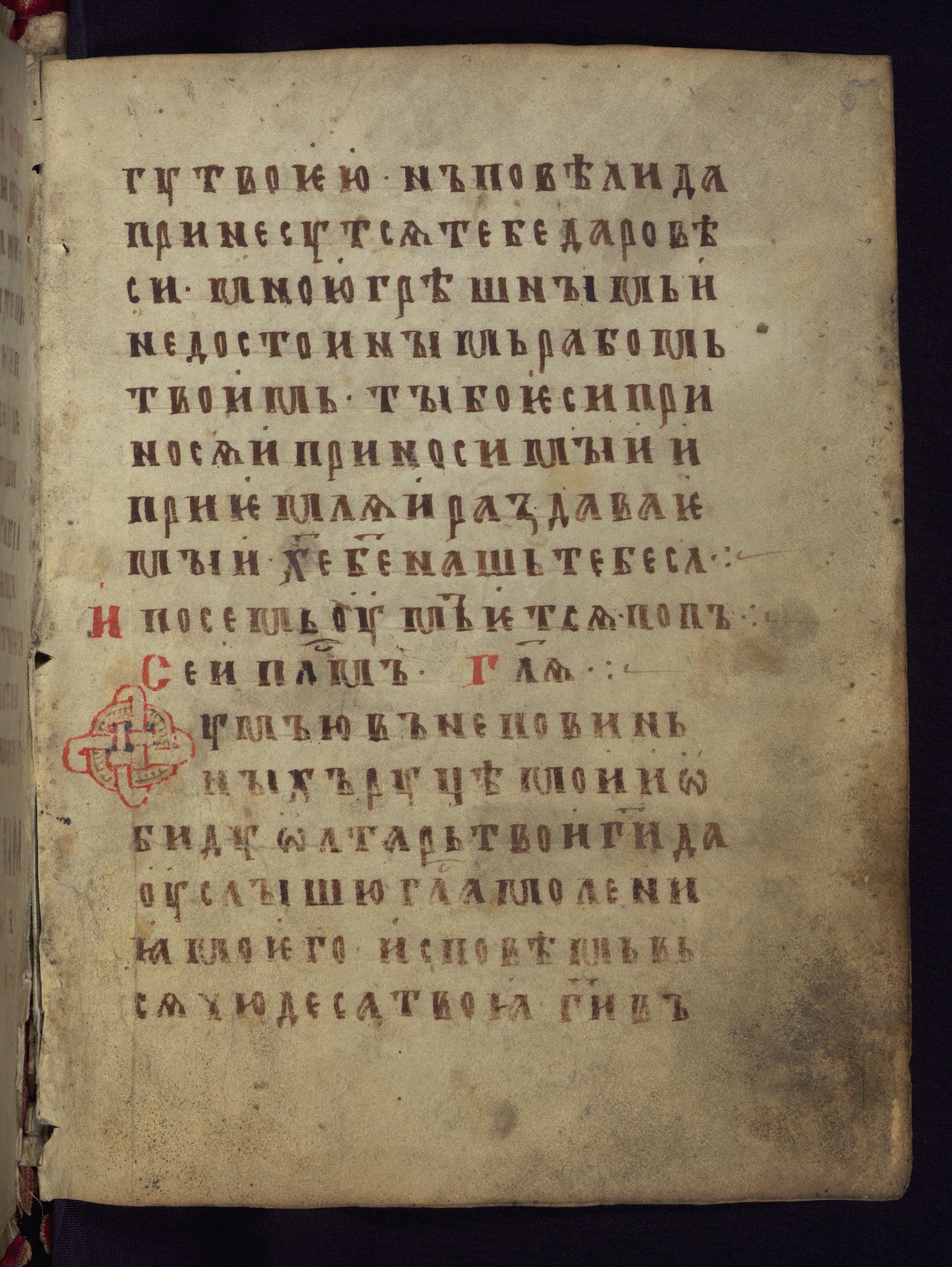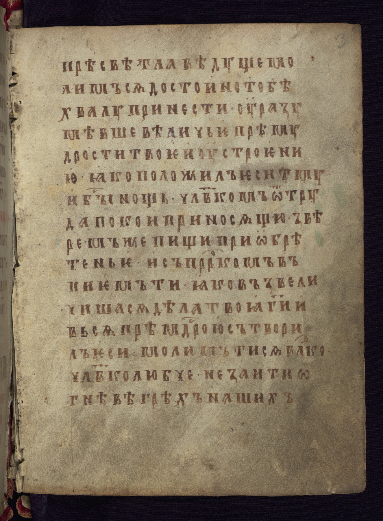 This liturgical text is a rare example of an early Russian manuscript, dating from the fourteenth century. It offers a fascinating case study in the history of manuscript collecting. Because of some eleventh-century dates written in the text, the manuscript was long believed to have been made in that century. Later it was argued that the work was in fact a nineteenth-century forgery by a Russian collector, Alexander Sulakadzev (Demkova 1979). A recent study (Afanas'eva 2009), however, has determined its origin definitively: the pages of this book were cut from a larger manuscript (Saint Petersburg, National Library of Russia, Ms. O. п. Ι. 4) and bound together (out of order), probably by Sulakadzev. Sulakadzev is also likely to have added the notes that made the text appear to date to the eleventh century.