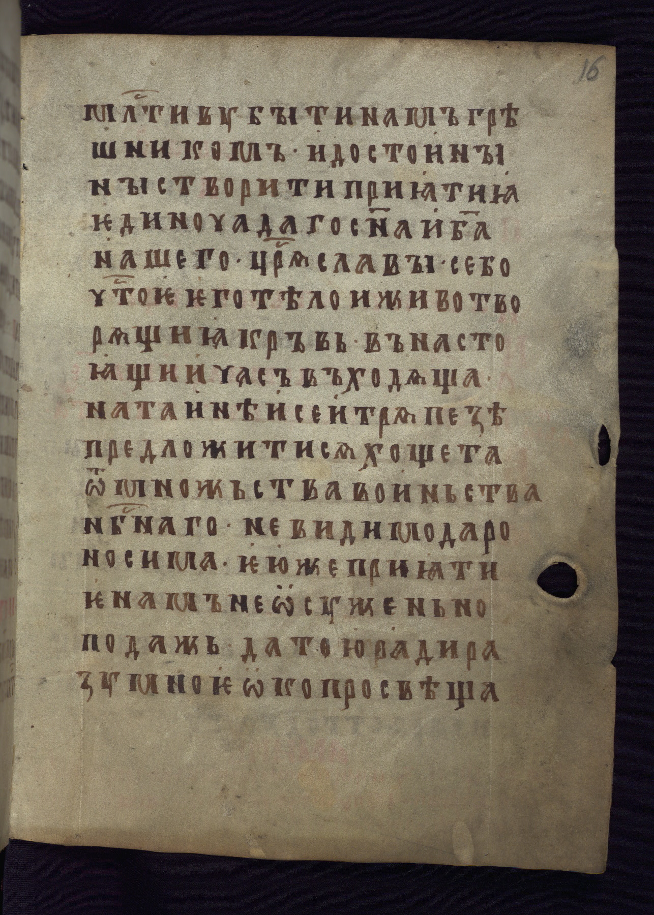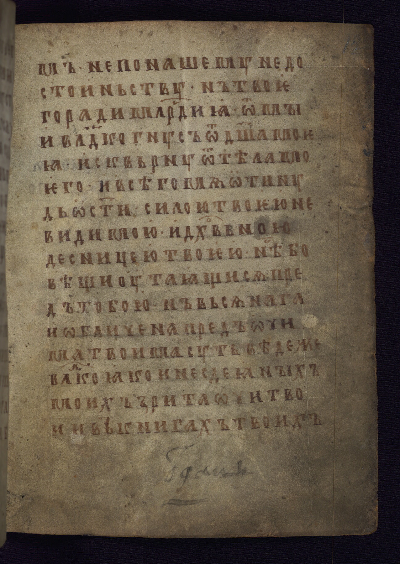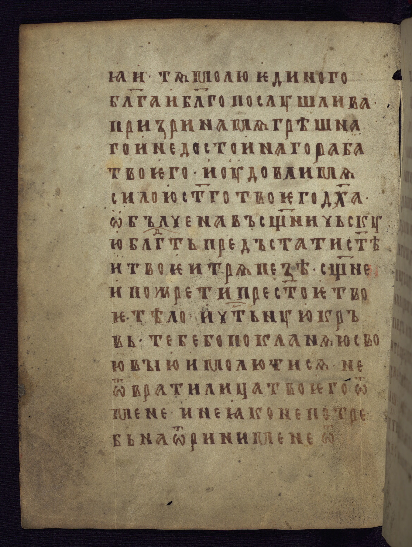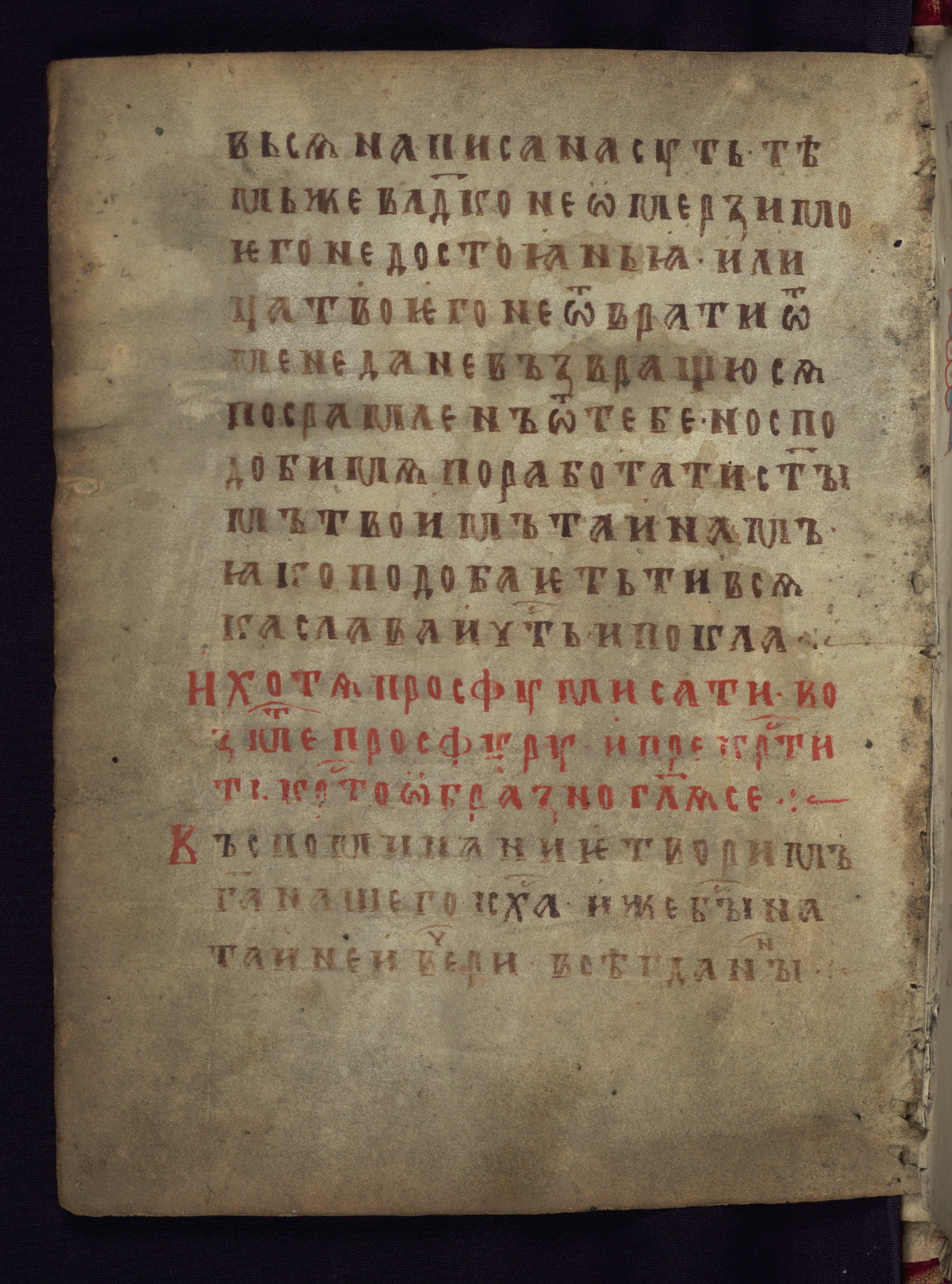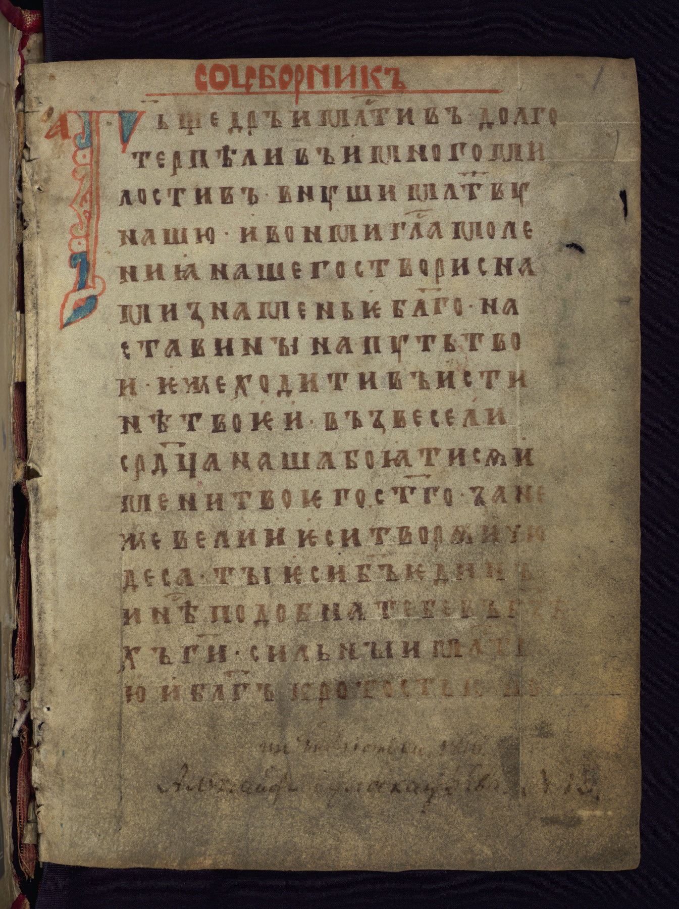 This liturgical text is a rare example of an early Russian manuscript, dating from the fourteenth century. It offers a fascinating case study in the history of manuscript collecting. Because of some eleventh-century dates written in the text, the manuscript was long believed to have been made in that century. Later it was argued that the work was in fact a nineteenth-century forgery by a Russian collector, Alexander Sulakadzev (Demkova 1979). A recent study (Afanas'eva 2009), however, has determined its origin definitively: the pages of this book were cut from a larger manuscript (Saint Petersburg, National Library of Russia, Ms. O. п. Ι. 4) and bound together (out of order), probably by Sulakadzev. Sulakadzev is also likely to have added the notes that made the text appear to date to the eleventh century.