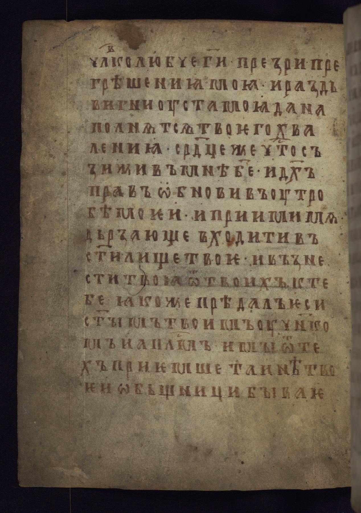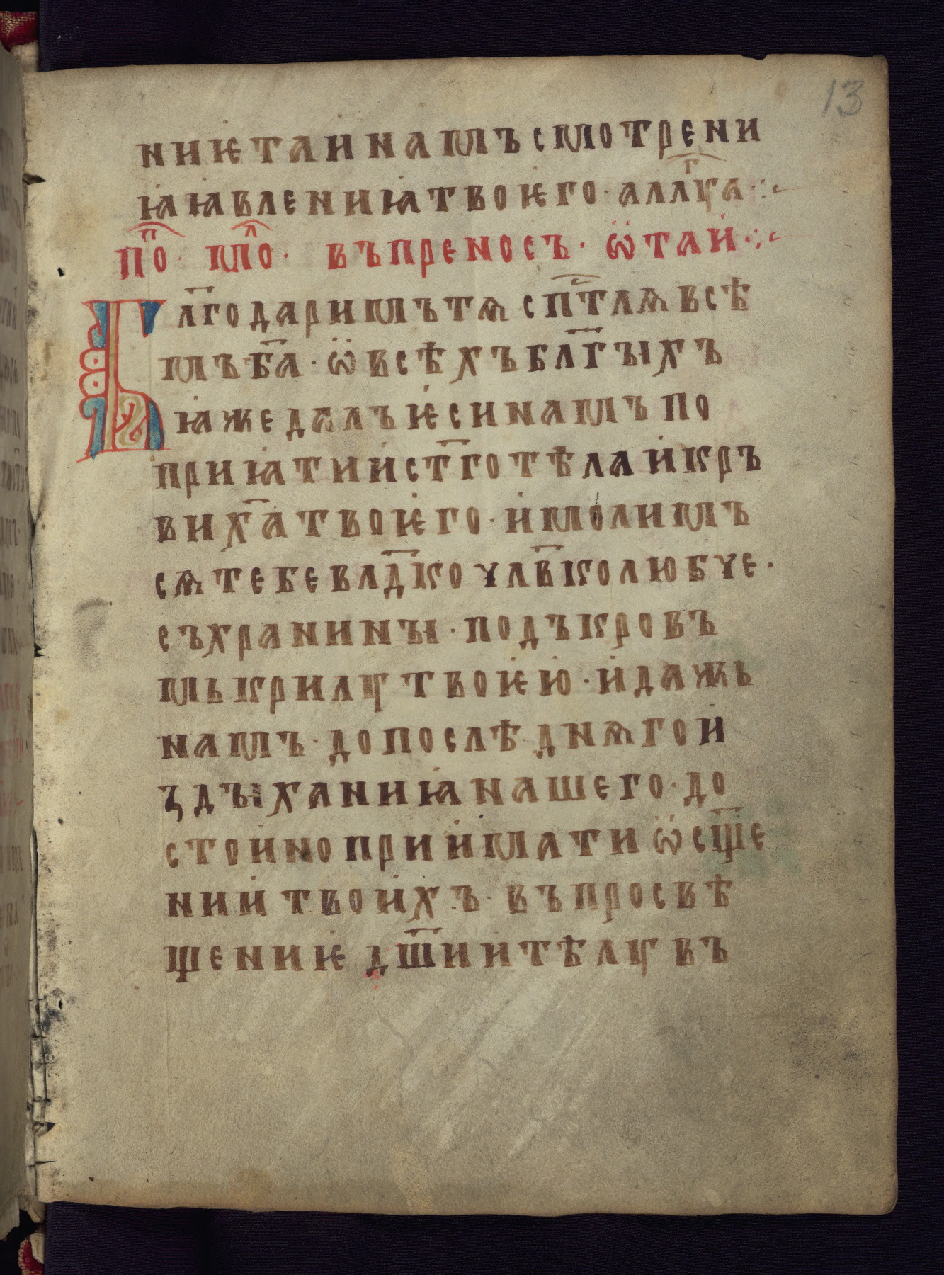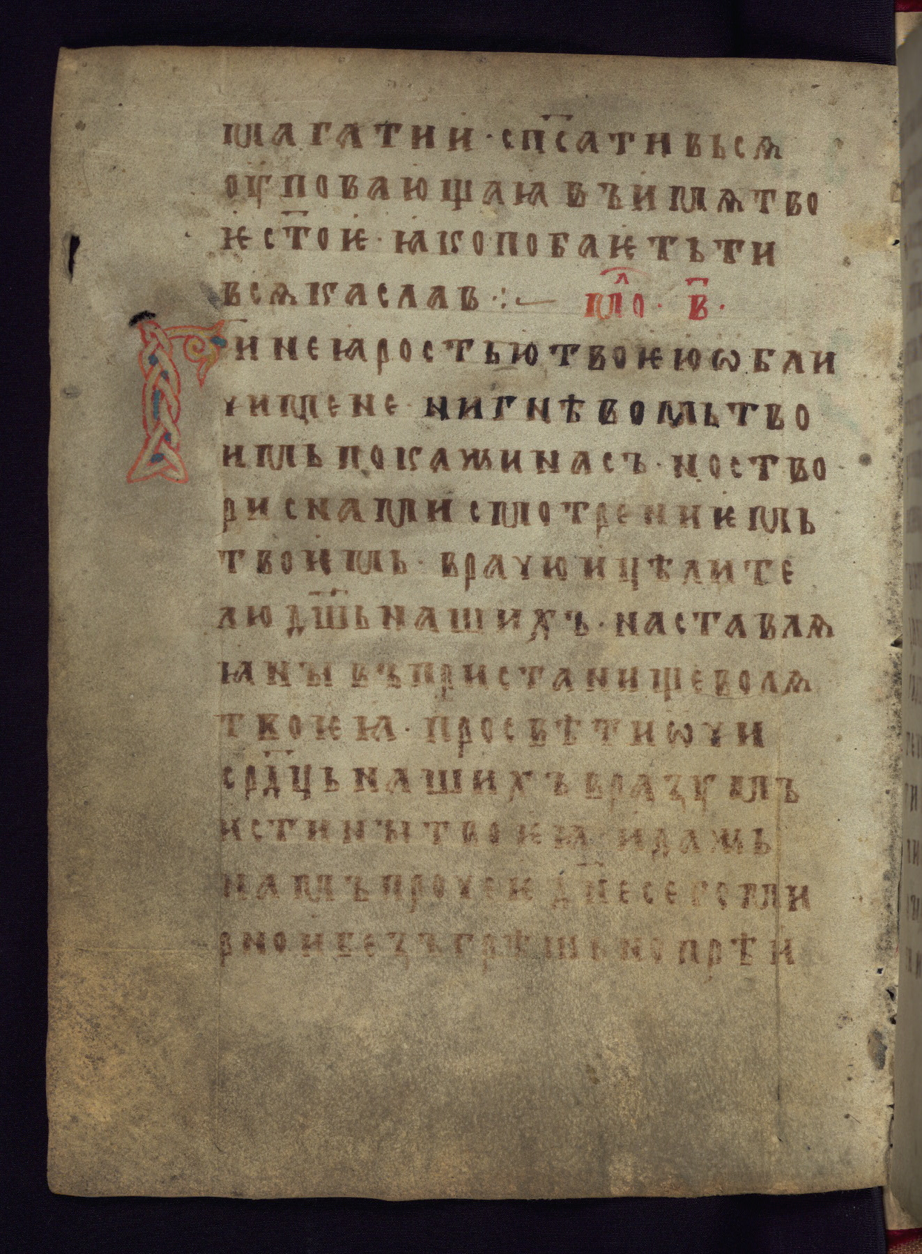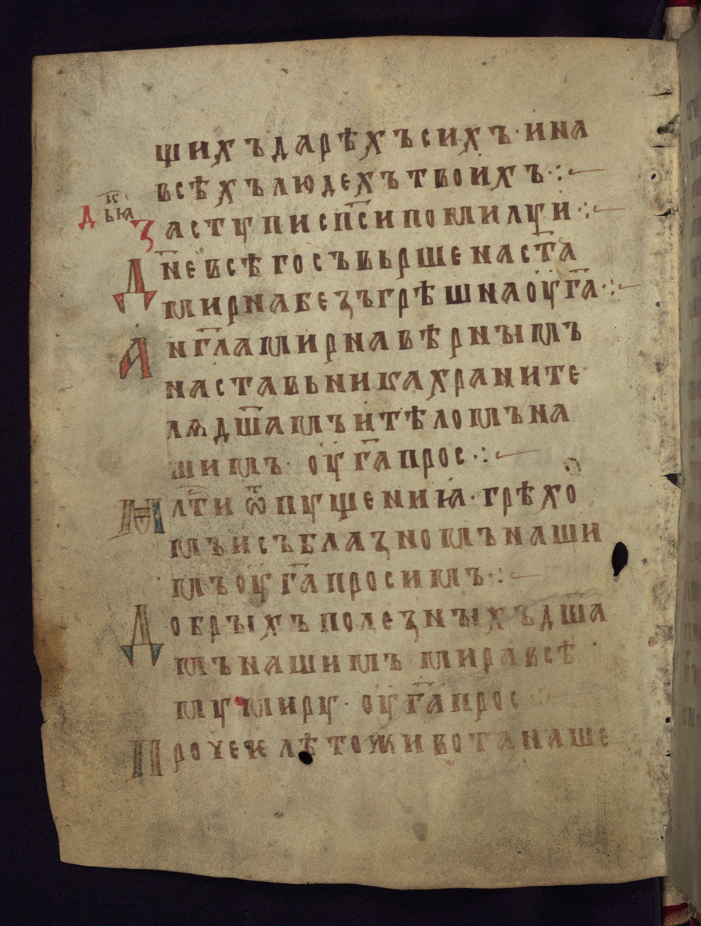 This liturgical text is a rare example of an early Russian manuscript, dating from the fourteenth century. It offers a fascinating case study in the history of manuscript collecting. Because of some eleventh-century dates written in the text, the manuscript was long believed to have been made in that century. Later it was argued that the work was in fact a nineteenth-century forgery by a Russian collector, Alexander Sulakadzev (Demkova 1979). A recent study (Afanas'eva 2009), however, has determined its origin definitively: the pages of this book were cut from a larger manuscript (Saint Petersburg, National Library of Russia, Ms. O. п. Ι. 4) and bound together (out of order), probably by Sulakadzev. Sulakadzev is also likely to have added the notes that made the text appear to date to the eleventh century.