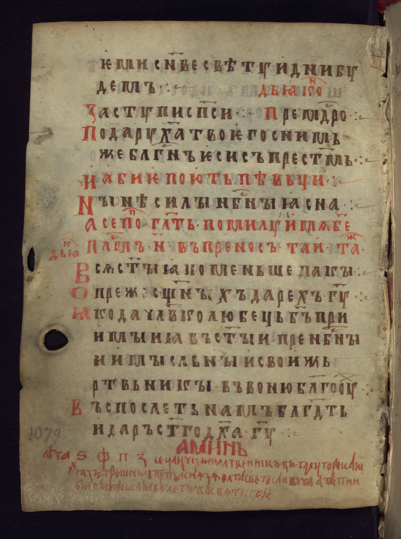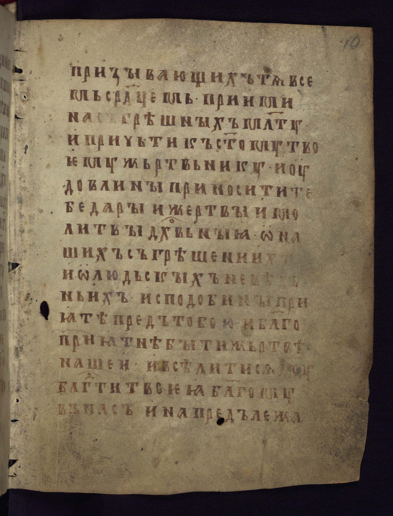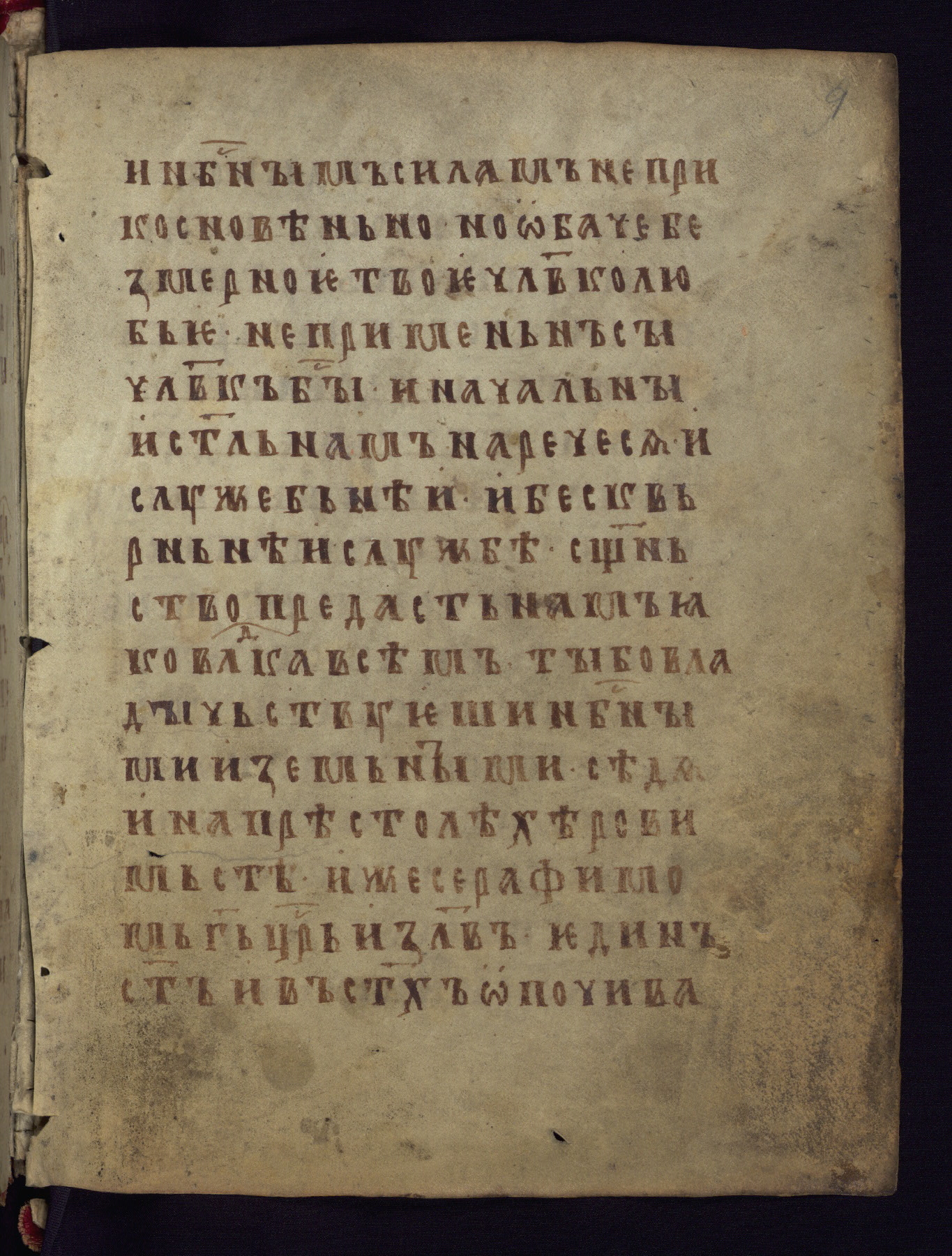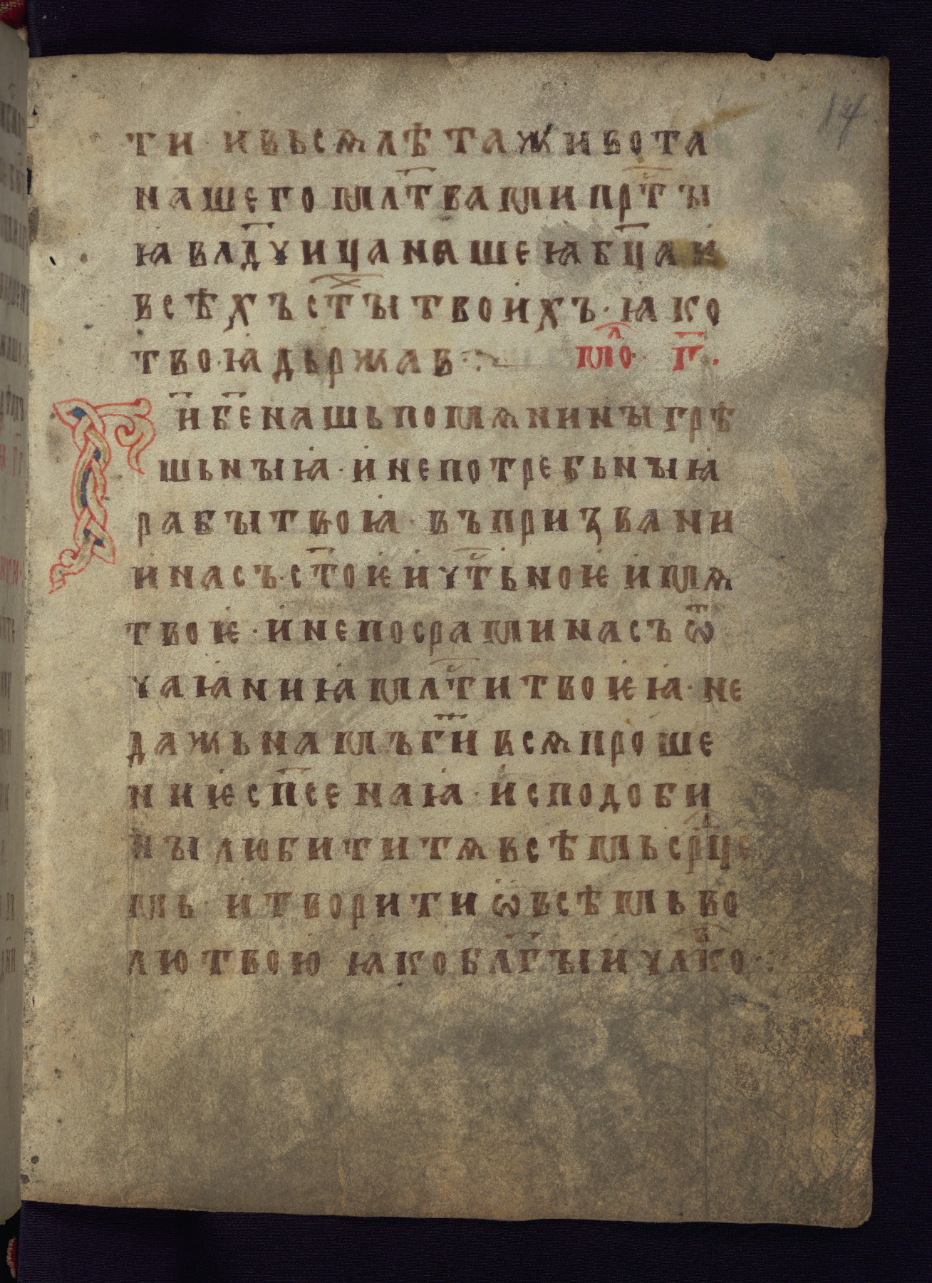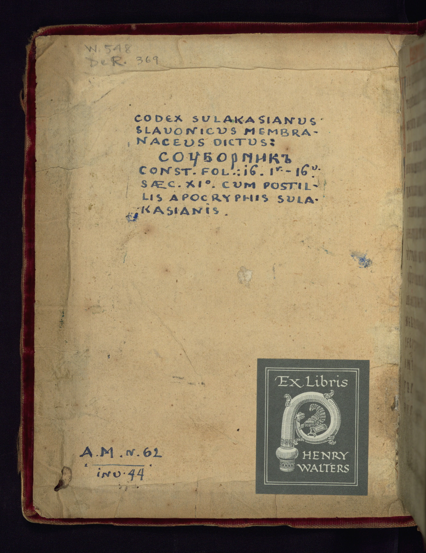 This liturgical text is a rare example of an early Russian manuscript, dating from the fourteenth century. It offers a fascinating case study in the history of manuscript collecting. Because of some eleventh-century dates written in the text, the manuscript was long believed to have been made in that century. Later it was argued that the work was in fact a nineteenth-century forgery by a Russian collector, Alexander Sulakadzev (Demkova 1979). A recent study (Afanas'eva 2009), however, has determined its origin definitively: the pages of this book were cut from a larger manuscript (Saint Petersburg, National Library of Russia, Ms. O. п. Ι. 4) and bound together (out of order), probably by Sulakadzev. Sulakadzev is also likely to have added the notes that made the text appear to date to the eleventh century.