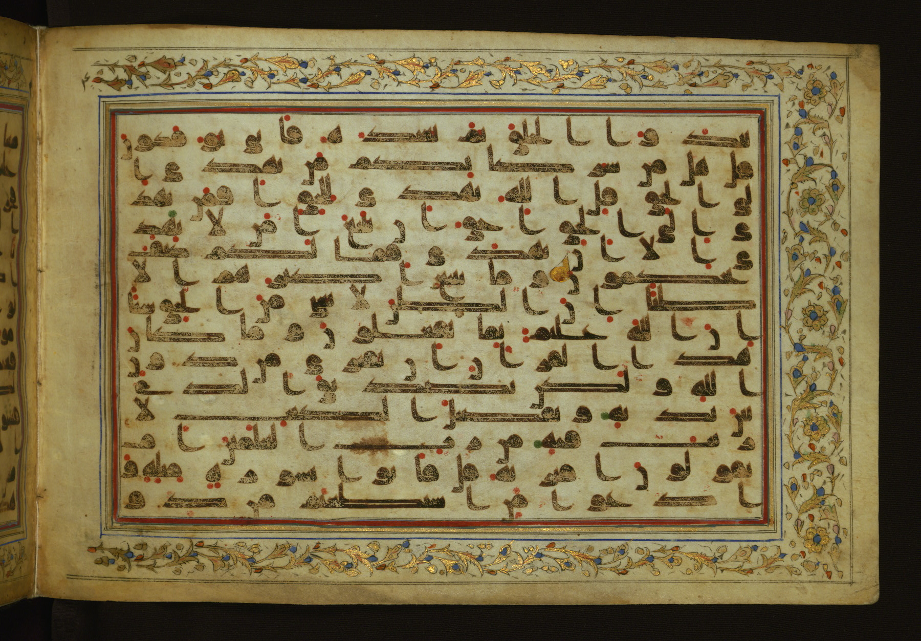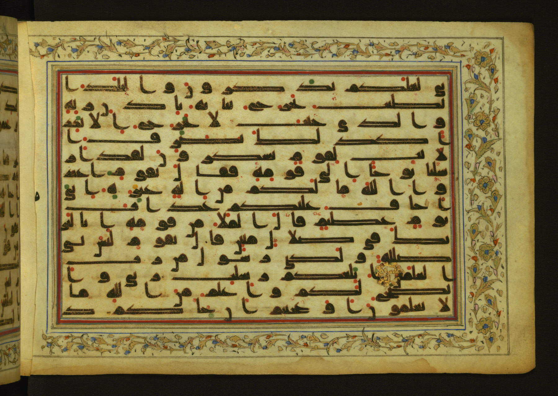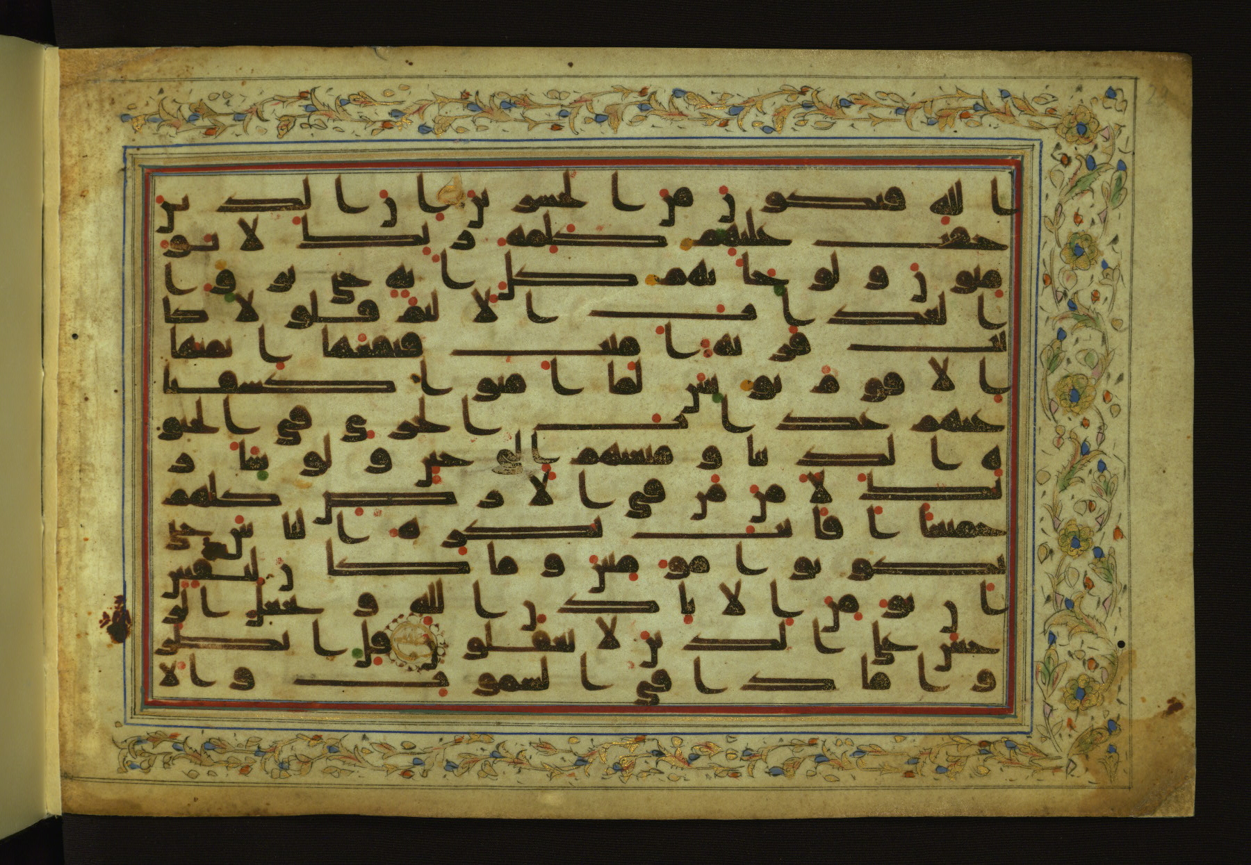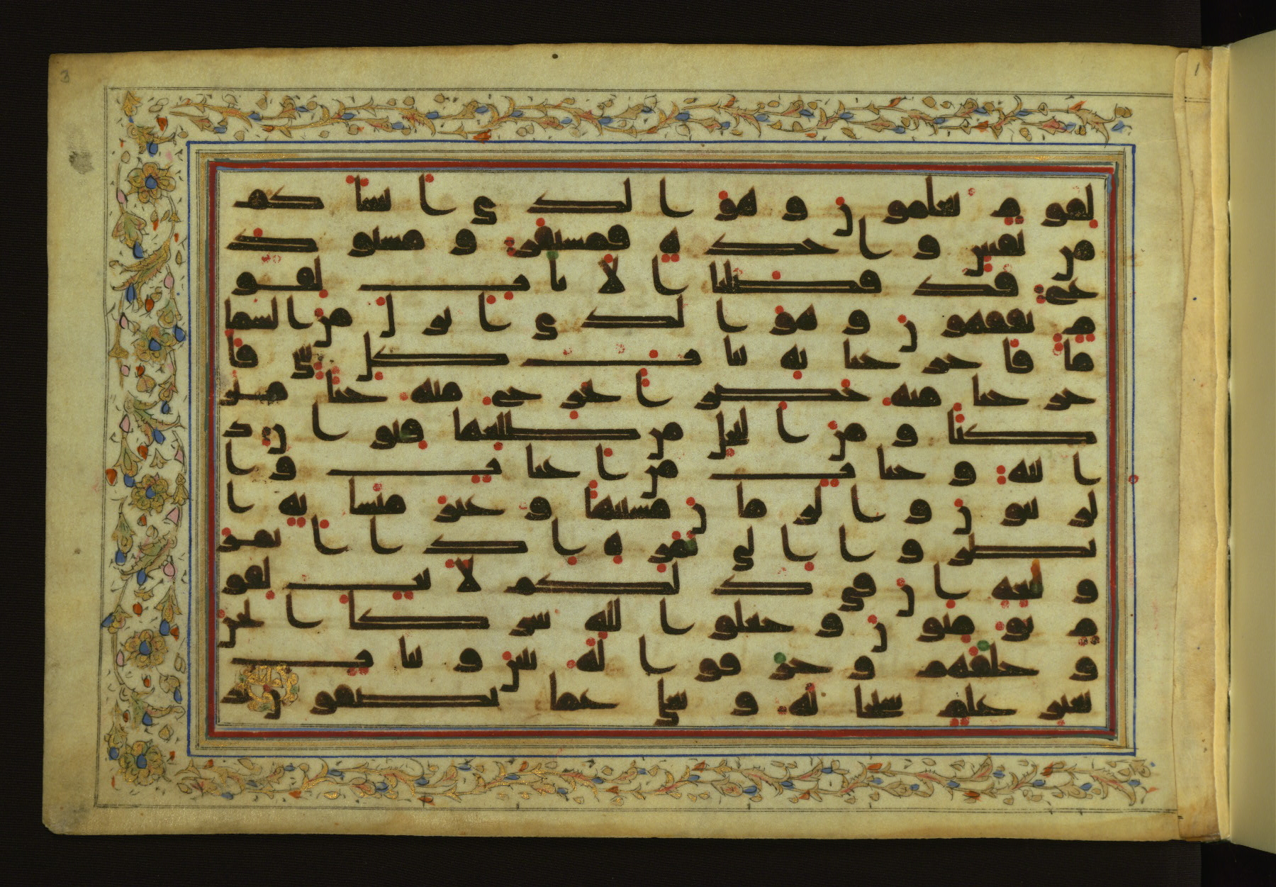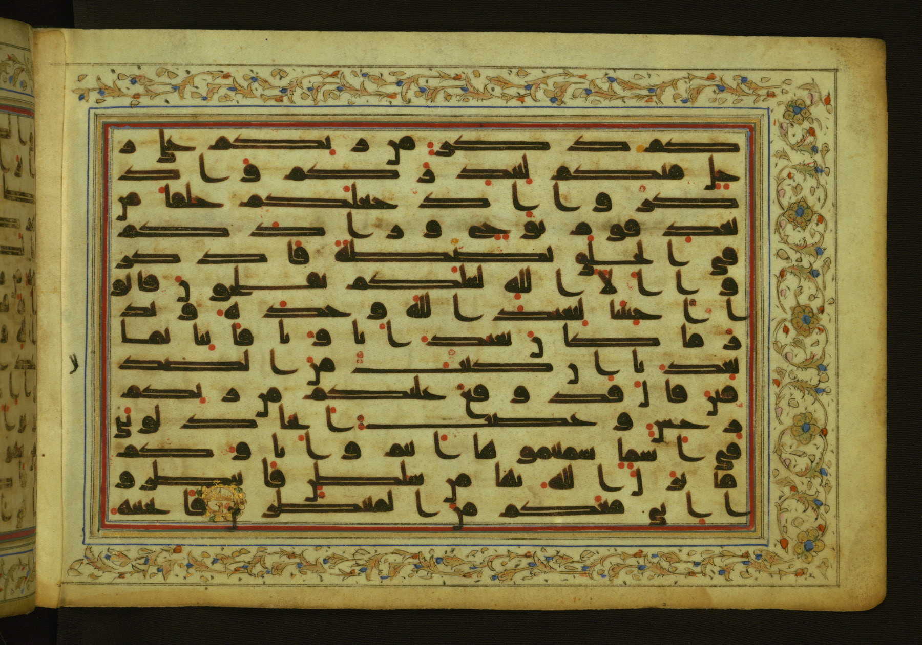 This horizontal-format manuscript on parchment is an illuminated fragment of the Qur'an, containing portions of chapters 4 (Sūrat al-nisāʾ), 6 (Sūrat al-anʿām), 7 (Sūrat al-aʿrāf), and 10 (Sūrat Yūnus). The fragment probably dates to the third century AH / ninth CE. The text is written in an Early Abbasid (Kufic) script in dark brown ink and vocalized with red and green dots. Verse markers in the shape of a stylized letter hā' and rosettes indicate groups of five and ten verses. The text is framed by later red, blue, and gold framing lines and a polychrome and gold floral border. The black blind-tooled leather binding with central lobed, pointed oval and pendants is attributable to the thirteenth century AH / nineteenth CE.