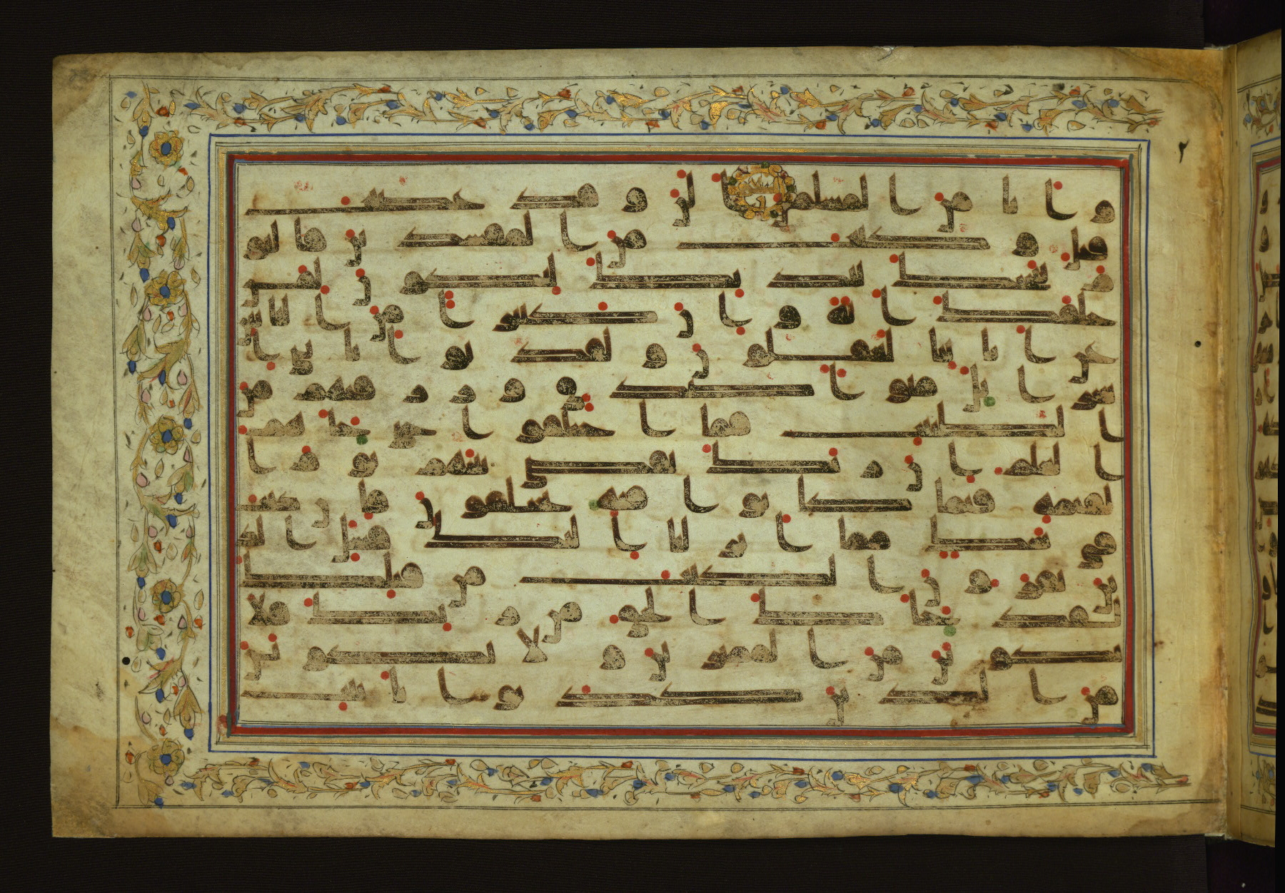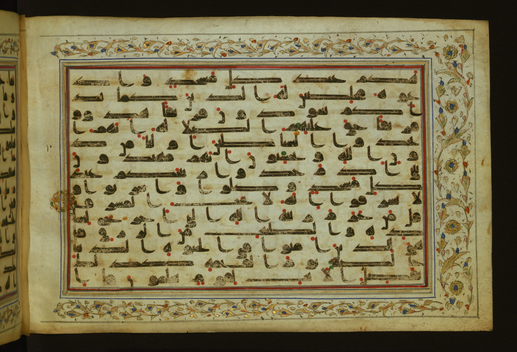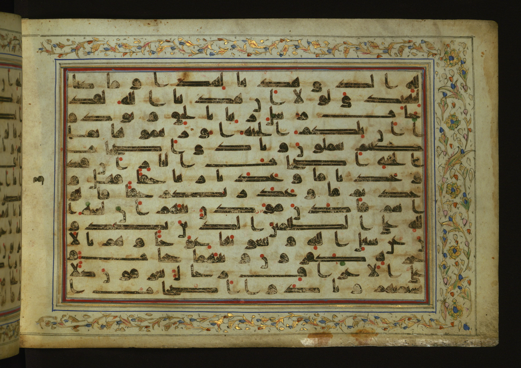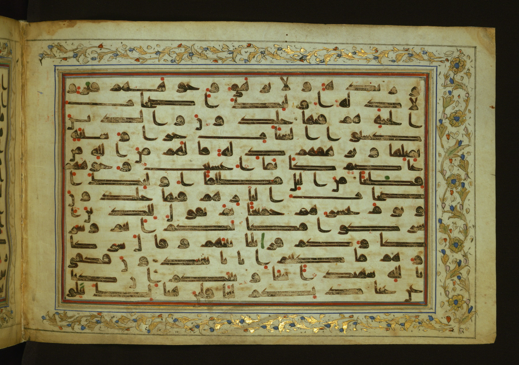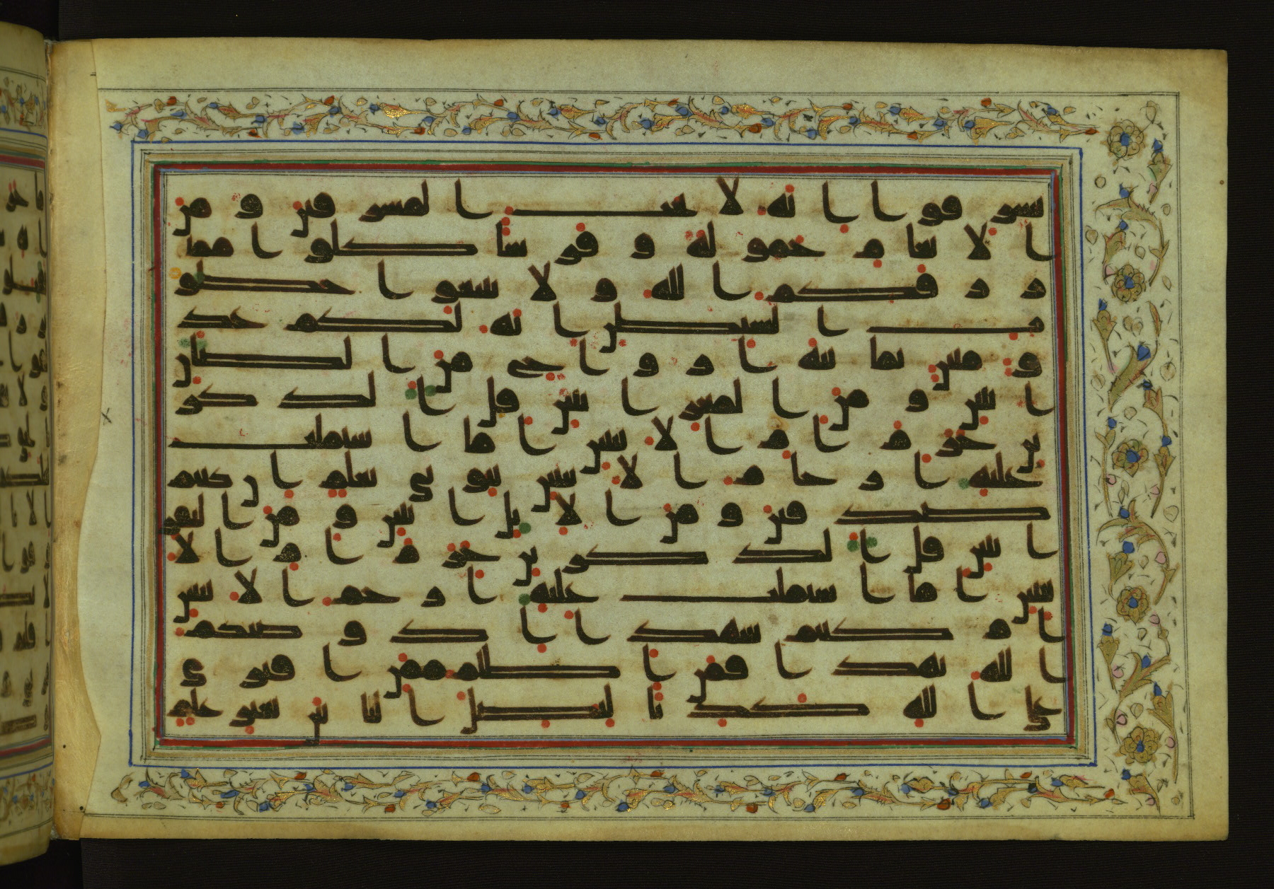 This horizontal-format manuscript on parchment is an illuminated fragment of the Qur'an, containing portions of chapters 4 (Sūrat al-nisāʾ), 6 (Sūrat al-anʿām), 7 (Sūrat al-aʿrāf), and 10 (Sūrat Yūnus). The fragment probably dates to the third century AH / ninth CE. The text is written in an Early Abbasid (Kufic) script in dark brown ink and vocalized with red and green dots. Verse markers in the shape of a stylized letter hā' and rosettes indicate groups of five and ten verses. The text is framed by later red, blue, and gold framing lines and a polychrome and gold floral border. The black blind-tooled leather binding with central lobed, pointed oval and pendants is attributable to the thirteenth century AH / nineteenth CE.