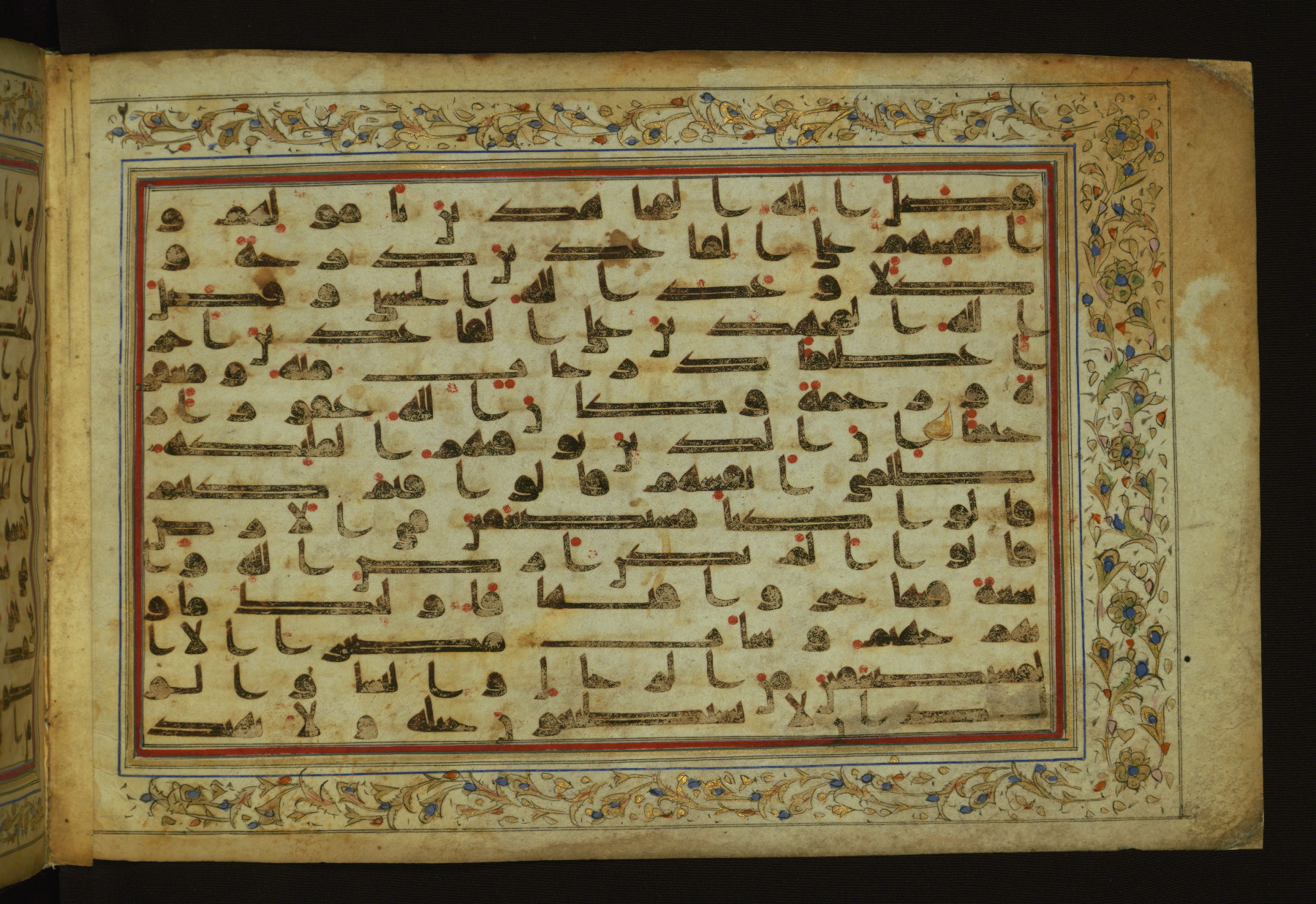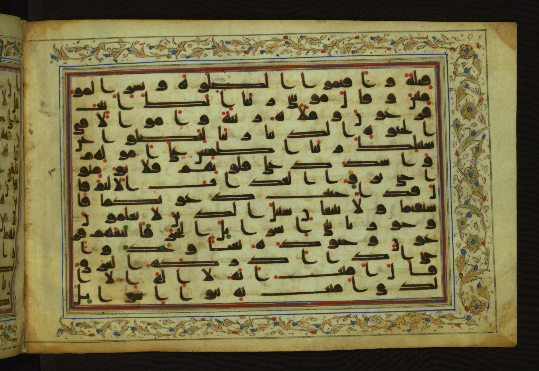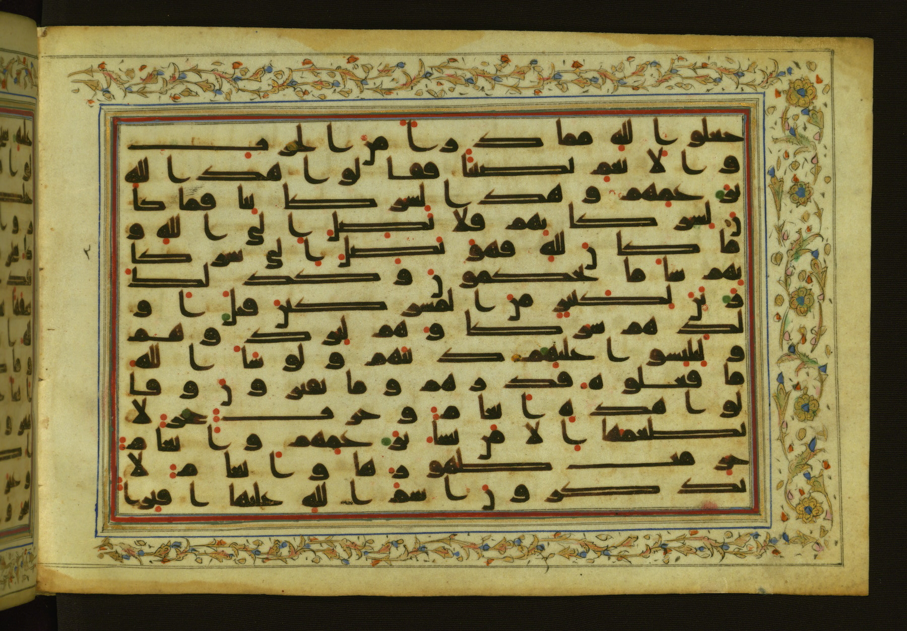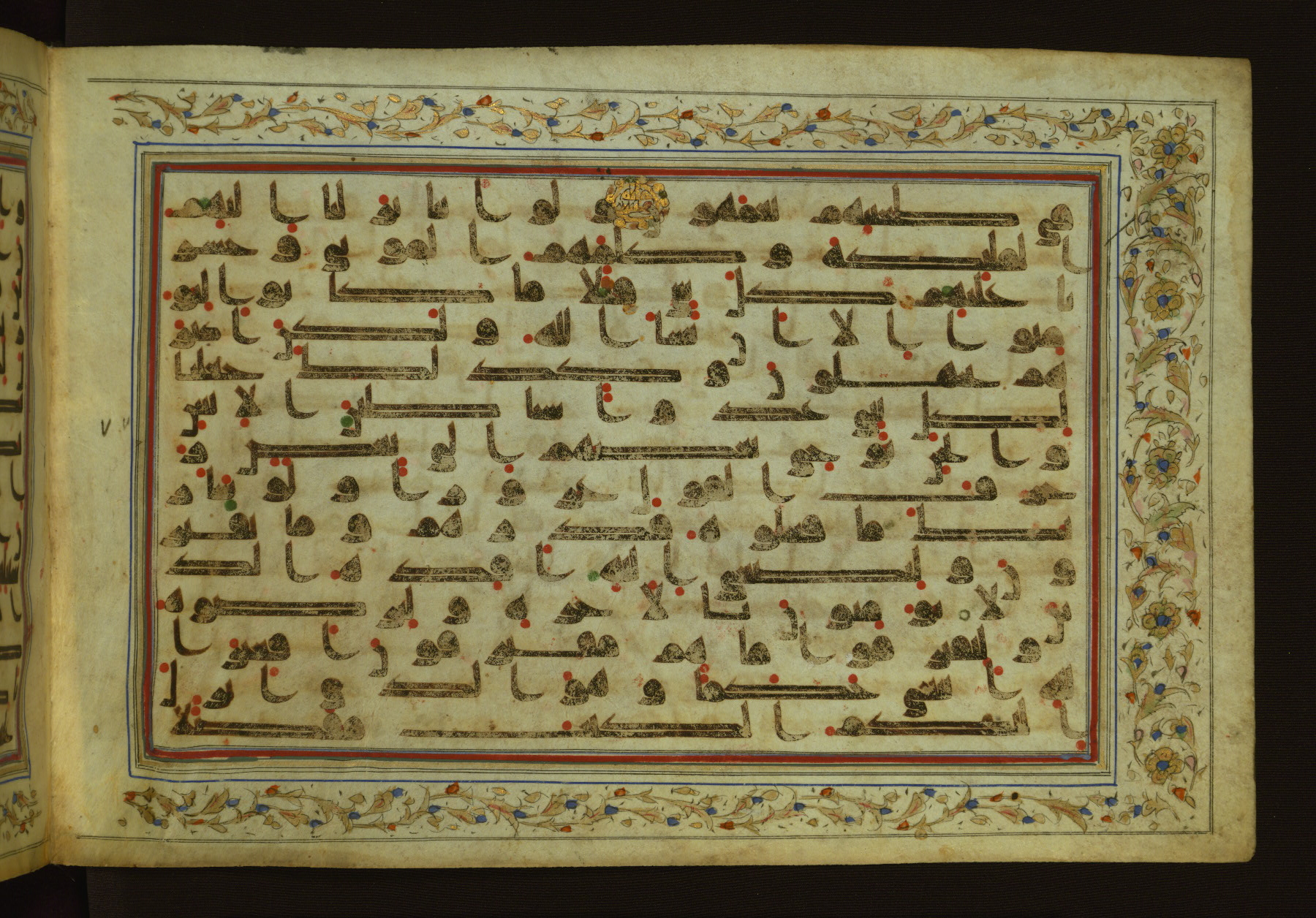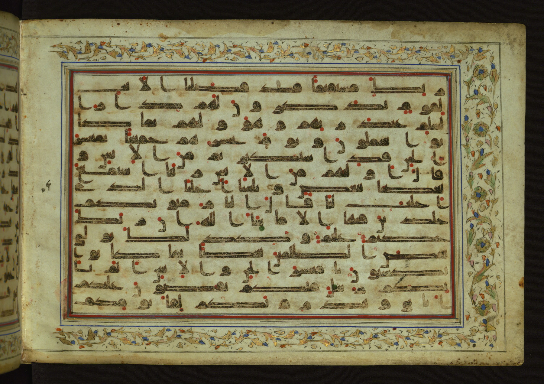 This horizontal-format manuscript on parchment is an illuminated fragment of the Qur'an, containing portions of chapters 4 (Sūrat al-nisāʾ), 6 (Sūrat al-anʿām), 7 (Sūrat al-aʿrāf), and 10 (Sūrat Yūnus). The fragment probably dates to the third century AH / ninth CE. The text is written in an Early Abbasid (Kufic) script in dark brown ink and vocalized with red and green dots. Verse markers in the shape of a stylized letter hā' and rosettes indicate groups of five and ten verses. The text is framed by later red, blue, and gold framing lines and a polychrome and gold floral border. The black blind-tooled leather binding with central lobed, pointed oval and pendants is attributable to the thirteenth century AH / nineteenth CE.