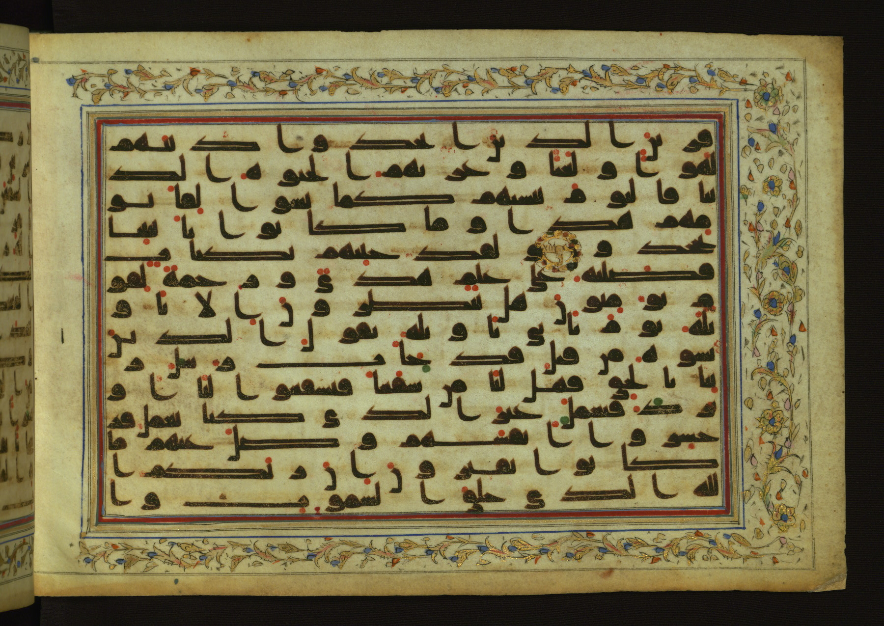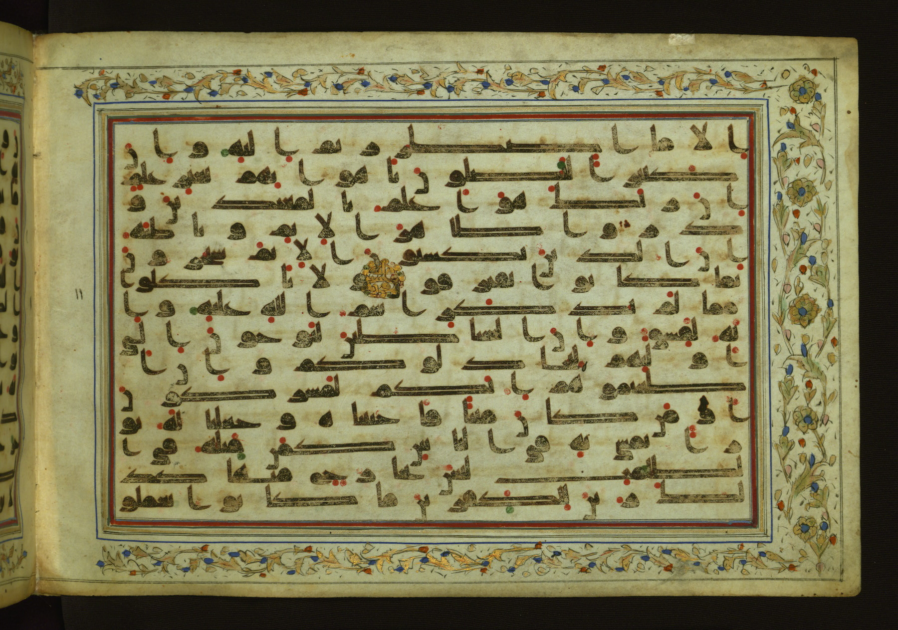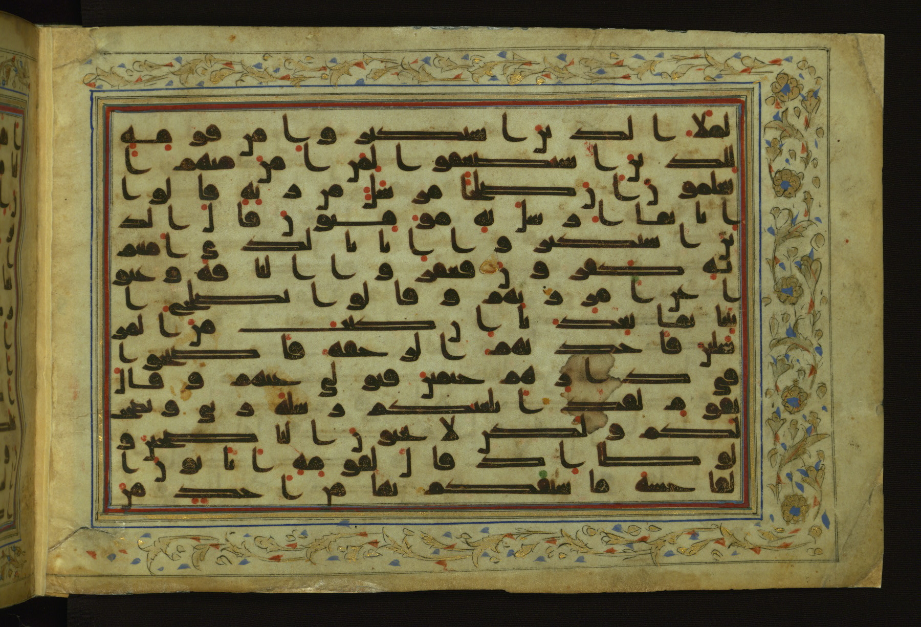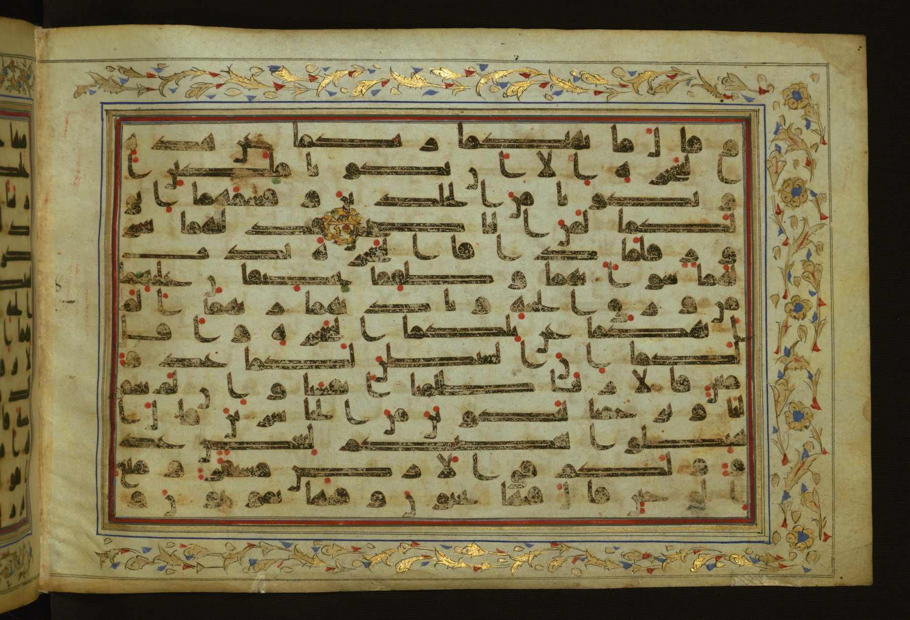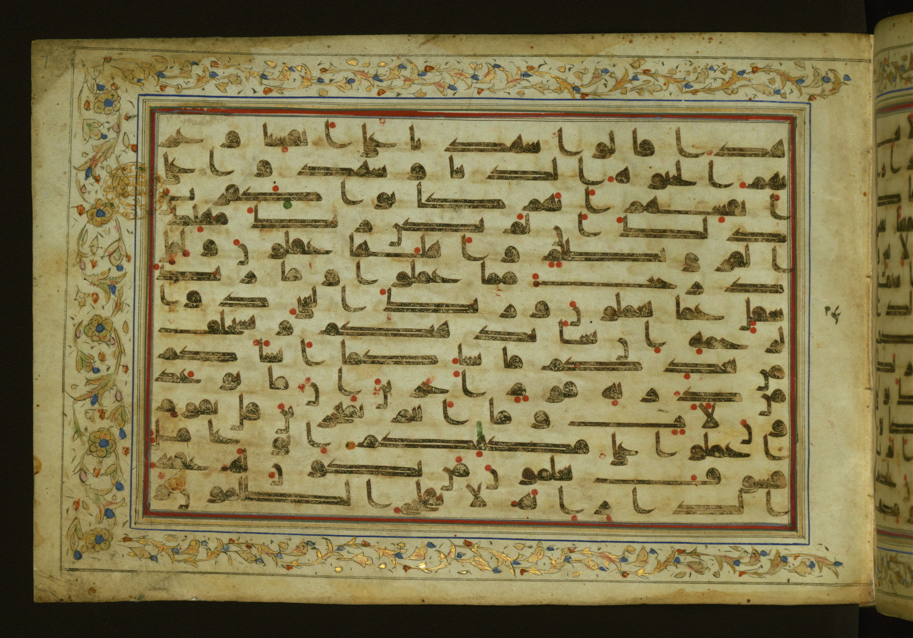 This horizontal-format manuscript on parchment is an illuminated fragment of the Qur'an, containing portions of chapters 4 (Sūrat al-nisāʾ), 6 (Sūrat al-anʿām), 7 (Sūrat al-aʿrāf), and 10 (Sūrat Yūnus). The fragment probably dates to the third century AH / ninth CE. The text is written in an Early Abbasid (Kufic) script in dark brown ink and vocalized with red and green dots. Verse markers in the shape of a stylized letter hā' and rosettes indicate groups of five and ten verses. The text is framed by later red, blue, and gold framing lines and a polychrome and gold floral border. The black blind-tooled leather binding with central lobed, pointed oval and pendants is attributable to the thirteenth century AH / nineteenth CE.