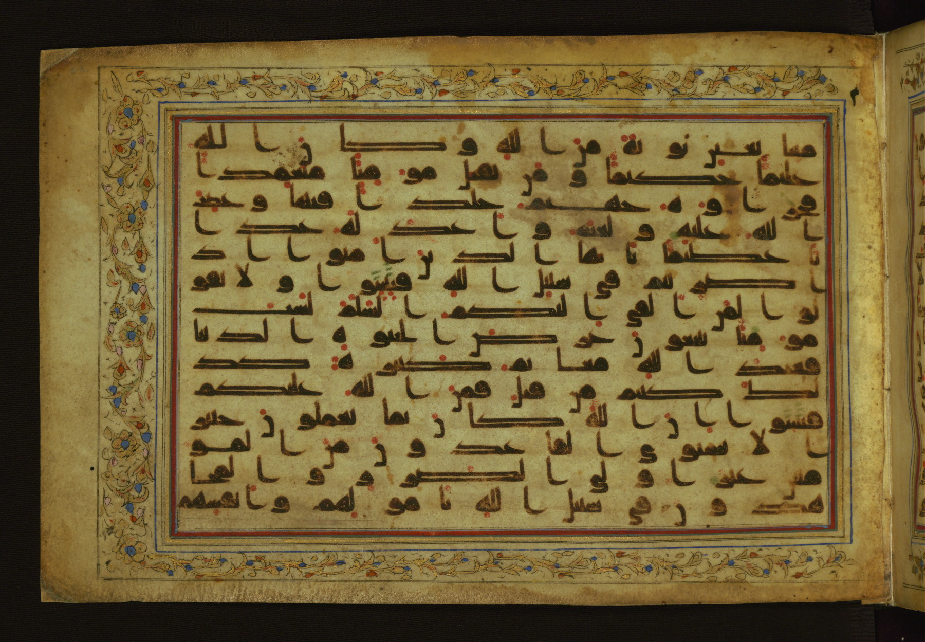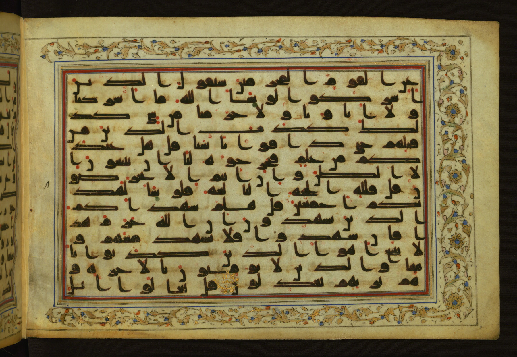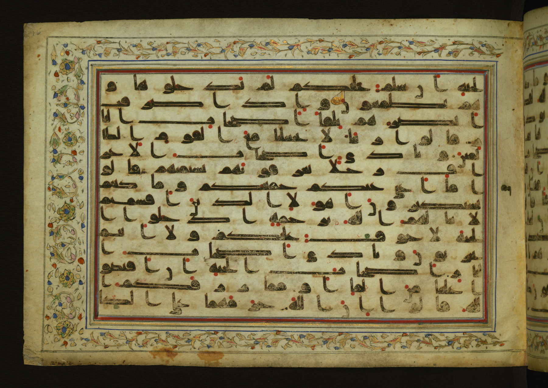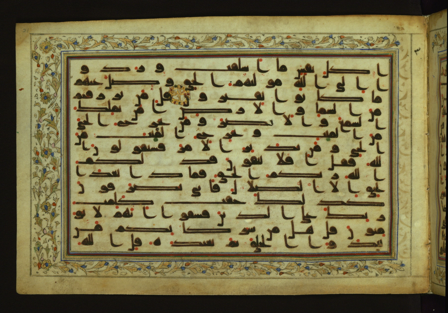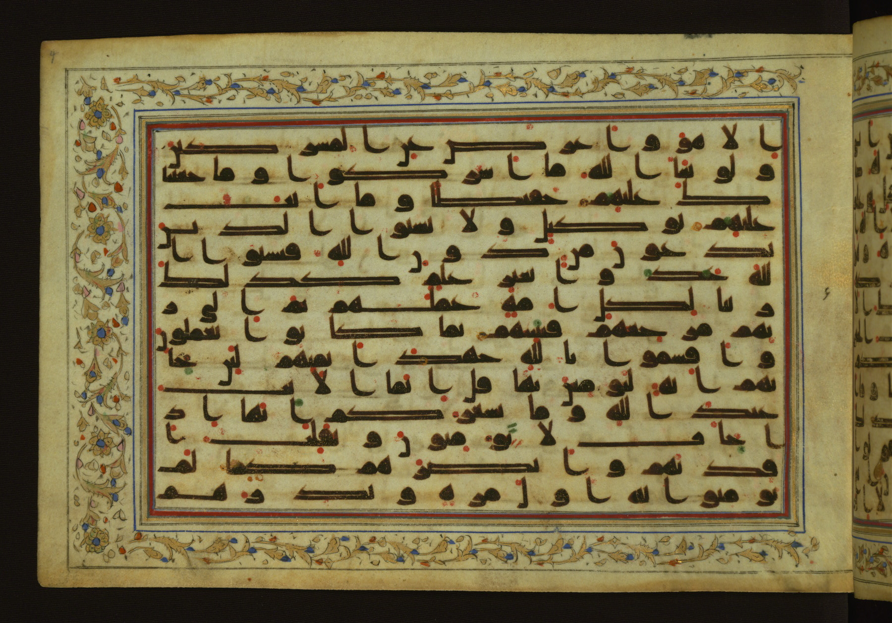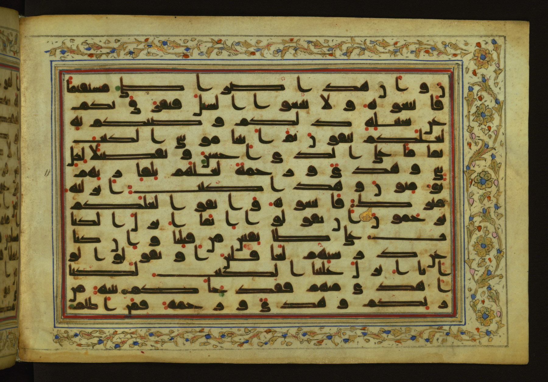 This horizontal-format manuscript on parchment is an illuminated fragment of the Qur'an, containing portions of chapters 4 (Sūrat al-nisāʾ), 6 (Sūrat al-anʿām), 7 (Sūrat al-aʿrāf), and 10 (Sūrat Yūnus). The fragment probably dates to the third century AH / ninth CE. The text is written in an Early Abbasid (Kufic) script in dark brown ink and vocalized with red and green dots. Verse markers in the shape of a stylized letter hā' and rosettes indicate groups of five and ten verses. The text is framed by later red, blue, and gold framing lines and a polychrome and gold floral border. The black blind-tooled leather binding with central lobed, pointed oval and pendants is attributable to the thirteenth century AH / nineteenth CE.
