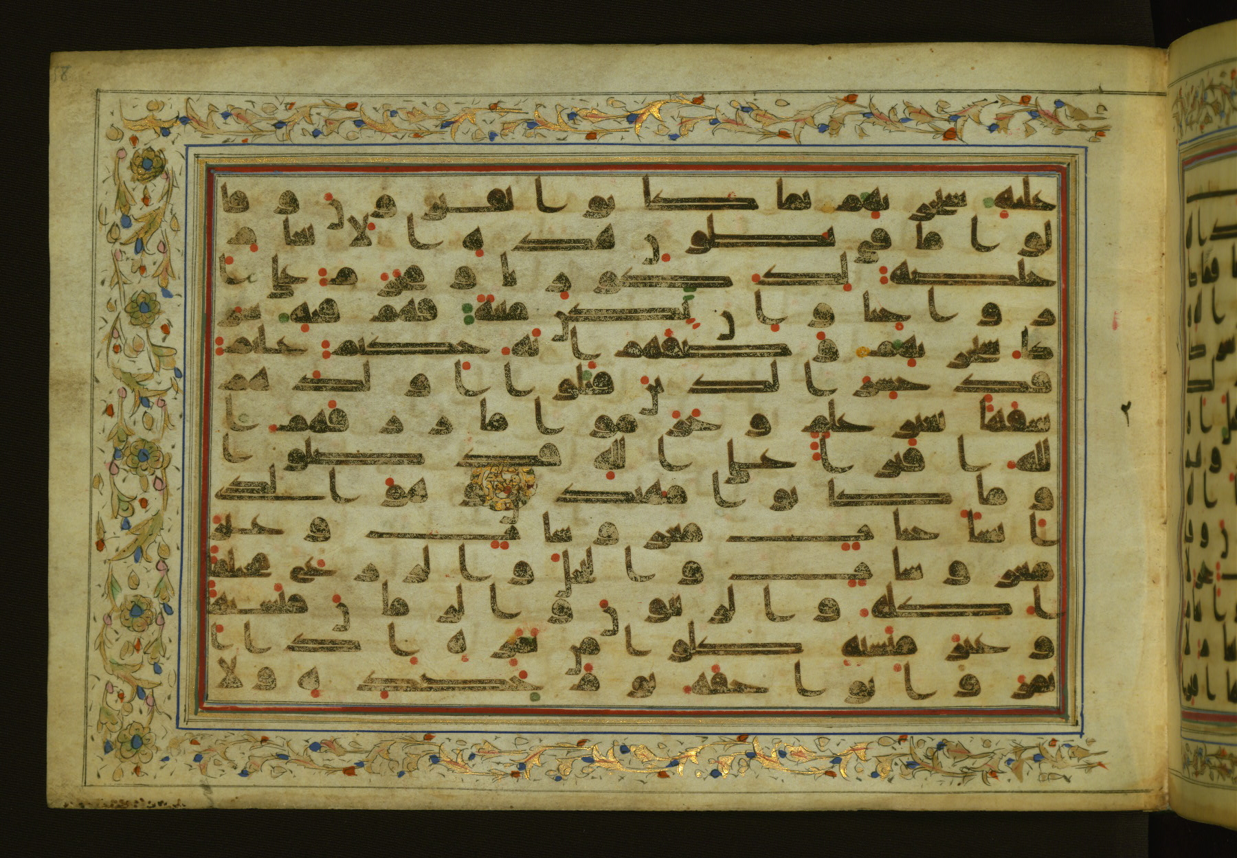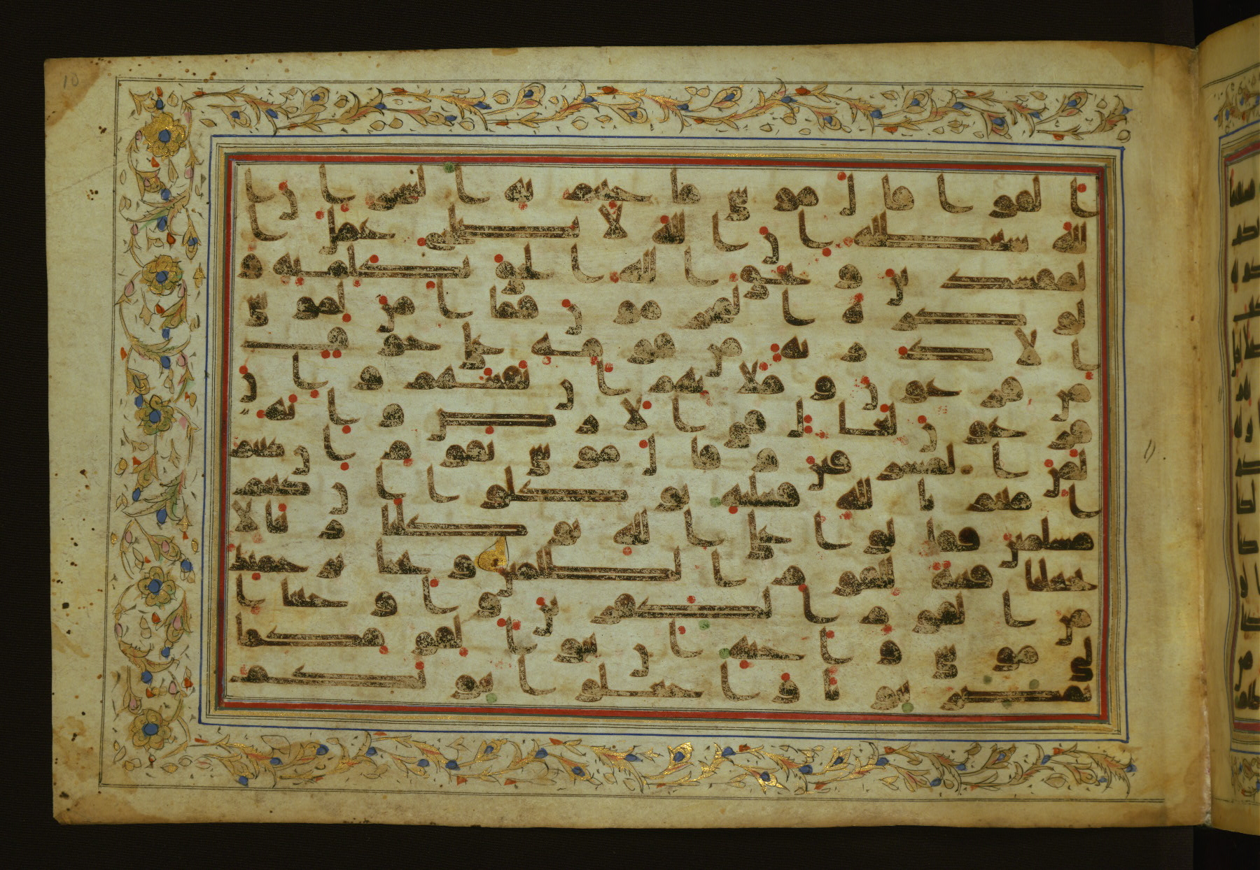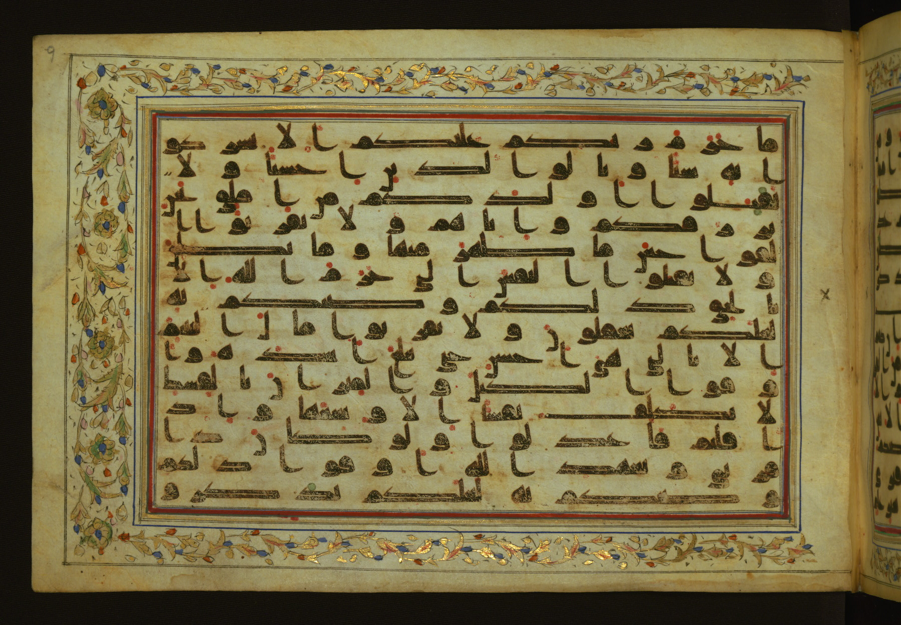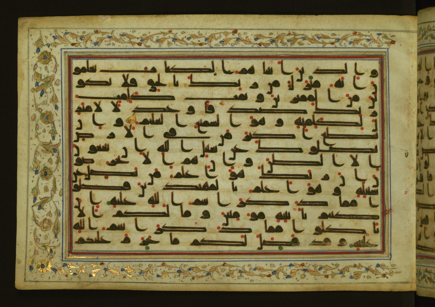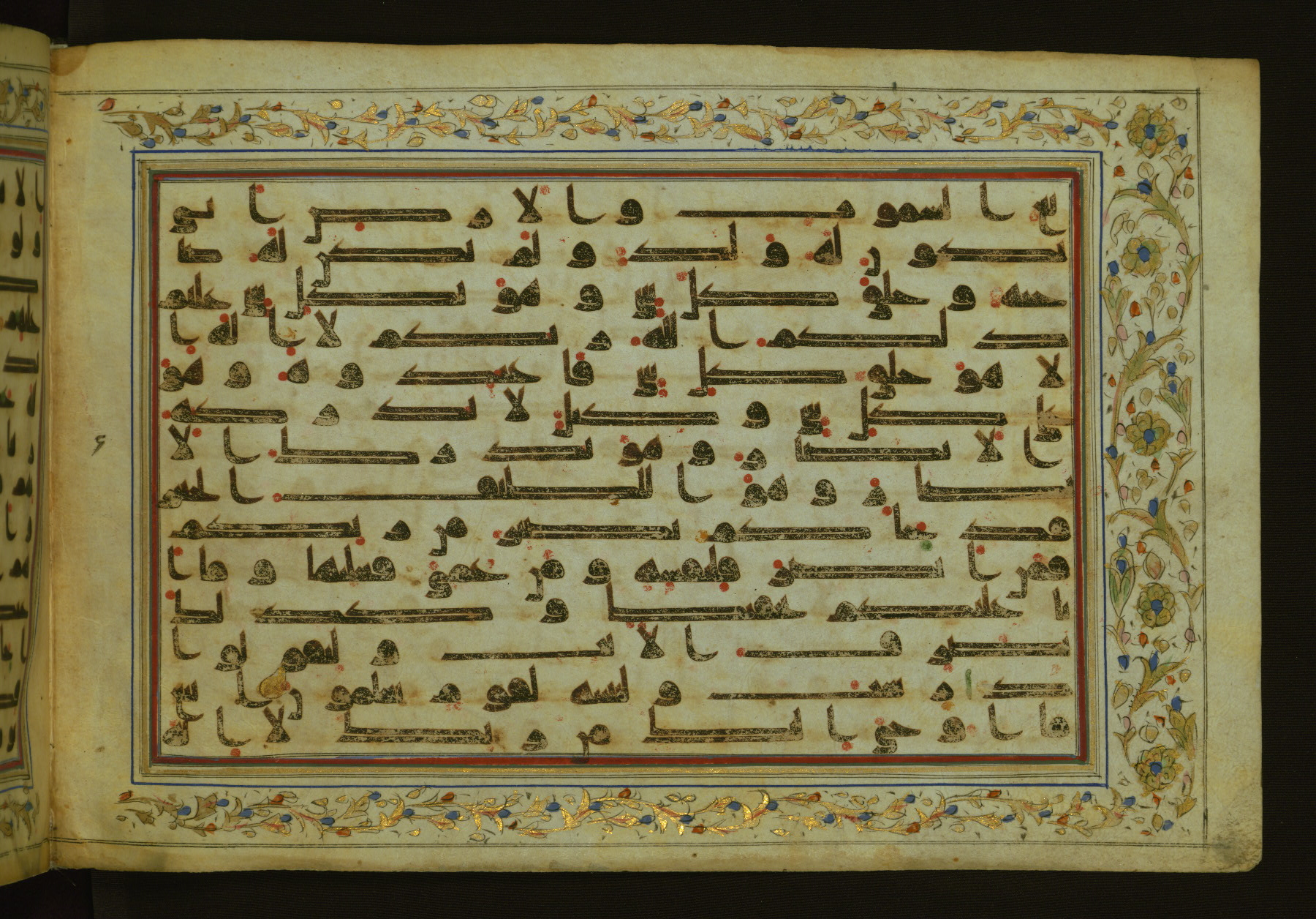 This horizontal-format manuscript on parchment is an illuminated fragment of the Qur'an, containing portions of chapters 4 (Sūrat al-nisāʾ), 6 (Sūrat al-anʿām), 7 (Sūrat al-aʿrāf), and 10 (Sūrat Yūnus). The fragment probably dates to the third century AH / ninth CE. The text is written in an Early Abbasid (Kufic) script in dark brown ink and vocalized with red and green dots. Verse markers in the shape of a stylized letter hā' and rosettes indicate groups of five and ten verses. The text is framed by later red, blue, and gold framing lines and a polychrome and gold floral border. The black blind-tooled leather binding with central lobed, pointed oval and pendants is attributable to the thirteenth century AH / nineteenth CE.