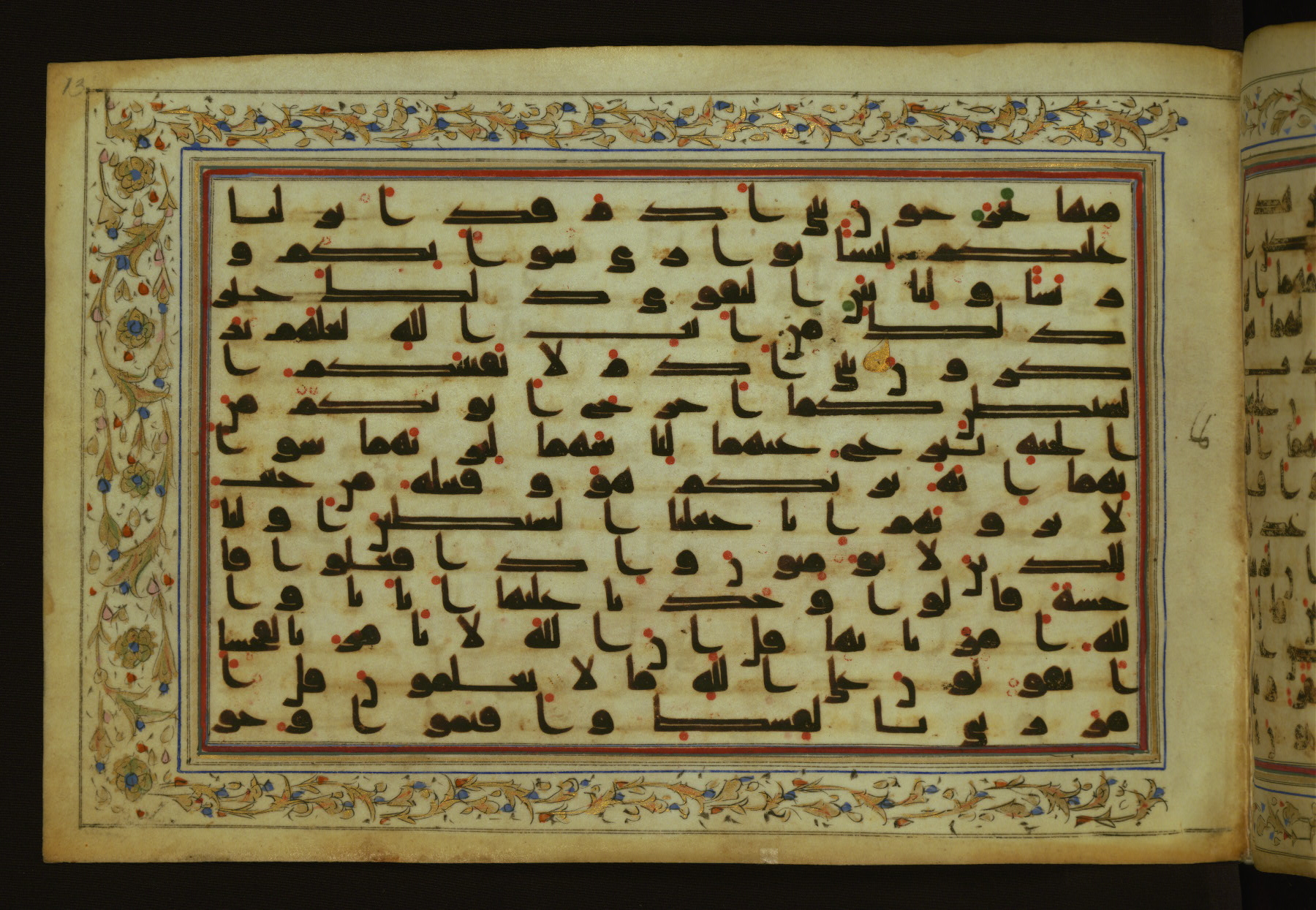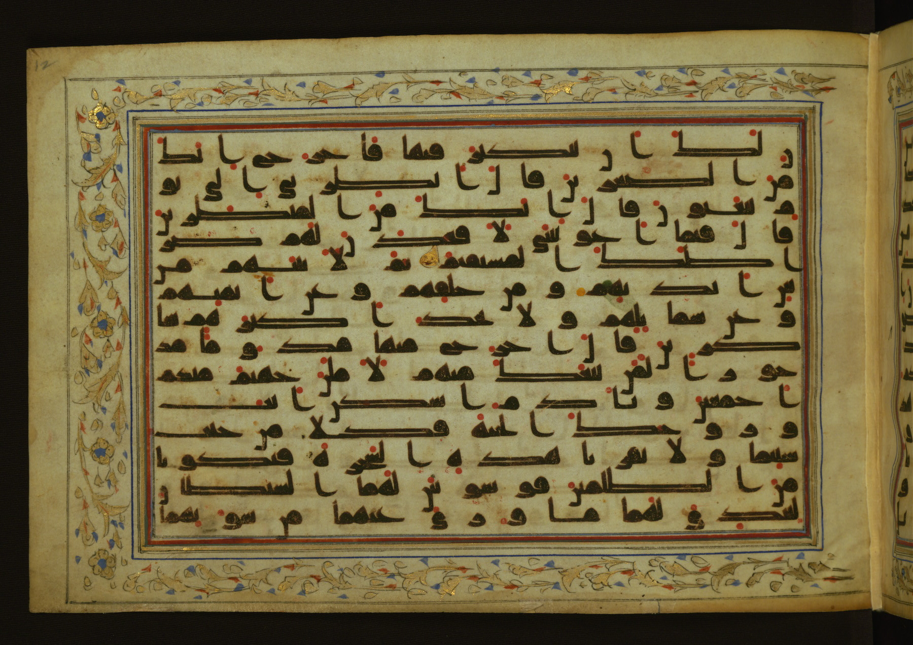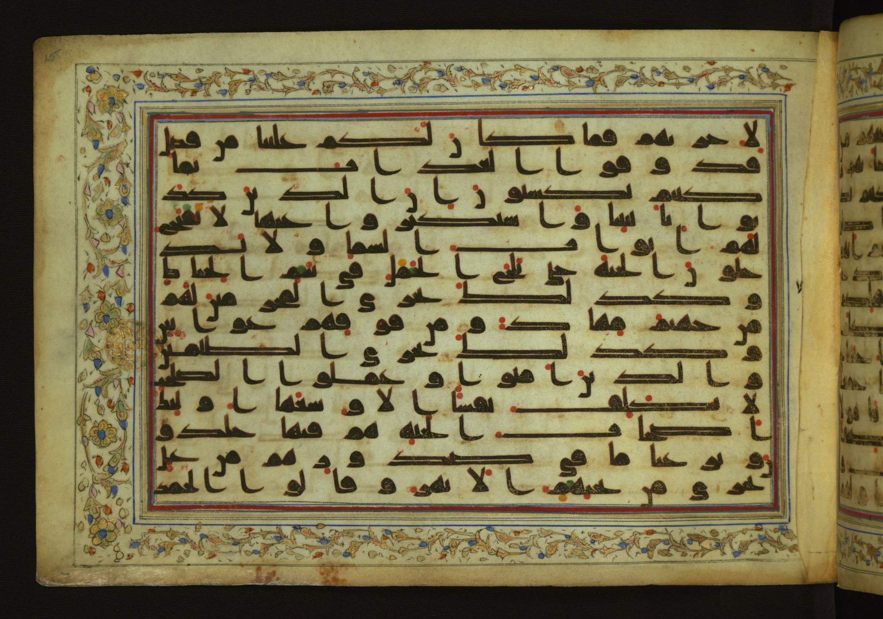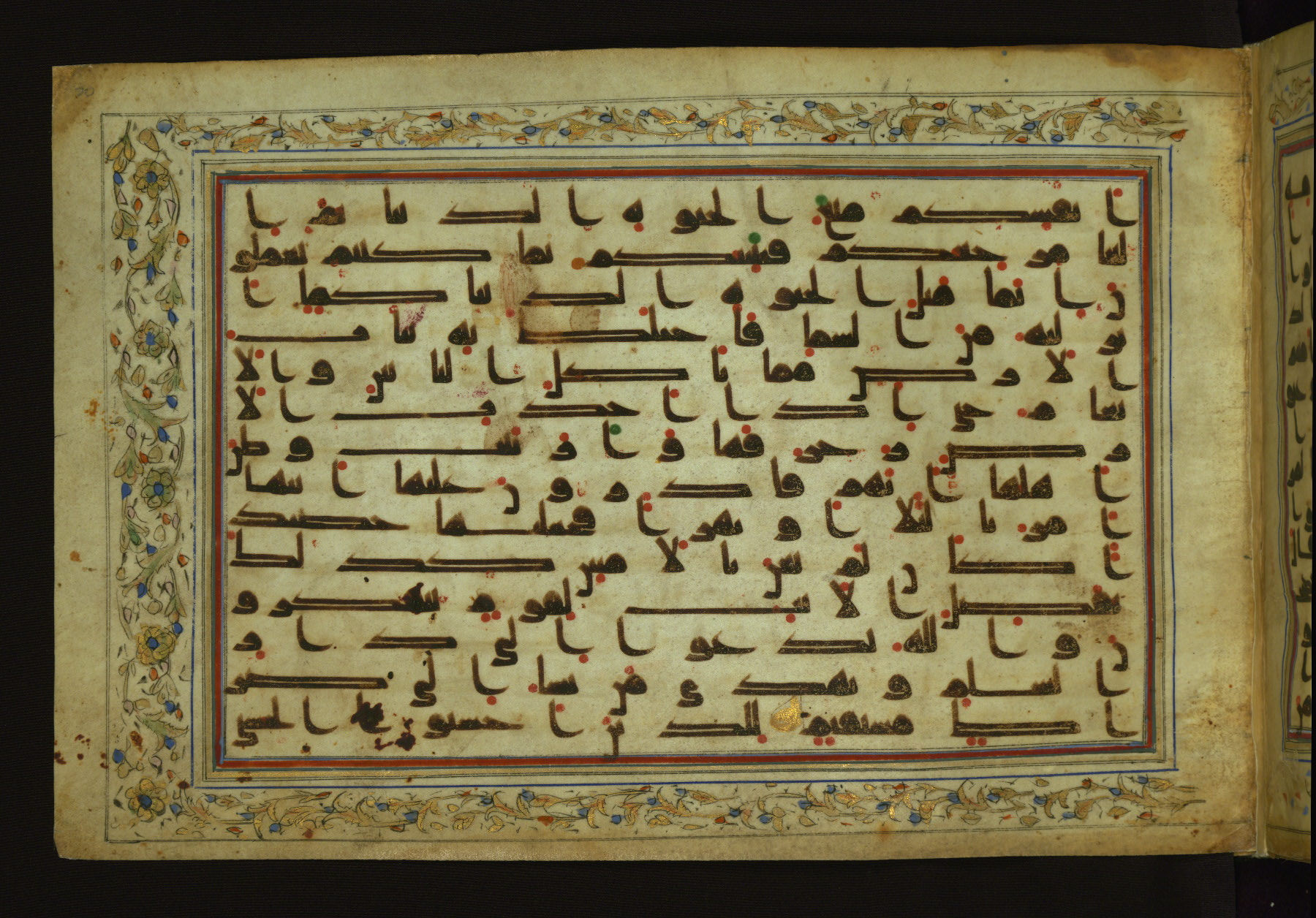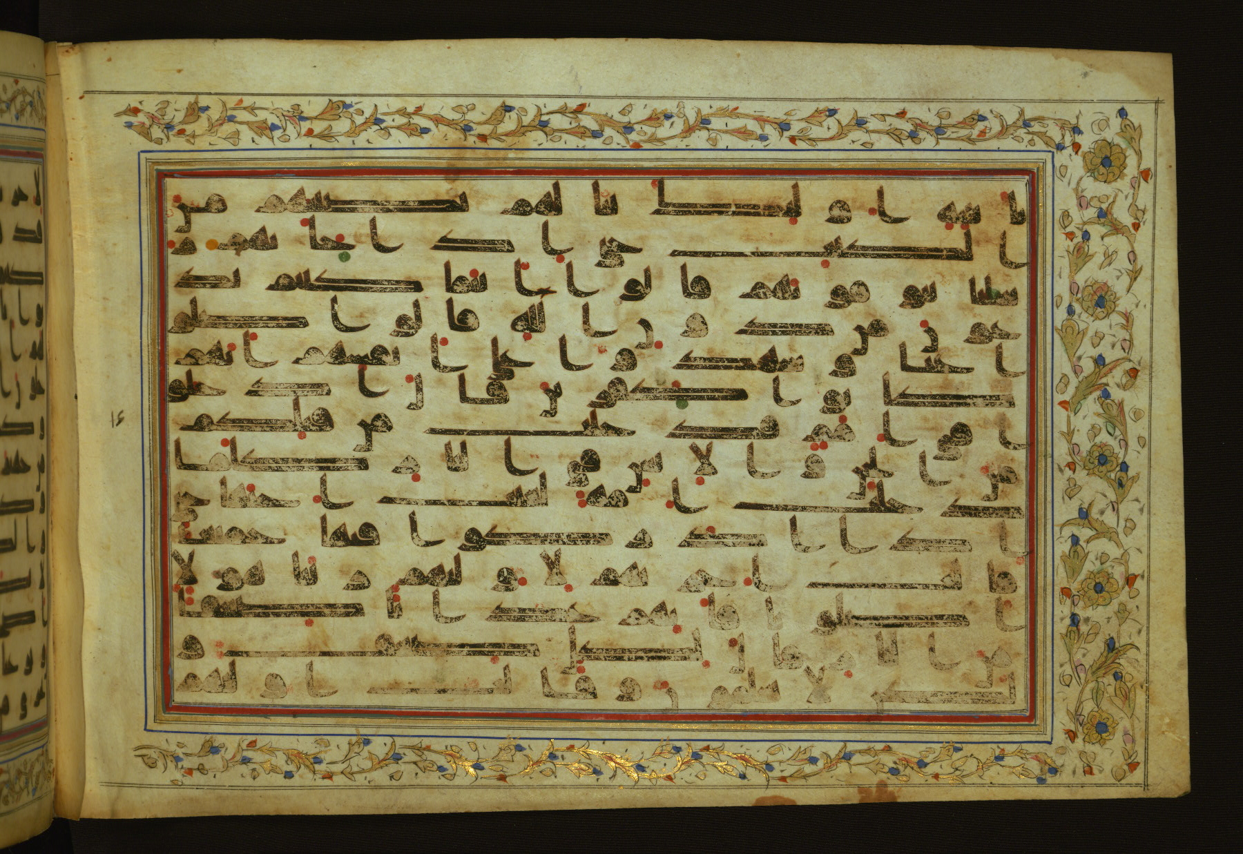 This horizontal-format manuscript on parchment is an illuminated fragment of the Qur'an, containing portions of chapters 4 (Sūrat al-nisāʾ), 6 (Sūrat al-anʿām), 7 (Sūrat al-aʿrāf), and 10 (Sūrat Yūnus). The fragment probably dates to the third century AH / ninth CE. The text is written in an Early Abbasid (Kufic) script in dark brown ink and vocalized with red and green dots. Verse markers in the shape of a stylized letter hā' and rosettes indicate groups of five and ten verses. The text is framed by later red, blue, and gold framing lines and a polychrome and gold floral border. The black blind-tooled leather binding with central lobed, pointed oval and pendants is attributable to the thirteenth century AH / nineteenth CE.