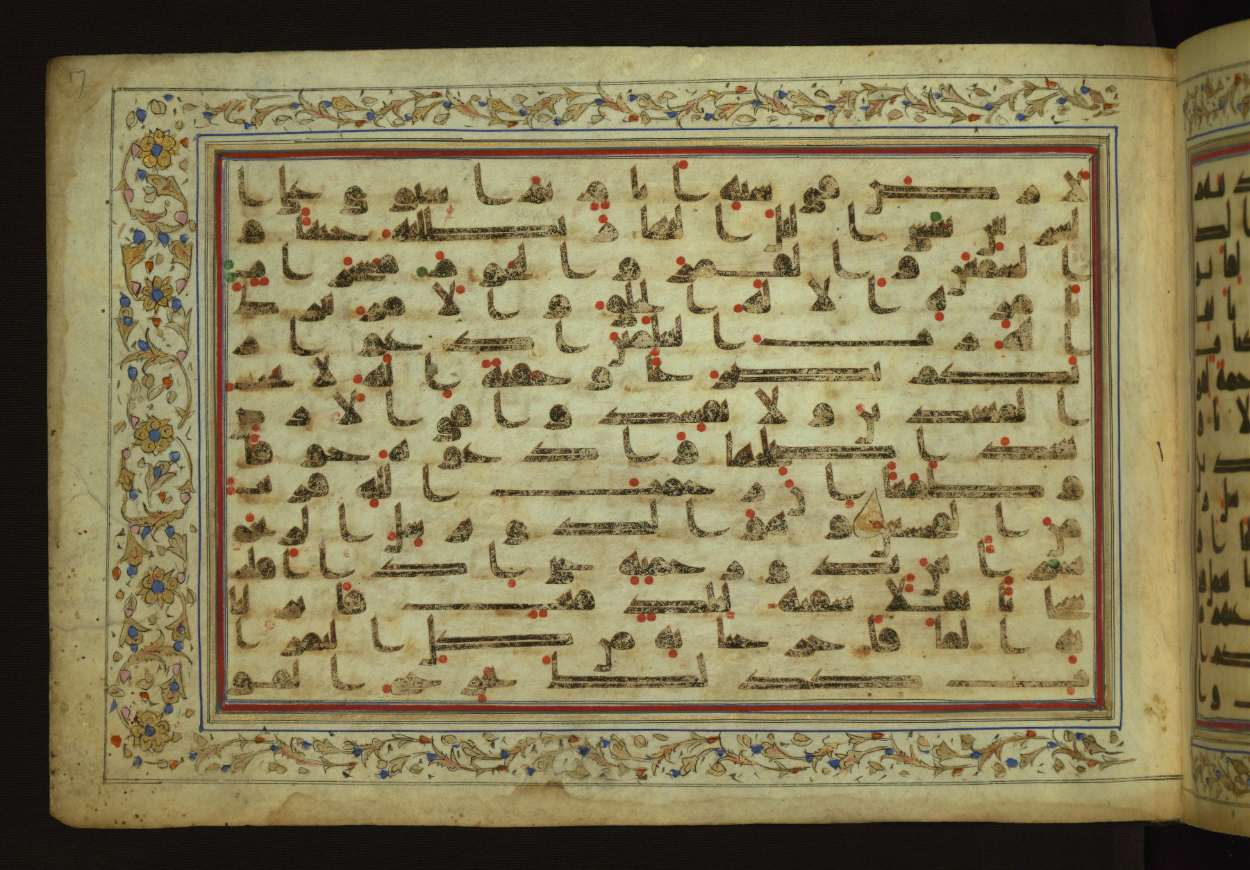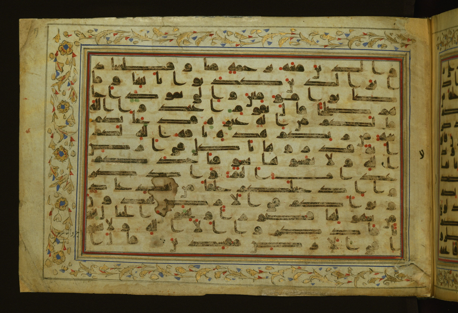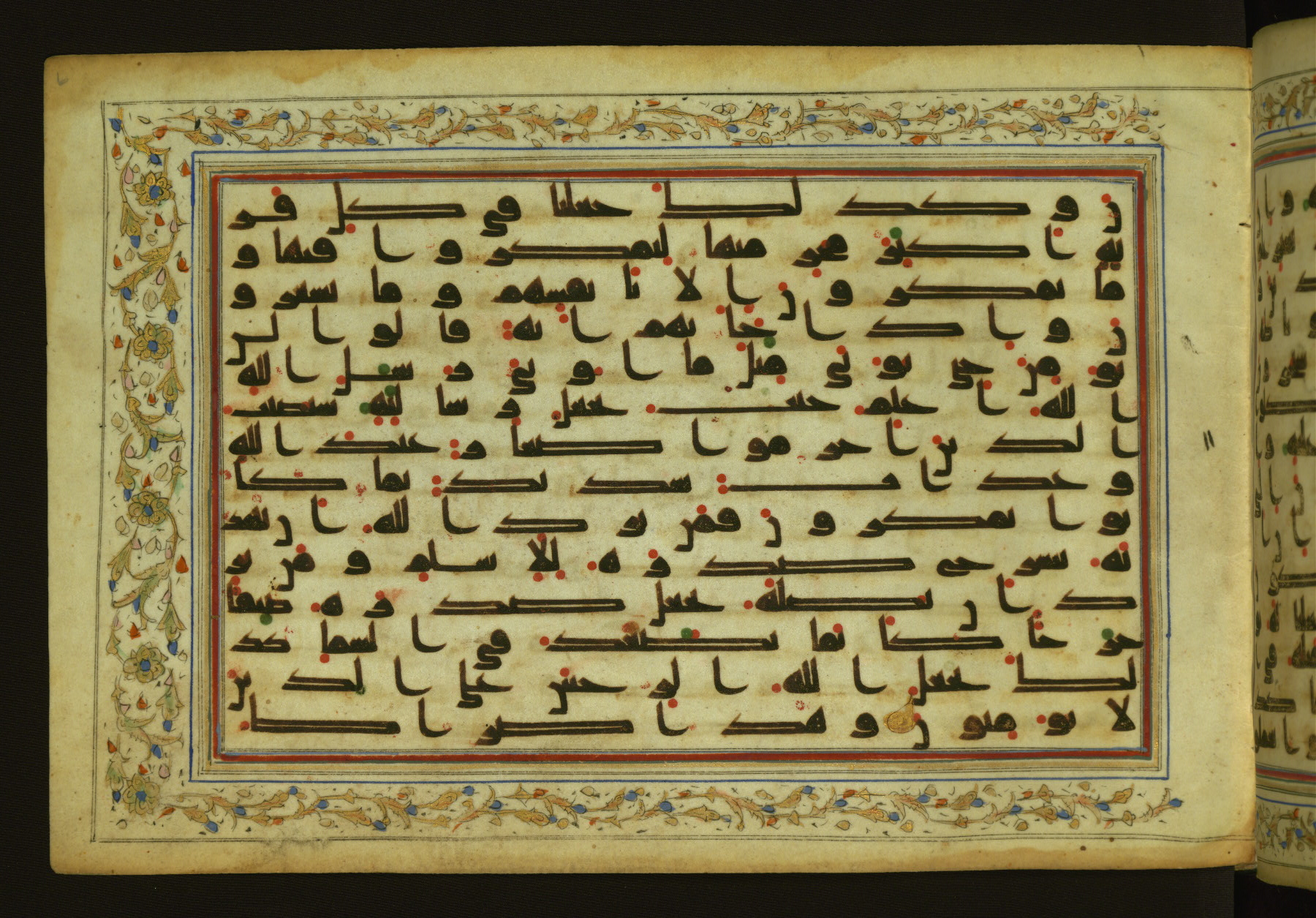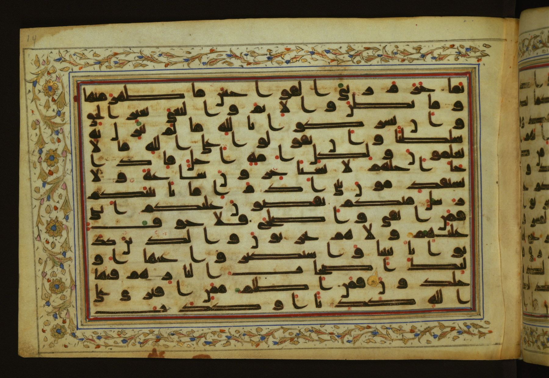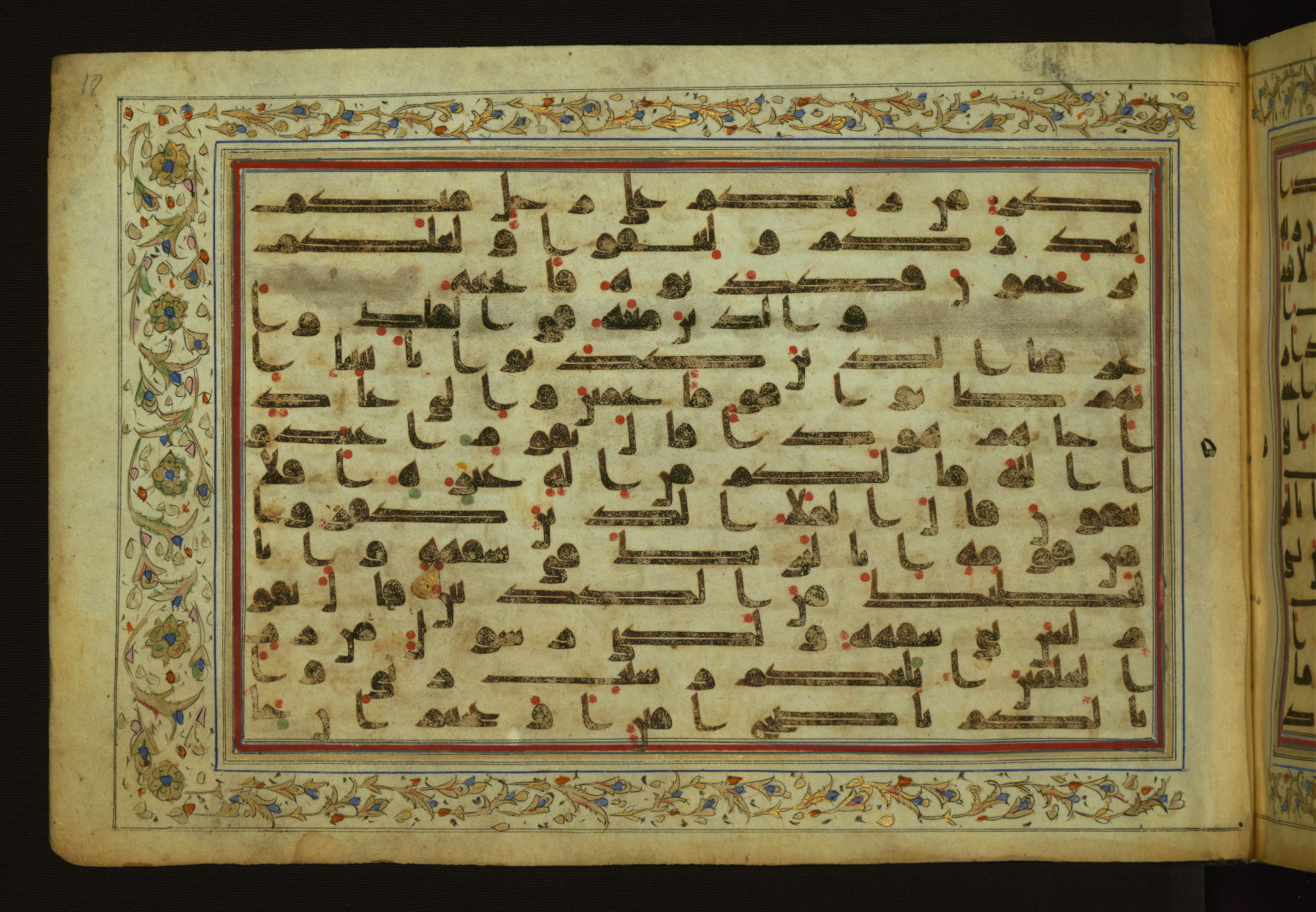 This horizontal-format manuscript on parchment is an illuminated fragment of the Qur'an, containing portions of chapters 4 (Sūrat al-nisāʾ), 6 (Sūrat al-anʿām), 7 (Sūrat al-aʿrāf), and 10 (Sūrat Yūnus). The fragment probably dates to the third century AH / ninth CE. The text is written in an Early Abbasid (Kufic) script in dark brown ink and vocalized with red and green dots. Verse markers in the shape of a stylized letter hā' and rosettes indicate groups of five and ten verses. The text is framed by later red, blue, and gold framing lines and a polychrome and gold floral border. The black blind-tooled leather binding with central lobed, pointed oval and pendants is attributable to the thirteenth century AH / nineteenth CE.