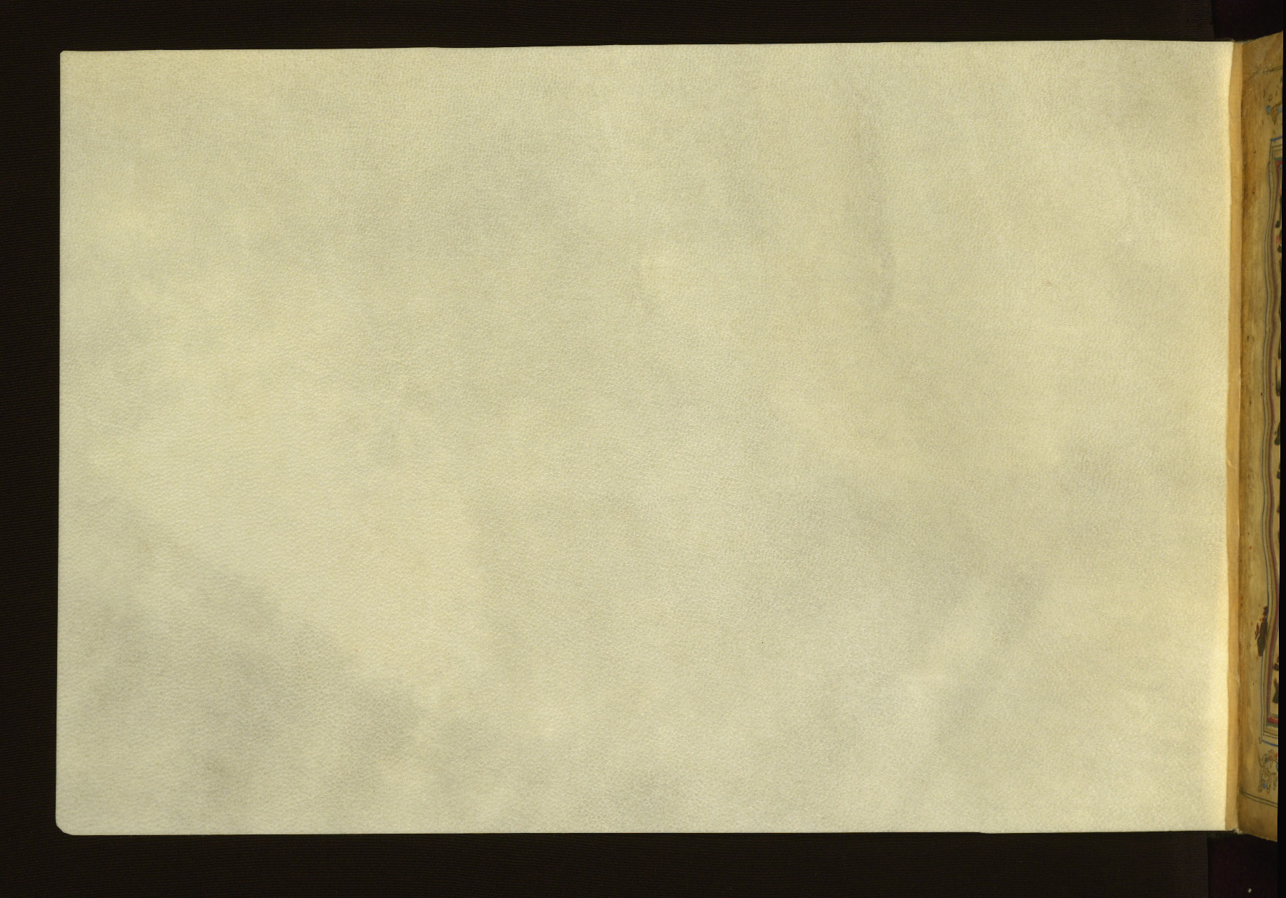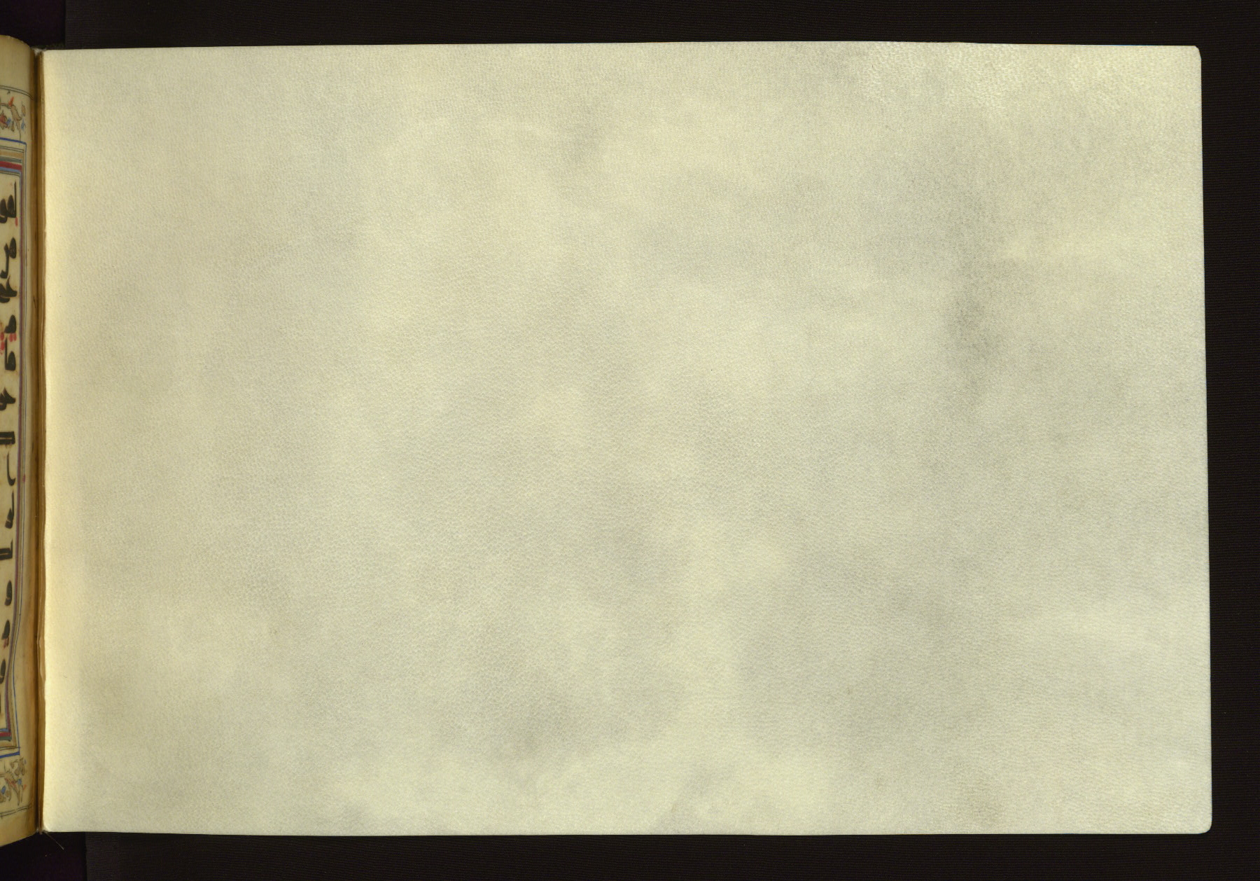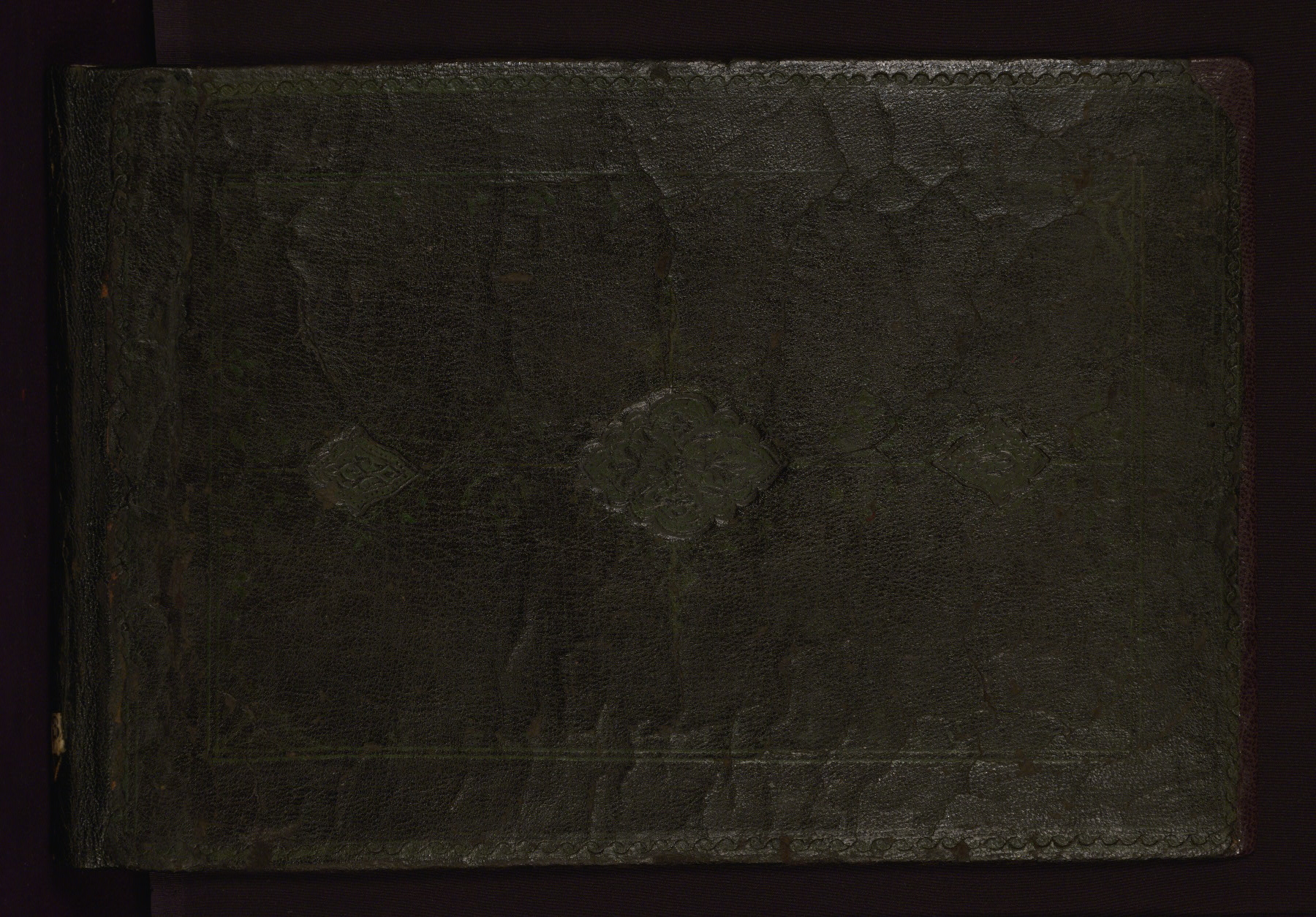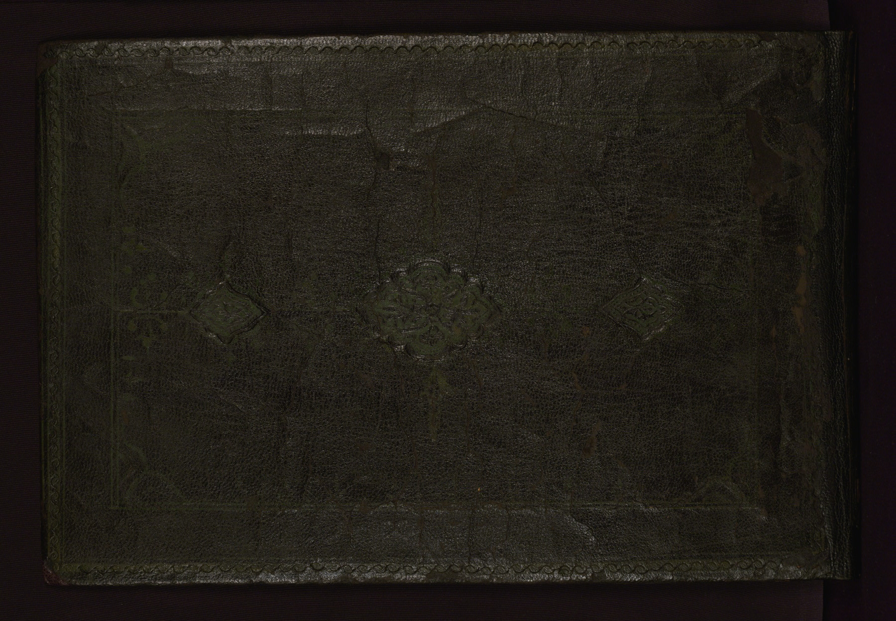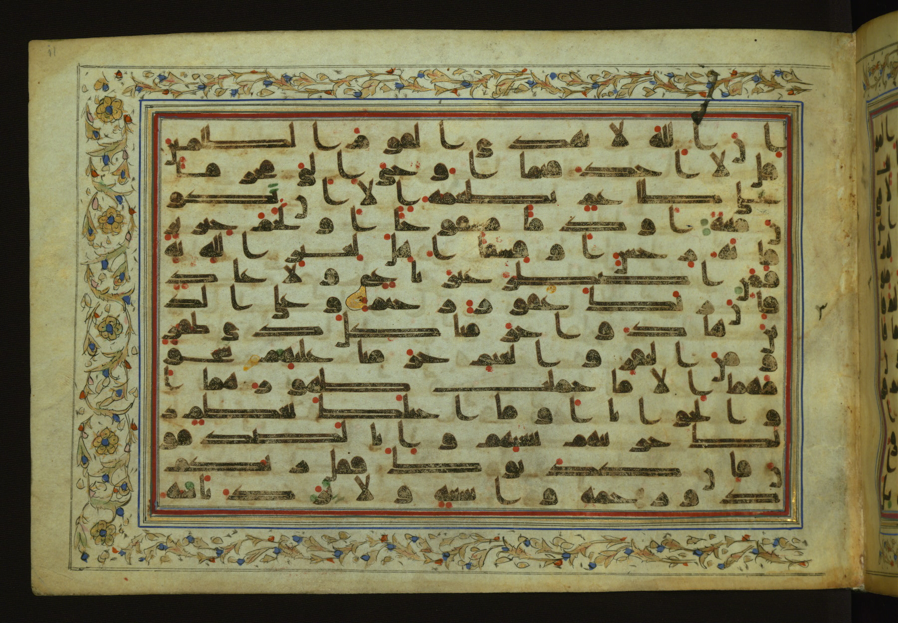 This horizontal-format manuscript on parchment is an illuminated fragment of the Qur'an, containing portions of chapters 4 (Sūrat al-nisāʾ), 6 (Sūrat al-anʿām), 7 (Sūrat al-aʿrāf), and 10 (Sūrat Yūnus). The fragment probably dates to the third century AH / ninth CE. The text is written in an Early Abbasid (Kufic) script in dark brown ink and vocalized with red and green dots. Verse markers in the shape of a stylized letter hā' and rosettes indicate groups of five and ten verses. The text is framed by later red, blue, and gold framing lines and a polychrome and gold floral border. The black blind-tooled leather binding with central lobed, pointed oval and pendants is attributable to the thirteenth century AH / nineteenth CE.