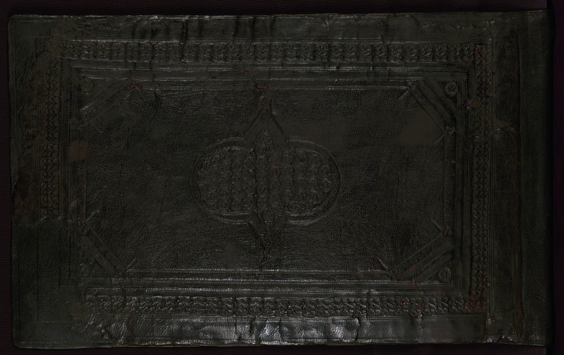 Probably fifth century AH / eleventh CE; blind-tooled black goatskin (without flap); central medallion defined by two round lobes and two triangular projections; overall application of a small tool with a six-pointed star; identical tool applied to cornerpieces; inner frame defined by a tooled decoration of stylized leaves; central form in which multiple small circles enclose the six-pointed star; cornerpieces; outer frame