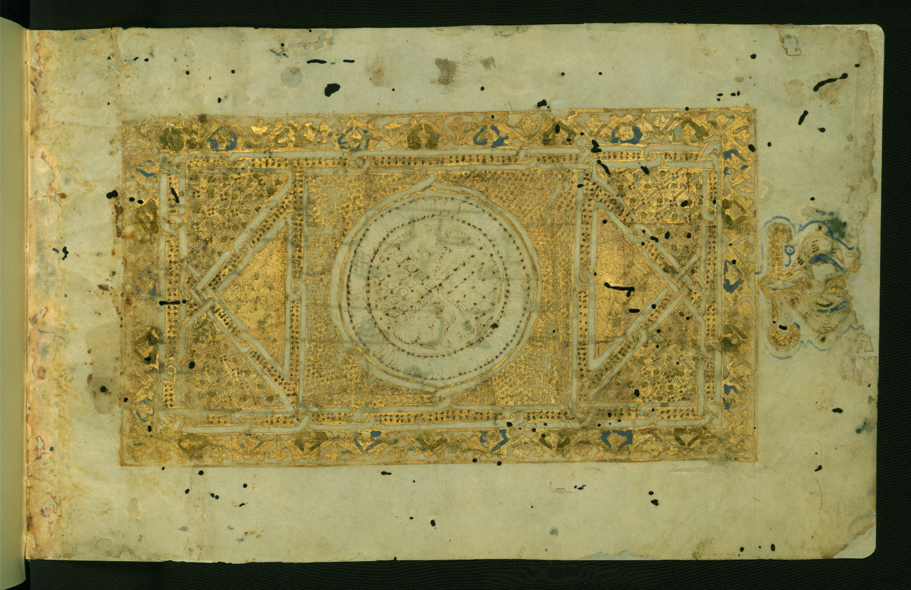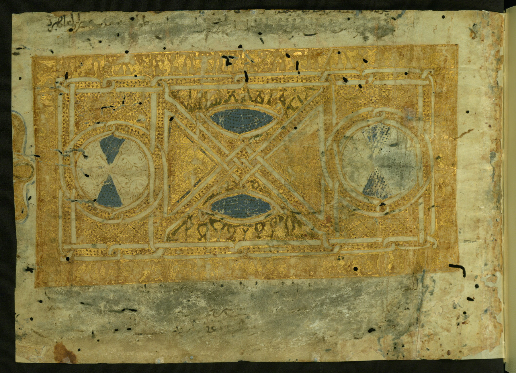 - Label: This full-page illuminated frontispiece with geometrical decoration in gold and blue has a marginal palmette at left which is cropped.