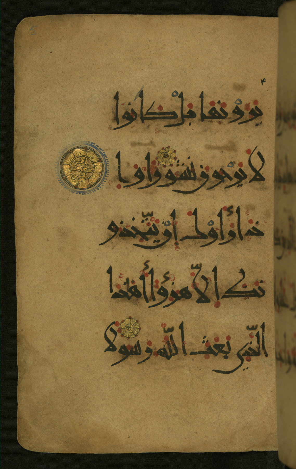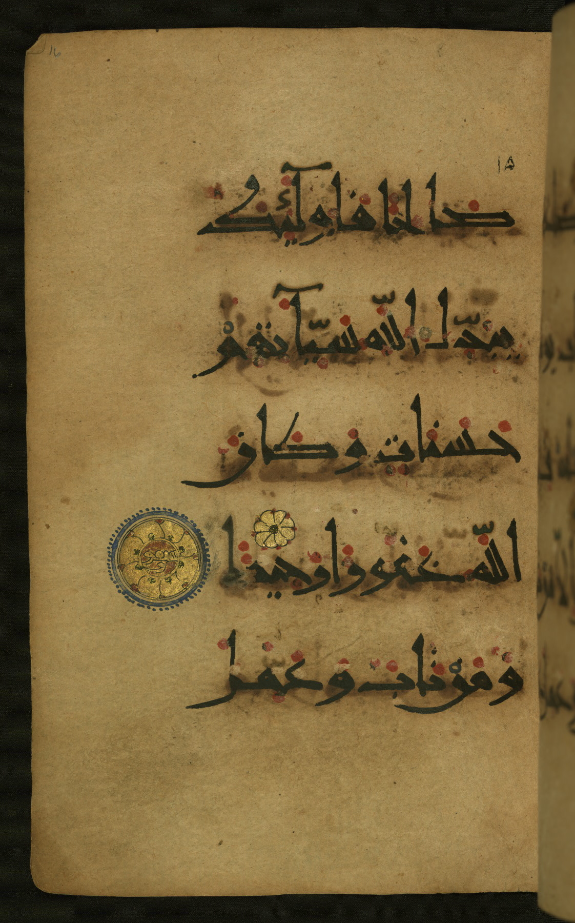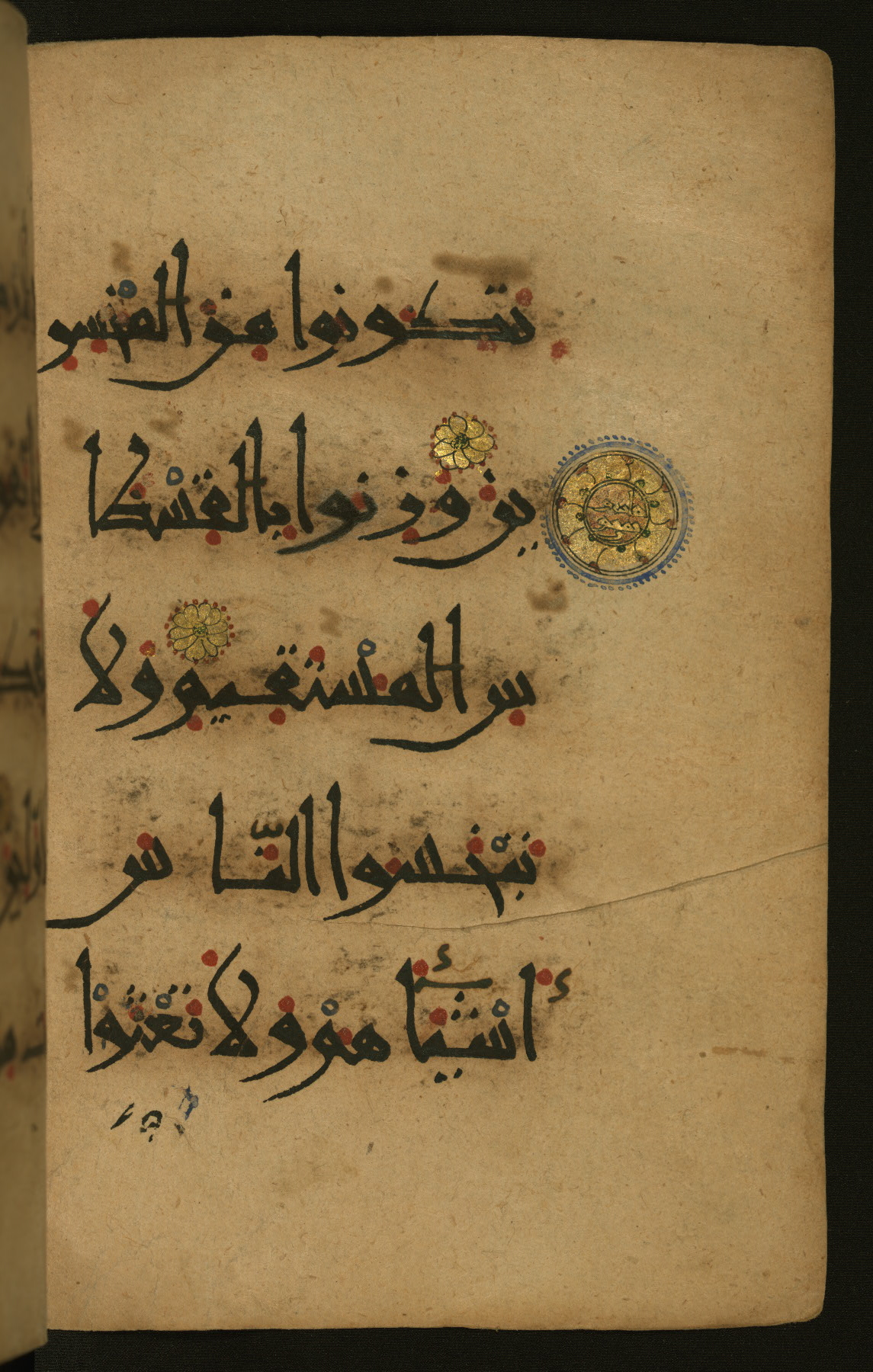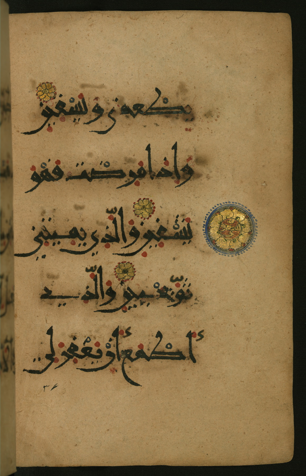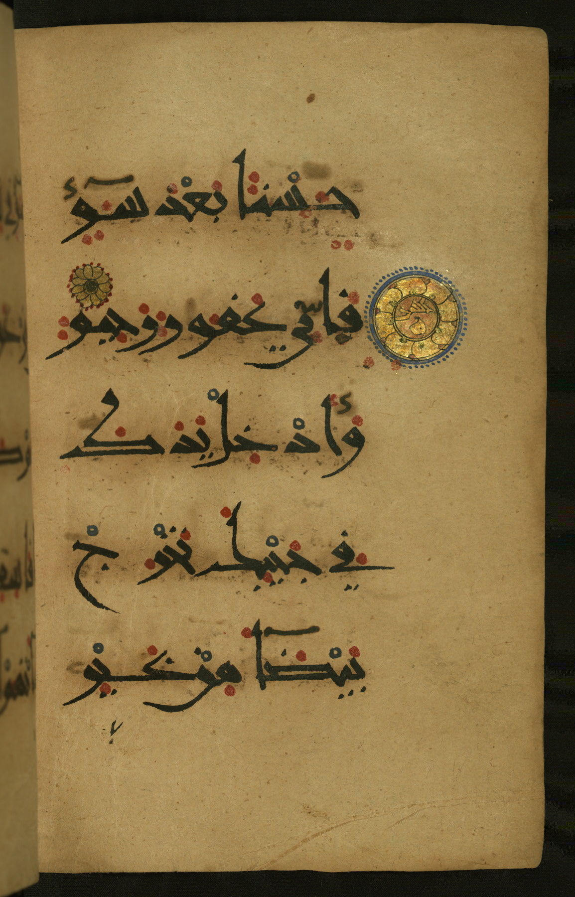 This illuminated fragment of the Qur'an contains chapter 25 (Sūrat al-furqān), verses 21-32 and 39-78; chapter 26 (Sūrat al-shuʿarāʾ); and chapter 27 (Sūrat al-naml), up to verse 40. It probably dates to the late fifth century AH / eleventh CE or early sixth century AH / twelfth CE. The text is written in the New Abbasid (broken cursive) style in black ink and is vocalized with red dots and blue circles, the latter for sukūn. Single verses are separated by illuminated rosettes, and groups of five verses are indicated by the letter hāʾ in the form of a teardrop in the margins. Marginal medallions are also used for larger verse groups. The black leather binding is modern.