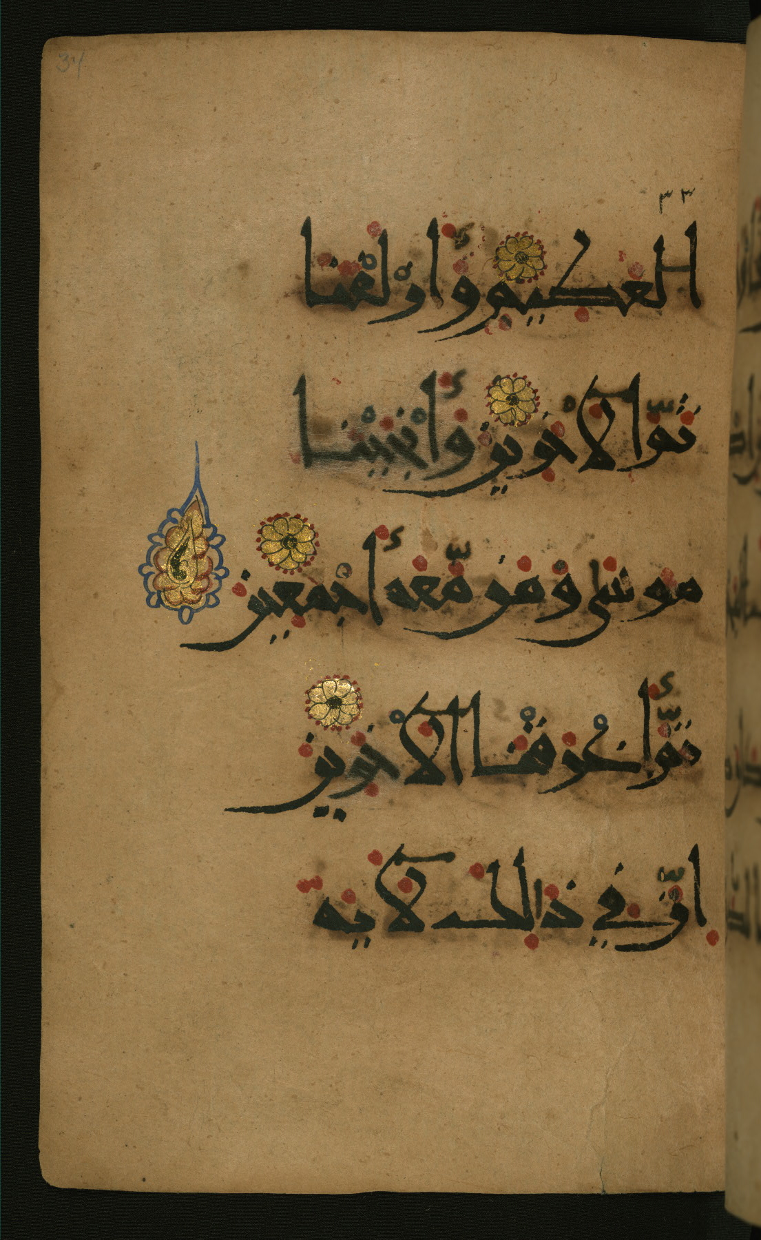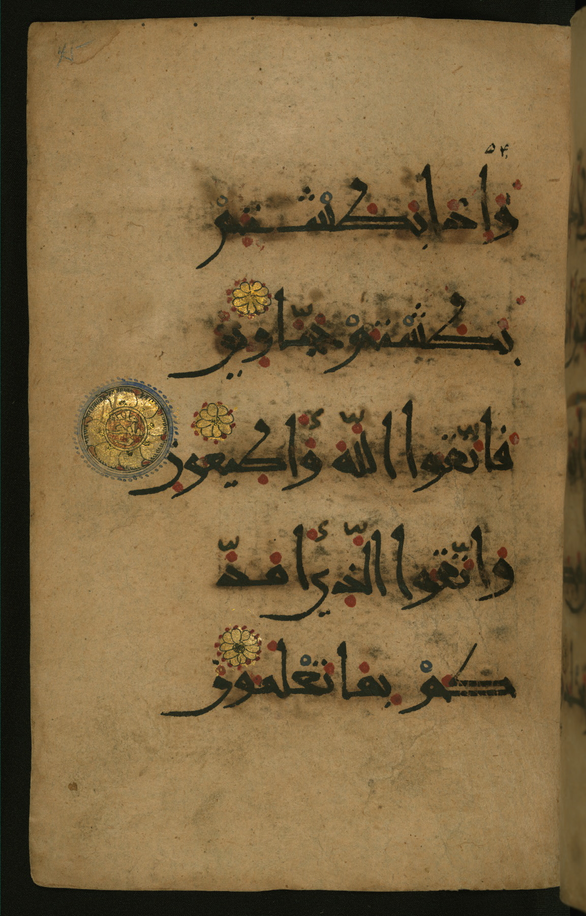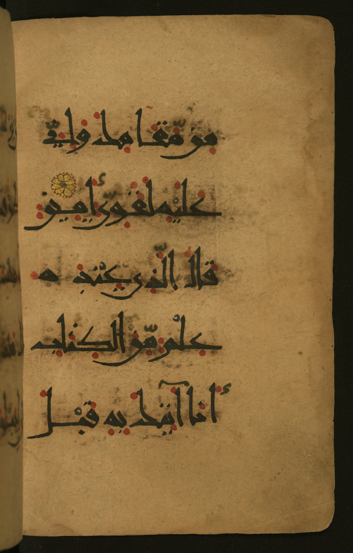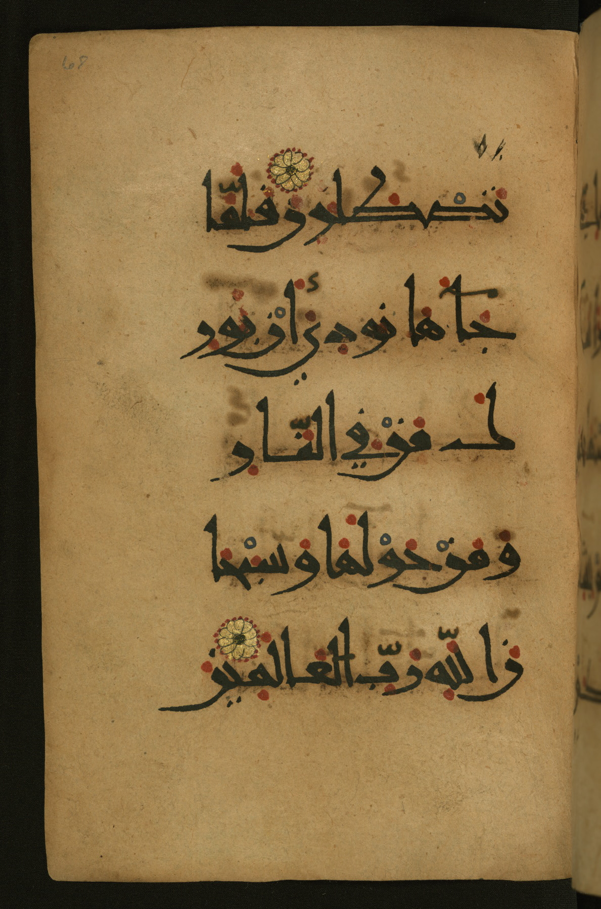 This illuminated fragment of the Qur'an contains chapter 25 (Sūrat al-furqān), verses 21-32 and 39-78; chapter 26 (Sūrat al-shuʿarāʾ); and chapter 27 (Sūrat al-naml), up to verse 40. It probably dates to the late fifth century AH / eleventh CE or early sixth century AH / twelfth CE. The text is written in the New Abbasid (broken cursive) style in black ink and is vocalized with red dots and blue circles, the latter for sukūn. Single verses are separated by illuminated rosettes, and groups of five verses are indicated by the letter hāʾ in the form of a teardrop in the margins. Marginal medallions are also used for larger verse groups. The black leather binding is modern.
