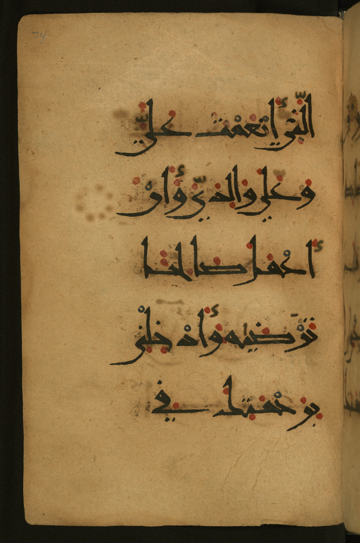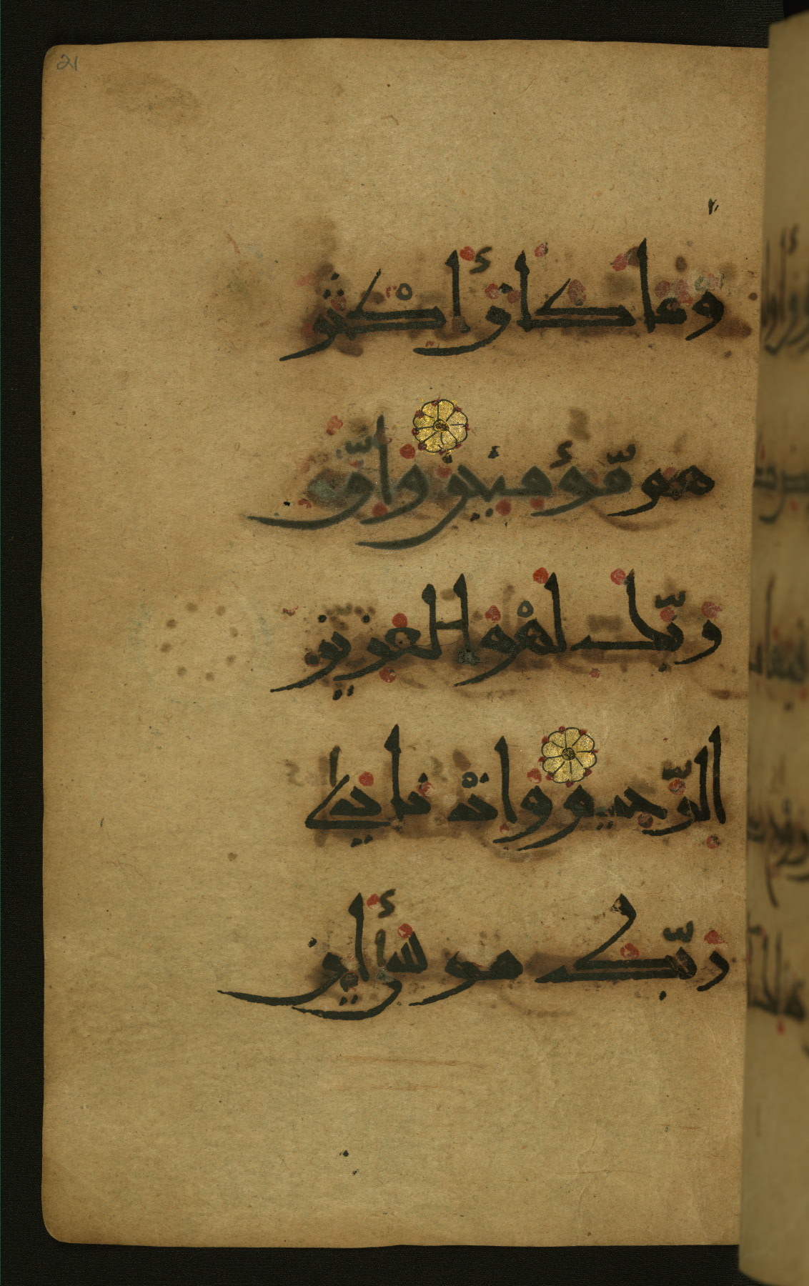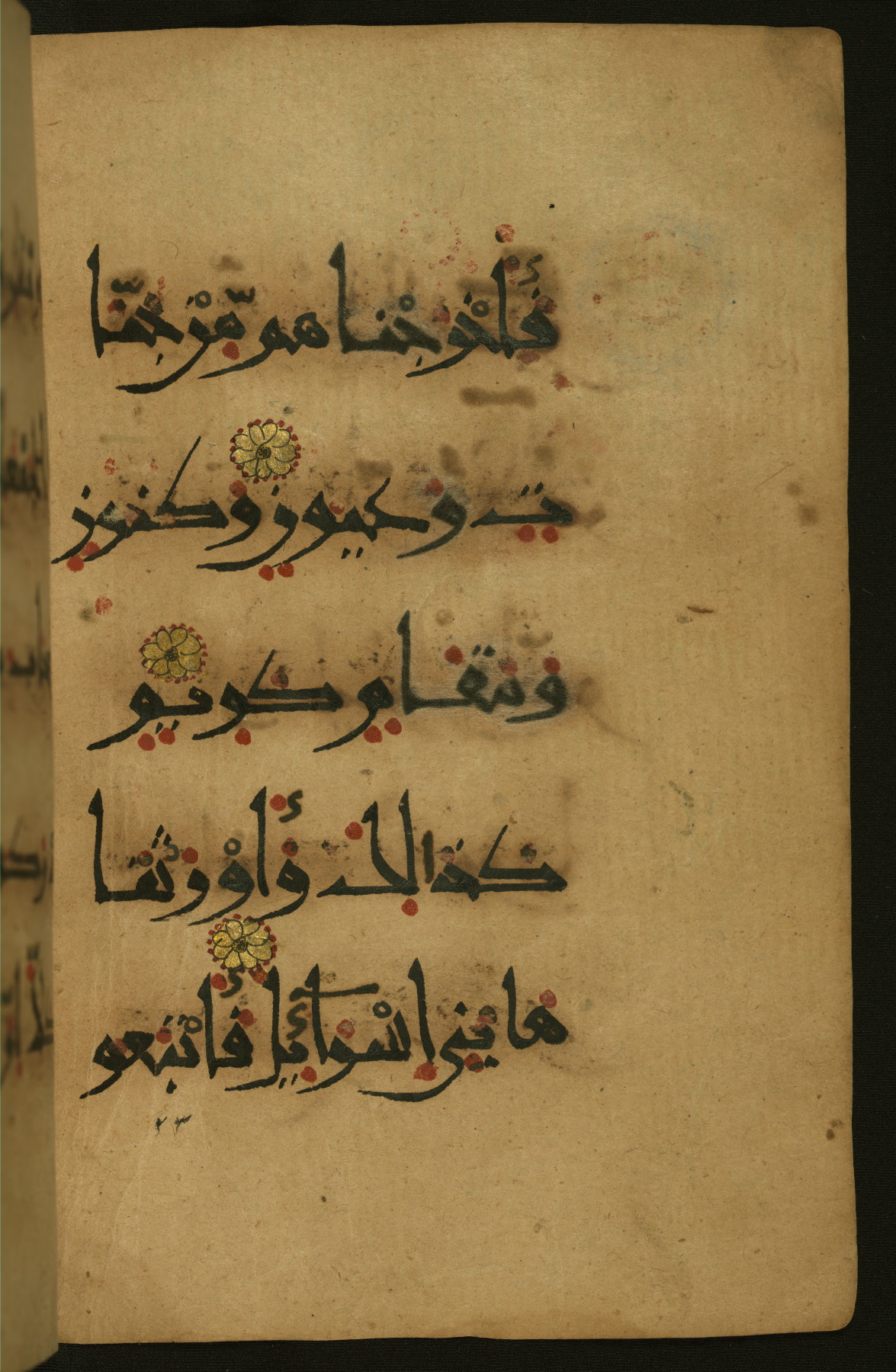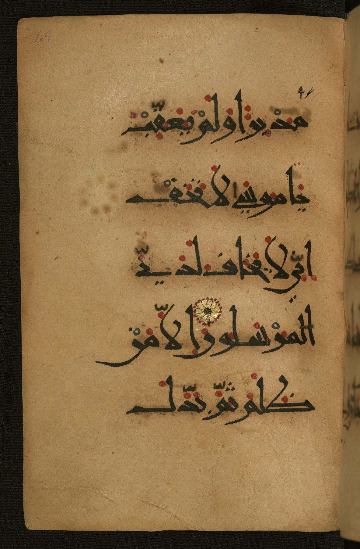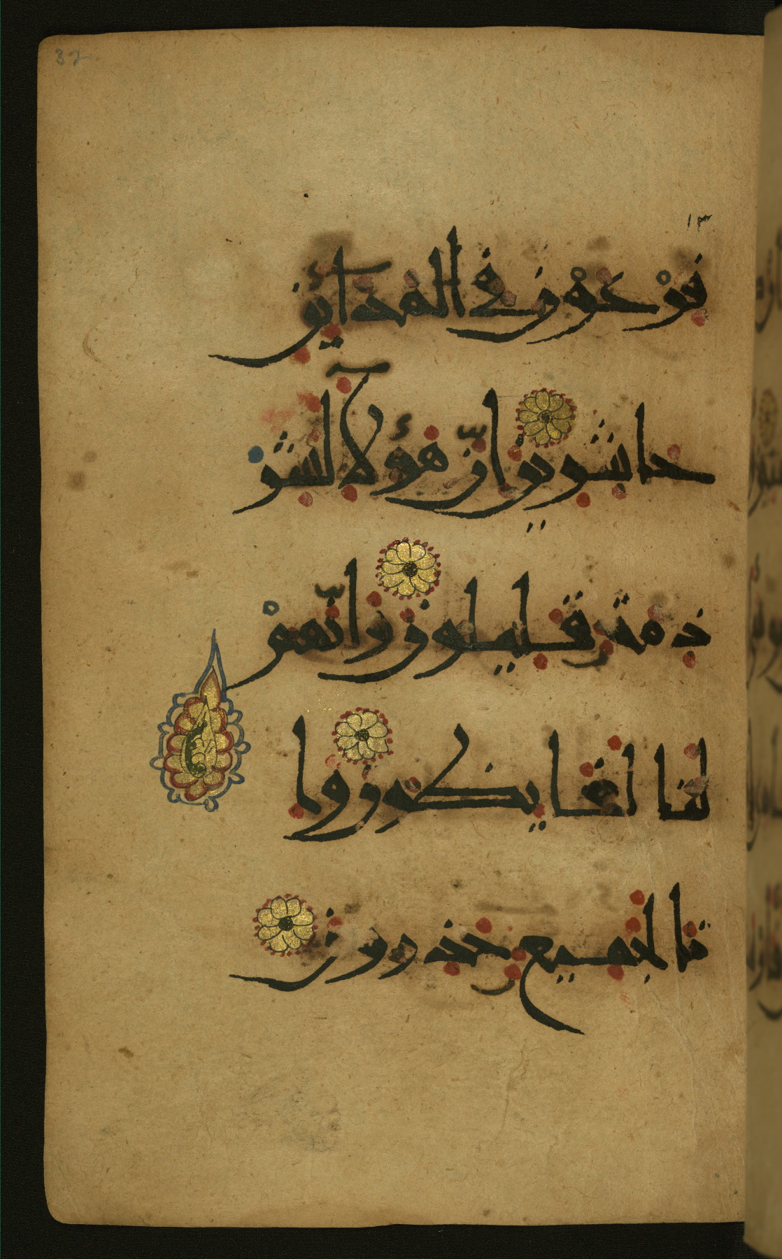 This illuminated fragment of the Qur'an contains chapter 25 (Sūrat al-furqān), verses 21-32 and 39-78; chapter 26 (Sūrat al-shuʿarāʾ); and chapter 27 (Sūrat al-naml), up to verse 40. It probably dates to the late fifth century AH / eleventh CE or early sixth century AH / twelfth CE. The text is written in the New Abbasid (broken cursive) style in black ink and is vocalized with red dots and blue circles, the latter for sukūn. Single verses are separated by illuminated rosettes, and groups of five verses are indicated by the letter hāʾ in the form of a teardrop in the margins. Marginal medallions are also used for larger verse groups. The black leather binding is modern.