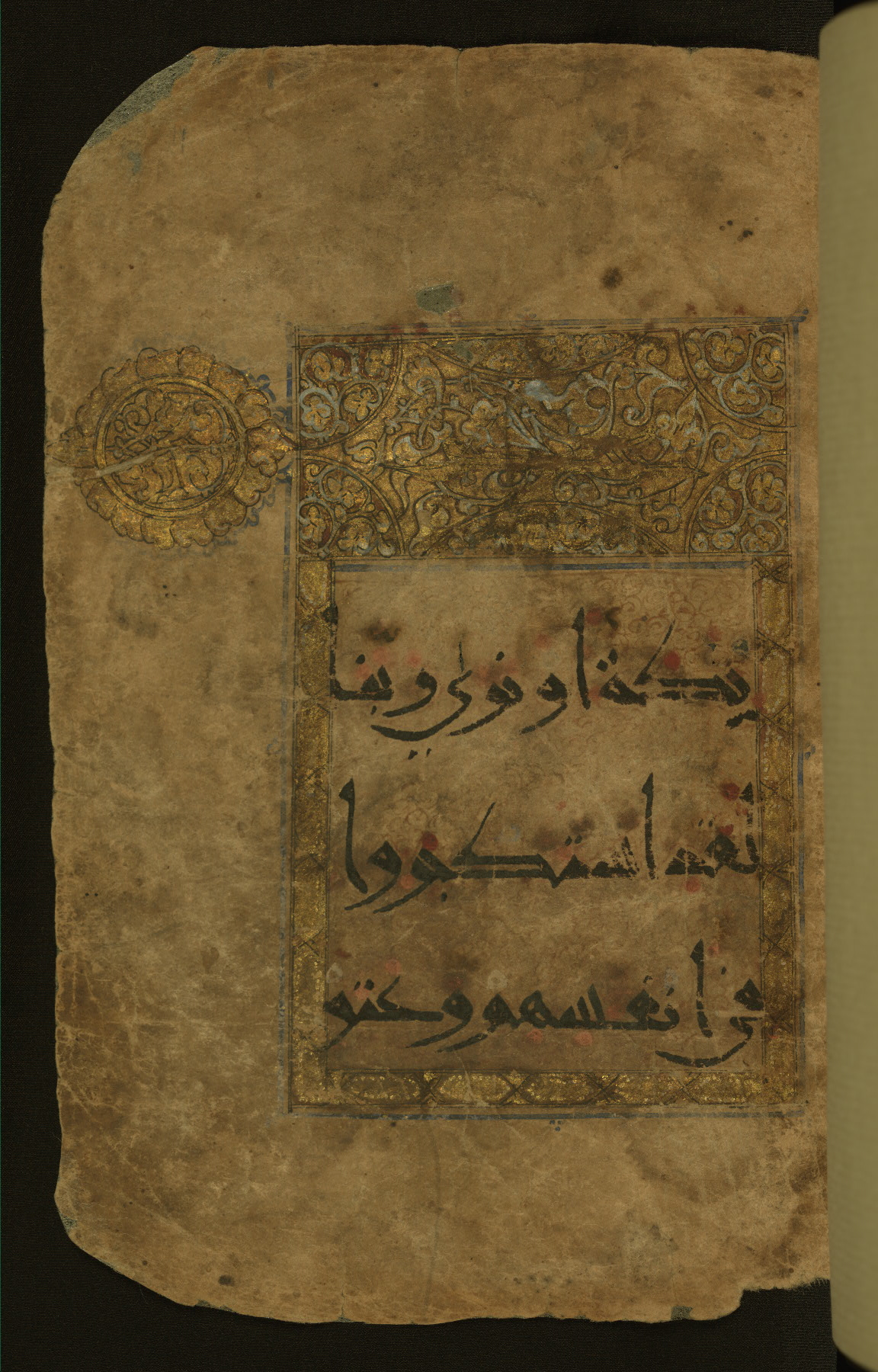 This illuminated fragment of the Qur'an contains chapter 25 (Sūrat al-furqān), verses 21-32 and 39-78; chapter 26 (Sūrat al-shuʿarāʾ); and chapter 27 (Sūrat al-naml), up to verse 40. It probably dates to the late fifth century AH / eleventh CE or early sixth century AH / twelfth CE. The text is written in the New Abbasid (broken cursive) style in black ink and is vocalized with red dots and blue circles, the latter for sukūn. Single verses are separated by illuminated rosettes, and groups of five verses are indicated by the letter hāʾ in the form of a teardrop in the margins. Marginal medallions are also used for larger verse groups. The black leather binding is modern.