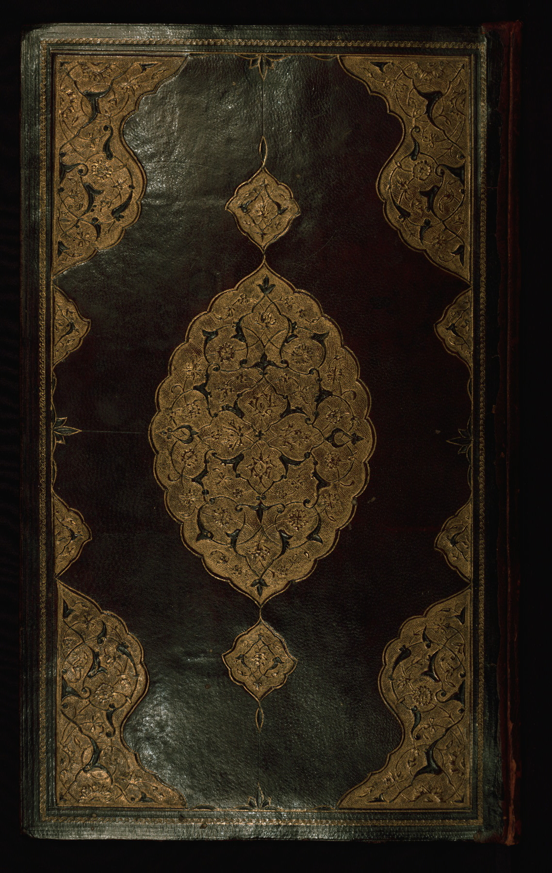 - Label: This dentelle-style brown goatskin binding with central lobed medallion, pendants, and cornerpieces is attributable to the tenth century AH / sixteenth CE.
