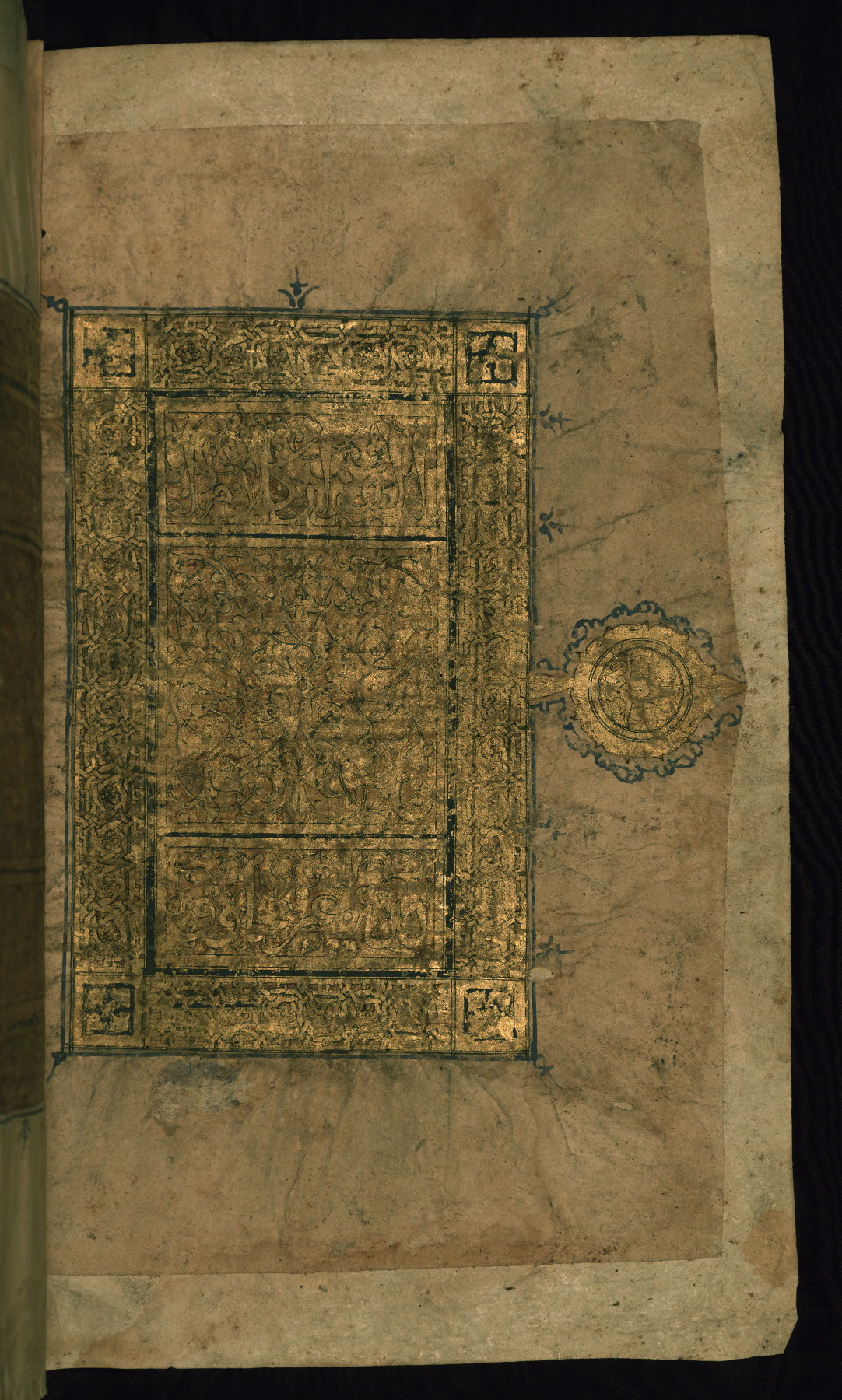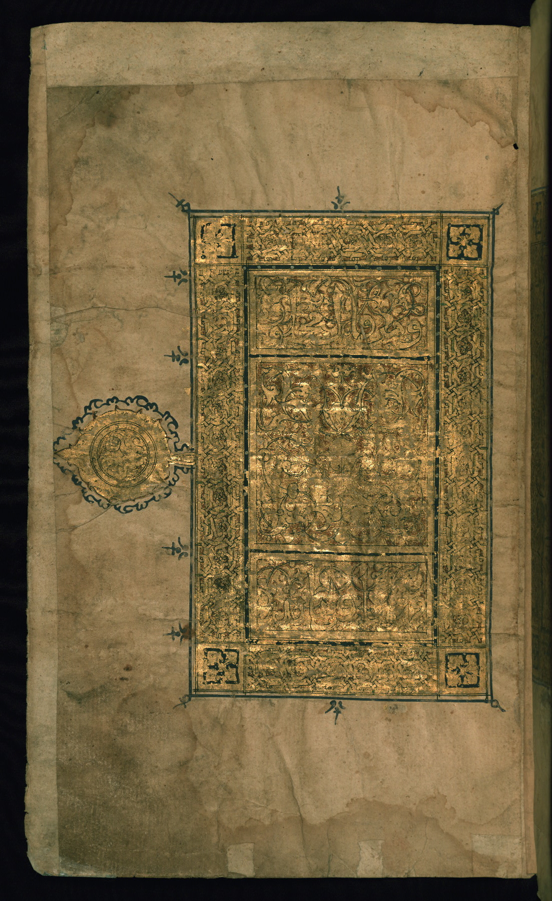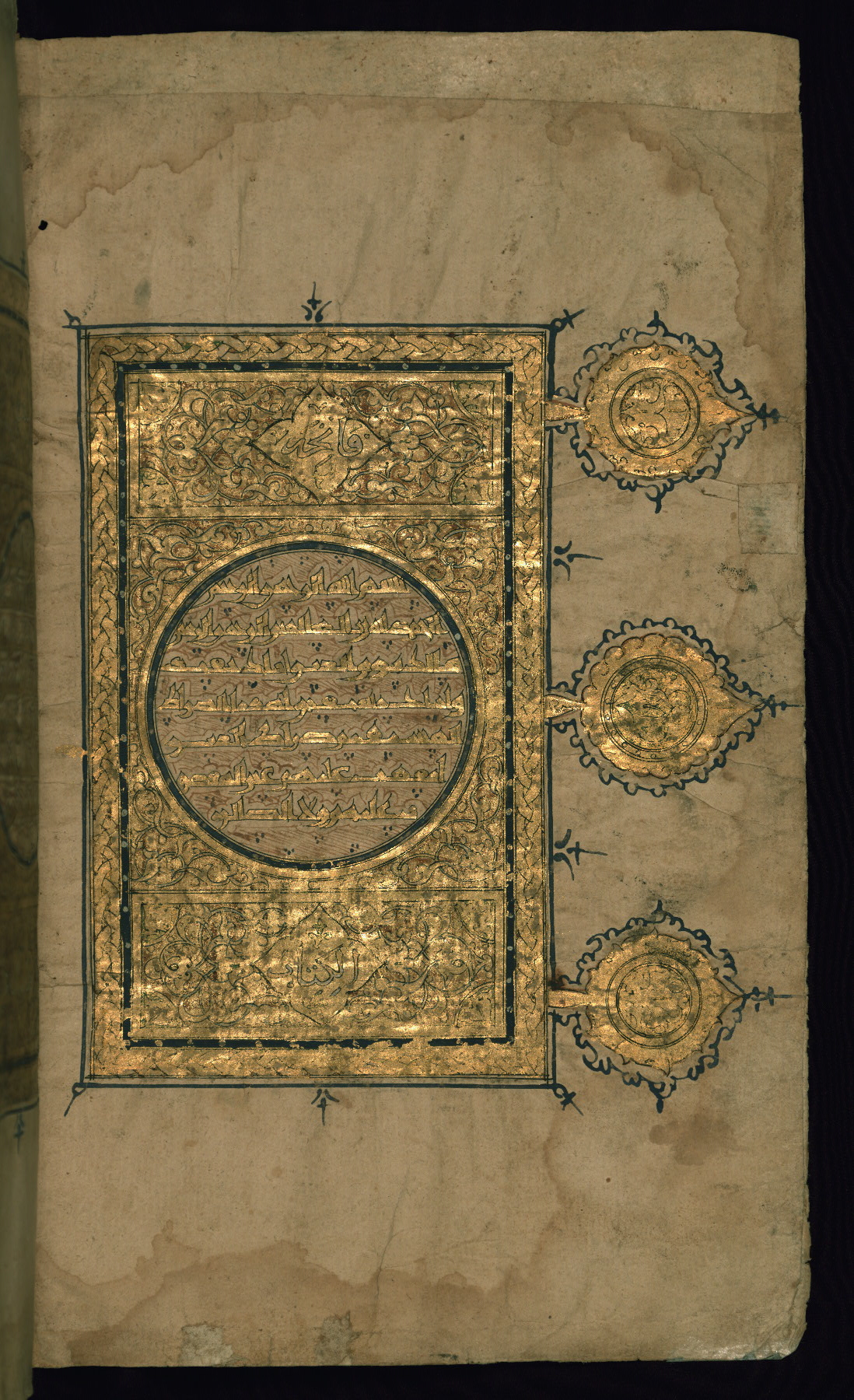 This copy of the Qur'an was made in Iran, probably in the sixth century AH / twelfth CE. The text is written in the New Abbasid (broken cursive) style with vowels indicated by red dots and orthoepic signs such as tashdīd and sukūn in green. The codex opens with an illuminated double-page frontispiece (fols. 1b-2a) inscribed with the creed that the Qur’an is God’s word uncreated: al-Qur’ān kalām Allāh ghayr makhlūq wa-man qāla makhlūq fa-huwa kāfir bi-Allāh al-ʿAlī al-Aẓīm. The latter is also included in the explicit (fol. 285a). The Qur’anic text begins with an illuminated incipit for chapter 1 (Sūrat al-fātiḥah) and chapter 2 (Sūrat al-baqarah) (fols. 2b-3a). Throughout are illuminated chapter headings with marginal medallions, verse markers in teardrop form, marginal medallions indicating every tenth verse, illumination of the name of Allah, and indications for prostration. The dentelle-style brown goatskin binding with central lobed medallion, pendants, and cornerpieces is attributable to the tenth century AH / sixteenth CE.