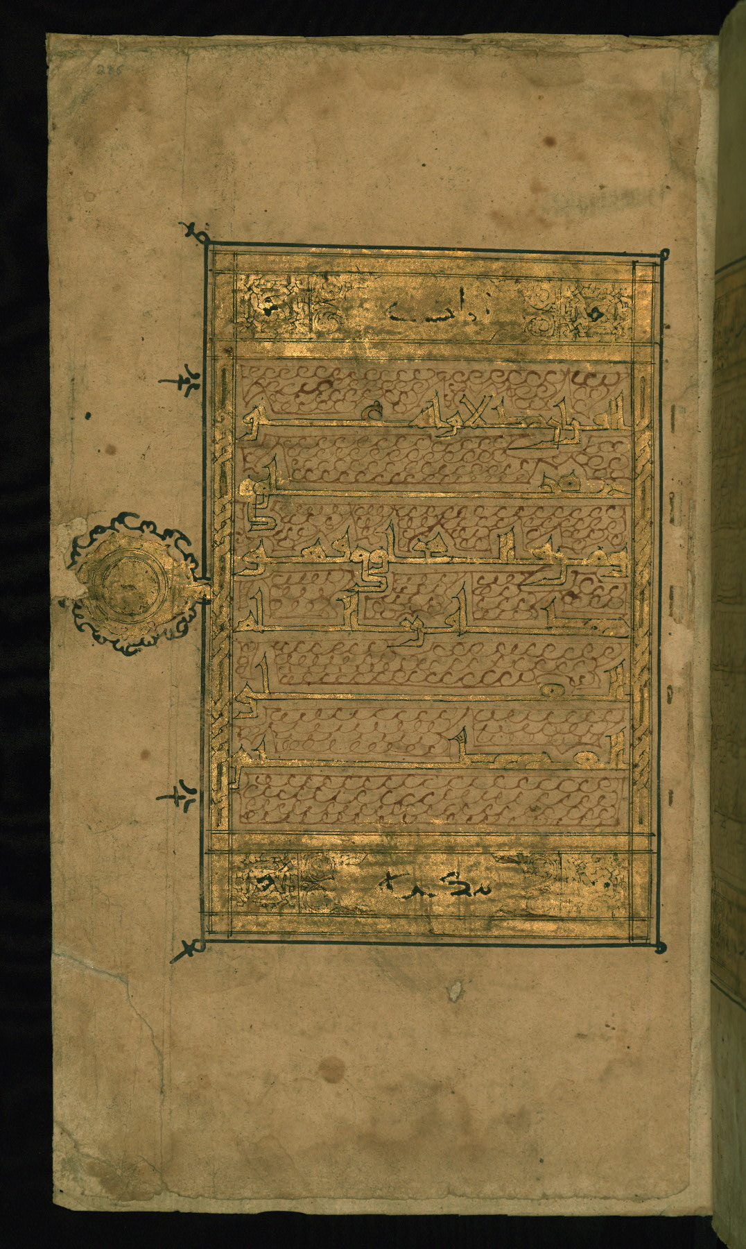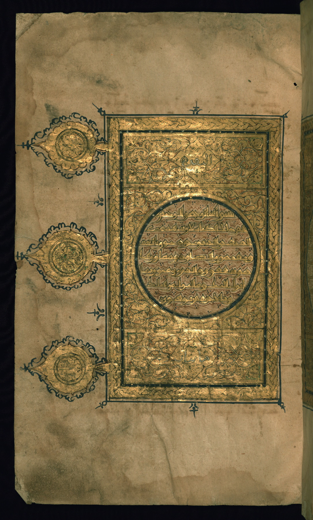 - Label: This is the right side of a double-page illuminated incipit. This page bears the seven verses of chapter 1 (Sūrat al-fātiḥah), written in a decorative New Abbasid (broken cursive) style.