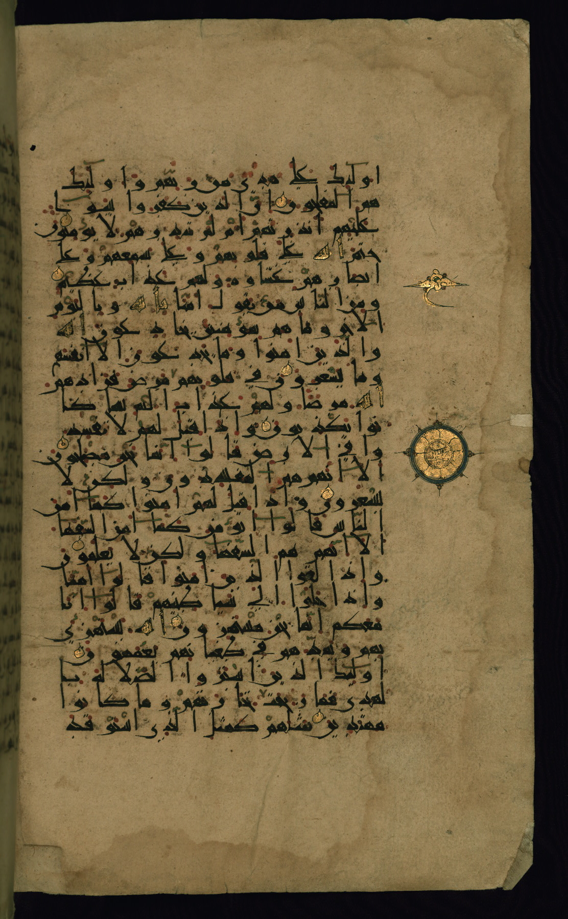 - Label: The text of this page is written in New Abbasid (broken cursive) style with red dots for vowels and orthoepic signs, such as tashdīd and sukūn, in green. The name of Allah is illuminated in gold, as it is throughout the manuscript; every tenth verse is indicated by an illuminated marginal medallion.