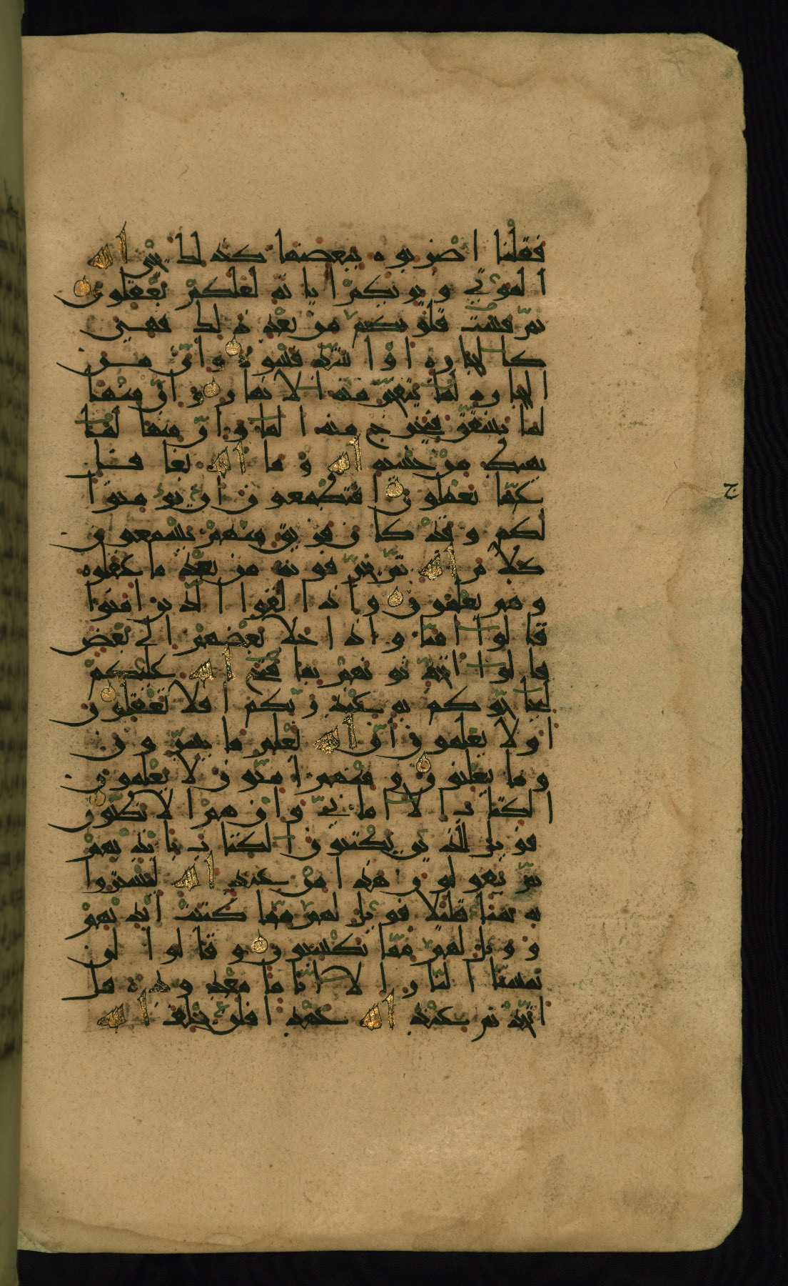 - Label: On this text page, verses the Qur'an are written in the New Abbasid (broken cursive) style in dark brown ink with red dots for vowels and orthoepic signs, such as tashdīd and sukūn, in green. The name of Allah is illuminated in gold, as it is throughout the manuscript.