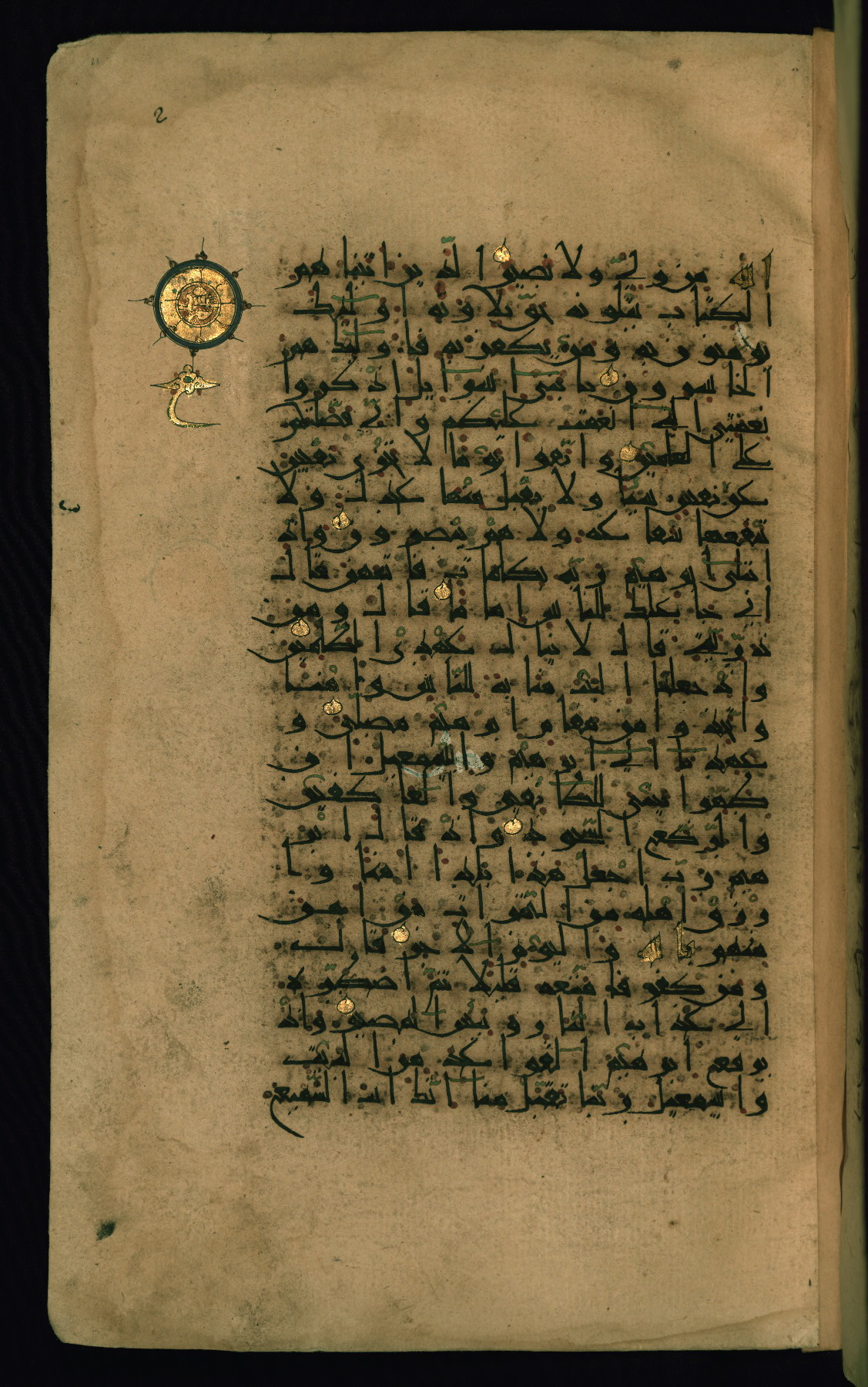 - Label: On this text page from chapter 2 (Sūrat al-baqarah), the name of Allah is illuminated in gold, as it is throughout the manuscript. Verses are separated by an illuminated teardrop form.